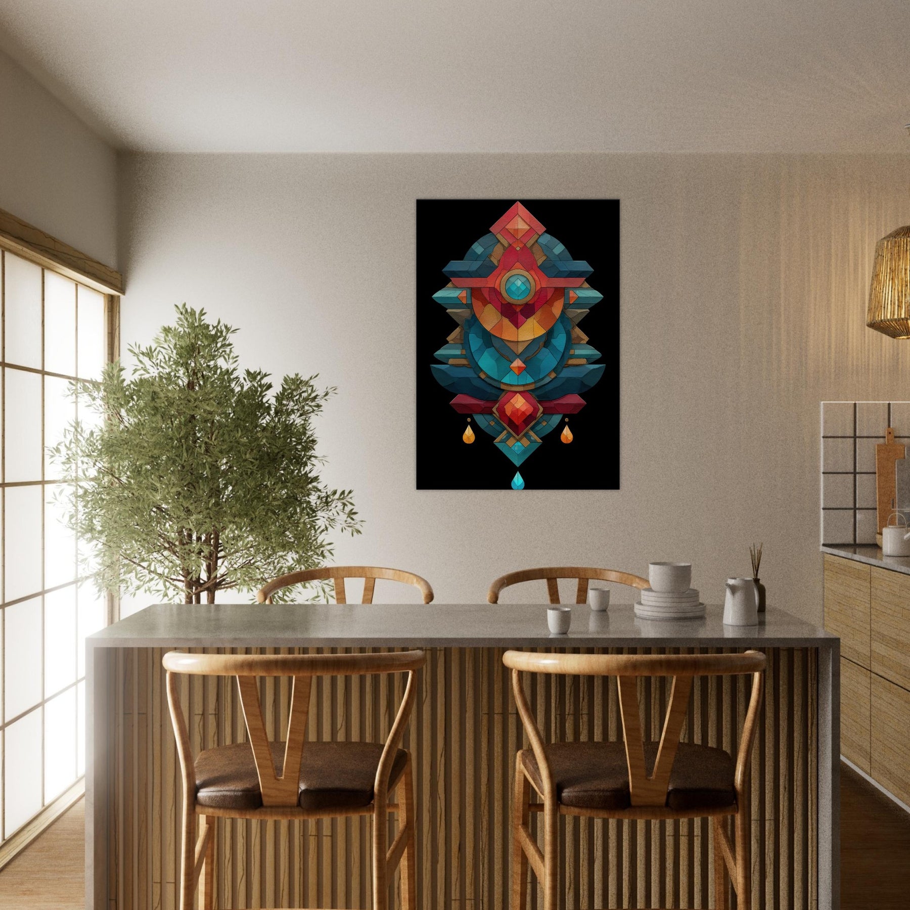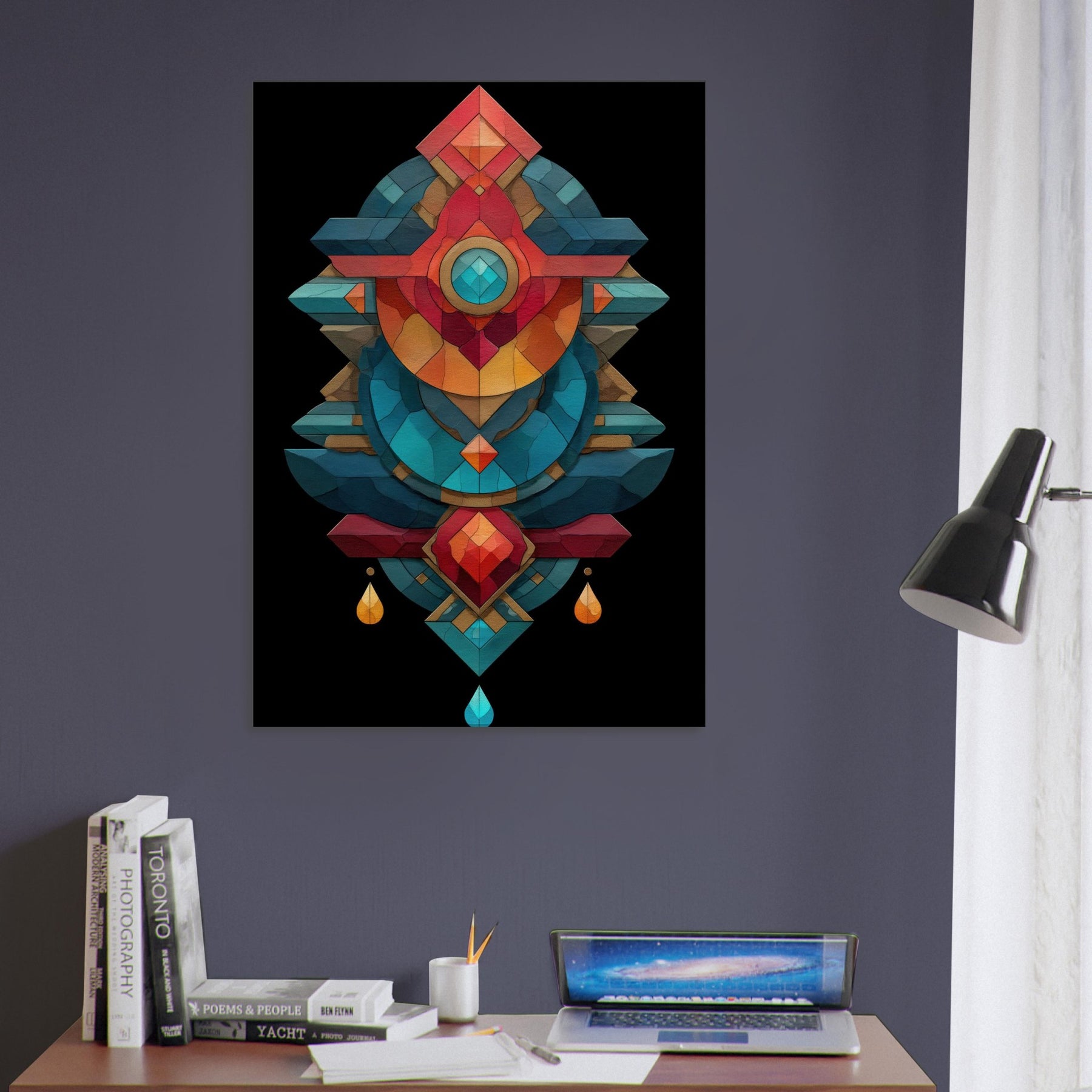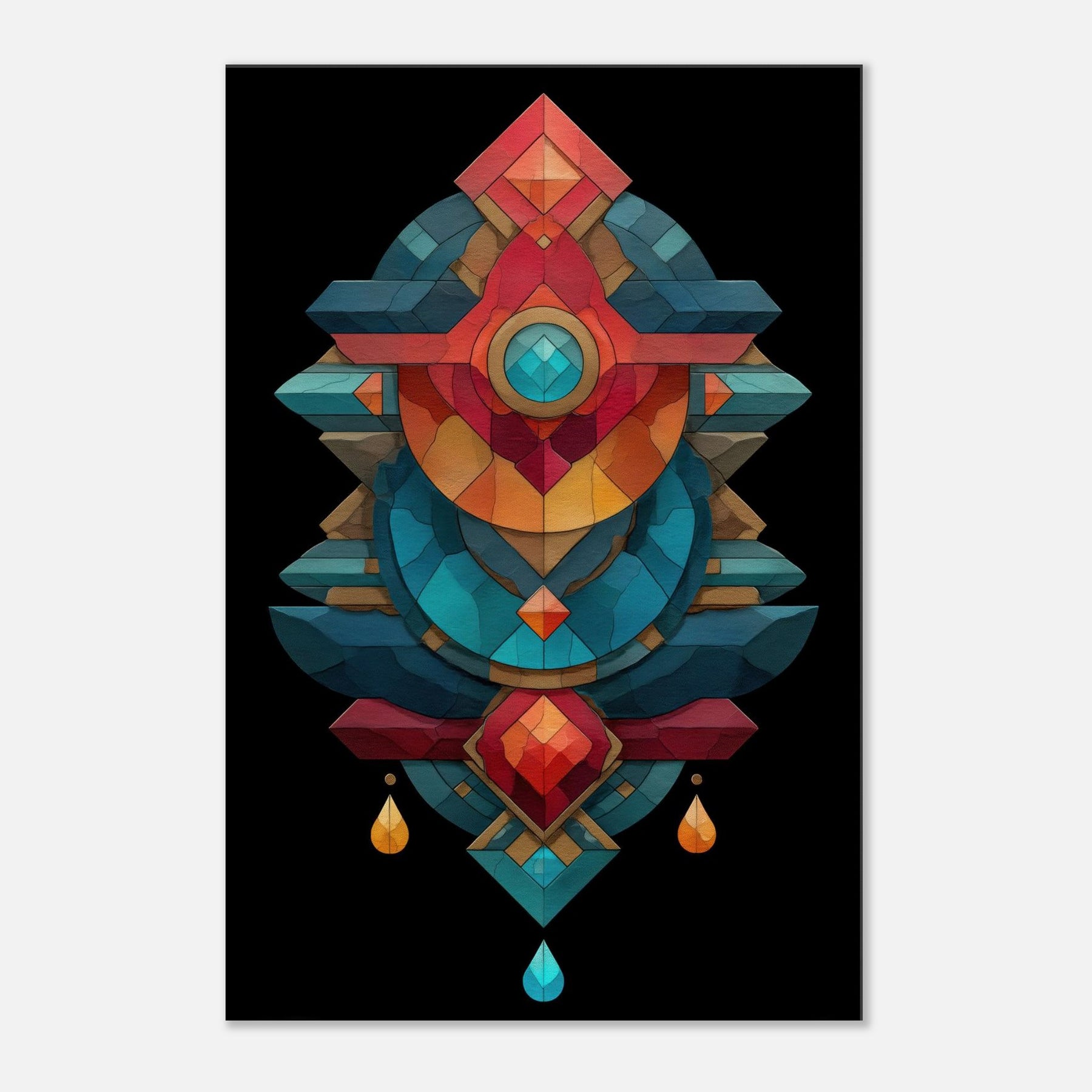 In this lush composition, the timeless practice of alchemy is rendered as a luminous geometry that hums with mood and memory. The Alchemy Symbols (Salt, Sulfur, Mercury) are woven into layered facets of color cool teals, coral reds, and golds that echo a whispered ritual. The piece radiates calm and tension, inviting a contemplative corner in a living room or study. It transforms walls into a quiet altar, turning everyday space into a sanctuary of intention and wonder.
