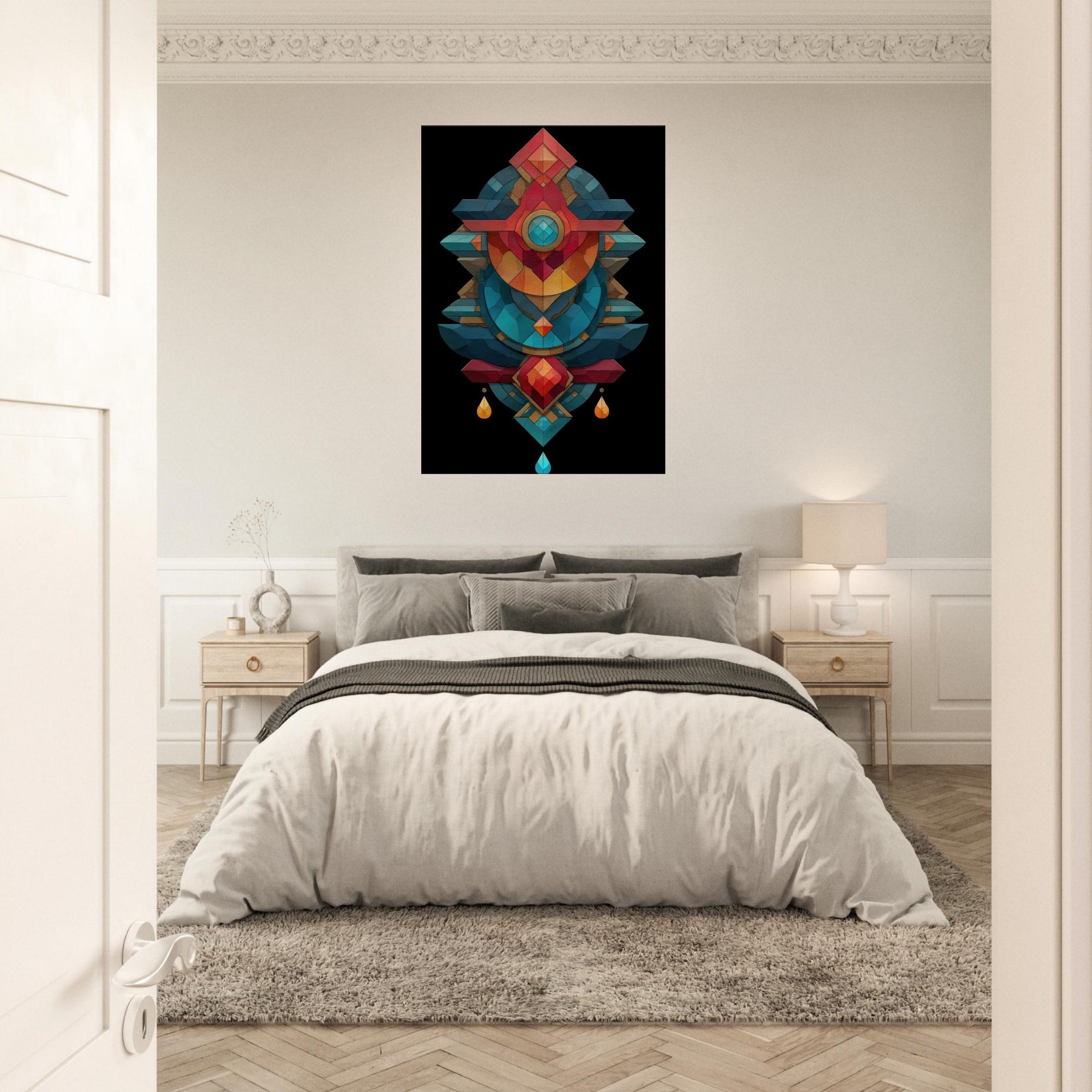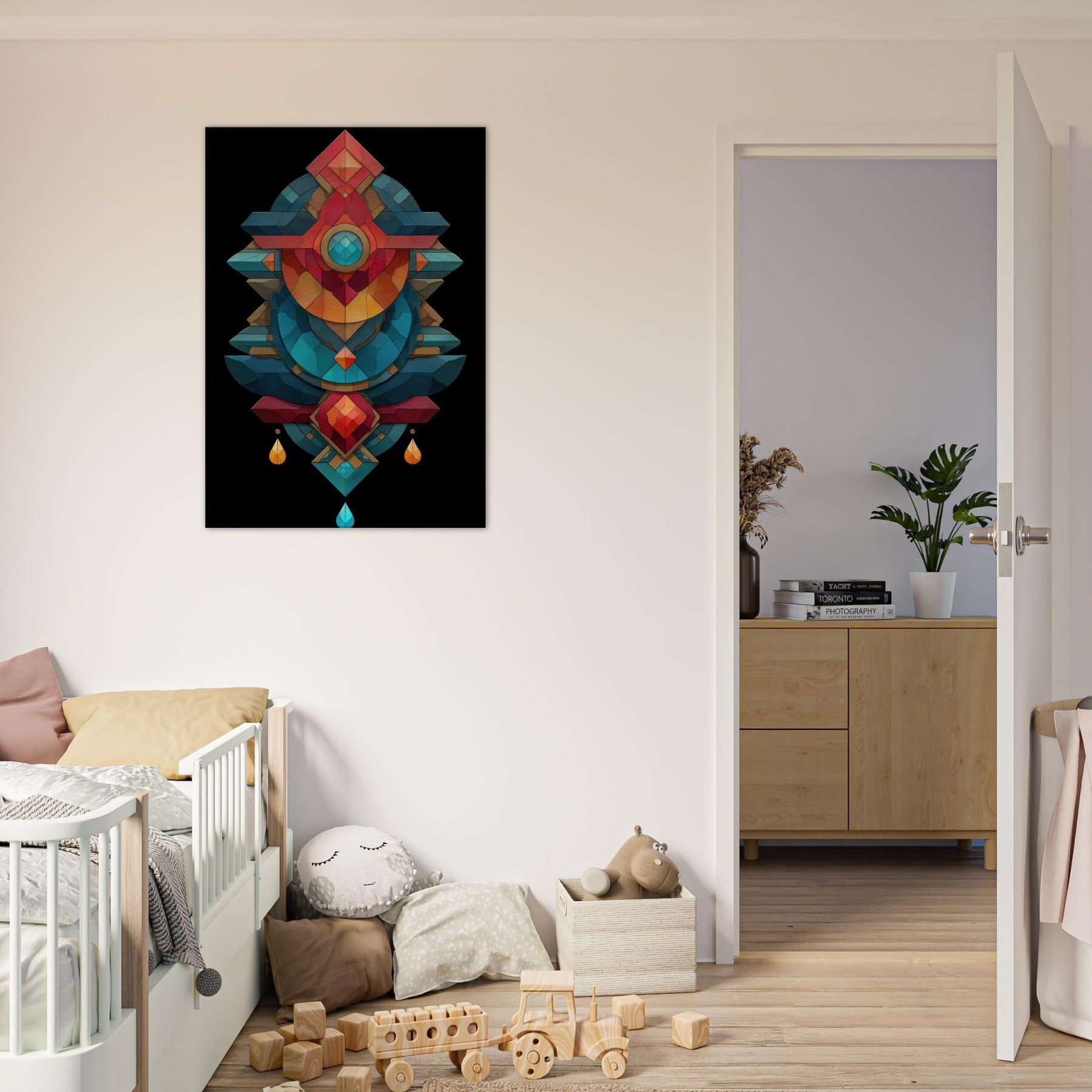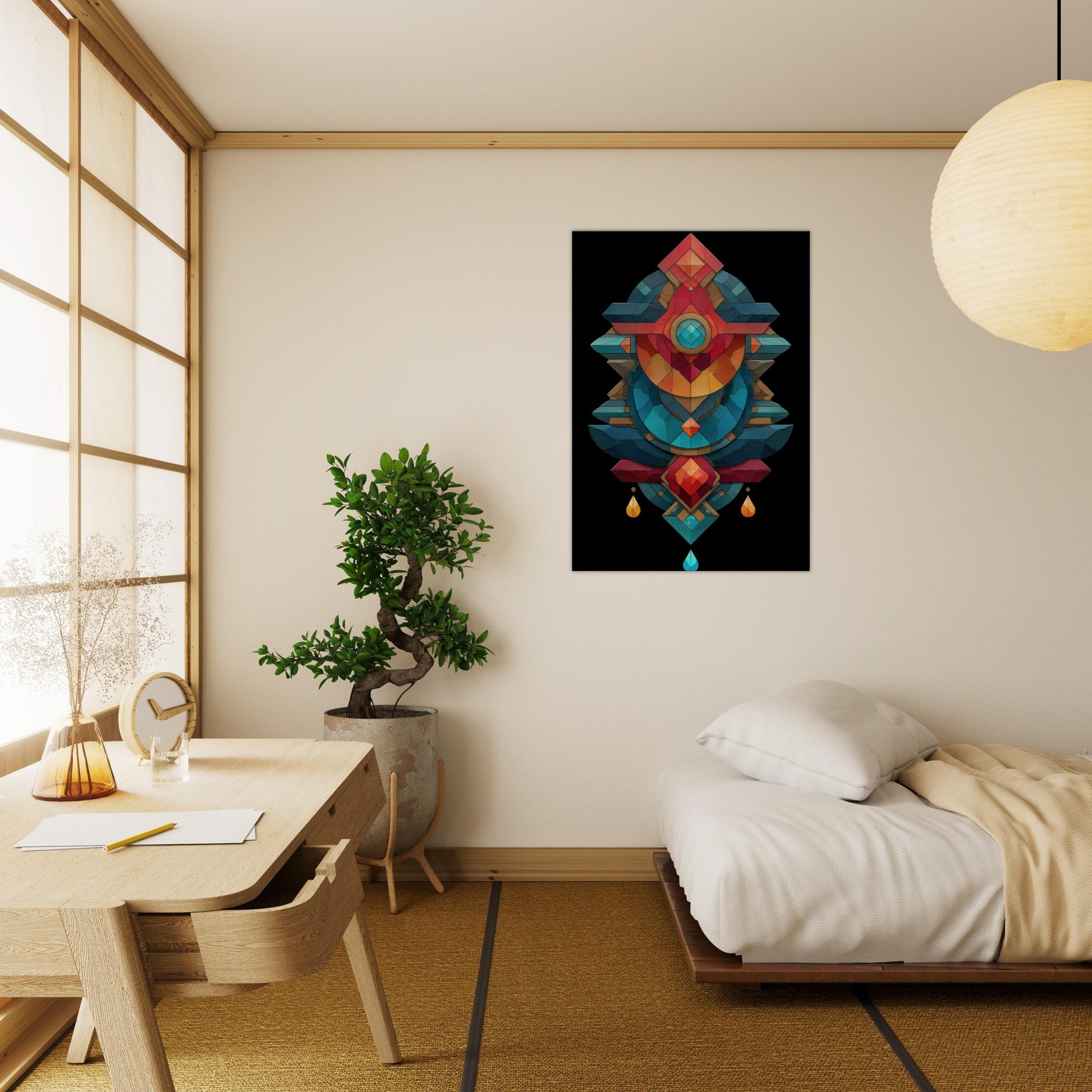 In this lush composition, the timeless practice of alchemy is rendered as a luminous geometry that hums with mood and memory. The Alchemy Symbols (Salt, Sulfur, Mercury) are woven into layered facets of color cool teals, coral reds, and golds that echo a whispered ritual. The piece radiates calm and tension, inviting a contemplative corner in a living room or study. It transforms walls into a quiet altar, turning everyday space into a sanctuary of intention and wonder.
