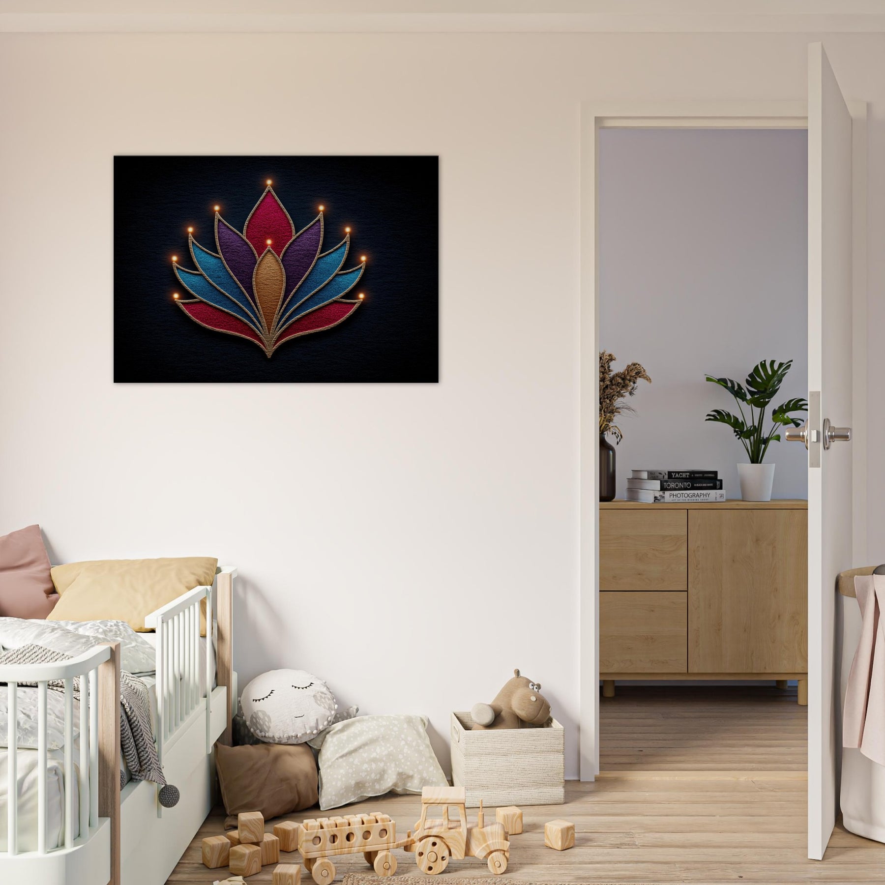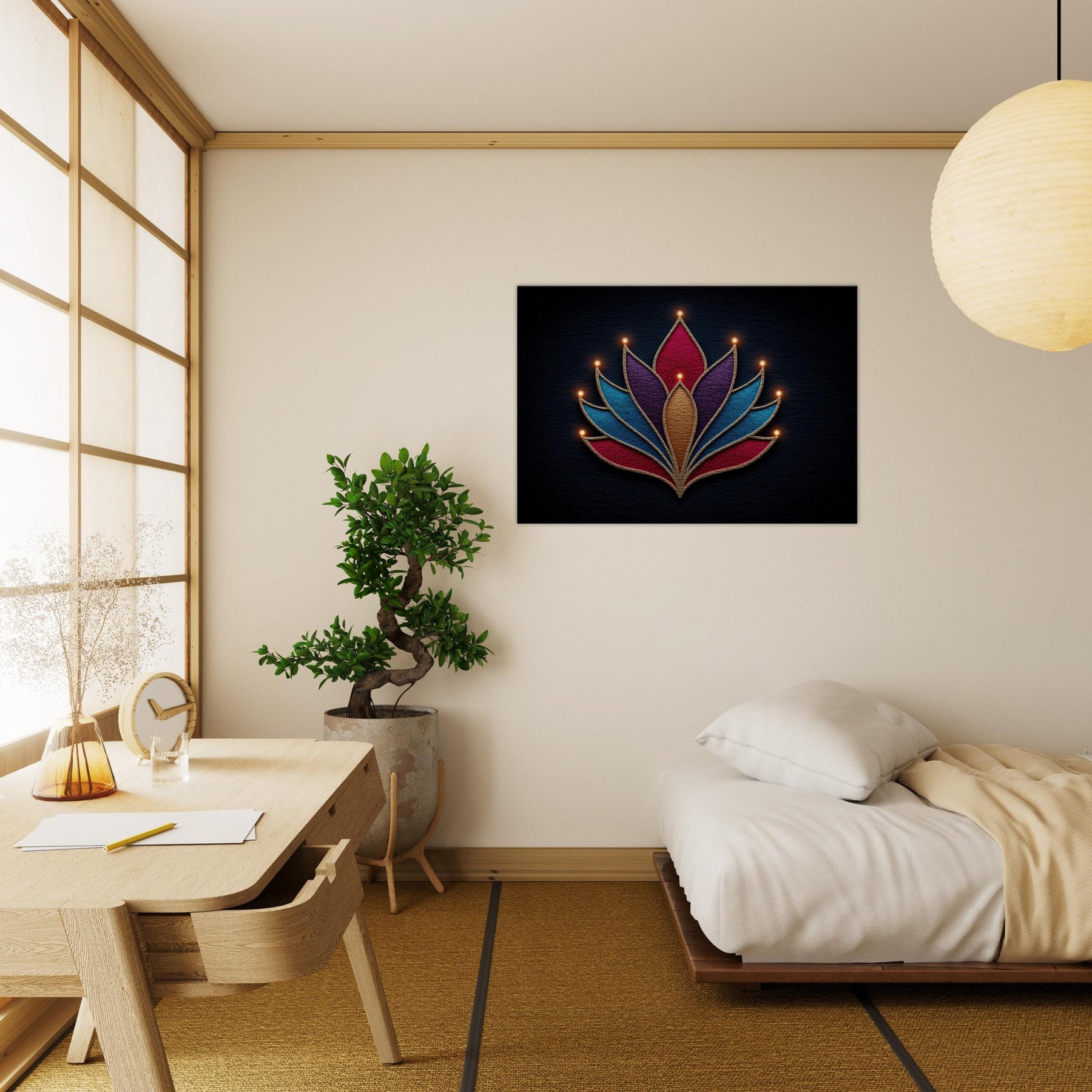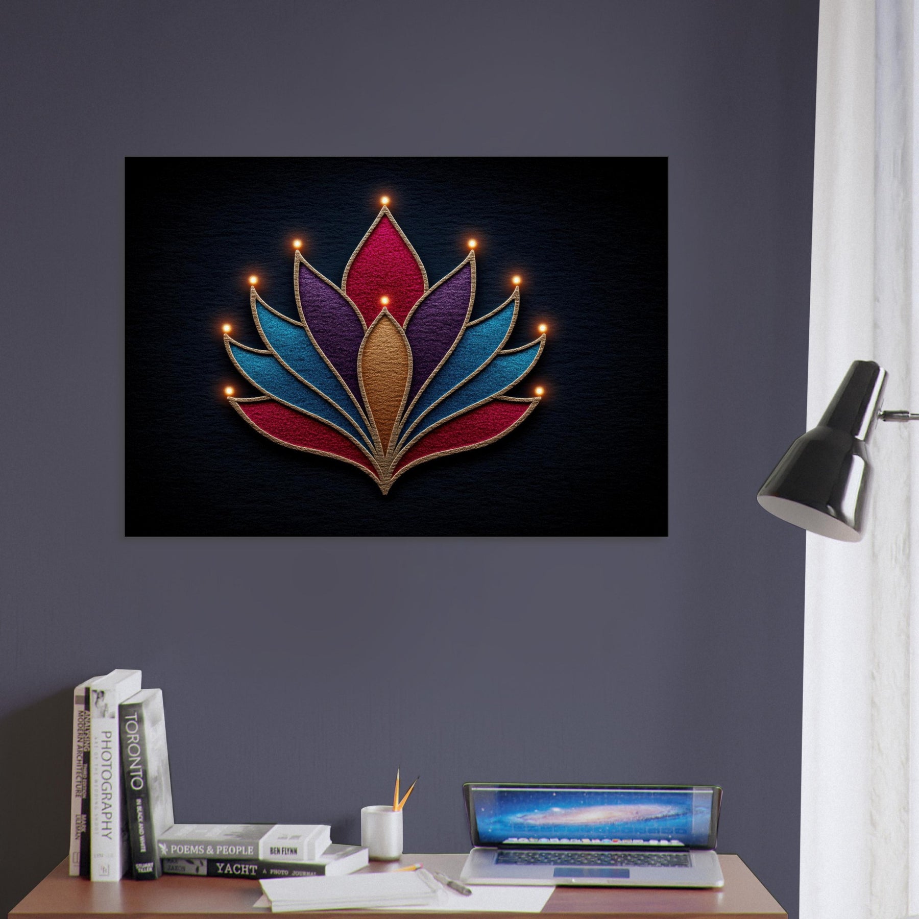 Let this Menorah unfold as a study in quiet symbolism. The Minimal Line form builds a radiant bouquet of curved layers, each glow a soft candle flame evoking warmth without heaviness. Abstract color blocks in jewel tones breathe energy into a dim room, while the textured edges catch light from every angle. The result is a serene, mystical presence that elevates a living space inviting contemplation, conversation, and a gentle glow that makes evenings feel sacred, even in everyday moments. The central subject is Menorah (Minimal Line).