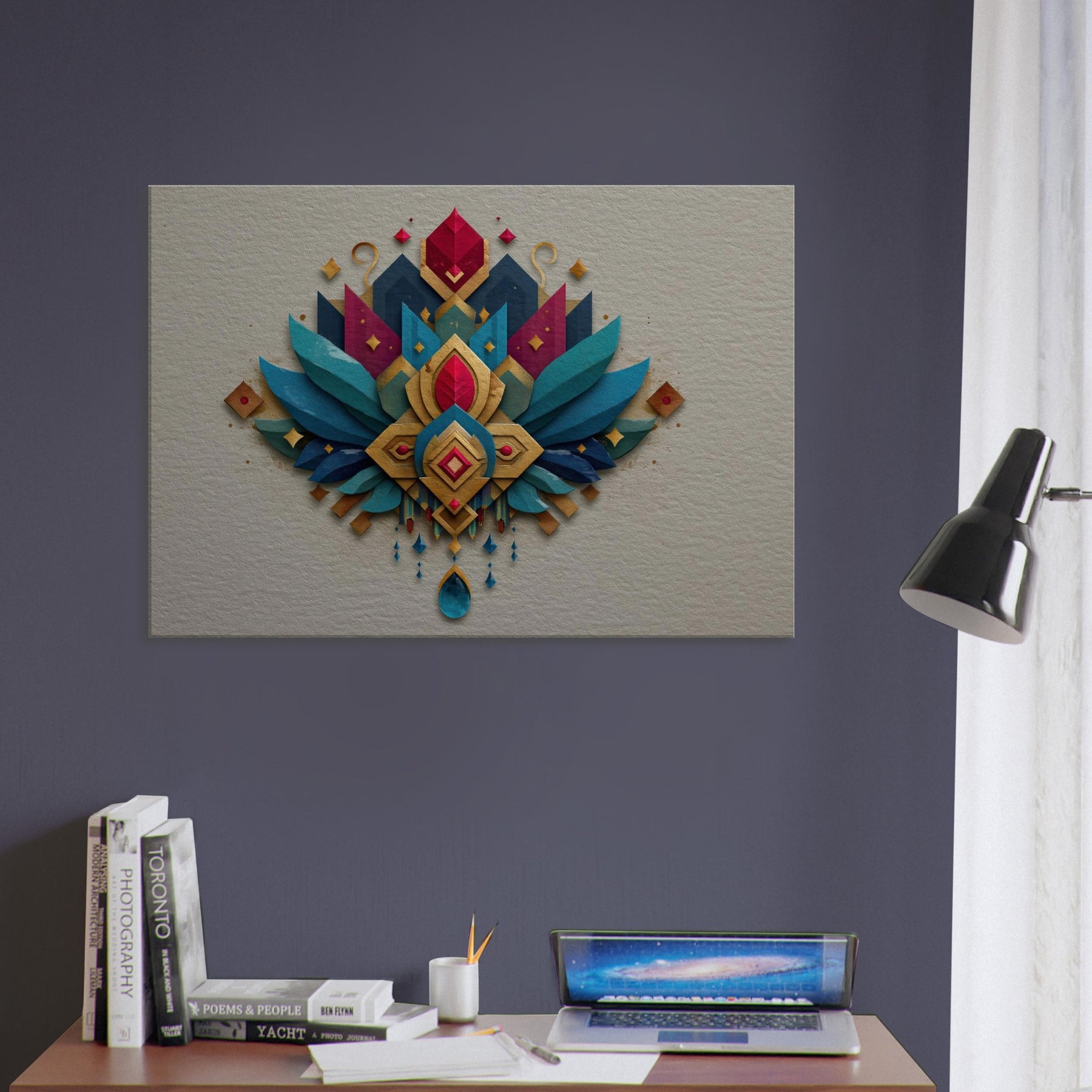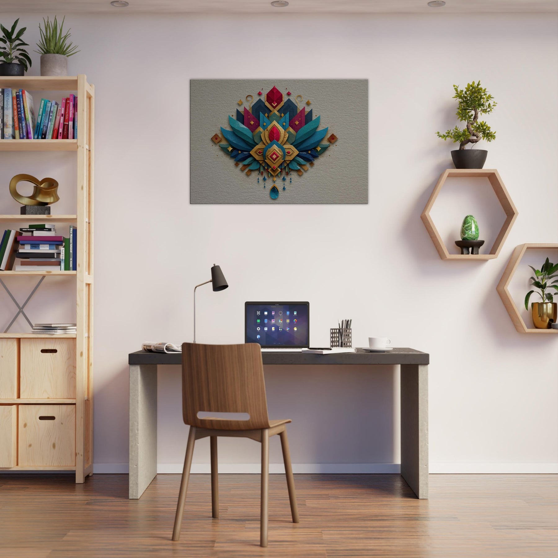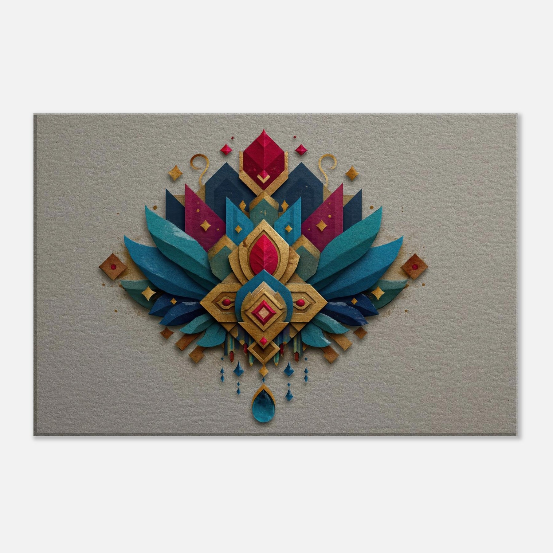 Immersed in a shimmering cascade of jewel toned shapes, this abstract composition centers Lakshmi in a radiant mandala of gold, teal, and sapphire. The layered textures catch light with shimmering edges, inviting the eye to travel from central gem to winged arcs that seem to breathe. In a living room or foyer, it becomes a quiet ceremony soft, generous, and mystical balancing warmth with contemporary edge. Let the sense of abundance and calm that Lakshmi embodies fill your space.