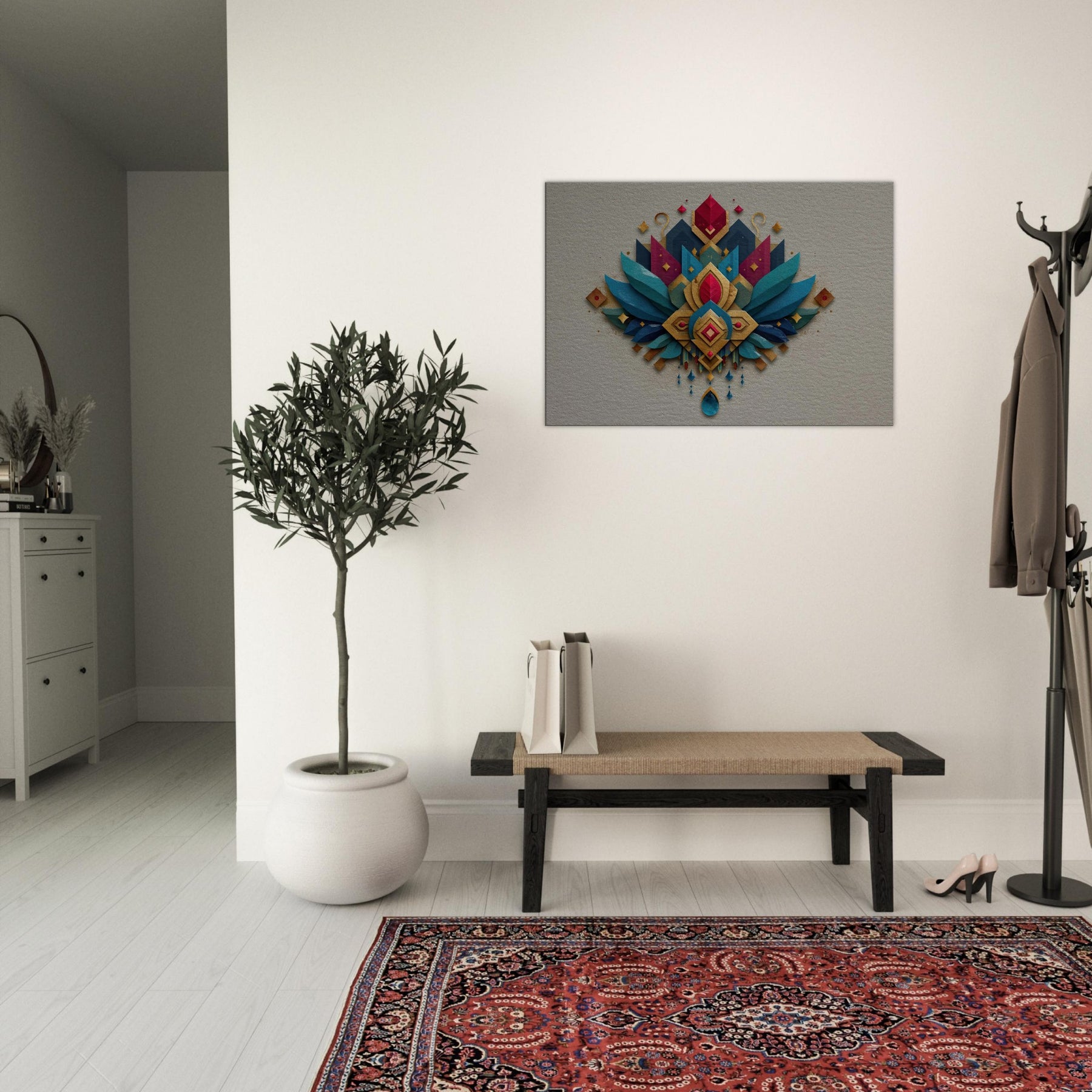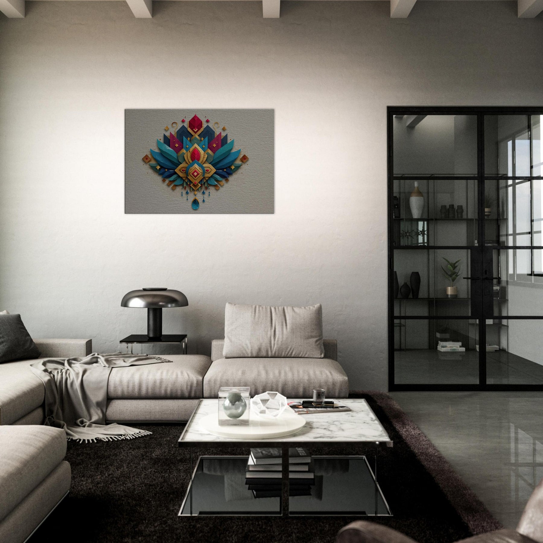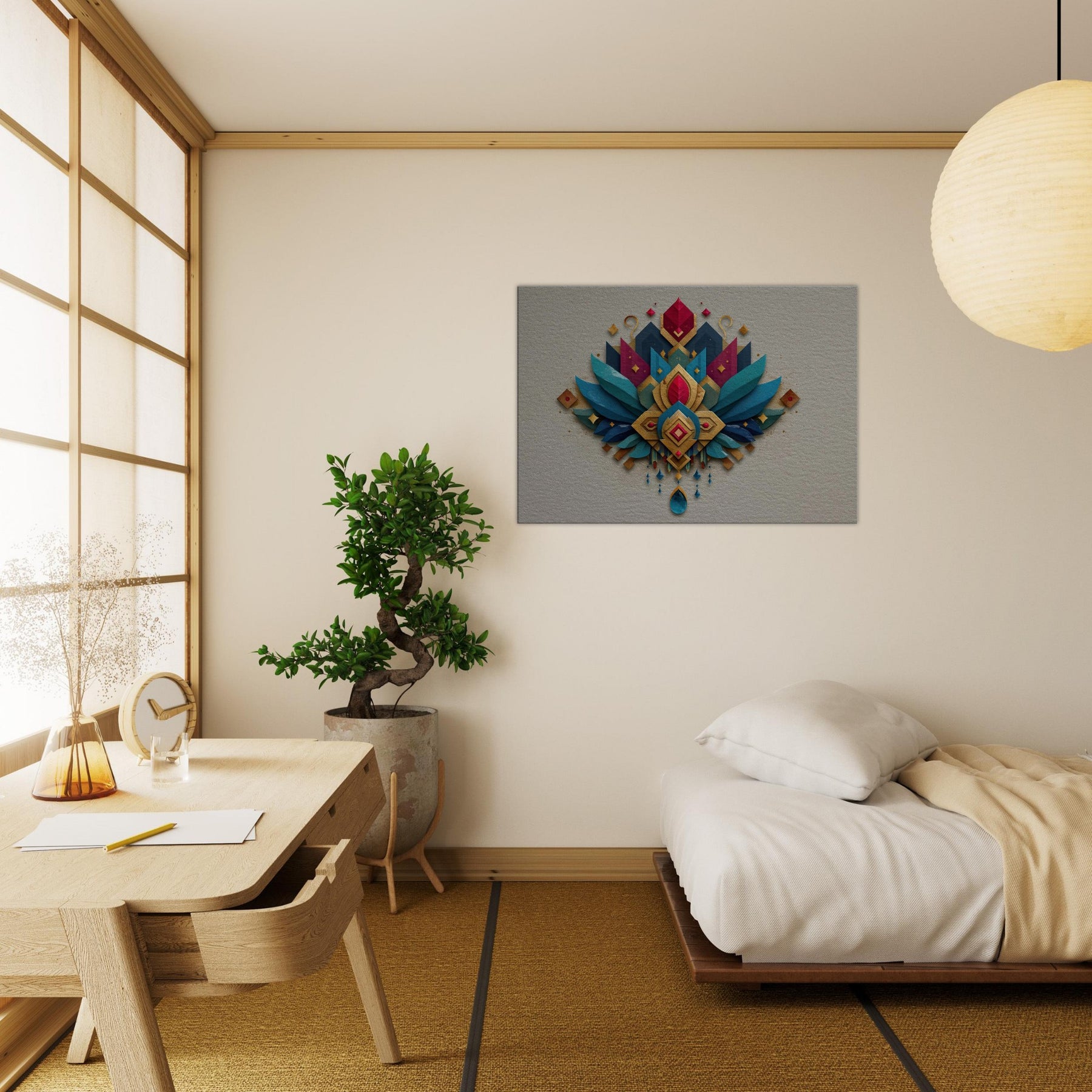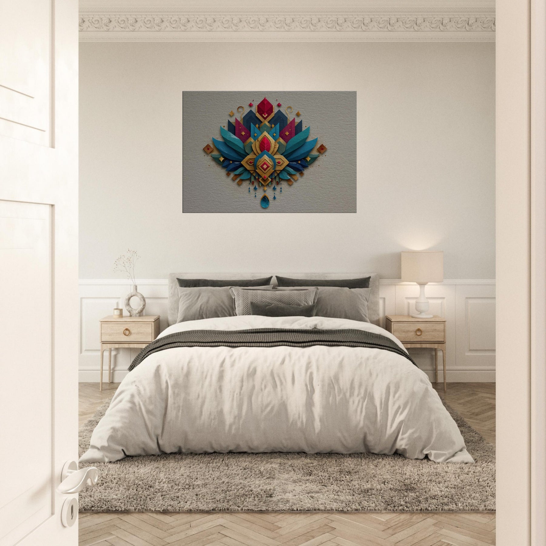 Immersed in a shimmering cascade of jewel toned shapes, this abstract composition centers Lakshmi in a radiant mandala of gold, teal, and sapphire. The layered textures catch light with shimmering edges, inviting the eye to travel from central gem to winged arcs that seem to breathe. In a living room or foyer, it becomes a quiet ceremony soft, generous, and mystical balancing warmth with contemporary edge. Let the sense of abundance and calm that Lakshmi embodies fill your space.