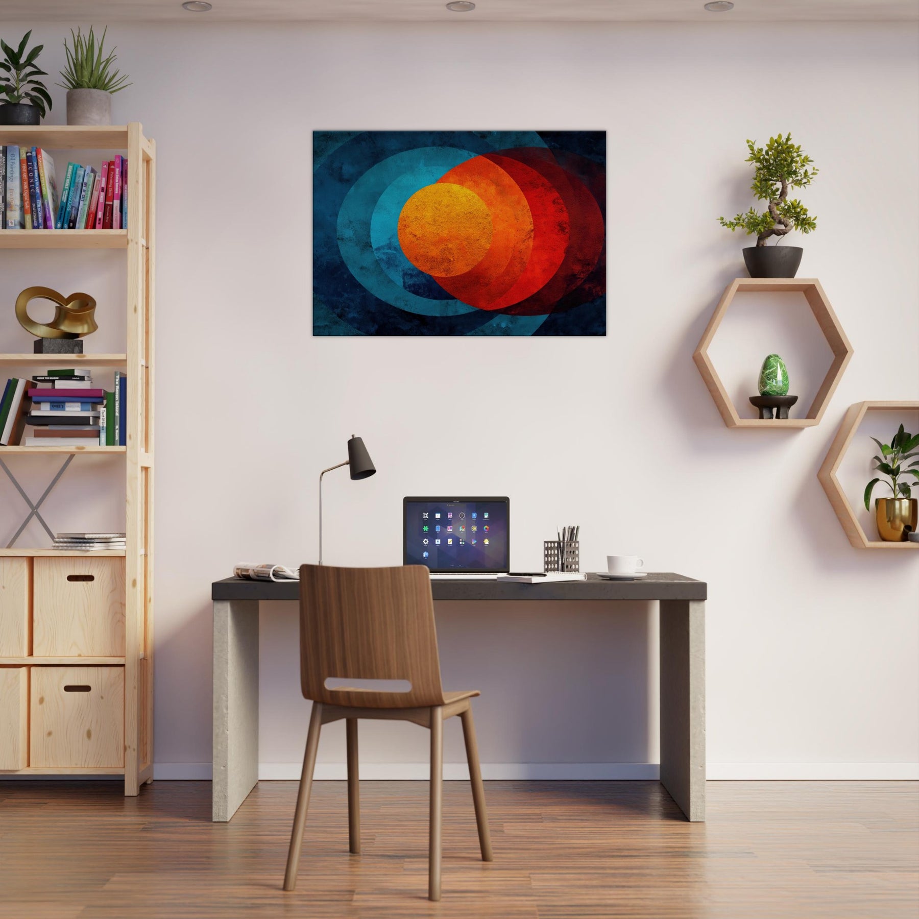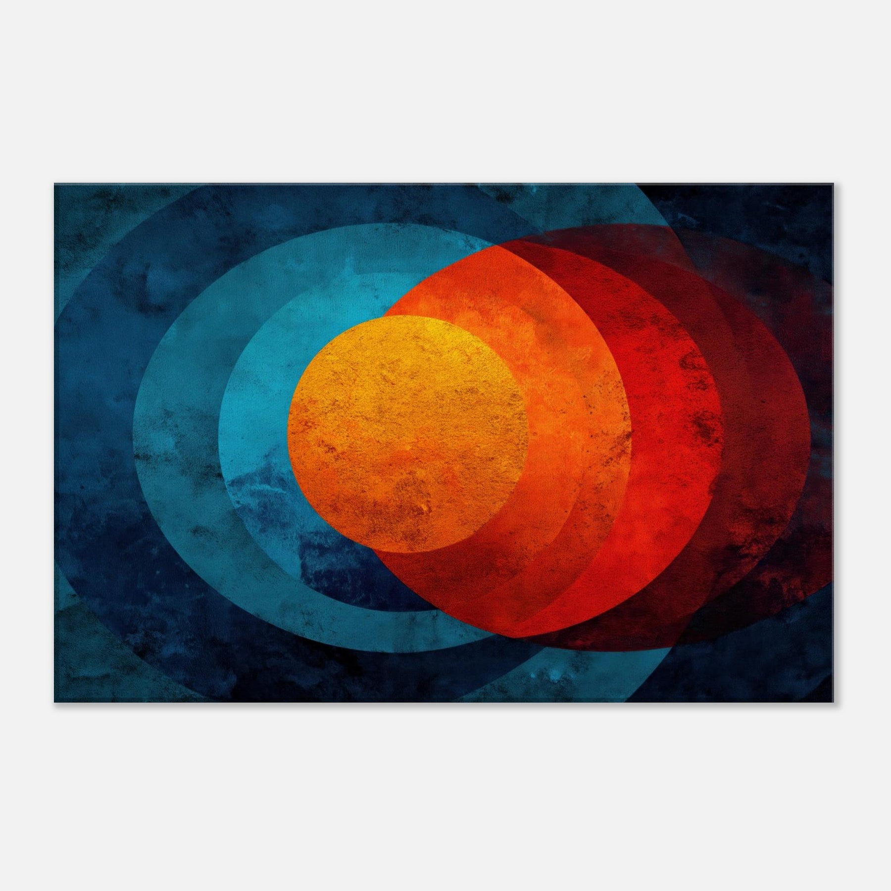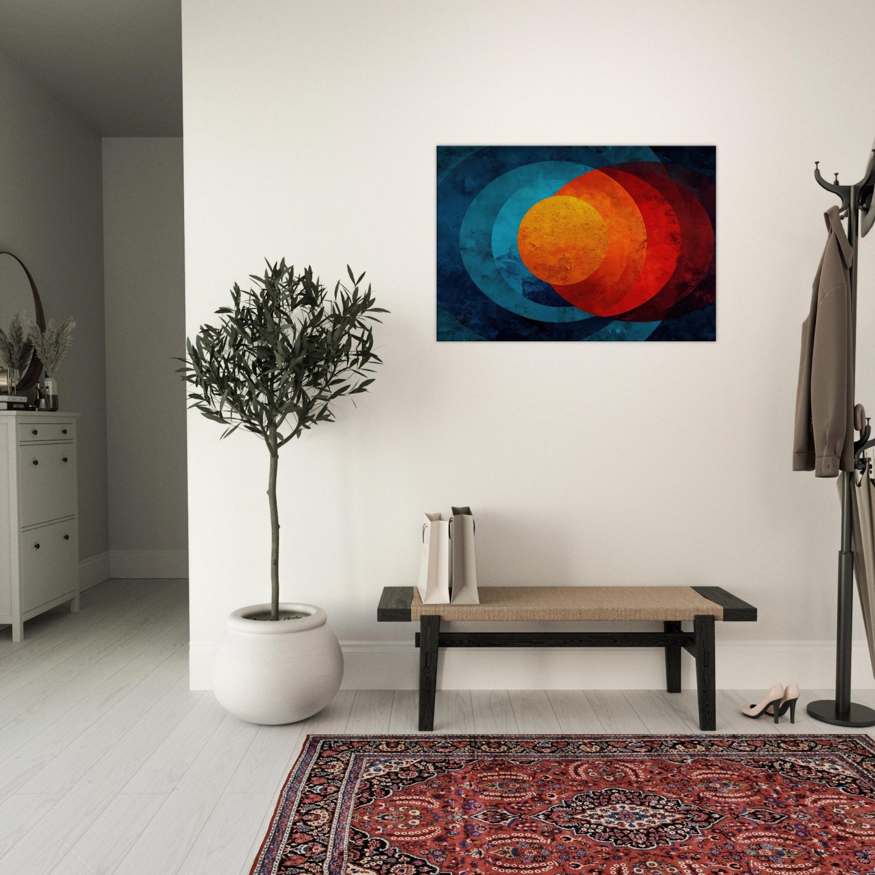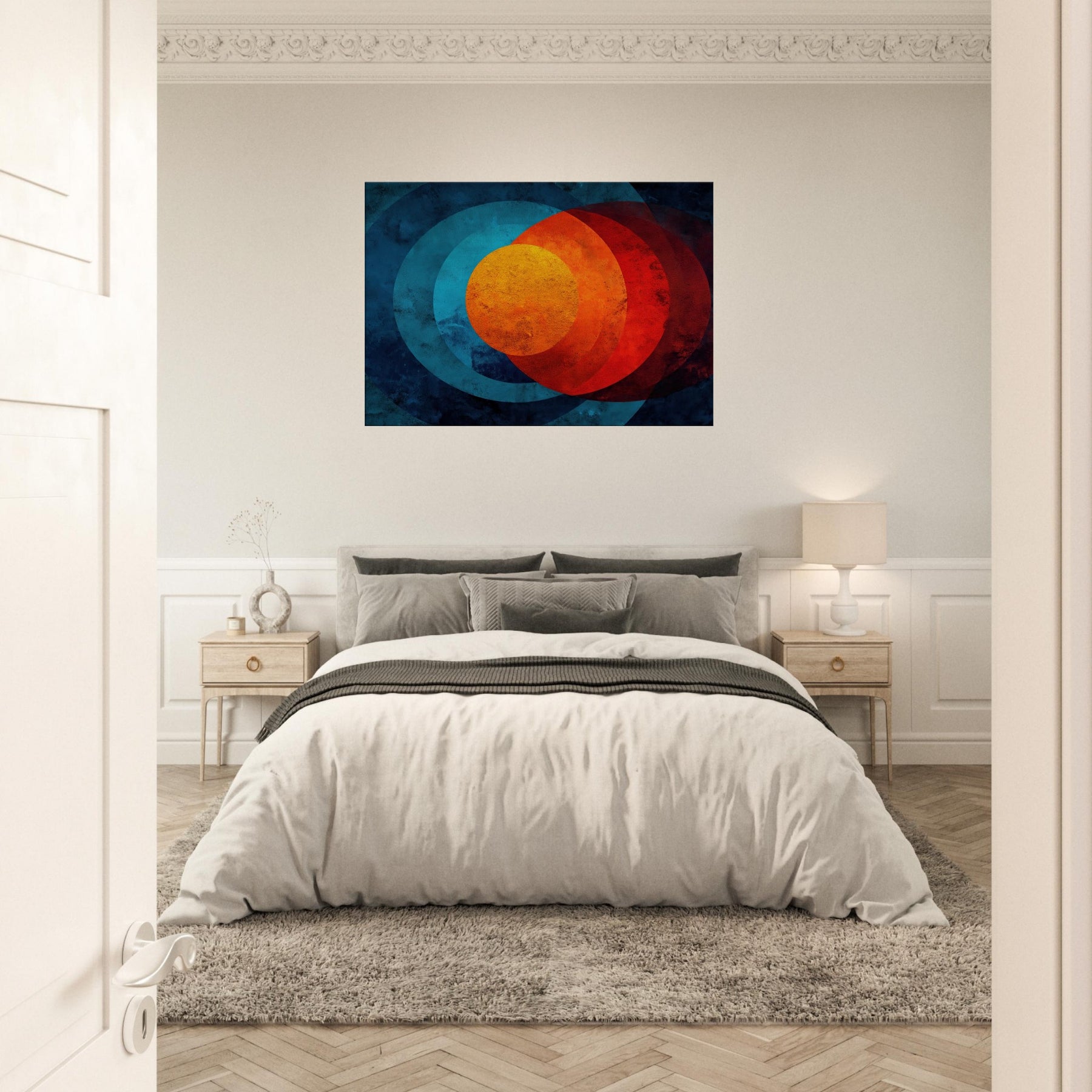 Eclipse unfurls across a field of color in a mystical abstract study. The concentric circles suggest unseen orbits and a quiet resonance that settles into the room like a breath. Blues melt into teal, while solar oranges and deep reds glow with warm intensity. The layered luminosity invites reflection, turning walls into a nighttime sky that softens modern interiors. Hang this piece where light lingers in a living room, hallway, or study to deepen texture, mood, and everyday poetry.