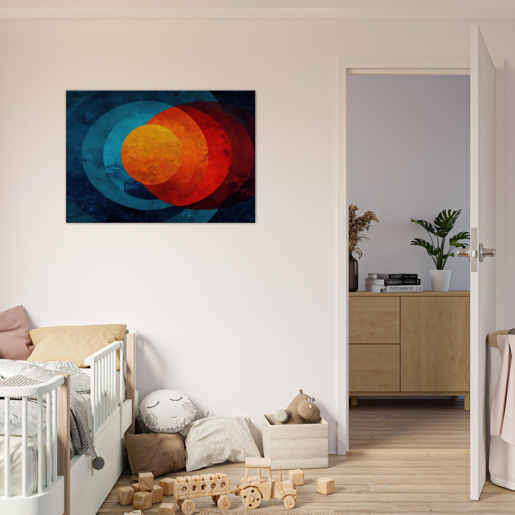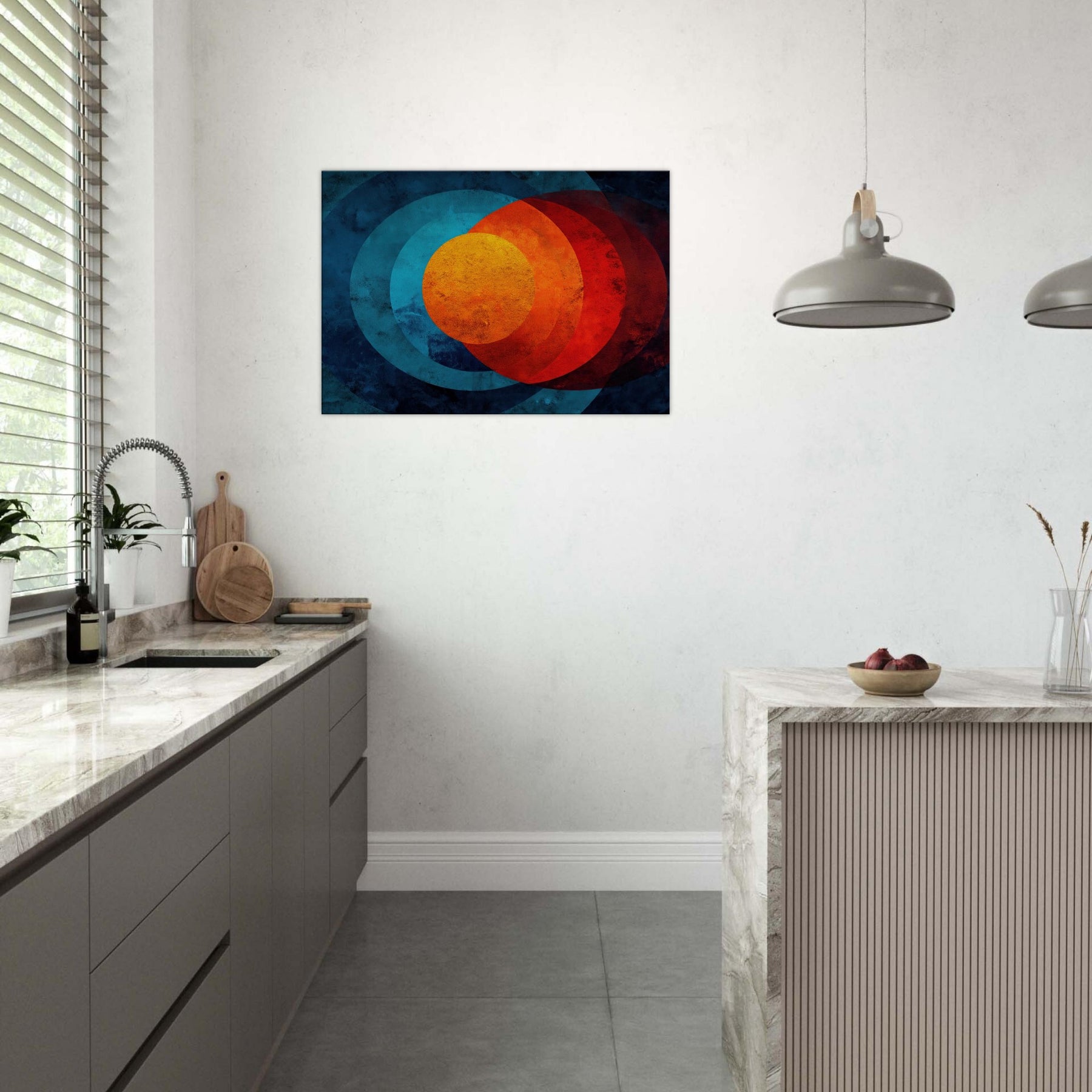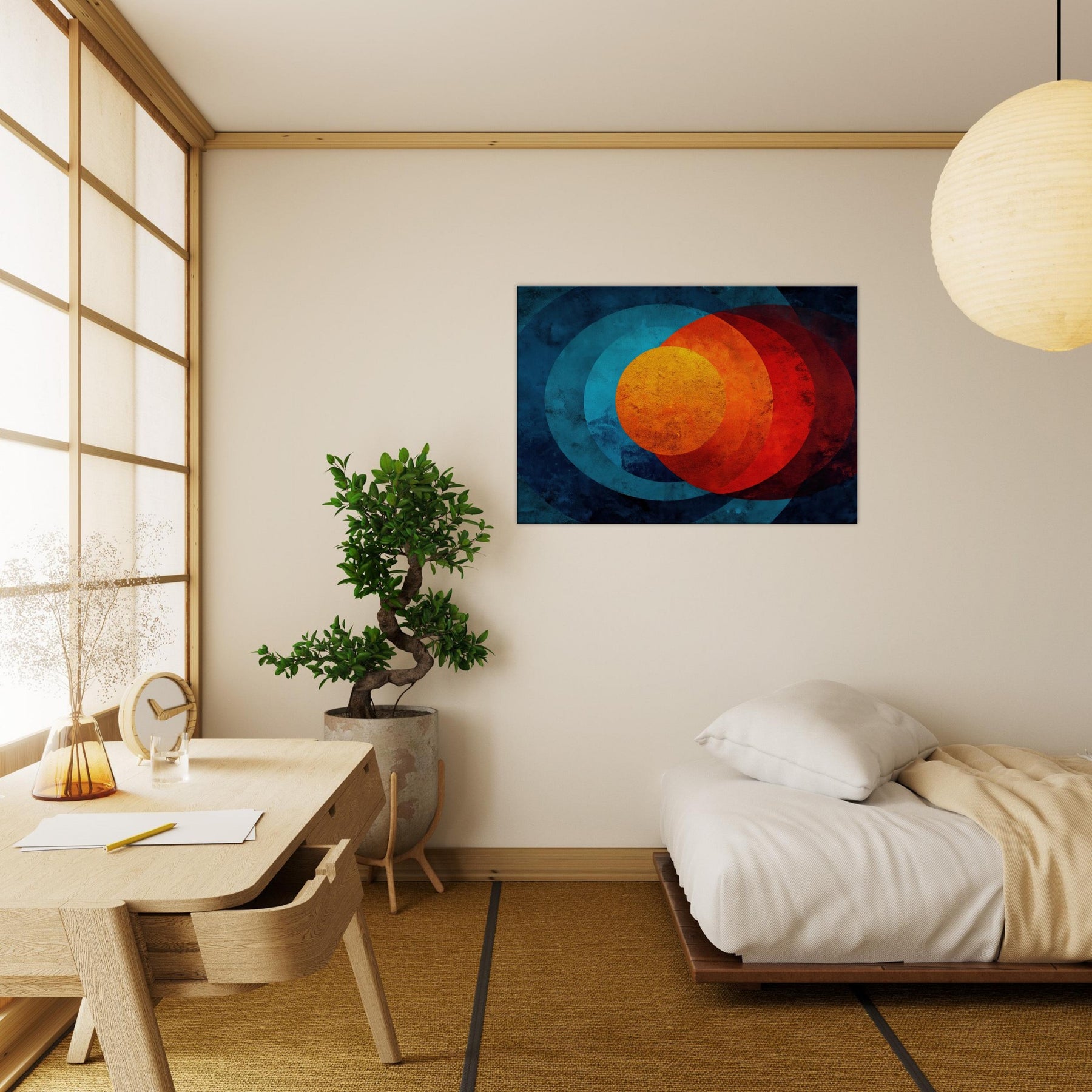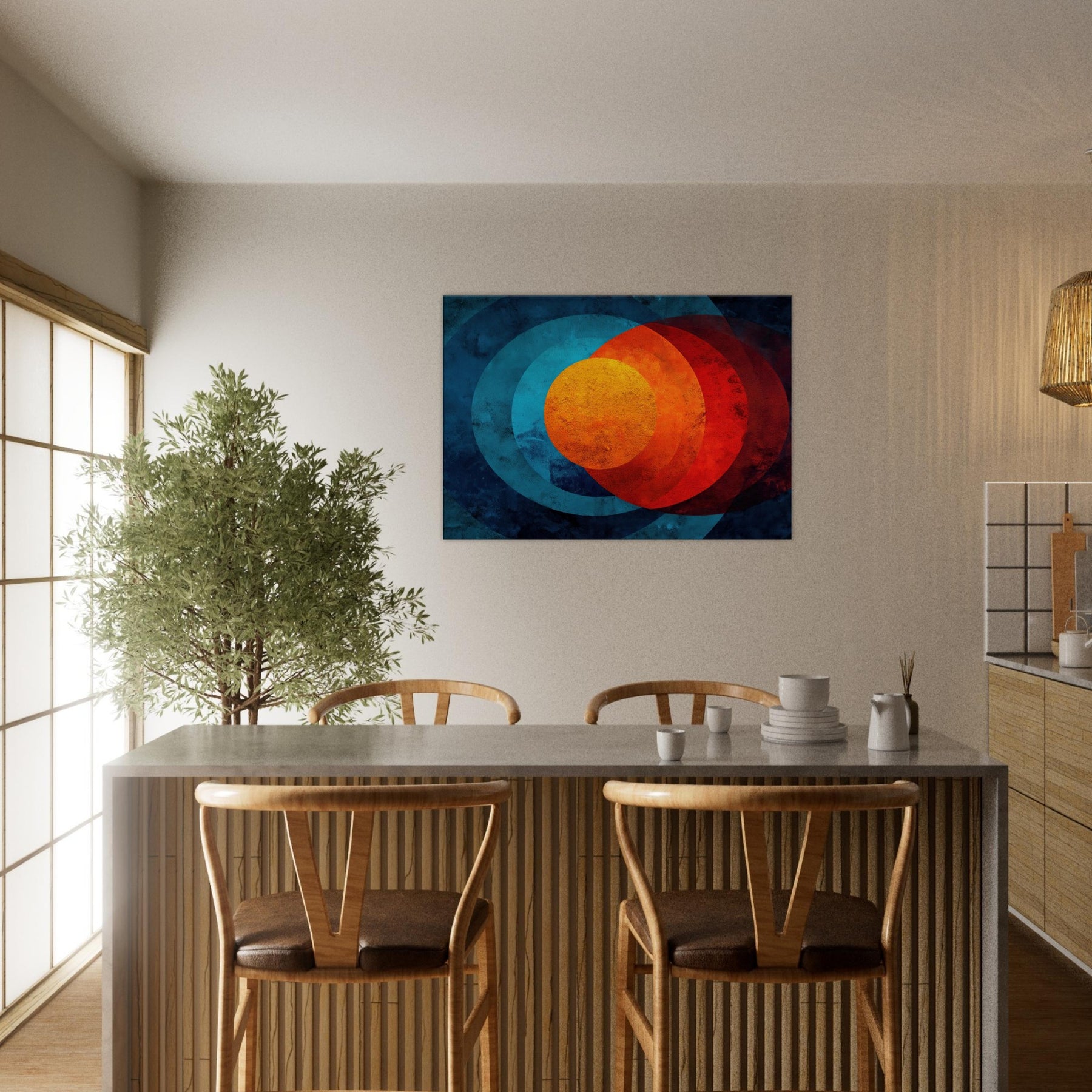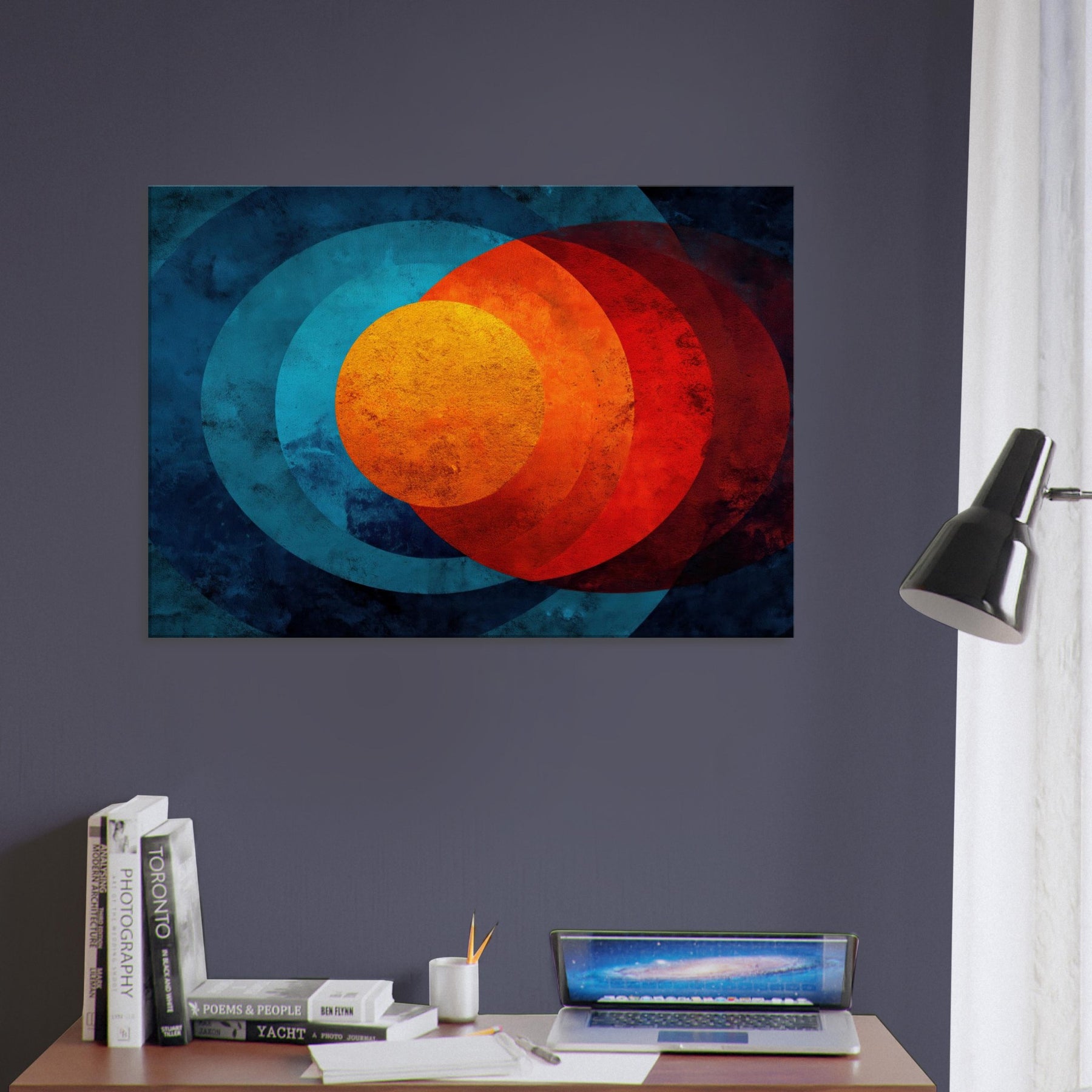 Eclipse unfurls across a field of color in a mystical abstract study. The concentric circles suggest unseen orbits and a quiet resonance that settles into the room like a breath. Blues melt into teal, while solar oranges and deep reds glow with warm intensity. The layered luminosity invites reflection, turning walls into a nighttime sky that softens modern interiors. Hang this piece where light lingers in a living room, hallway, or study to deepen texture, mood, and everyday poetry.