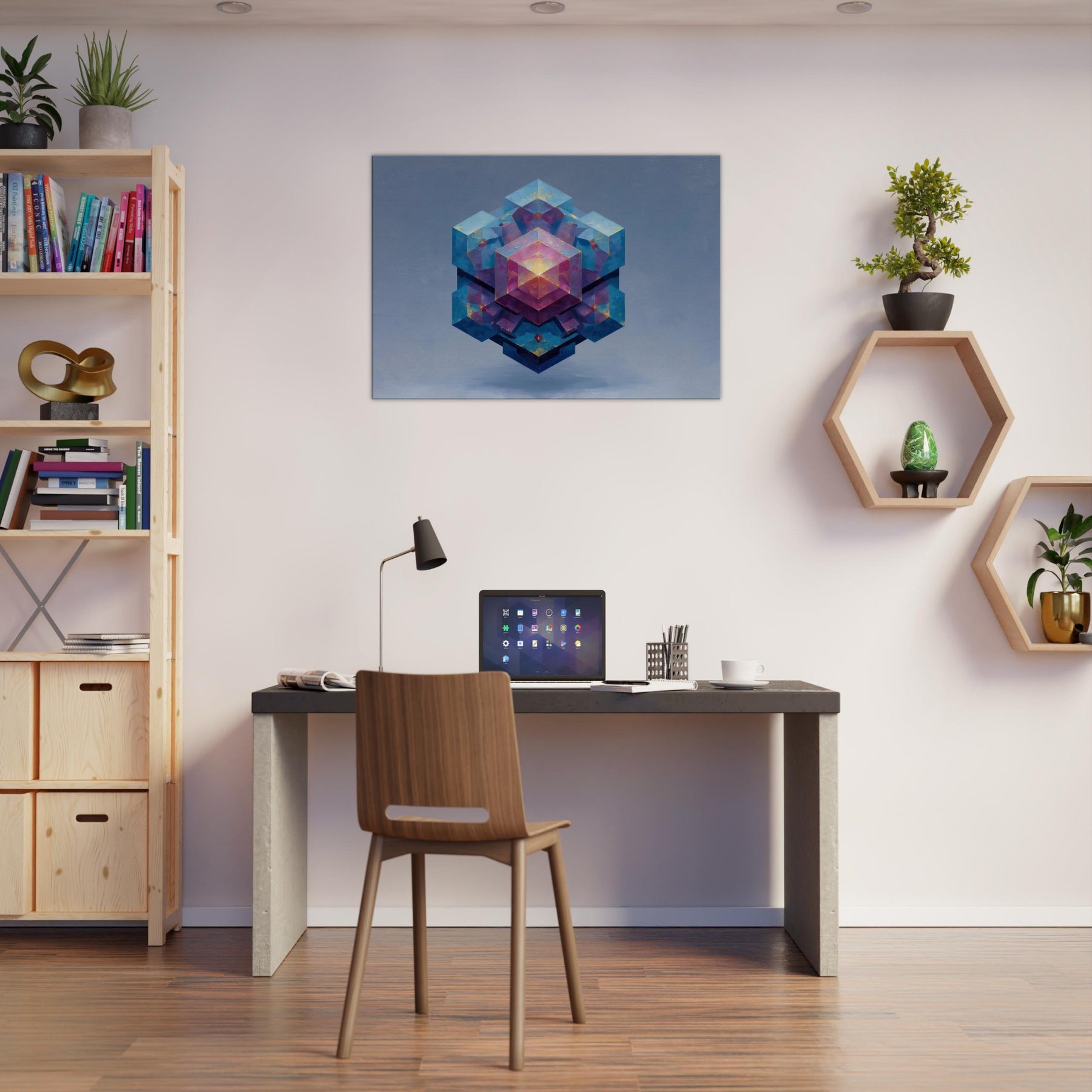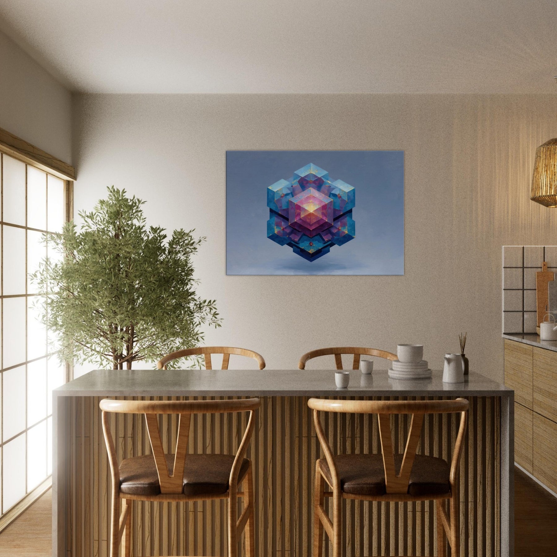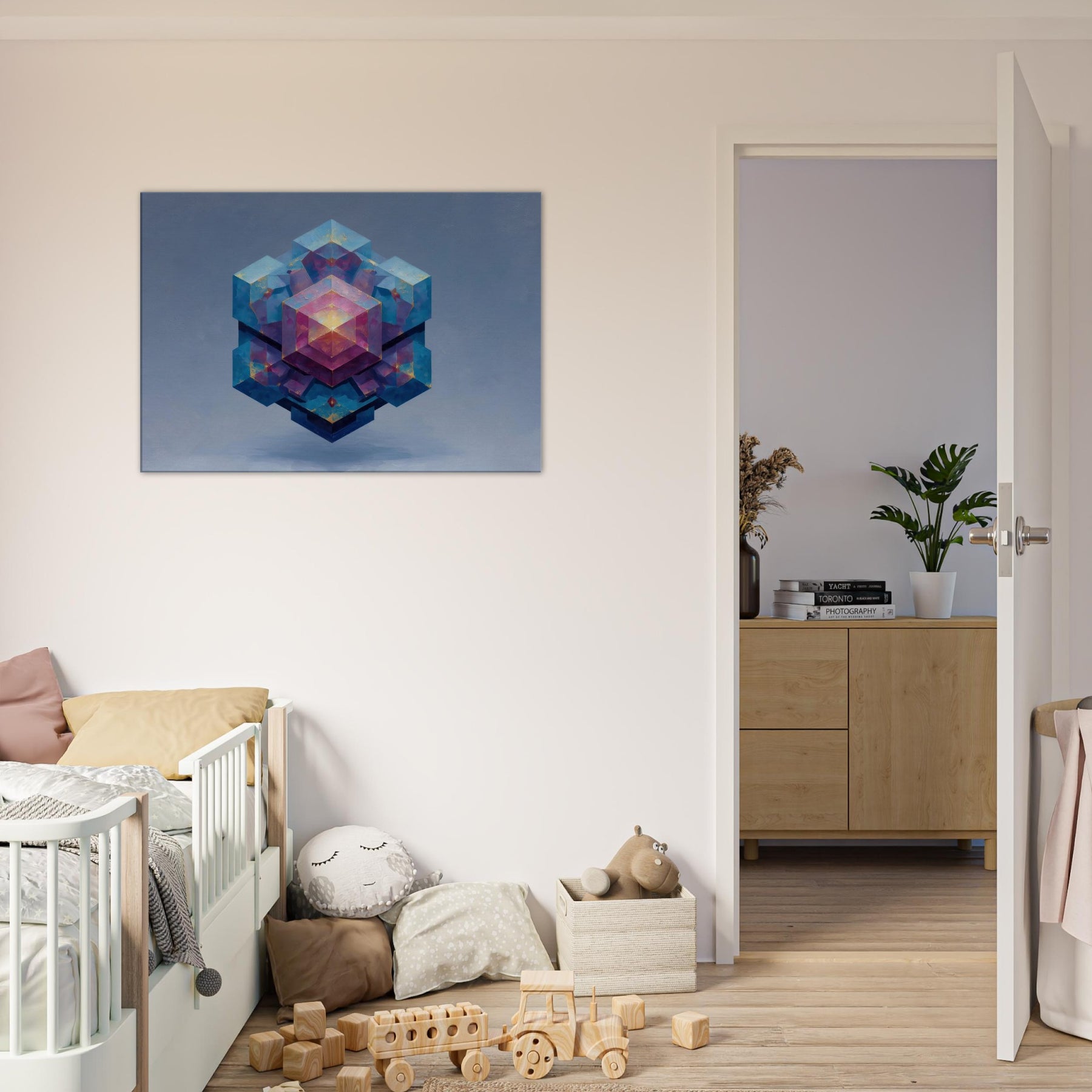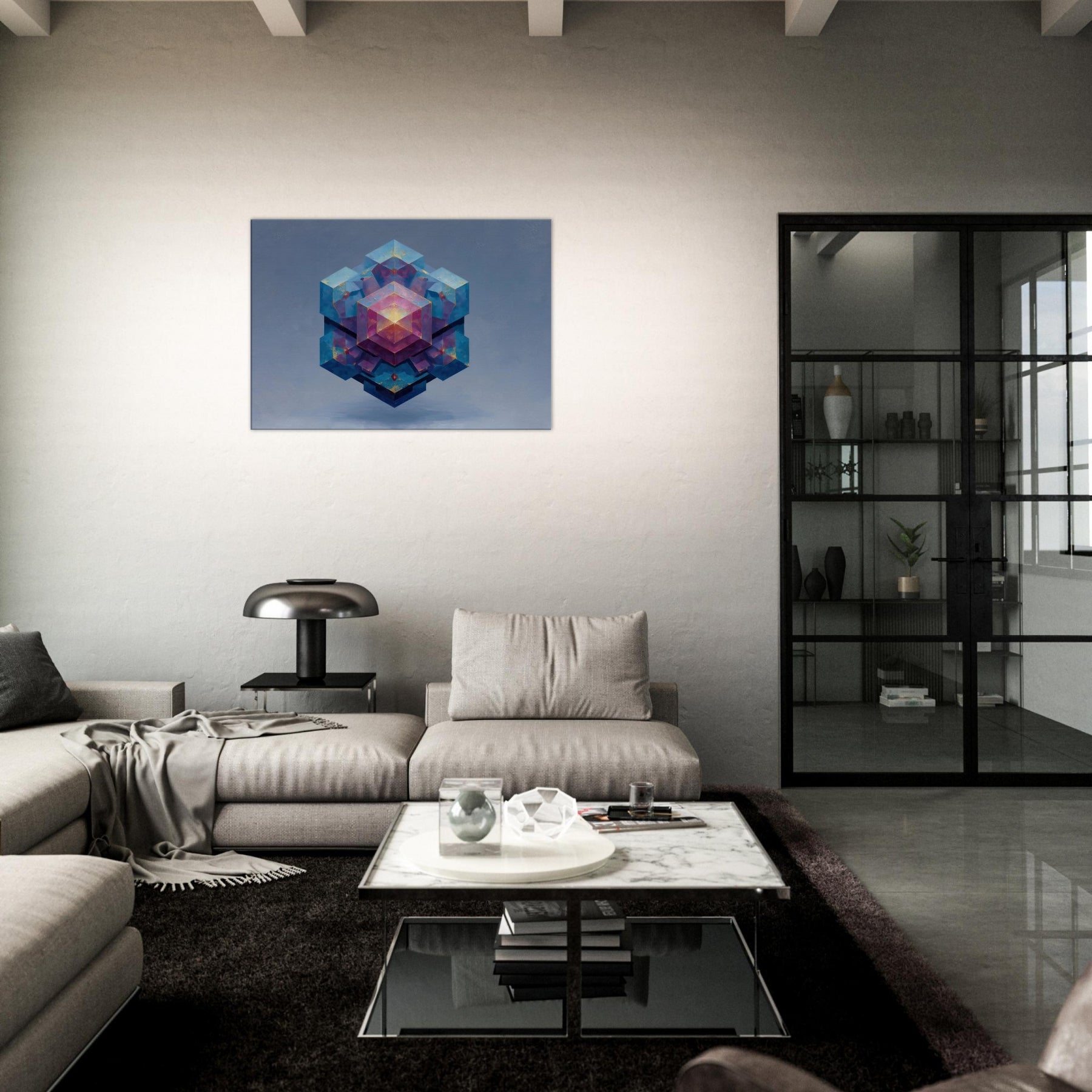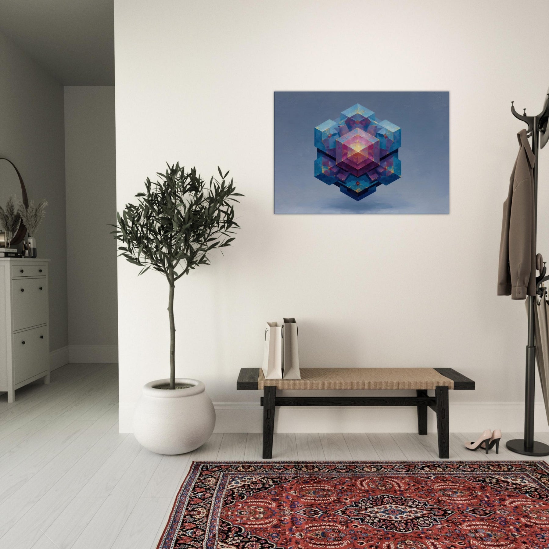 Metatron’s Cube radiates as a luminous organ of light, a portal of symmetry that refracts memory and intention. This abstract composition circles you with crystalline prisms blue, lavender, and gold whose facets catch the room’s breath and scatter it into calm, meditative glow. The artwork seems to hover, inviting quiet reflection and a sense of expansive space, perfect for a living room or study. Hang it where natural light meets evening shadow, and watch atmosphere transform into a slow, celestial rhythm.