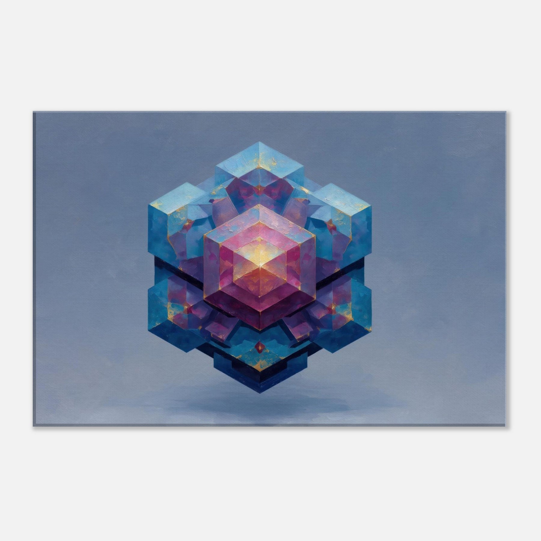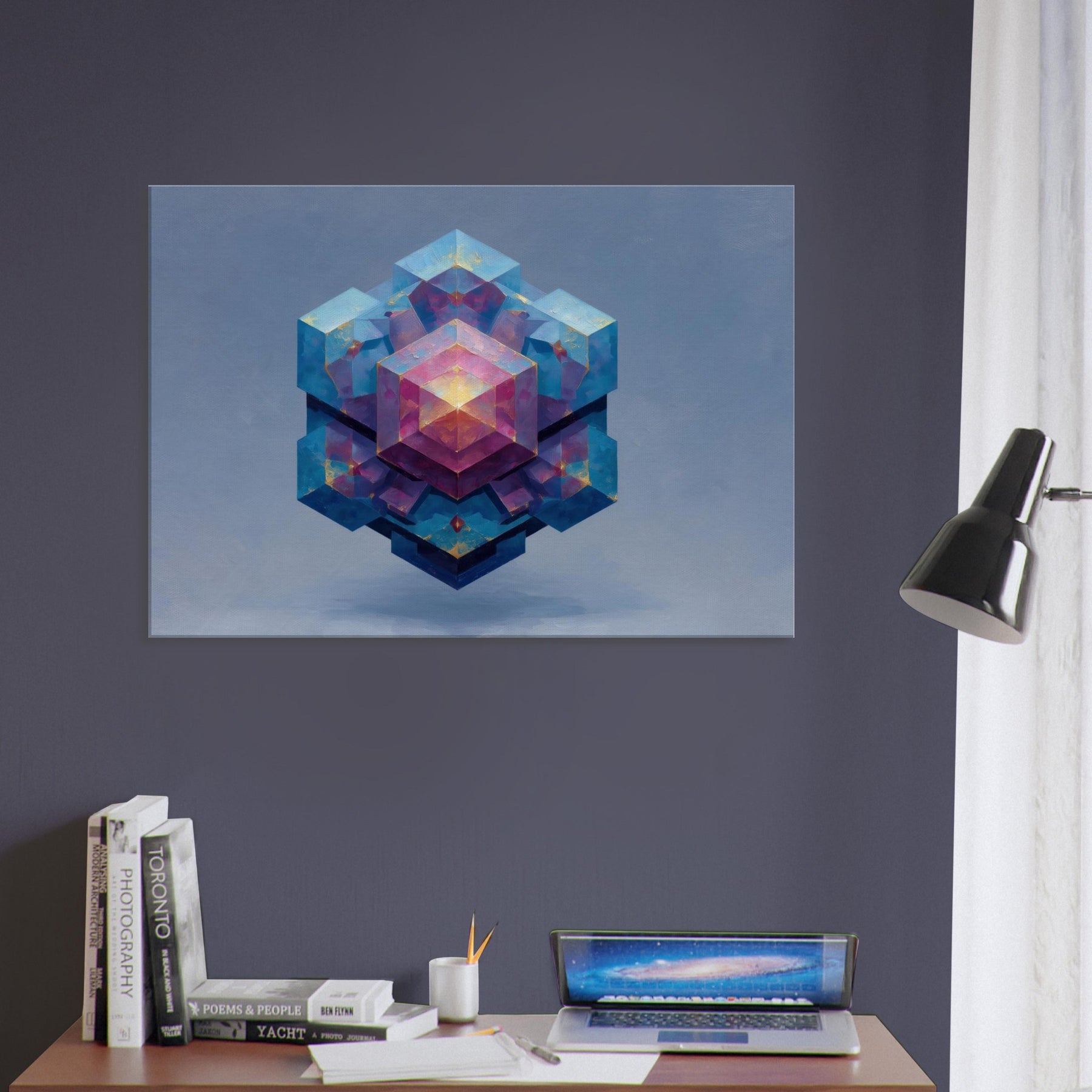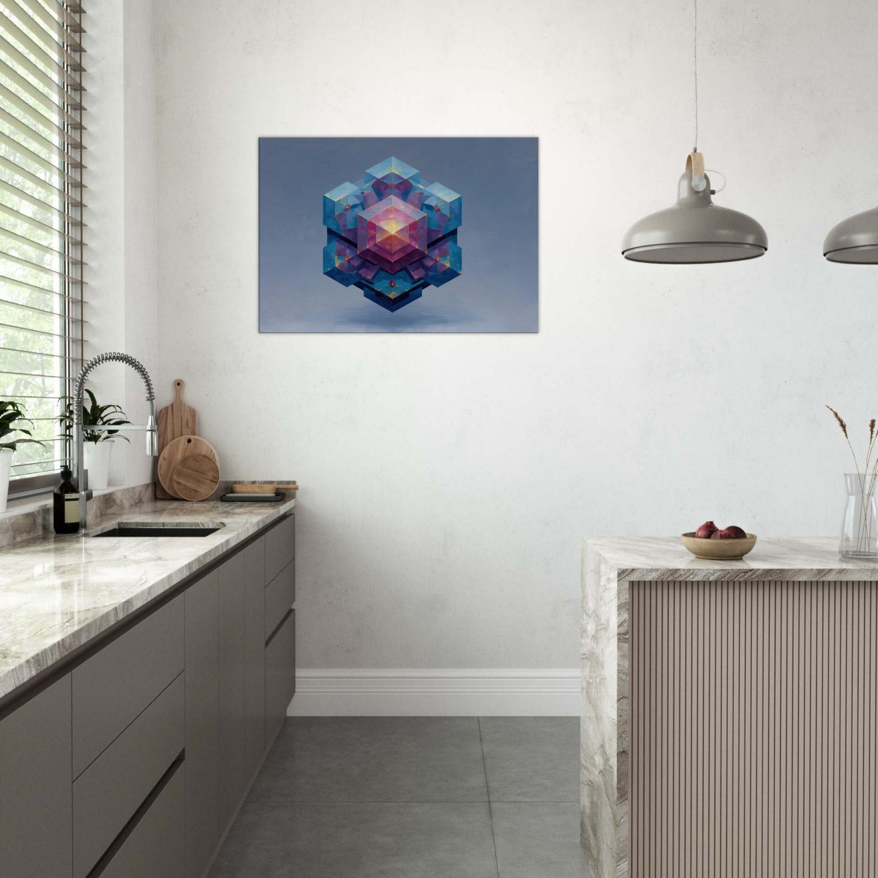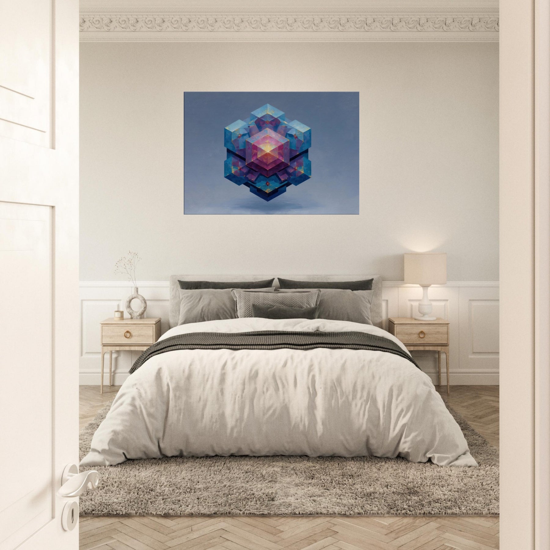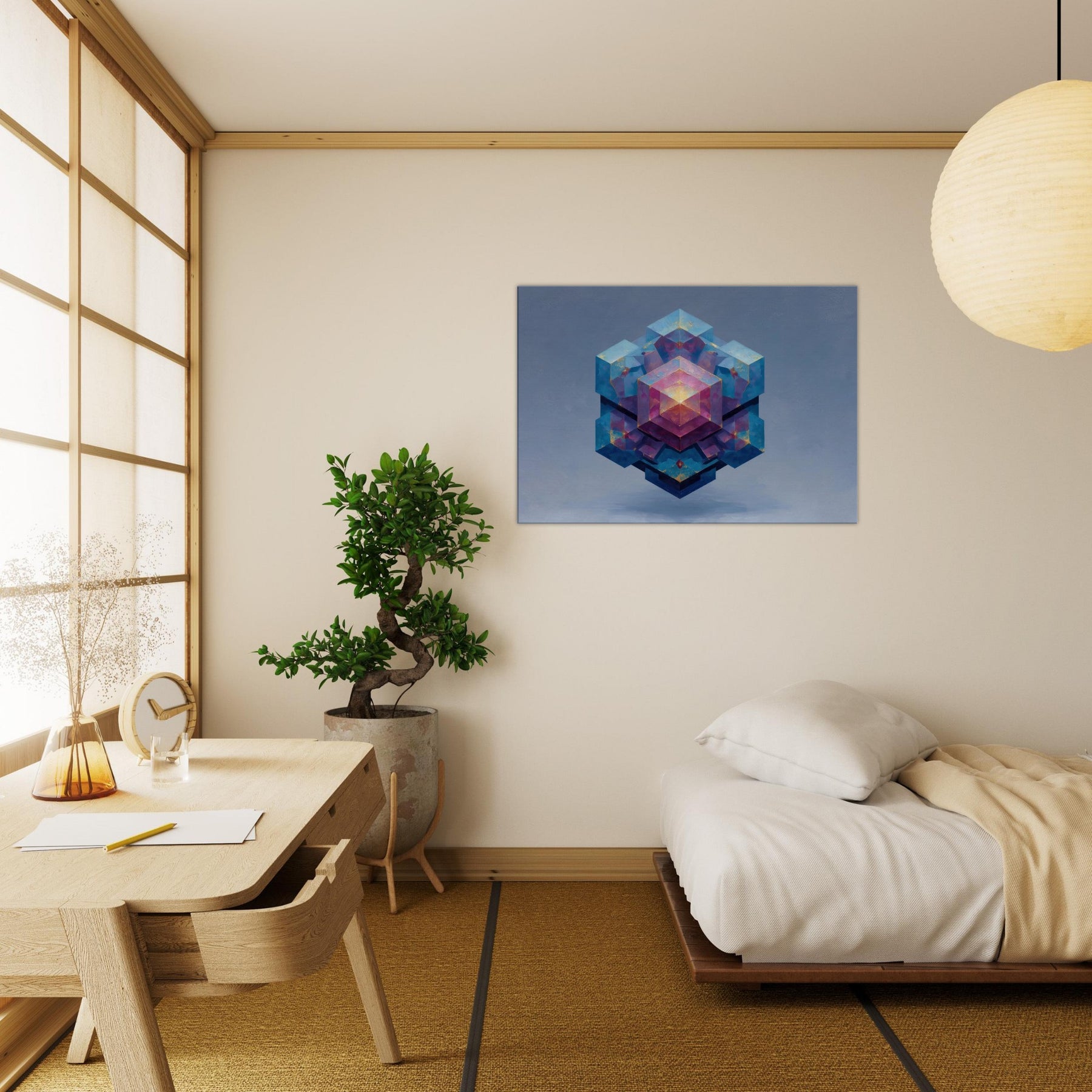 Metatron’s Cube radiates as a luminous organ of light, a portal of symmetry that refracts memory and intention. This abstract composition circles you with crystalline prisms blue, lavender, and gold whose facets catch the room’s breath and scatter it into calm, meditative glow. The artwork seems to hover, inviting quiet reflection and a sense of expansive space, perfect for a living room or study. Hang it where natural light meets evening shadow, and watch atmosphere transform into a slow, celestial rhythm.
