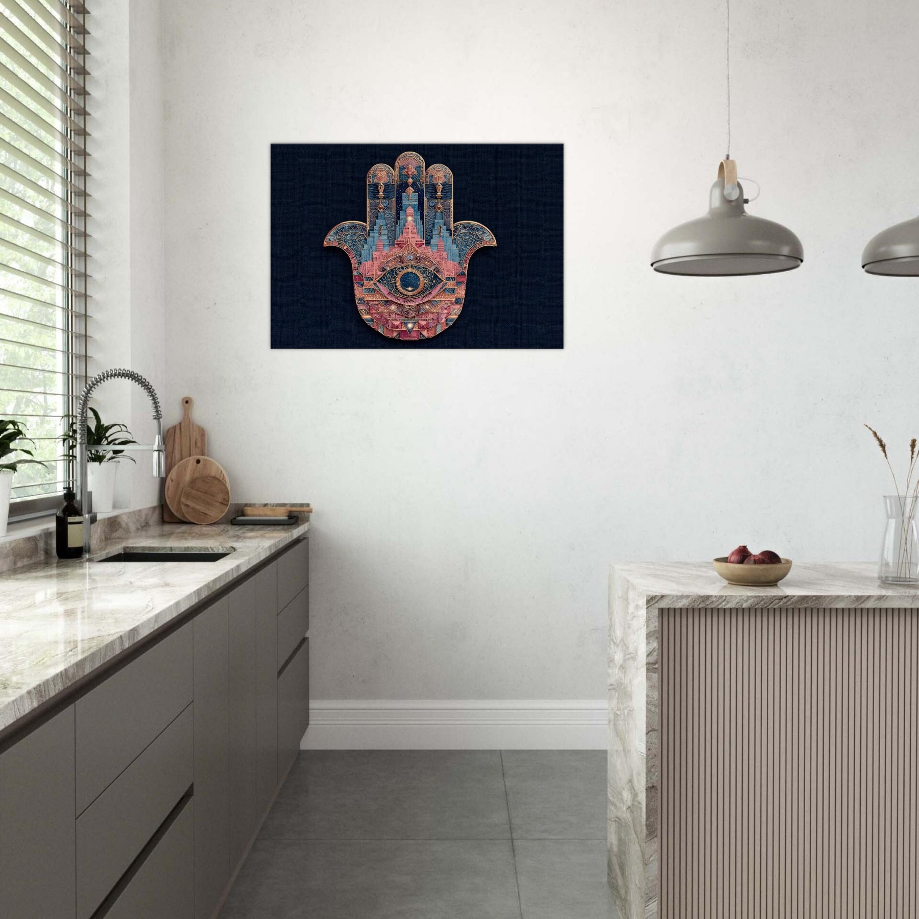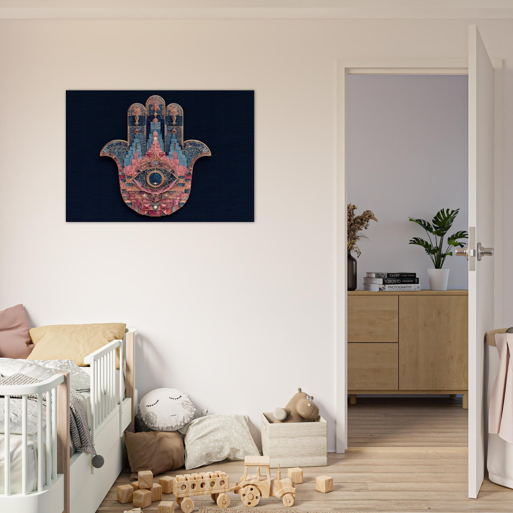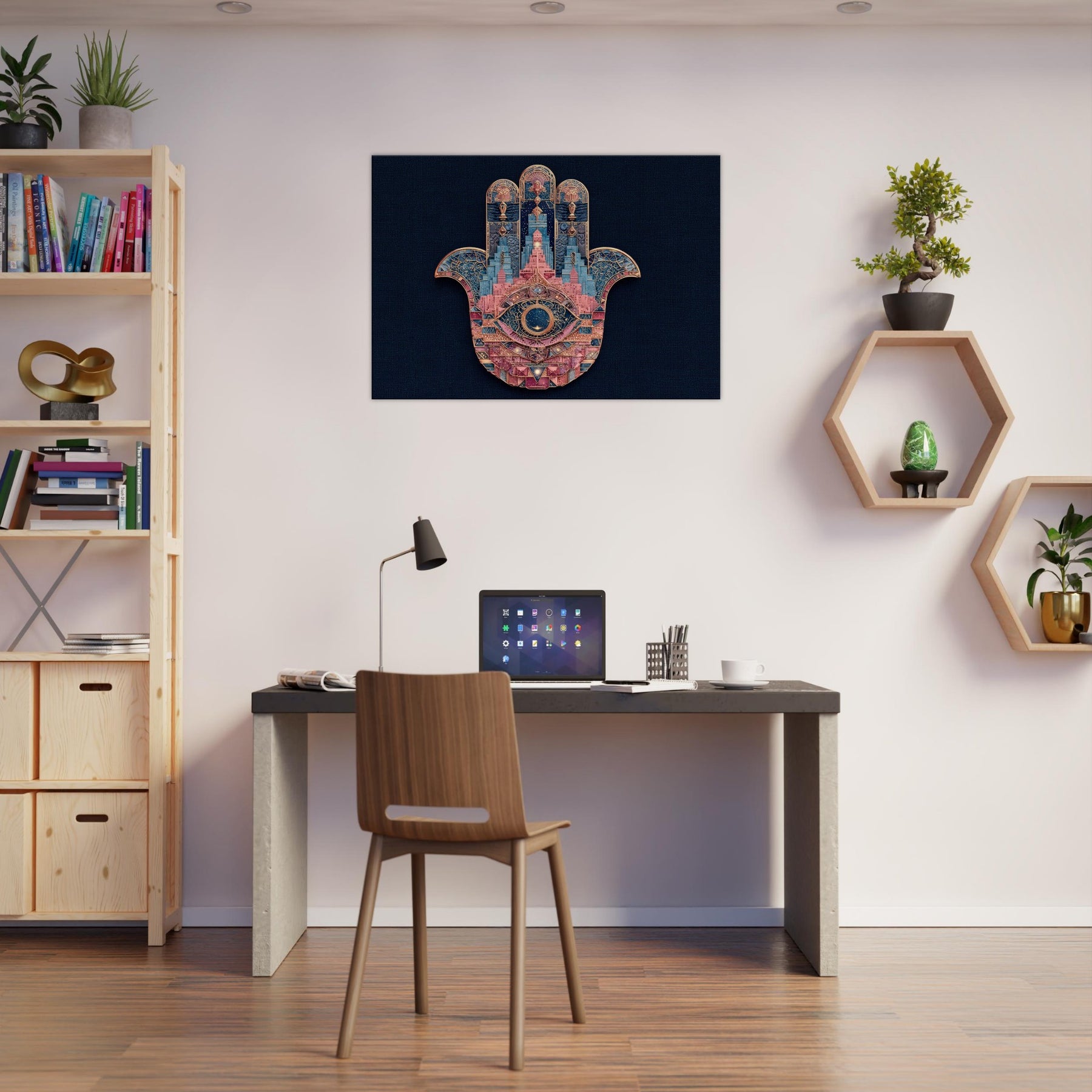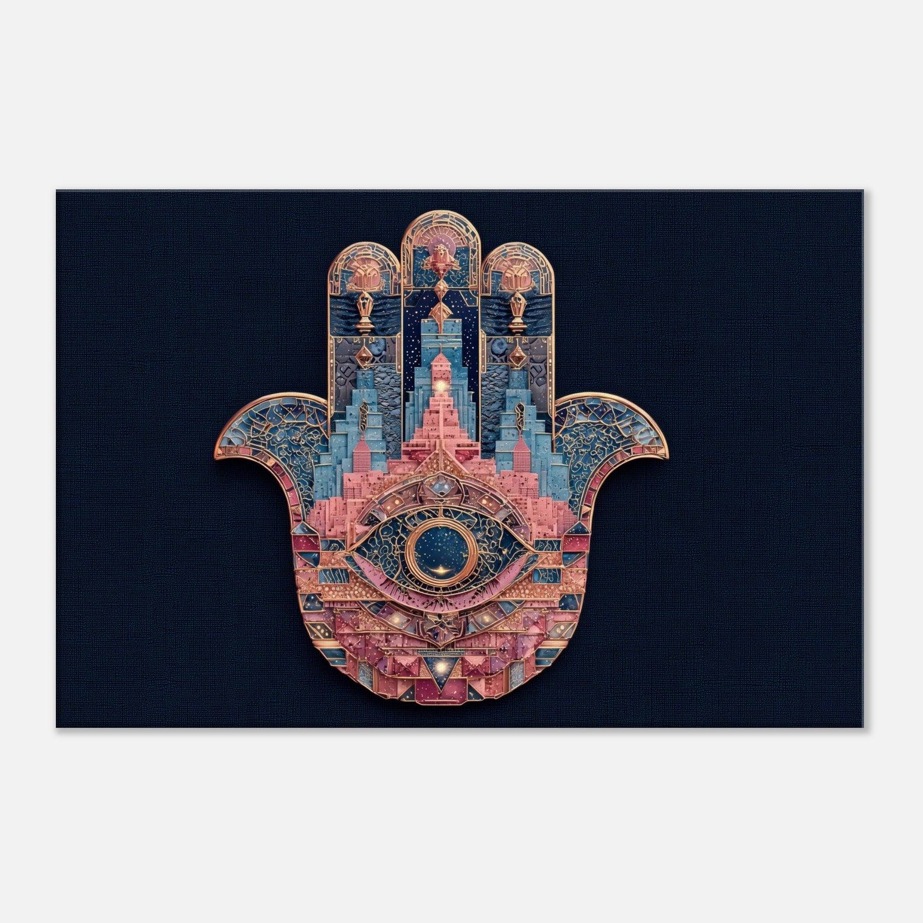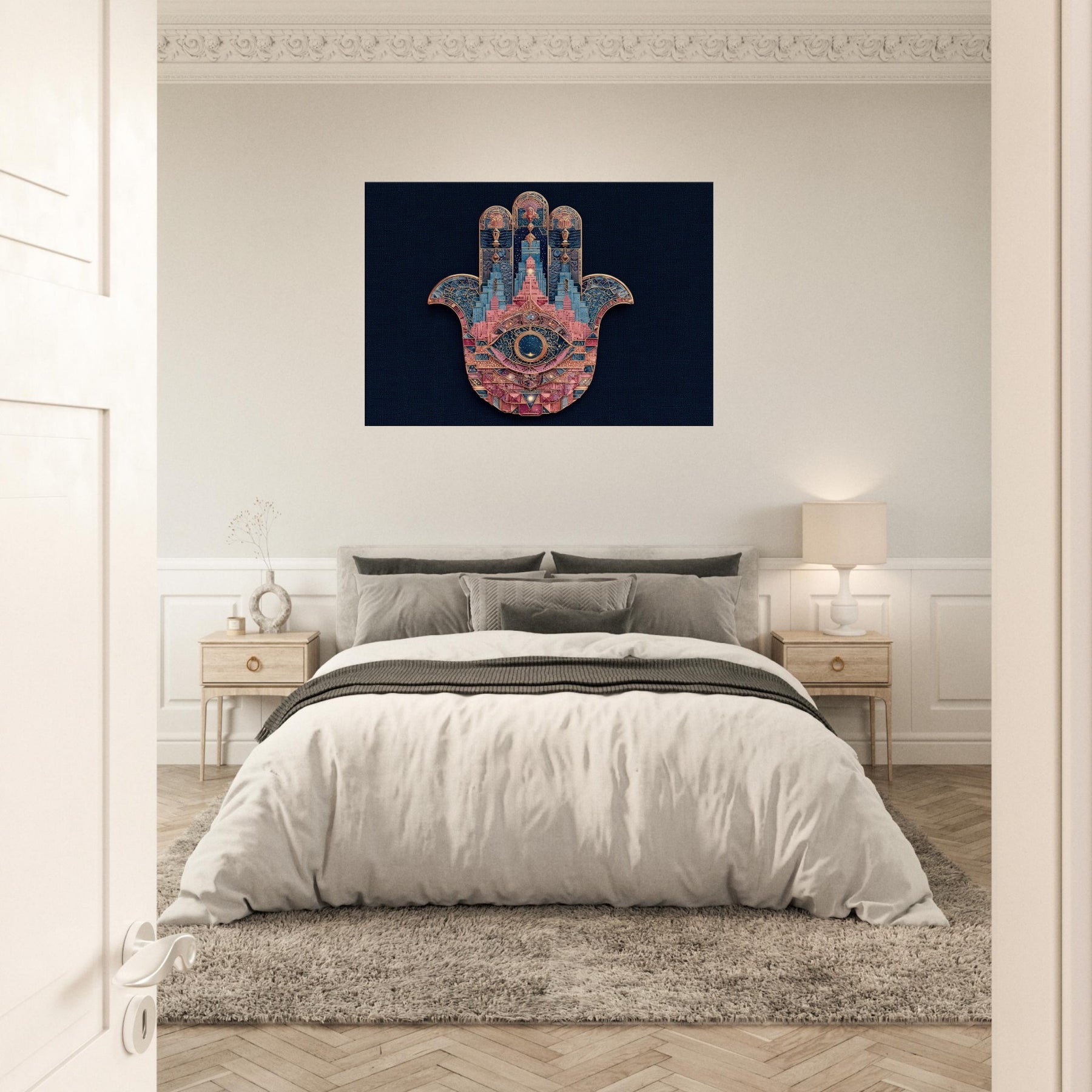 An emblem of protection rendered in an abstract symphony, the Hamsa (Hand of Fatima) unfurls in color and light. The piece invites the eye to wander across pink citadels, blue dunes, and gold filigree, swirling into a star kissed night. It feels cool, intimate, and meditative like a quiet sanctuary within a living room. Hang it where soft radiance can kiss its edges; the atmosphere shifts, turning everyday spaces into a ritual of calm, hope, and mystic wonder.