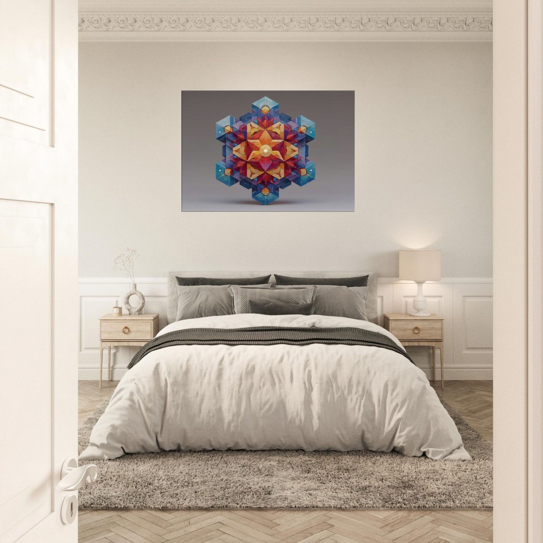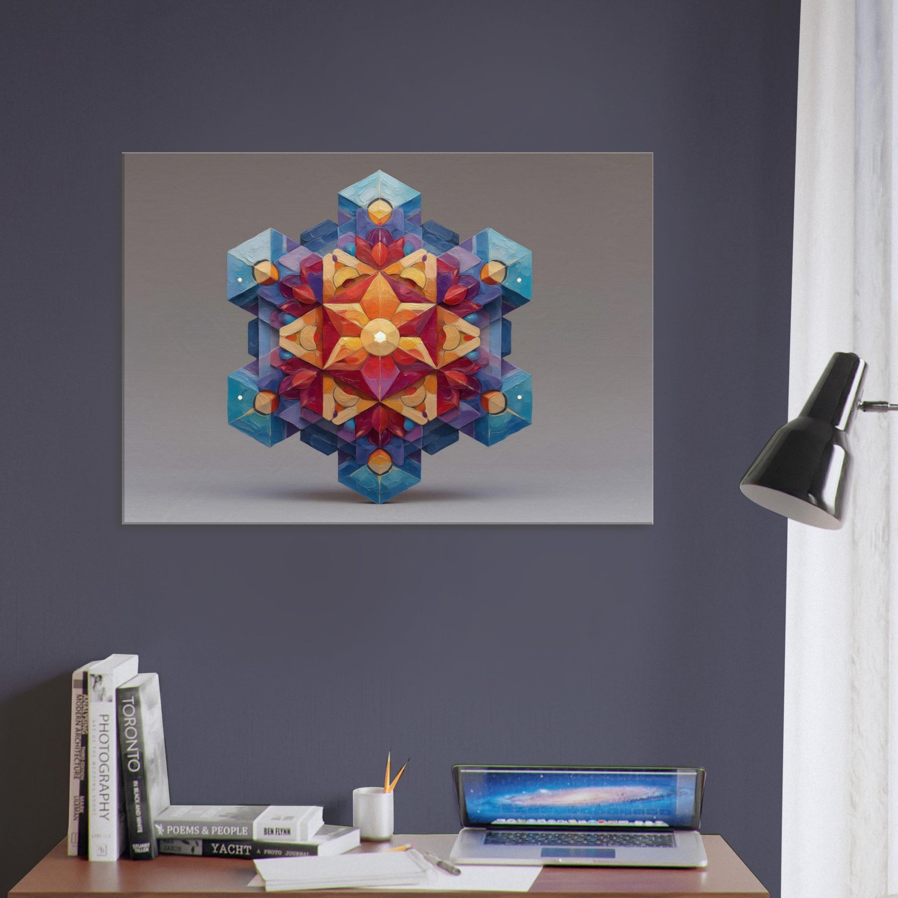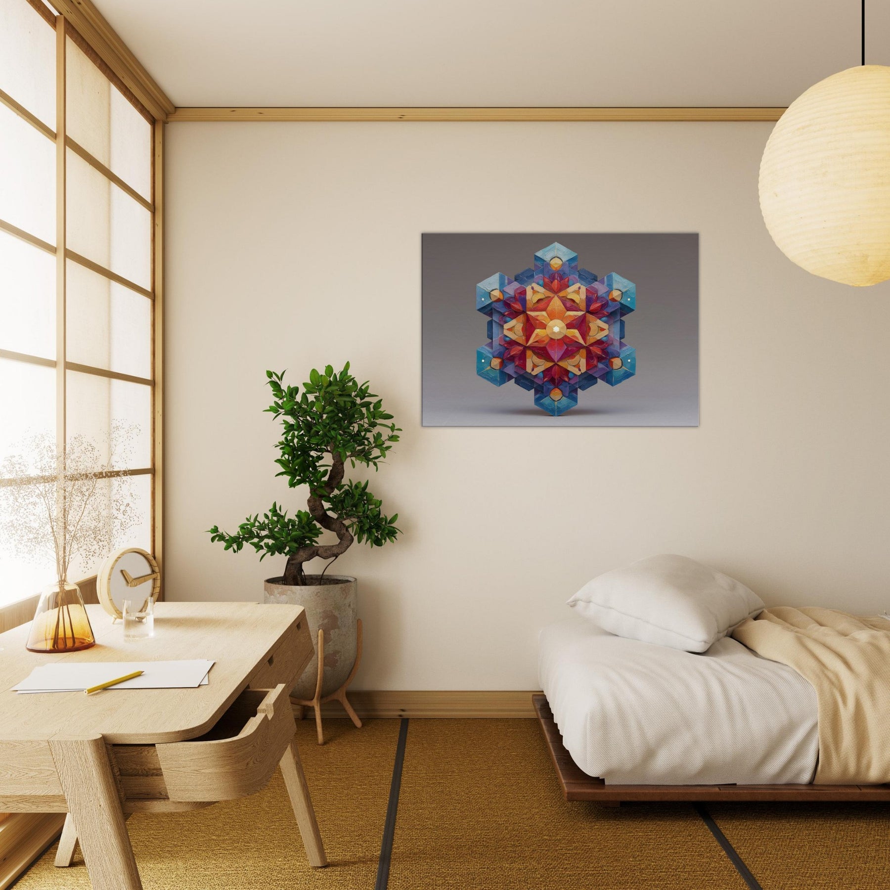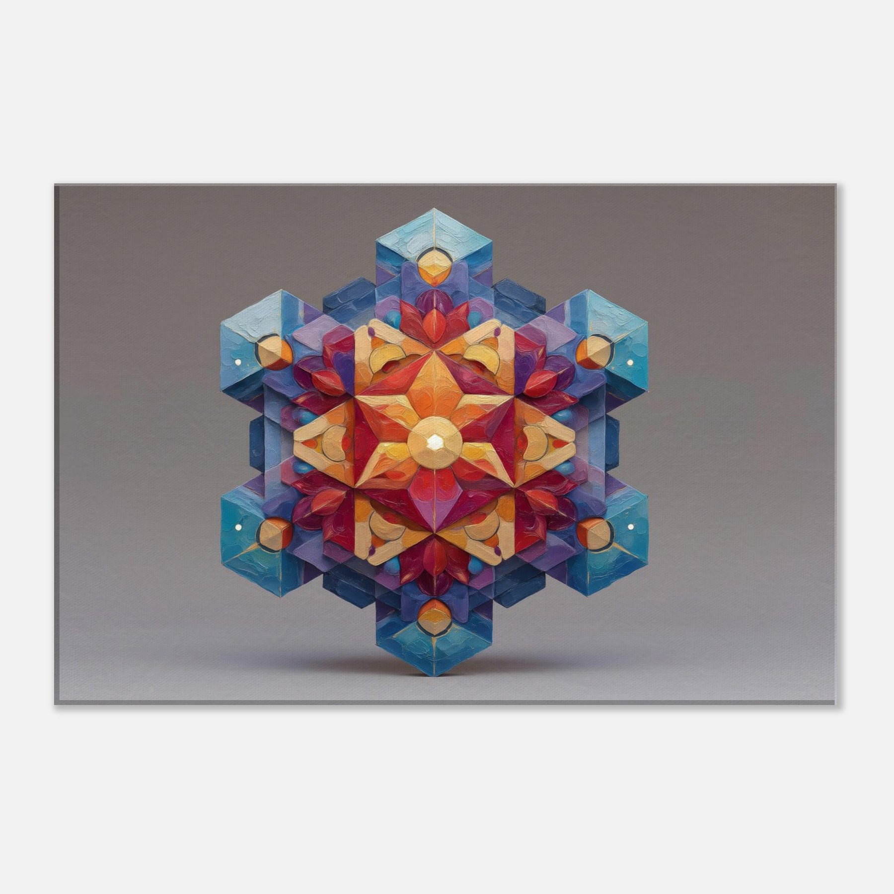 Metatron's Cube unfolds as a luminous mandala, a whirl of color and precise geometry that seems to glow from within. This abstract composition channels mystic energy into a living space, inviting calm focus, whispered conversation, and quiet awe. The artwork's layered facets catch light and shade, shifting from warm amber to cool sapphire as you move, making the room feel more expansive. Hang it where ambience should bloom entrance hall, study, or a serene living area and let Metatron's Cube anchor the mood. The central subject is Metatron’S Cube.