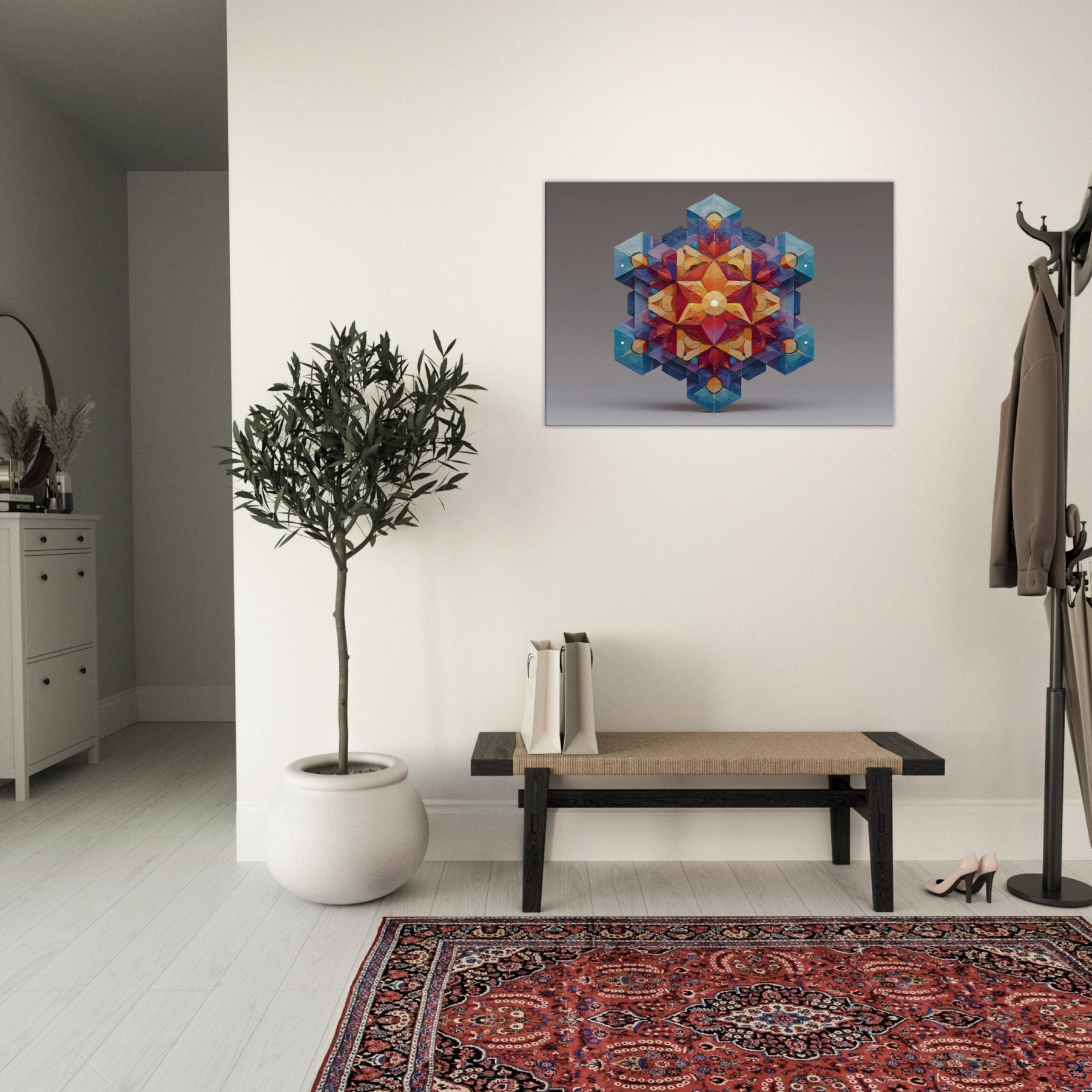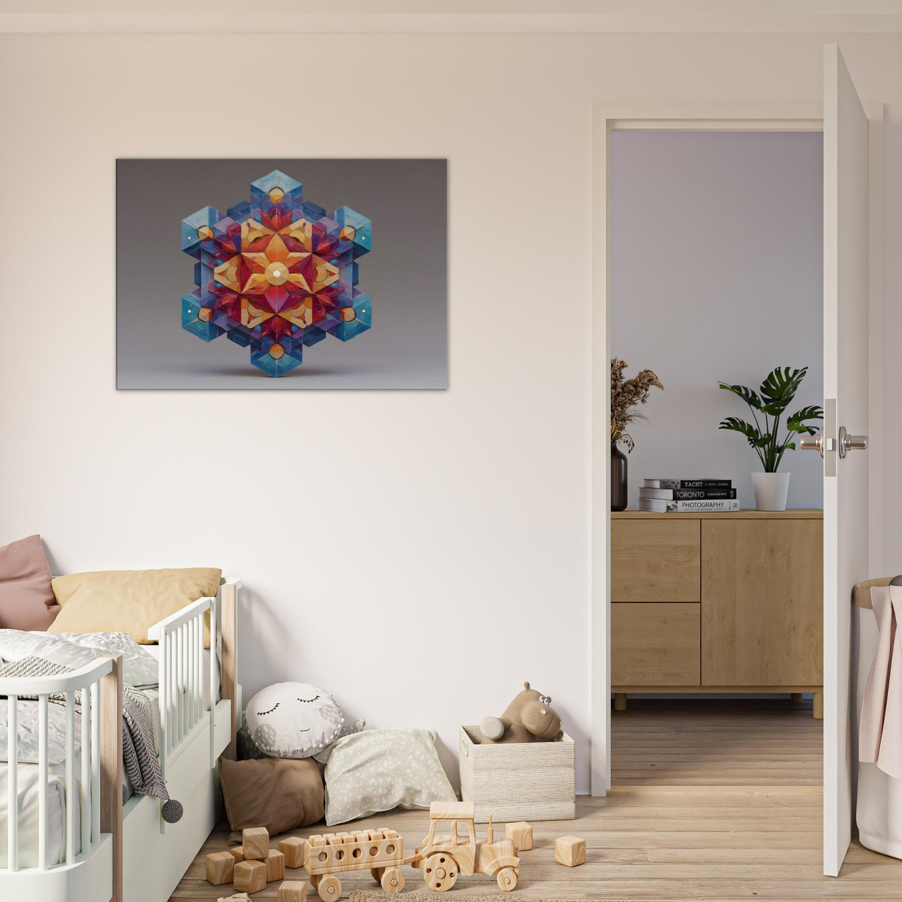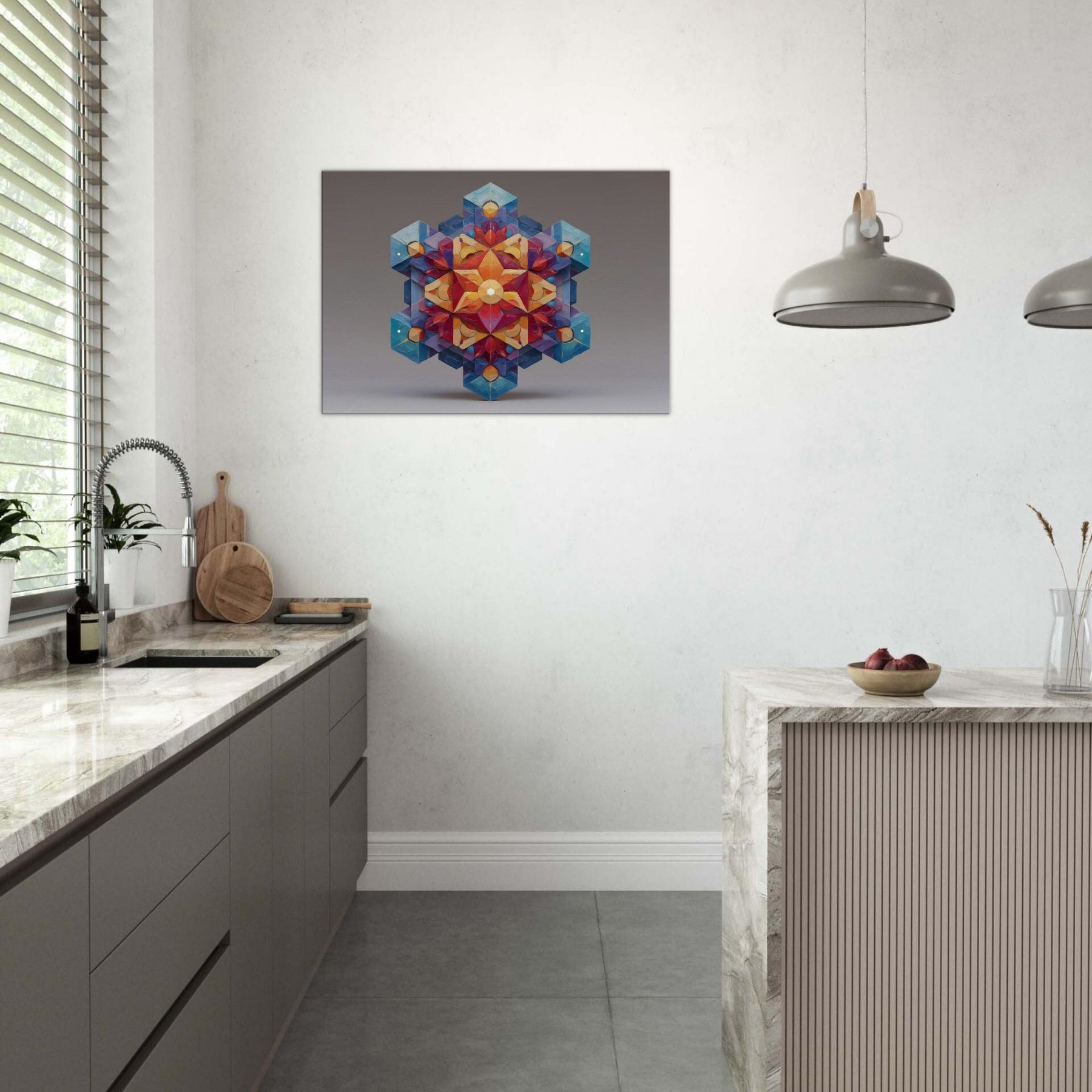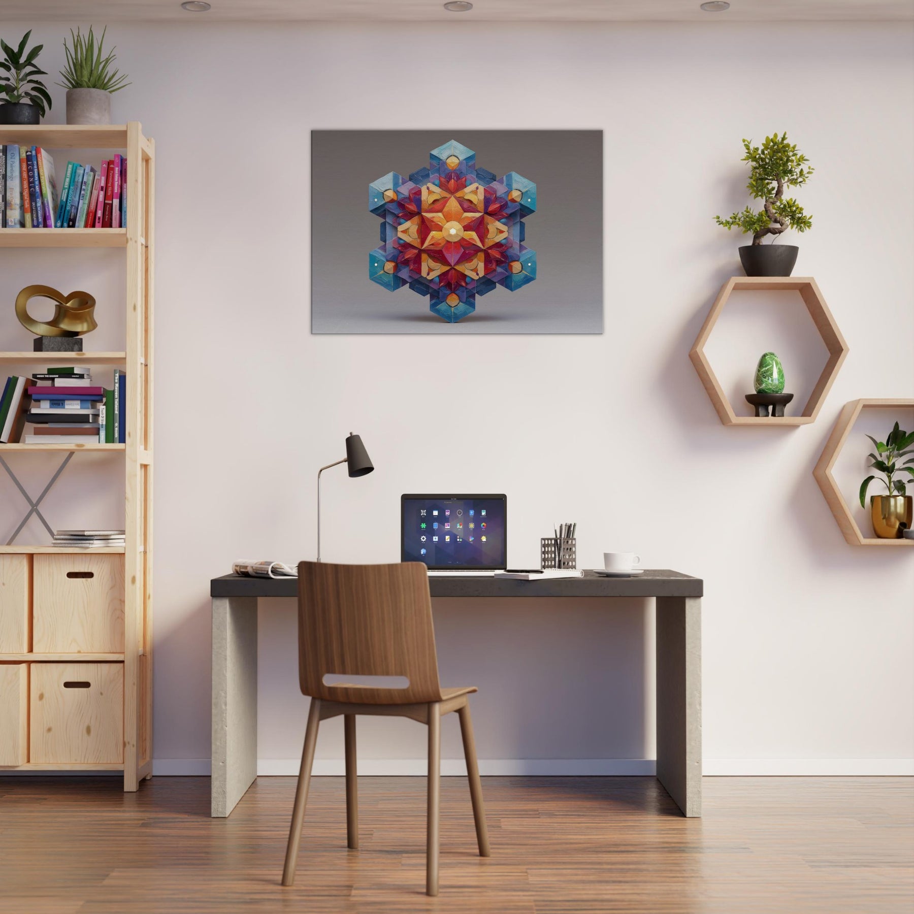 Metatron's Cube unfolds as a luminous mandala, a whirl of color and precise geometry that seems to glow from within. This abstract composition channels mystic energy into a living space, inviting calm focus, whispered conversation, and quiet awe. The artwork's layered facets catch light and shade, shifting from warm amber to cool sapphire as you move, making the room feel more expansive. Hang it where ambience should bloom entrance hall, study, or a serene living area and let Metatron's Cube anchor the mood. The central subject is Metatron’S Cube.