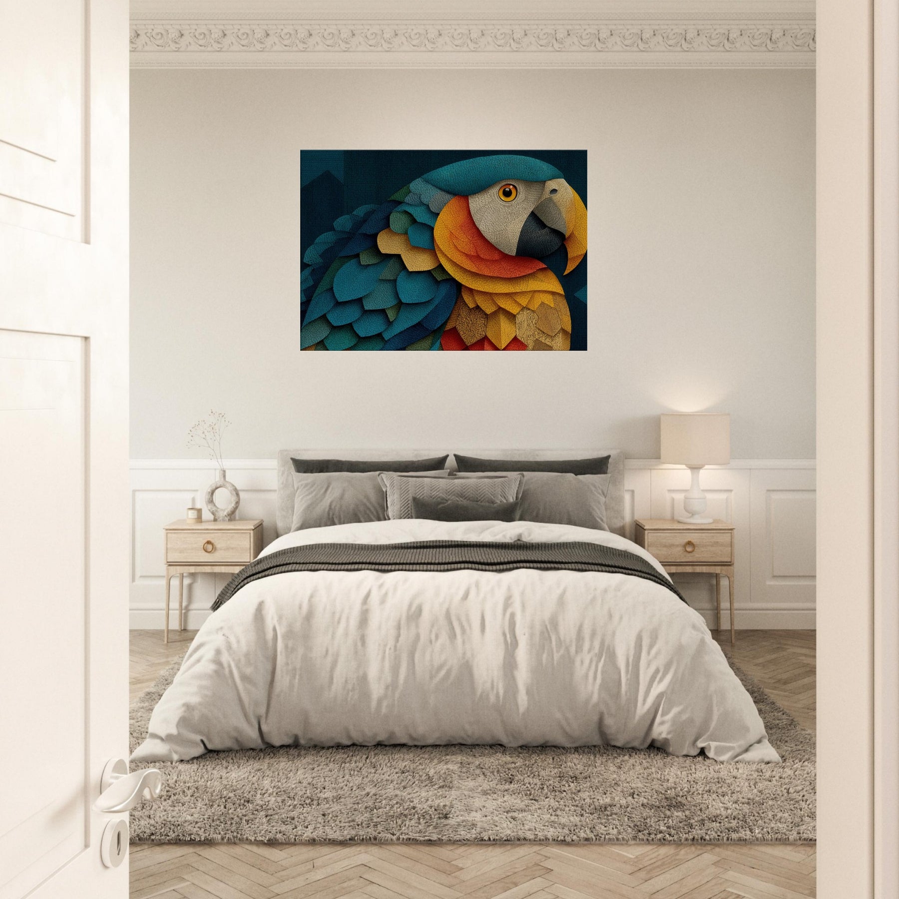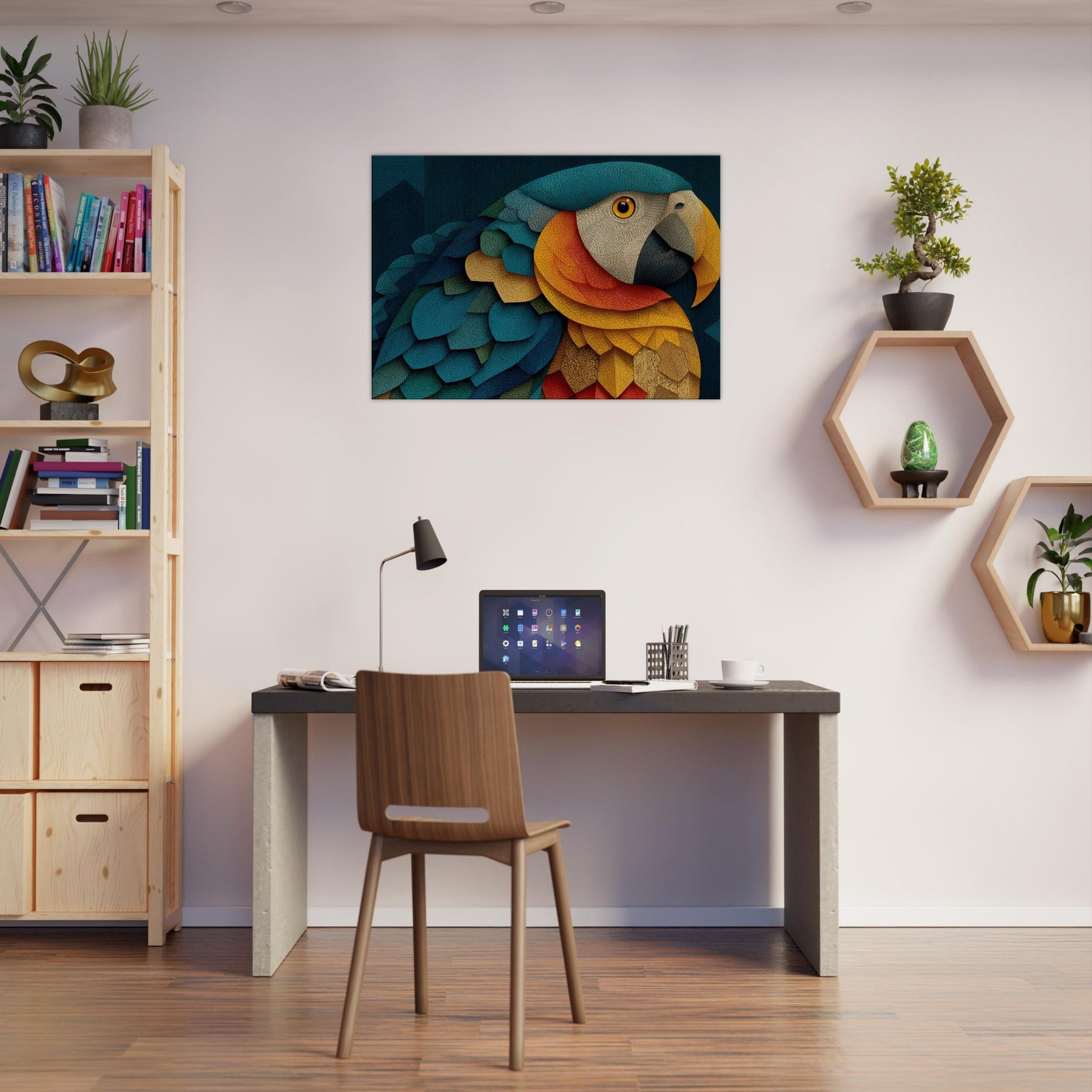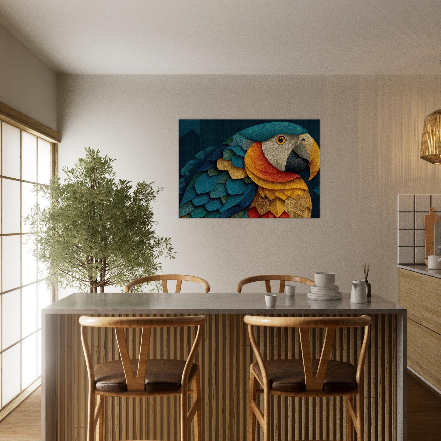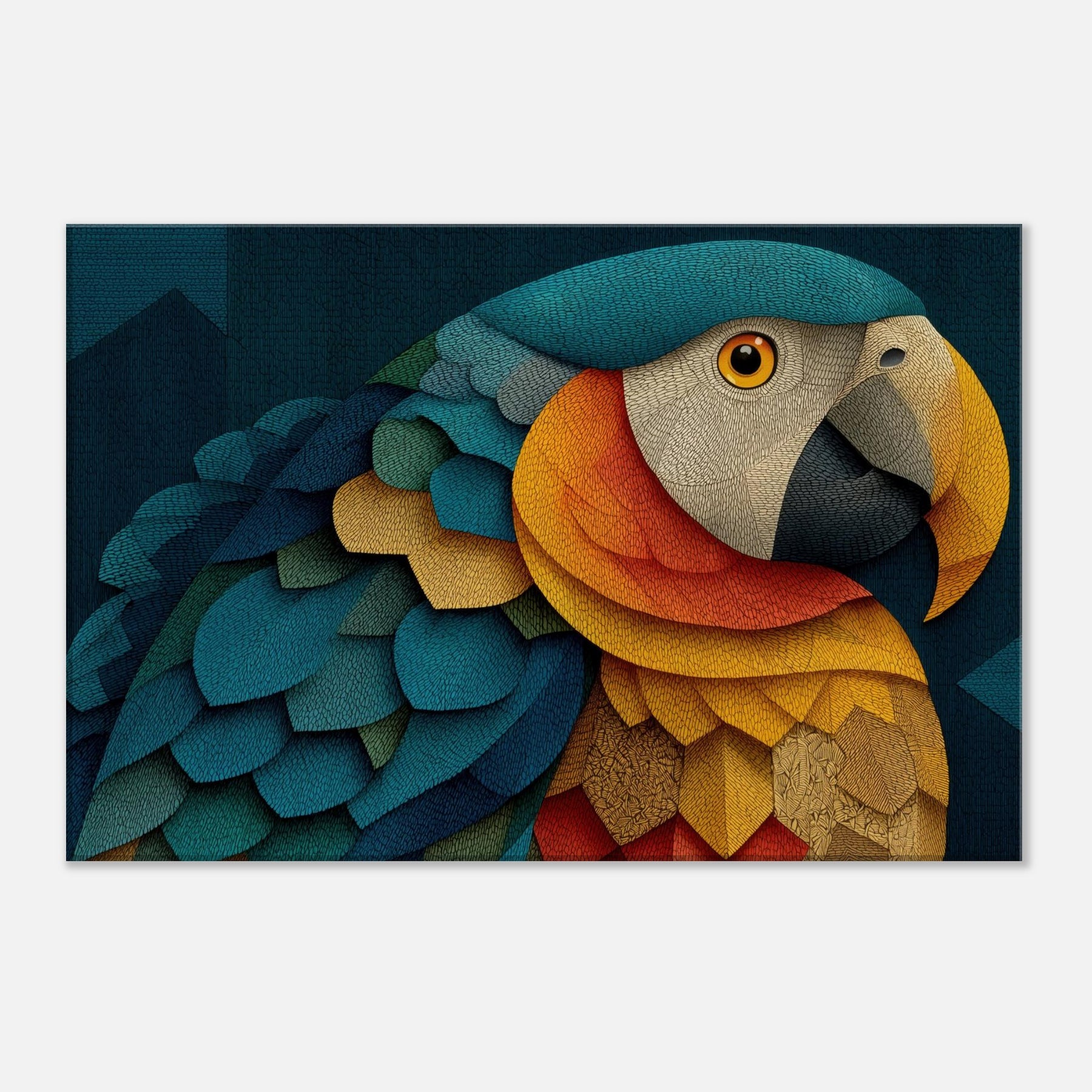 A luminous Parrot unfolds across shimmering scales of color, inviting the eye to wander through a dreamlike canopy. This abstract composition blends turquoise, cobalt, gold, and coral into a living texture that feels like fabric and light coalescing on your wall. The mood is both serene and electric, turning a quiet corner into a tropical sanctuary. Hang it to spark conversation, soften edges, and breathe rhythm into any living space.