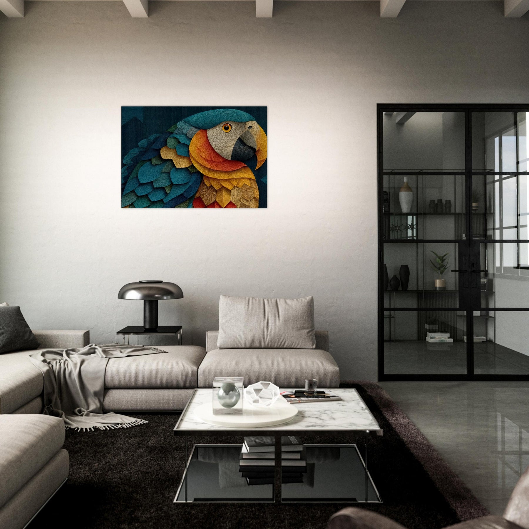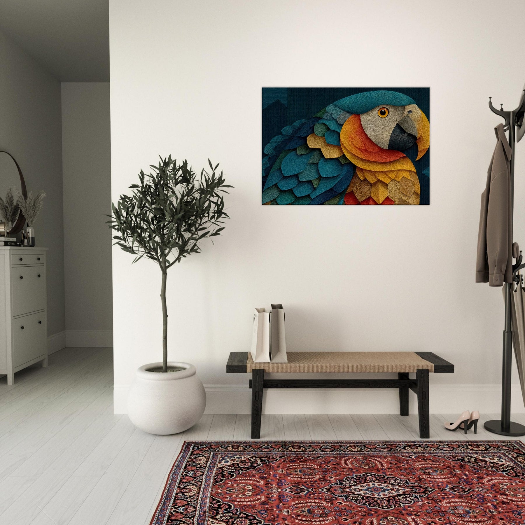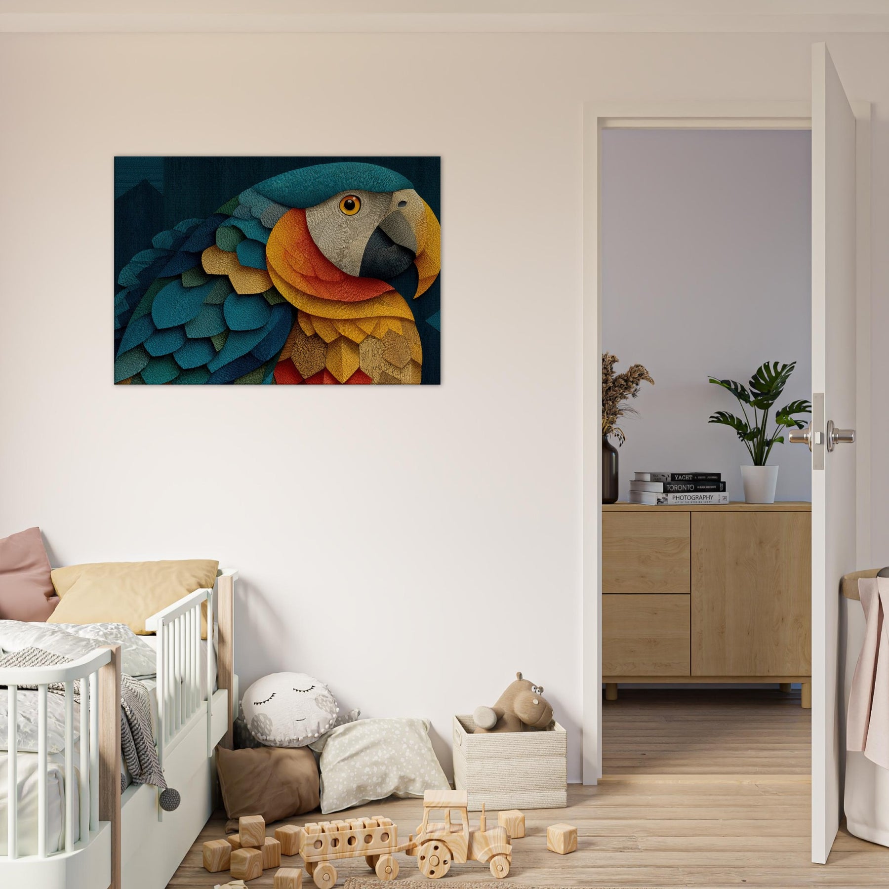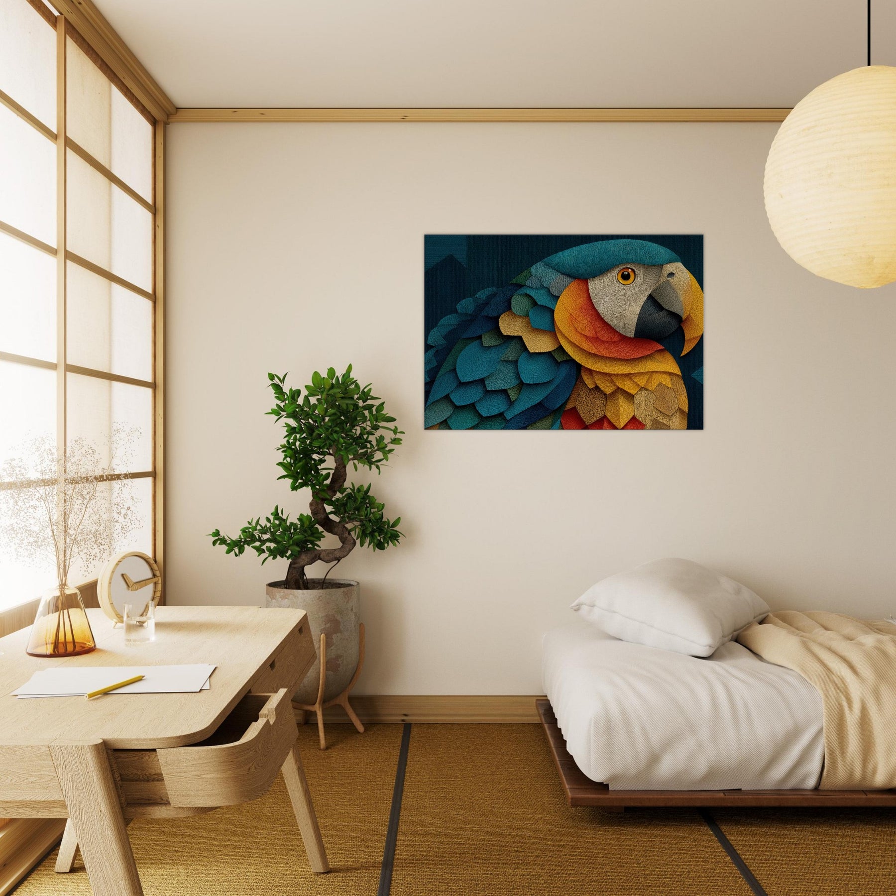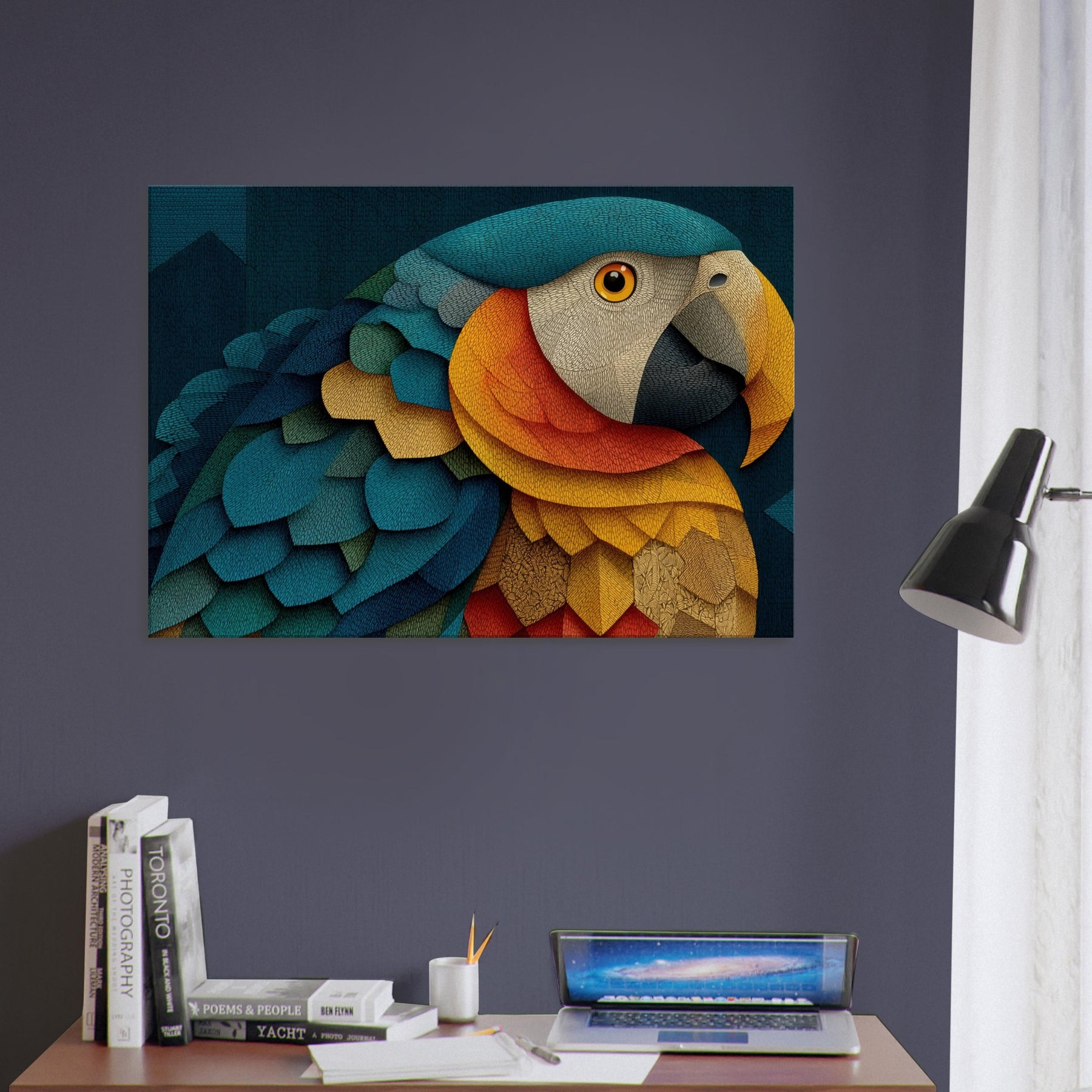 A luminous Parrot unfolds across shimmering scales of color, inviting the eye to wander through a dreamlike canopy. This abstract composition blends turquoise, cobalt, gold, and coral into a living texture that feels like fabric and light coalescing on your wall. The mood is both serene and electric, turning a quiet corner into a tropical sanctuary. Hang it to spark conversation, soften edges, and breathe rhythm into any living space.