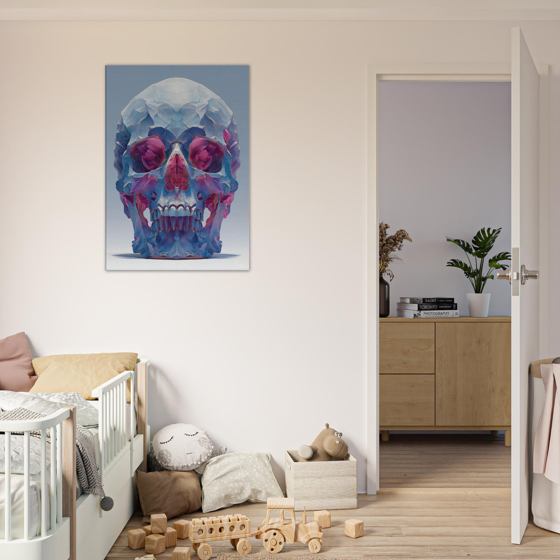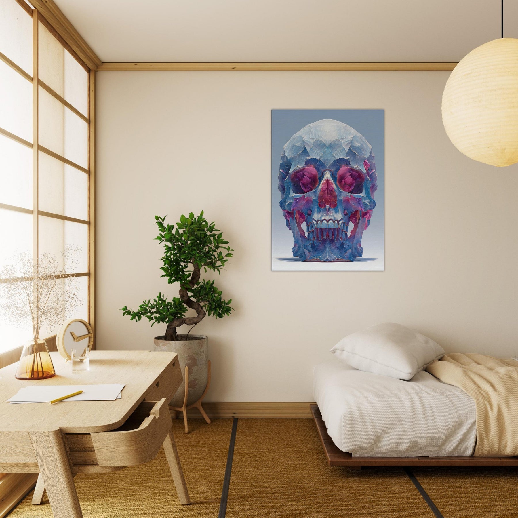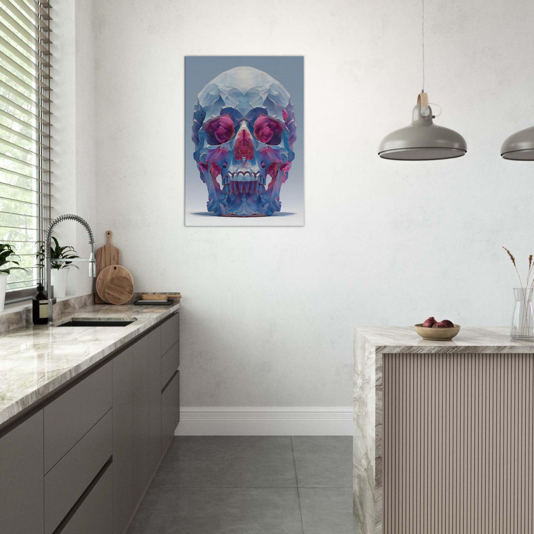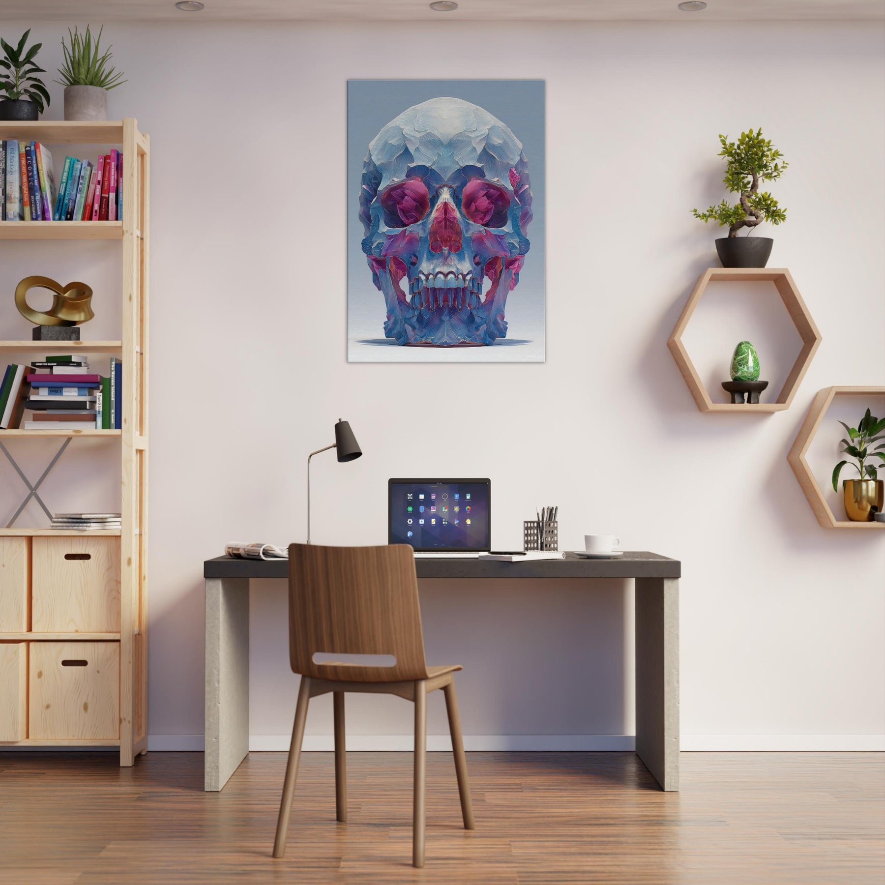 An ethereal sculpture rendered as a two tone whisper of color, this Mystical Skull glows with crystalline facets that catch the light and bend it into a hush of blues, pinks, and violets. The abstract composition folds space around the eyes and teeth, inviting quiet contemplation and a sense of otherworldly presence. In a living room or study, it becomes a focal quietude a pulsing focal point that transforms corners into a gallery of atmosphere and introspective magic.