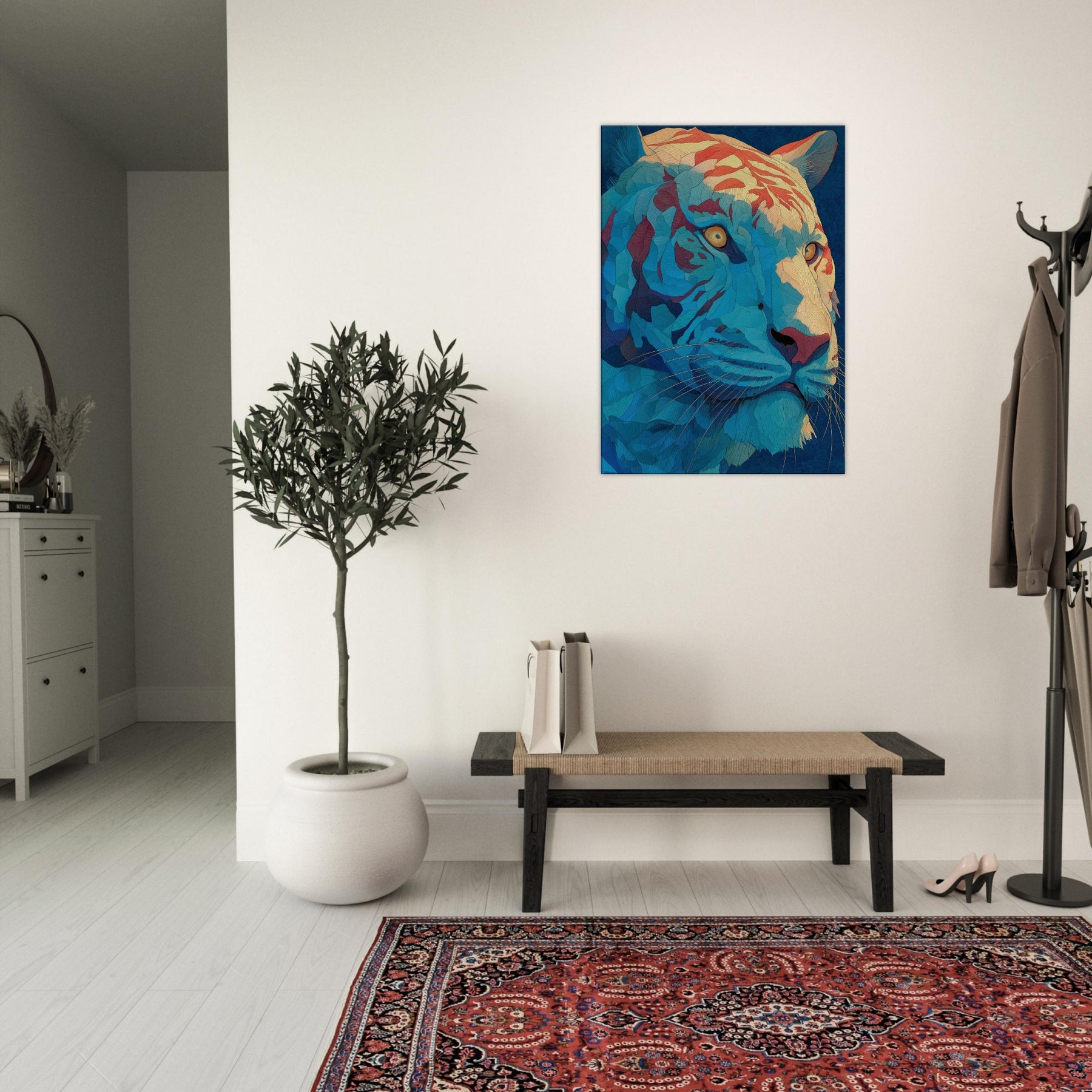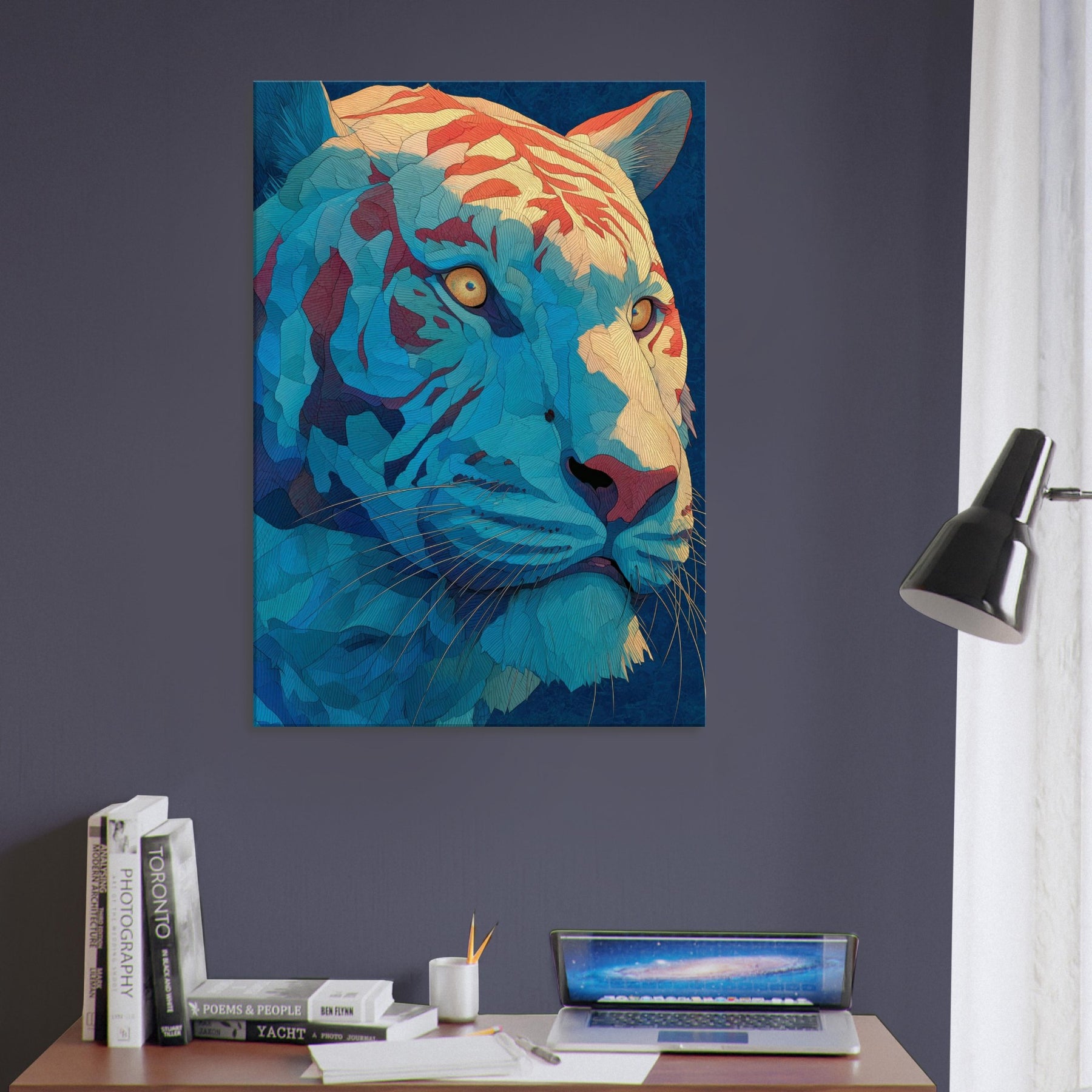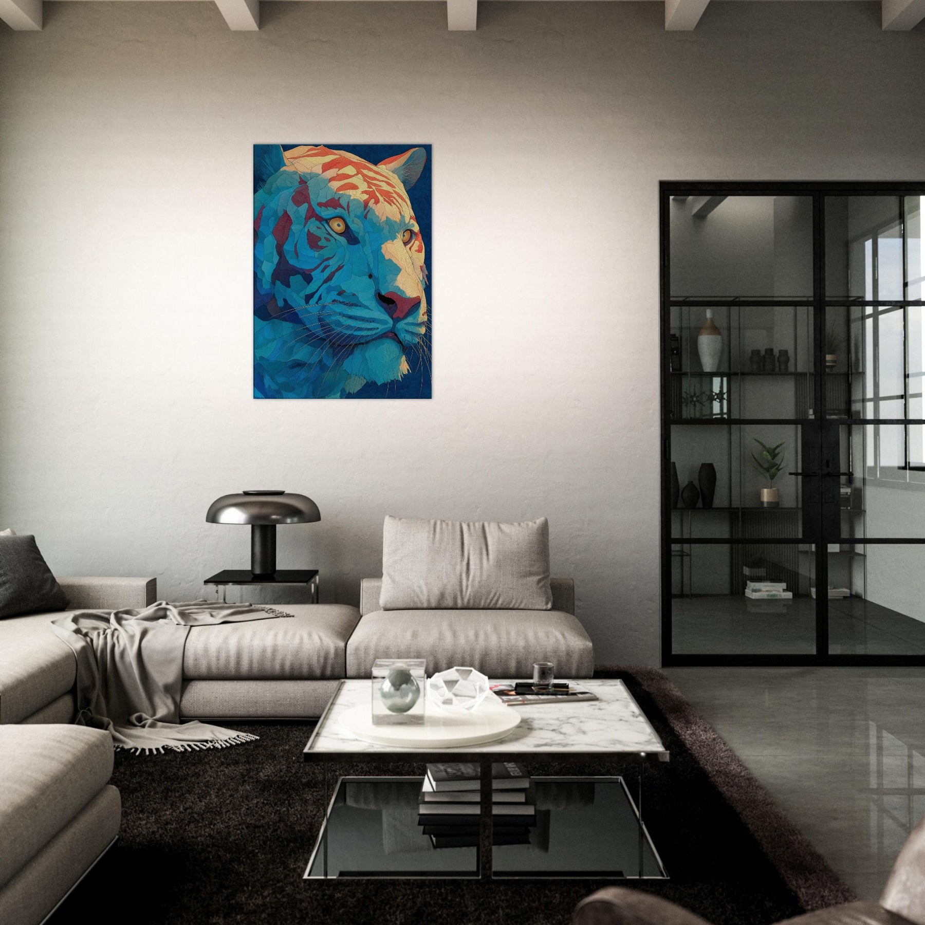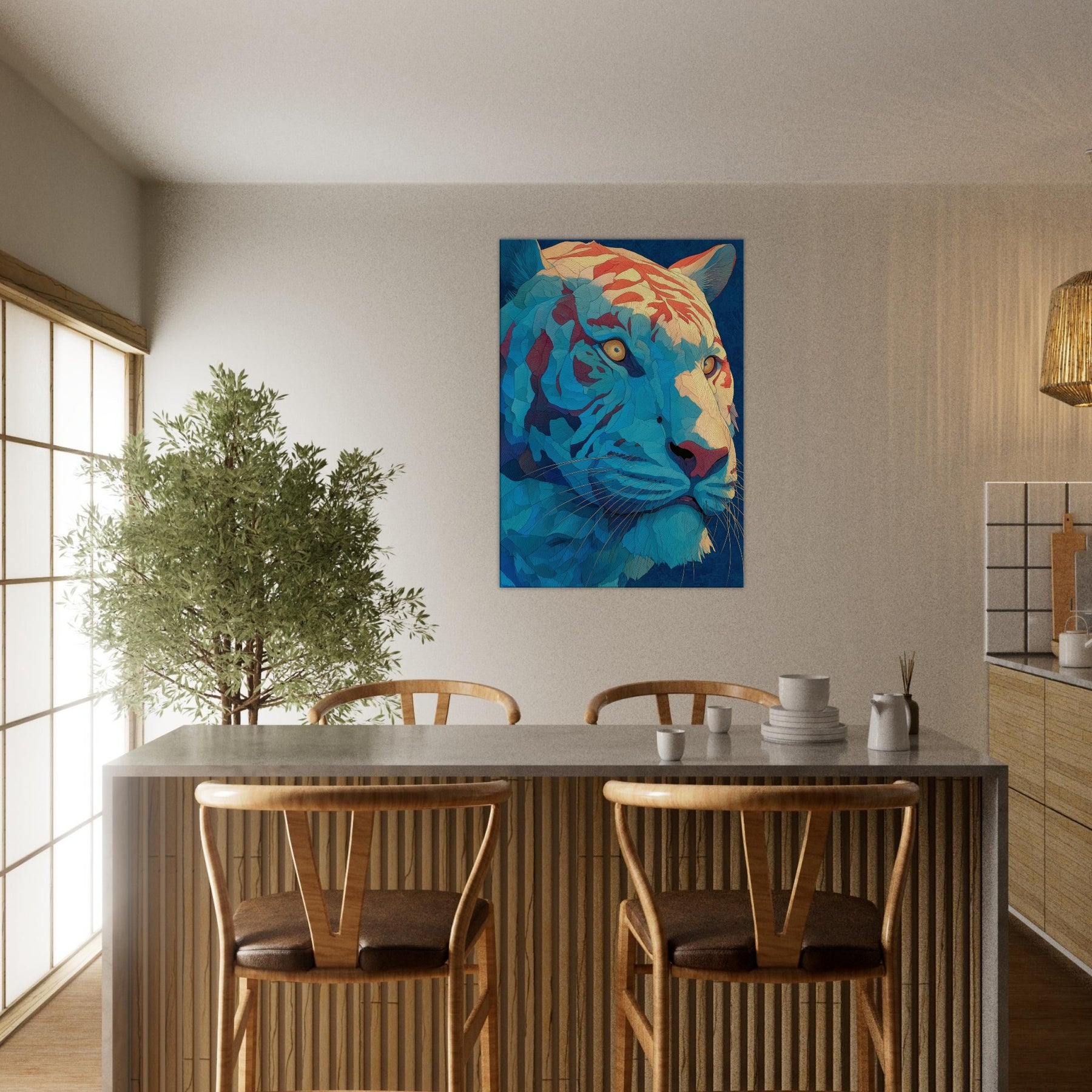 Let the White Tiger of the West guard your space with luminous, moonlit color and angular, dreamlike contours. This abstract portrayal channels mythic power into a living room presence the tiger's amber eyes awaken the quiet corners, while a kaleidoscope of blues and tangerine accents folds light across the wall. The air seems to shimmer as if a celestial guardian has paused to watch over dusk filled evenings, inviting contemplation, conversation, and a moment of serene awe.