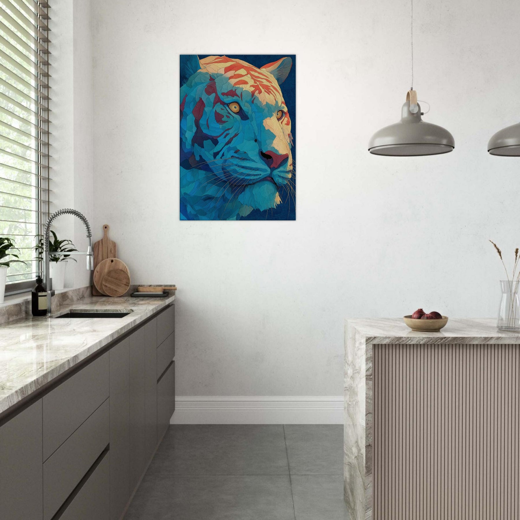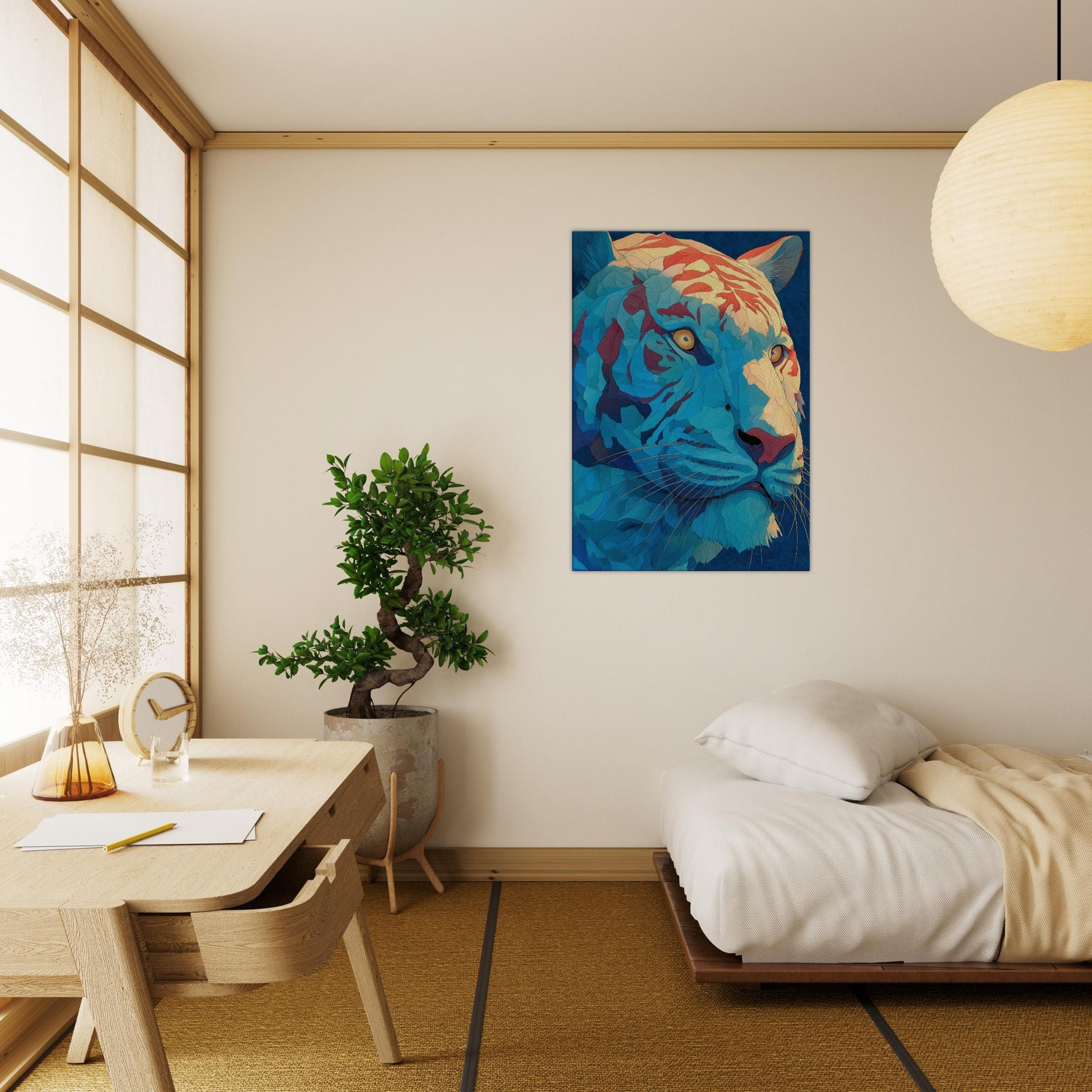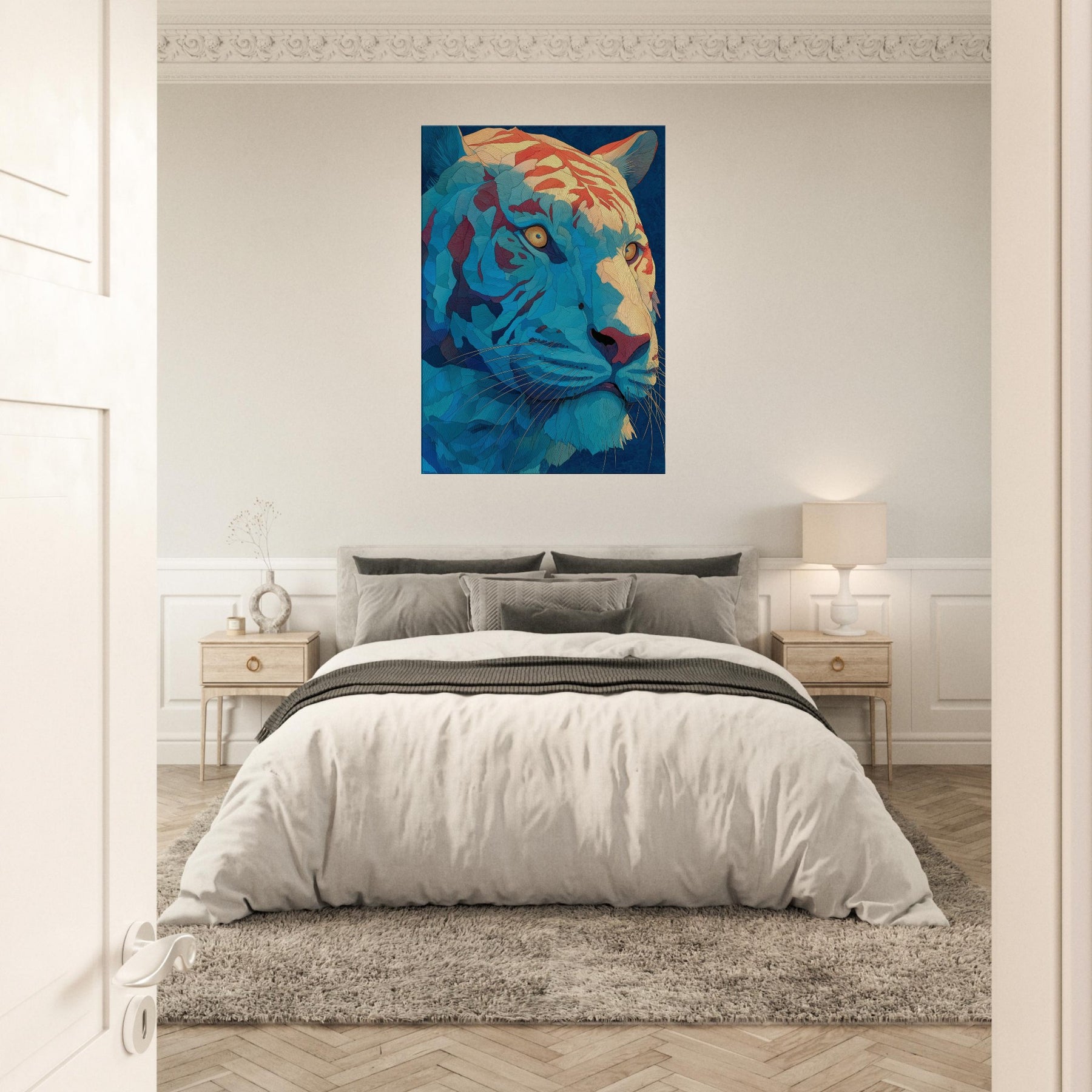 Let the White Tiger of the West guard your space with luminous, moonlit color and angular, dreamlike contours. This abstract portrayal channels mythic power into a living room presence the tiger's amber eyes awaken the quiet corners, while a kaleidoscope of blues and tangerine accents folds light across the wall. The air seems to shimmer as if a celestial guardian has paused to watch over dusk filled evenings, inviting contemplation, conversation, and a moment of serene awe.