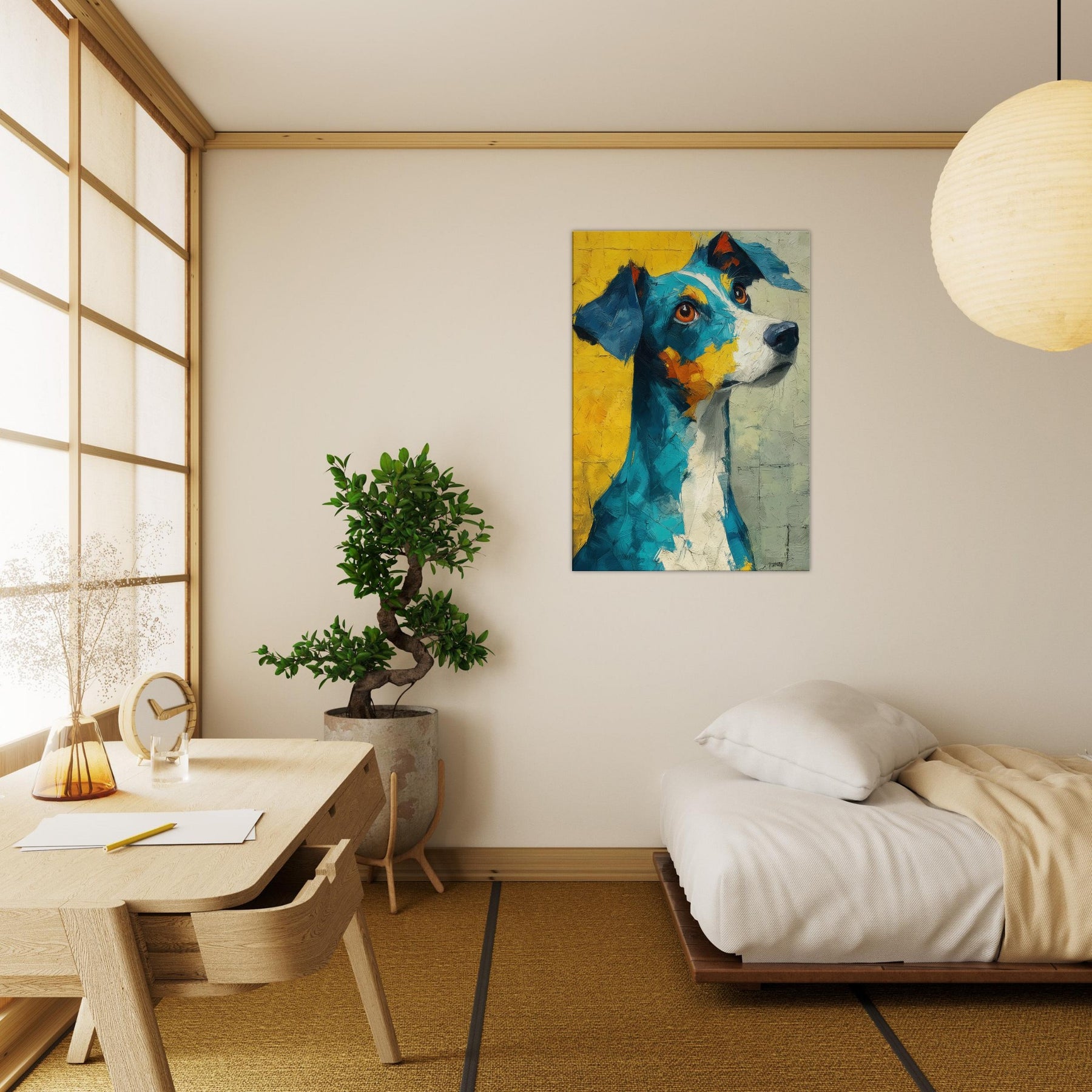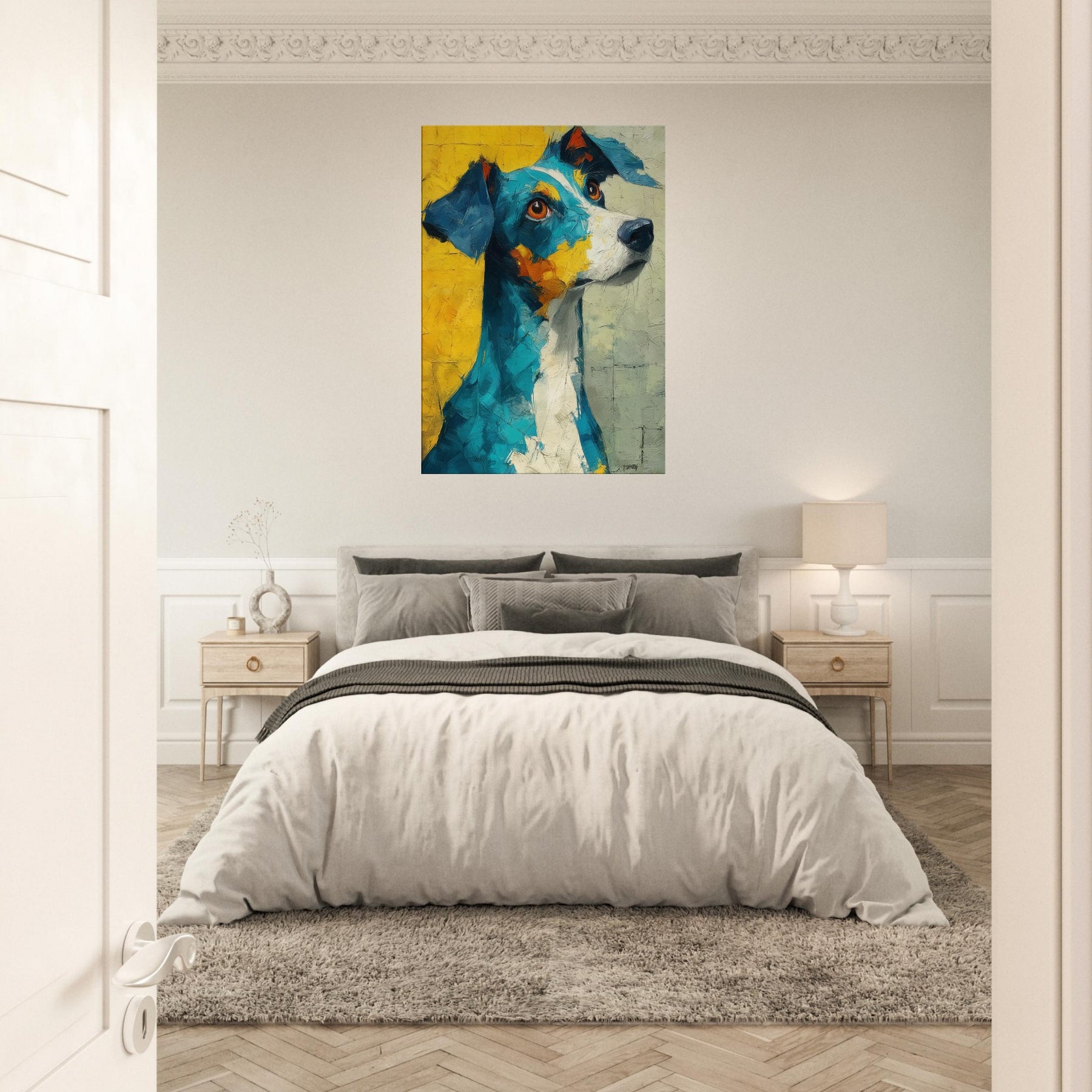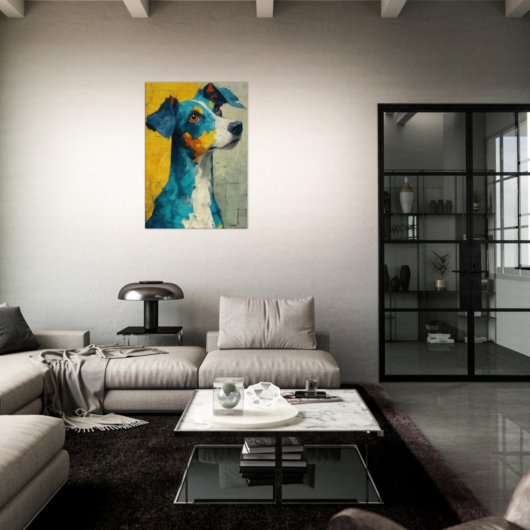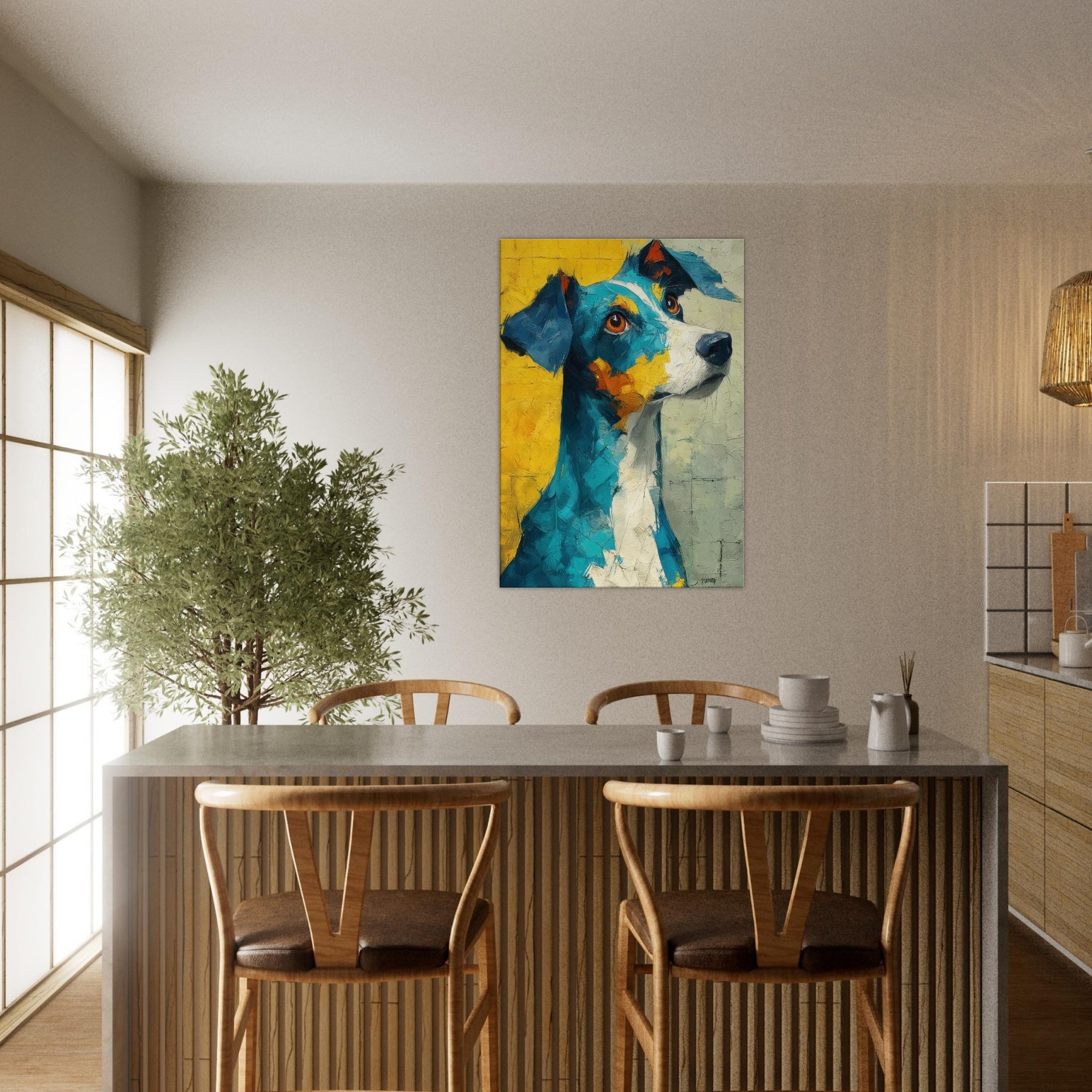 This painting centers a Dog in bold, fractured strokes of teal, blue, and ochre, inviting a slow, attentive gaze. Set against a sunlit yellow field and a pale gray backdrop, it blends energy with calm, turning a living space into a gallery of mood. The textured impasto catches light and creates depth, while the Dog’s expressive eyes suggest loyalty, curiosity, and a quiet alertness. In its distorted, joyful geometry, the scene feels cinematic an abstract celebration of companionship that elevates everyday rooms with color and warmth.