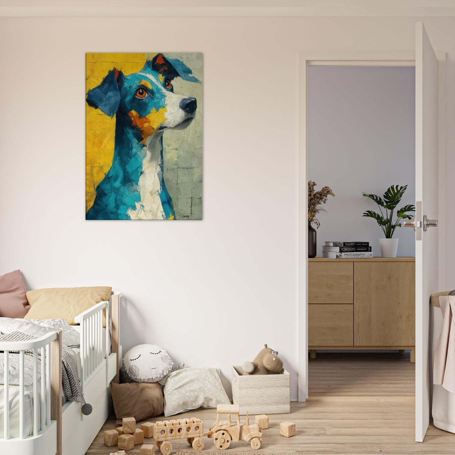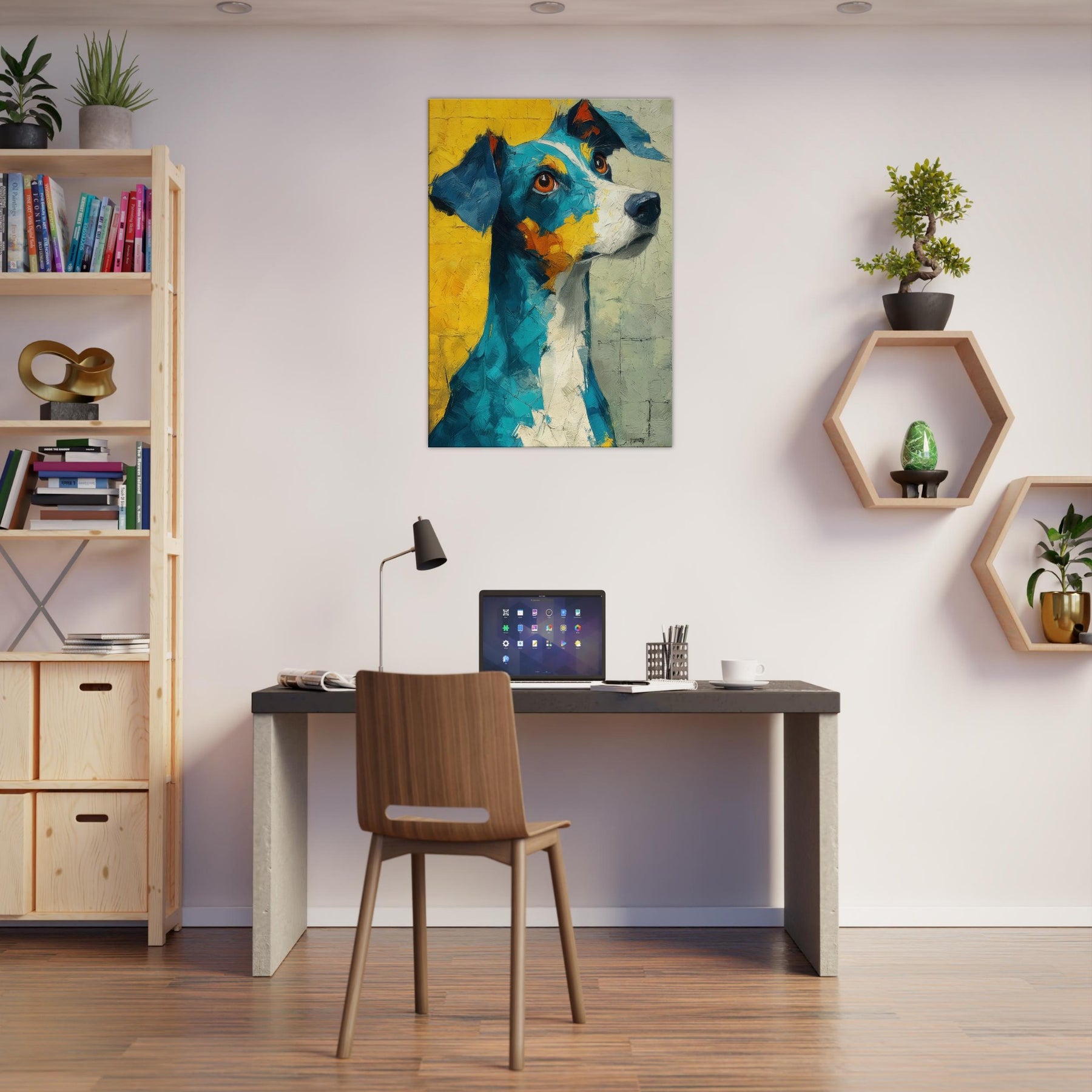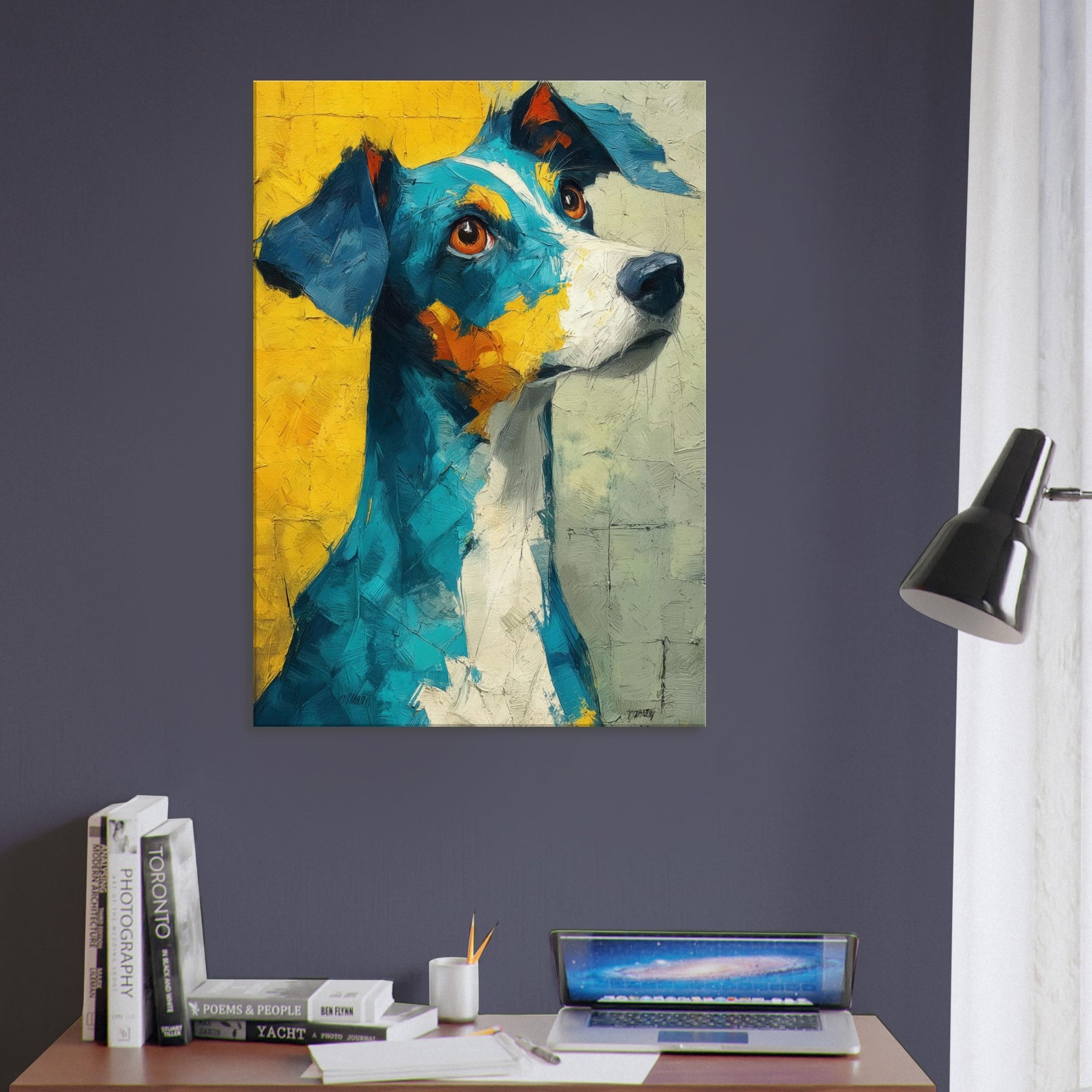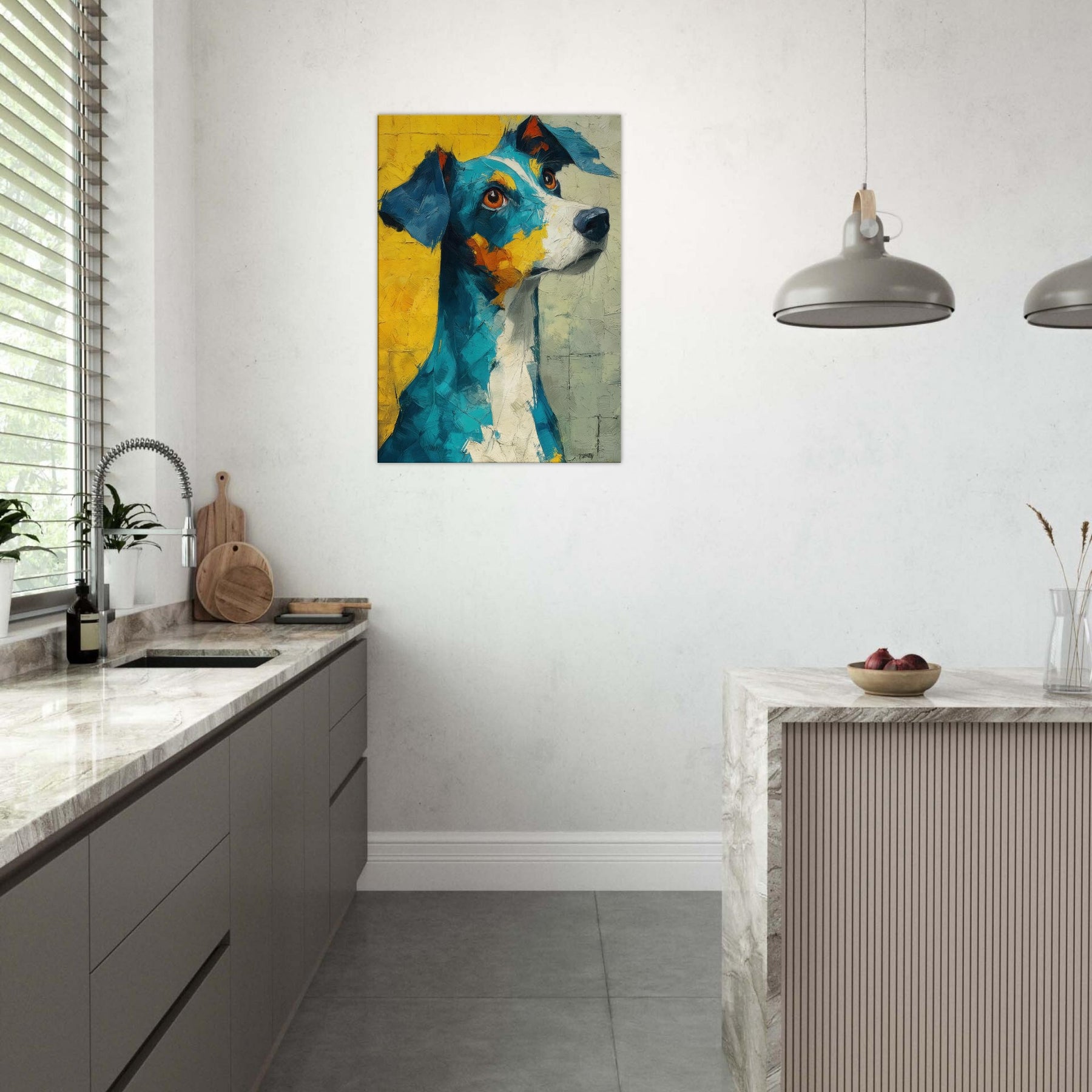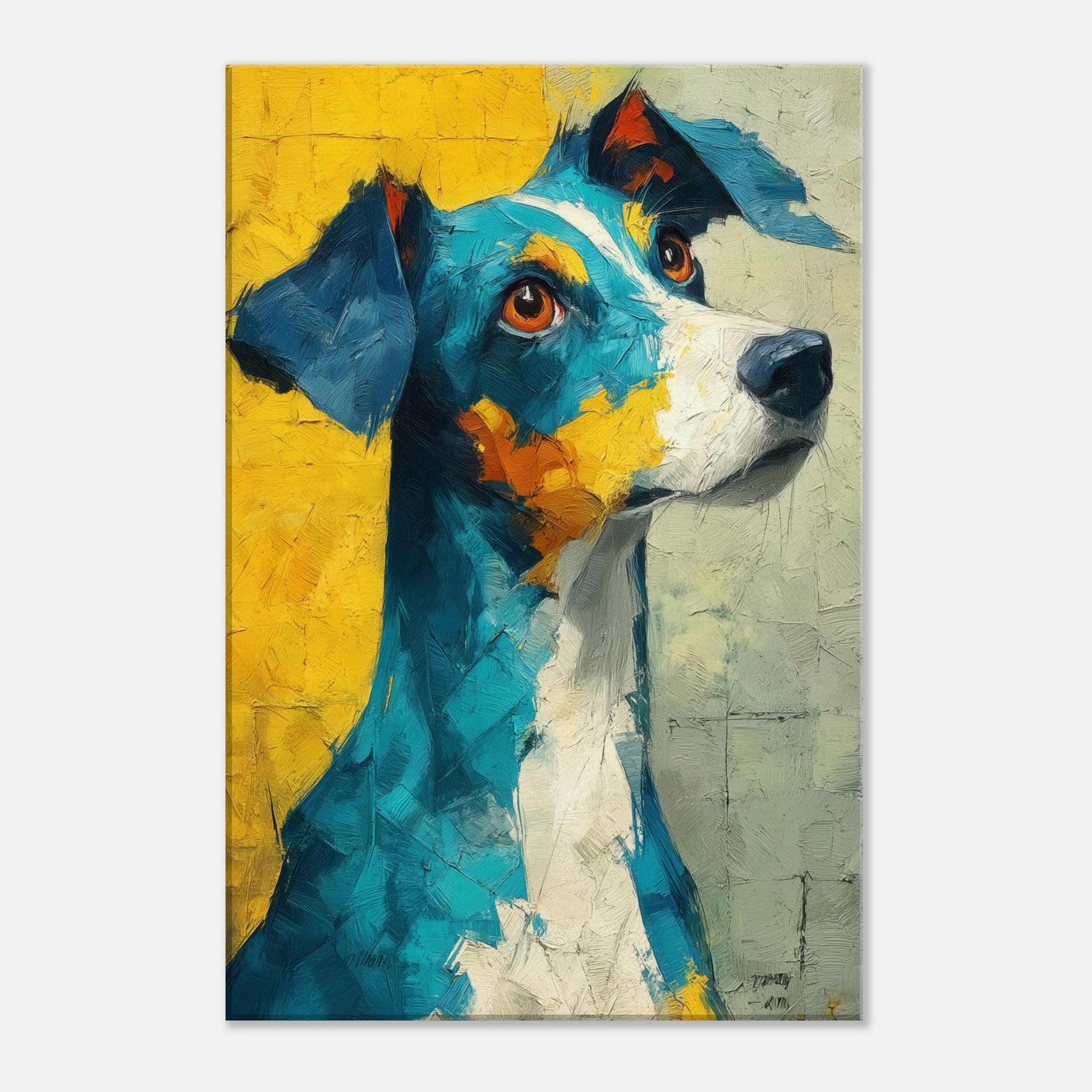 This painting centers a Dog in bold, fractured strokes of teal, blue, and ochre, inviting a slow, attentive gaze. Set against a sunlit yellow field and a pale gray backdrop, it blends energy with calm, turning a living space into a gallery of mood. The textured impasto catches light and creates depth, while the Dog’s expressive eyes suggest loyalty, curiosity, and a quiet alertness. In its distorted, joyful geometry, the scene feels cinematic an abstract celebration of companionship that elevates everyday rooms with color and warmth.