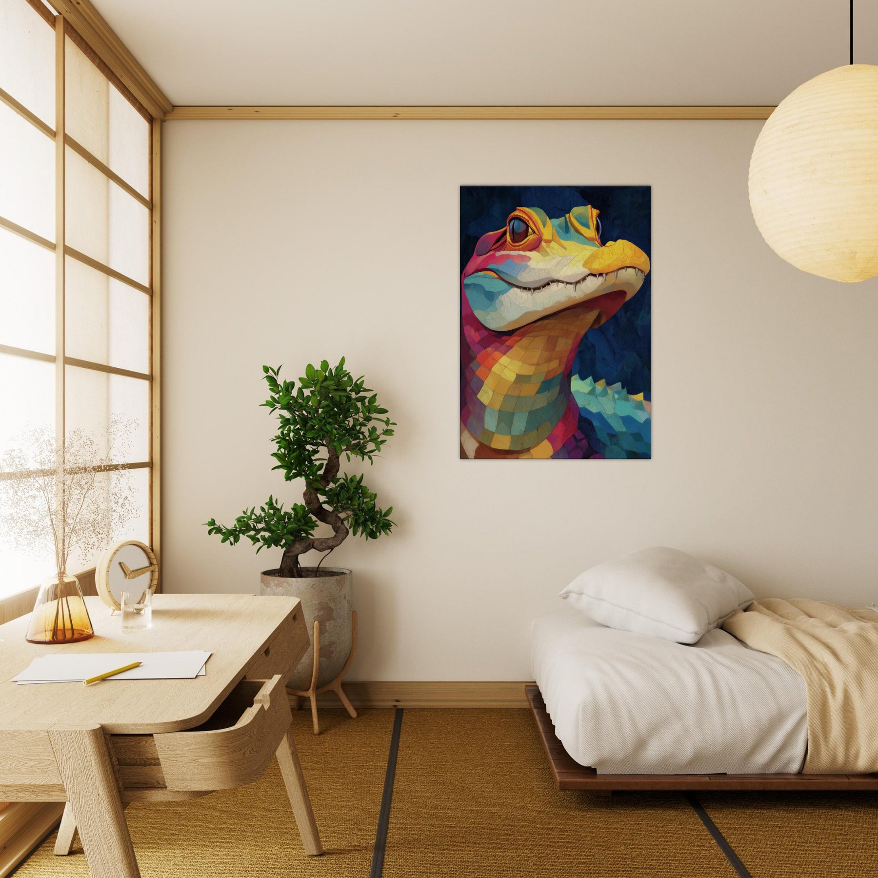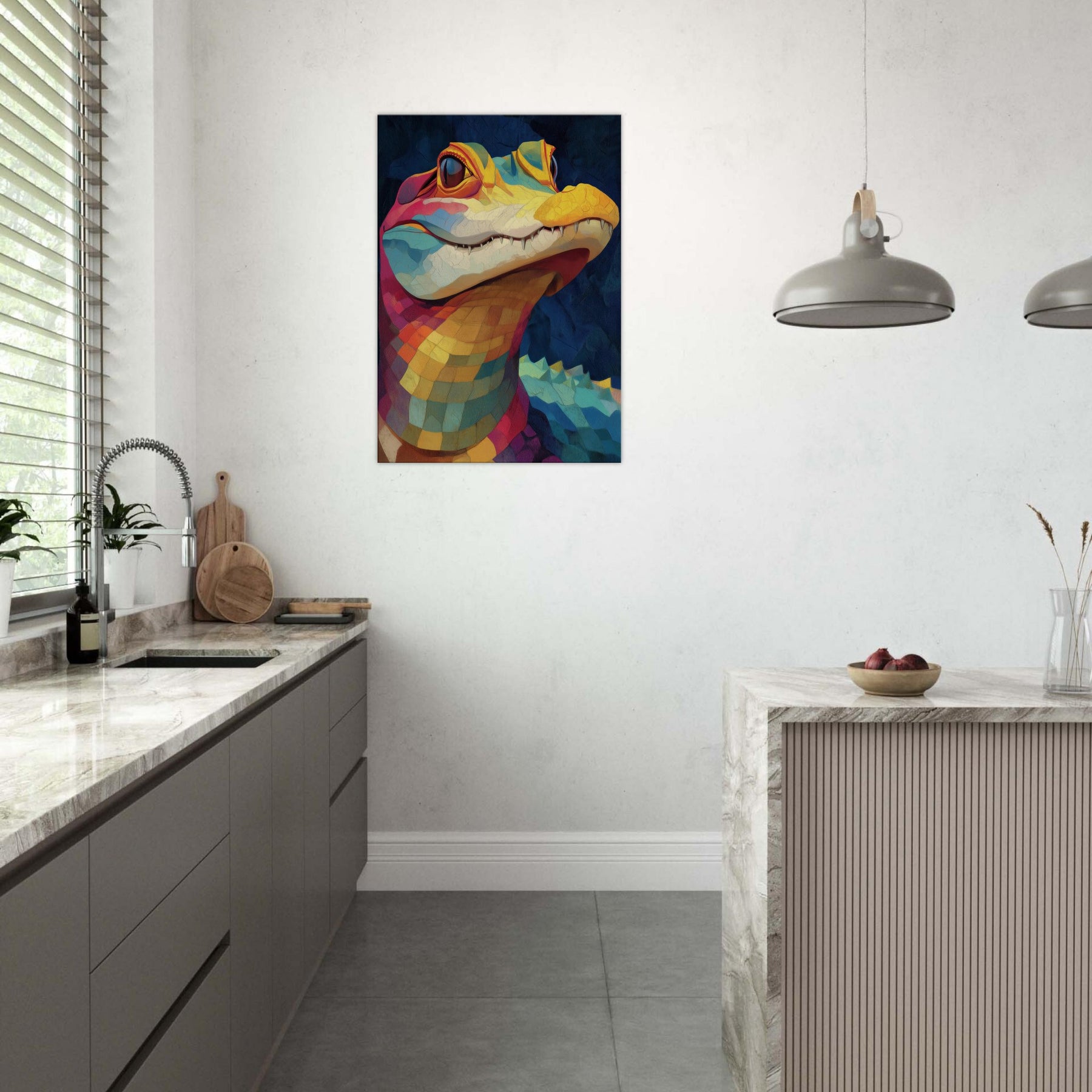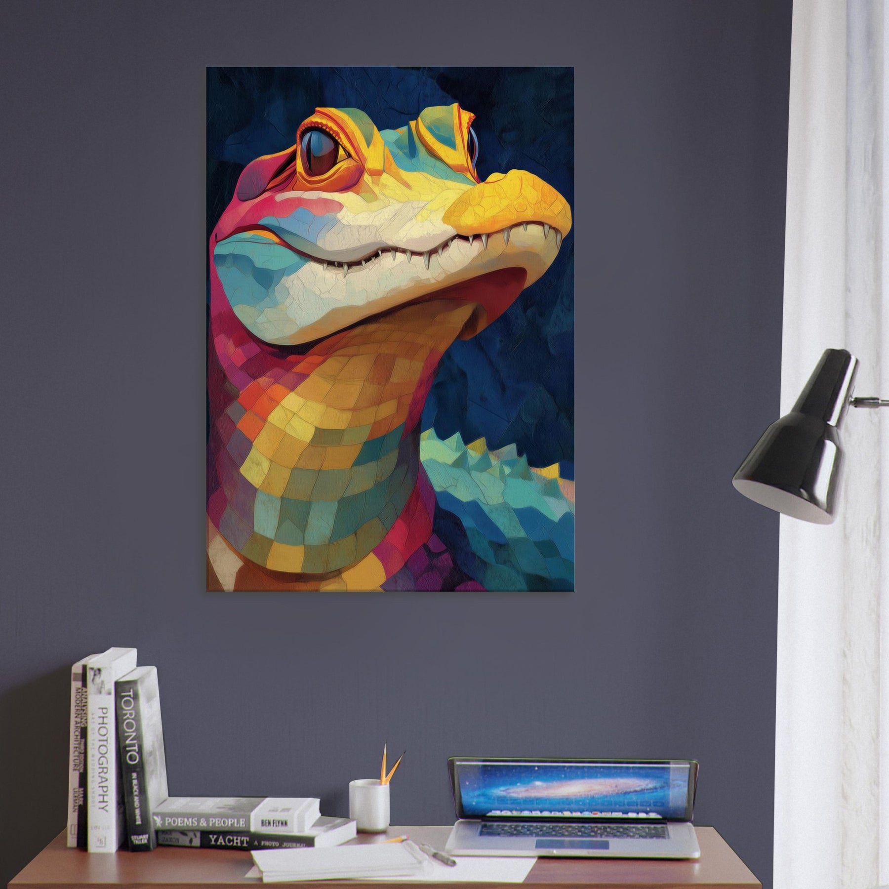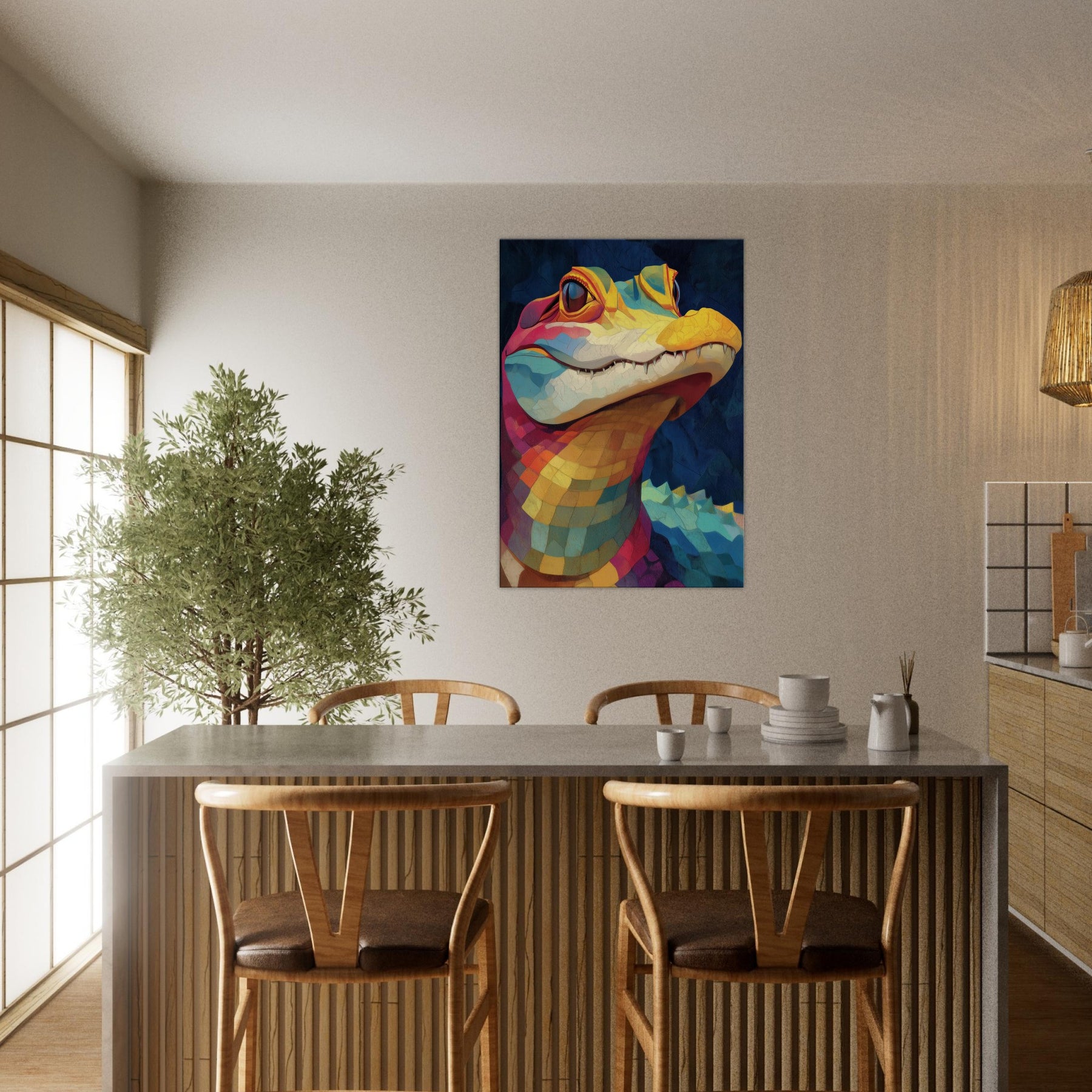 An alligator emerges from a mosaic of color, its scales catching light and refracting it into a quiet symphony of reds, yellows, and teals. This piece invites a room to breathe differently sun warmed and charged with curiosity. The Alligator's confident gaze anchors a space, while the layered hues ripple like liquid sunset across the wall, creating depth and motion. Imagine its presence imbuing a living room or study with earthy vitality, playful elegance, and a touch of wild, deliberate grace.