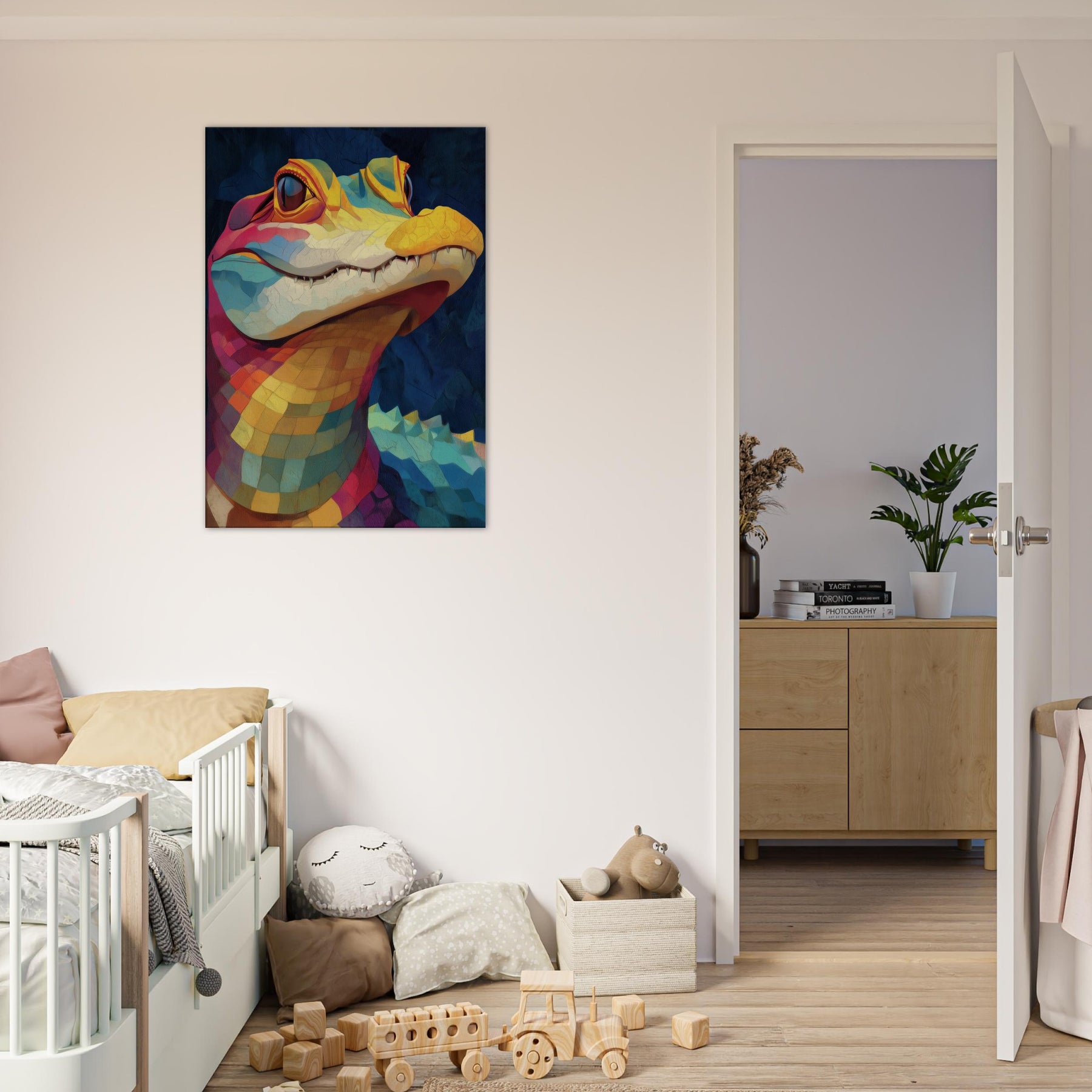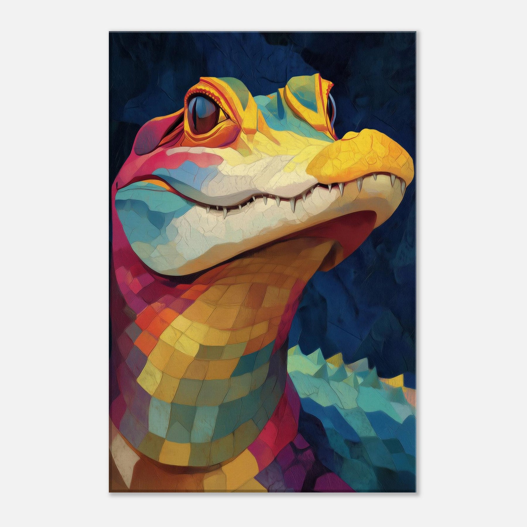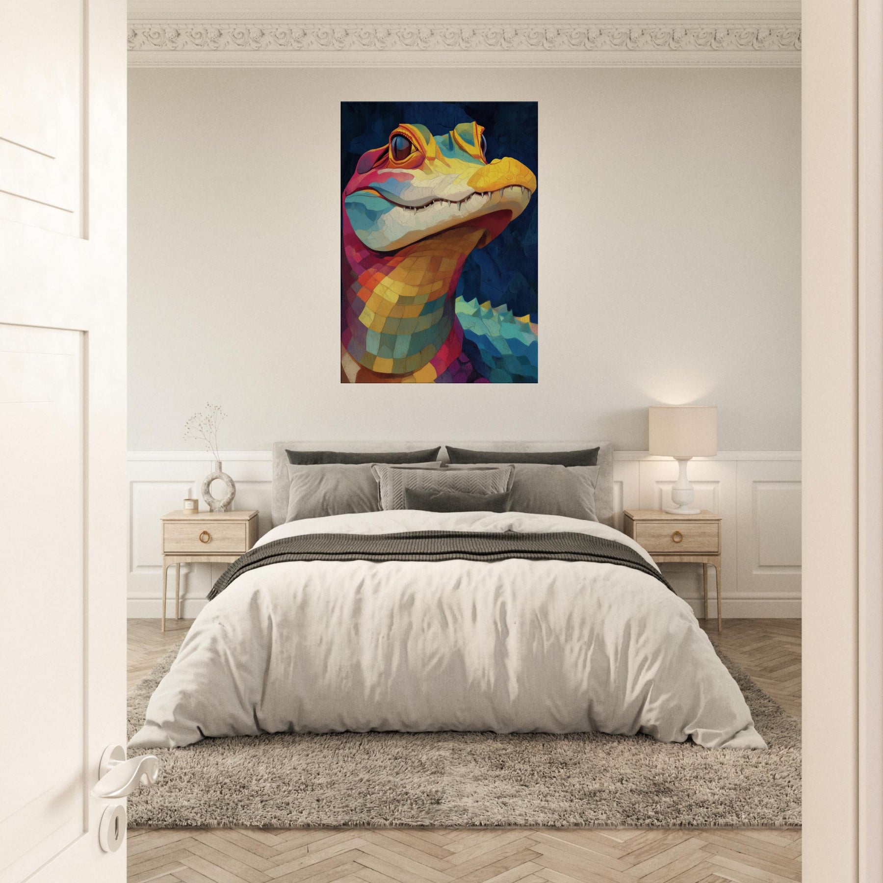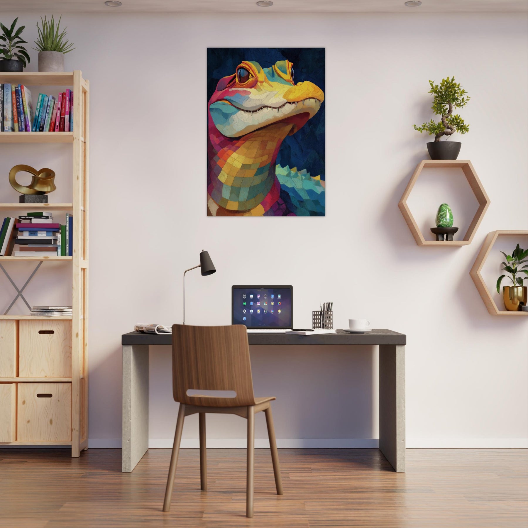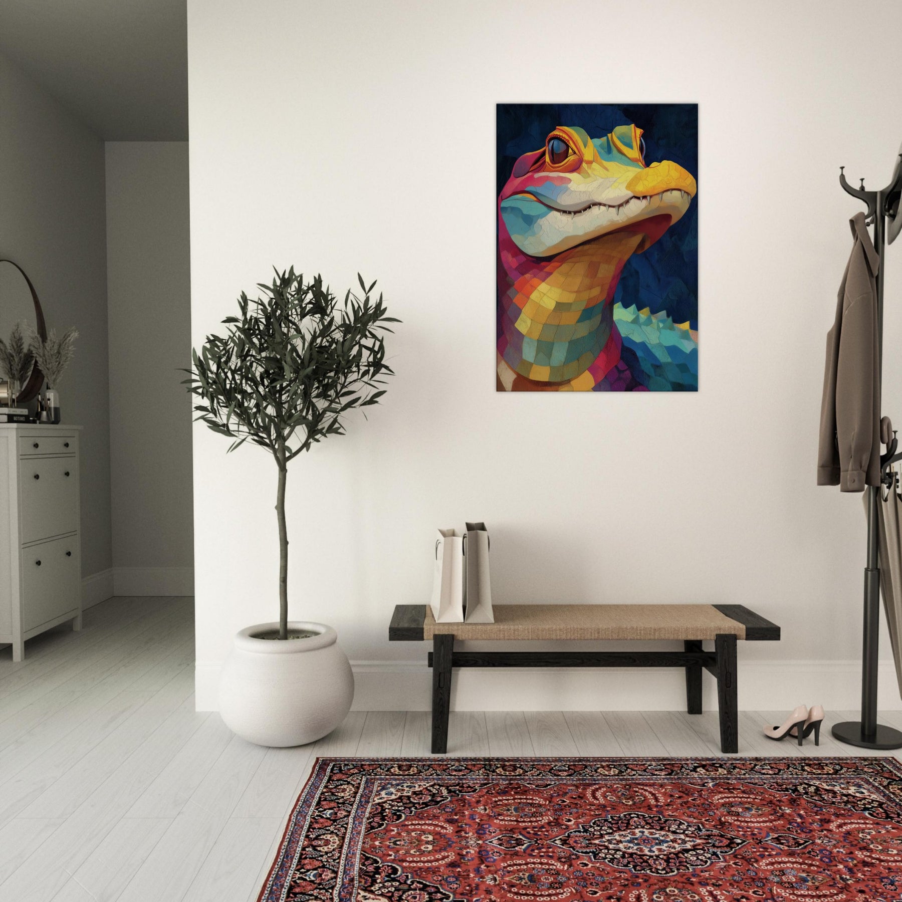 An alligator emerges from a mosaic of color, its scales catching light and refracting it into a quiet symphony of reds, yellows, and teals. This piece invites a room to breathe differently sun warmed and charged with curiosity. The Alligator's confident gaze anchors a space, while the layered hues ripple like liquid sunset across the wall, creating depth and motion. Imagine its presence imbuing a living room or study with earthy vitality, playful elegance, and a touch of wild, deliberate grace.