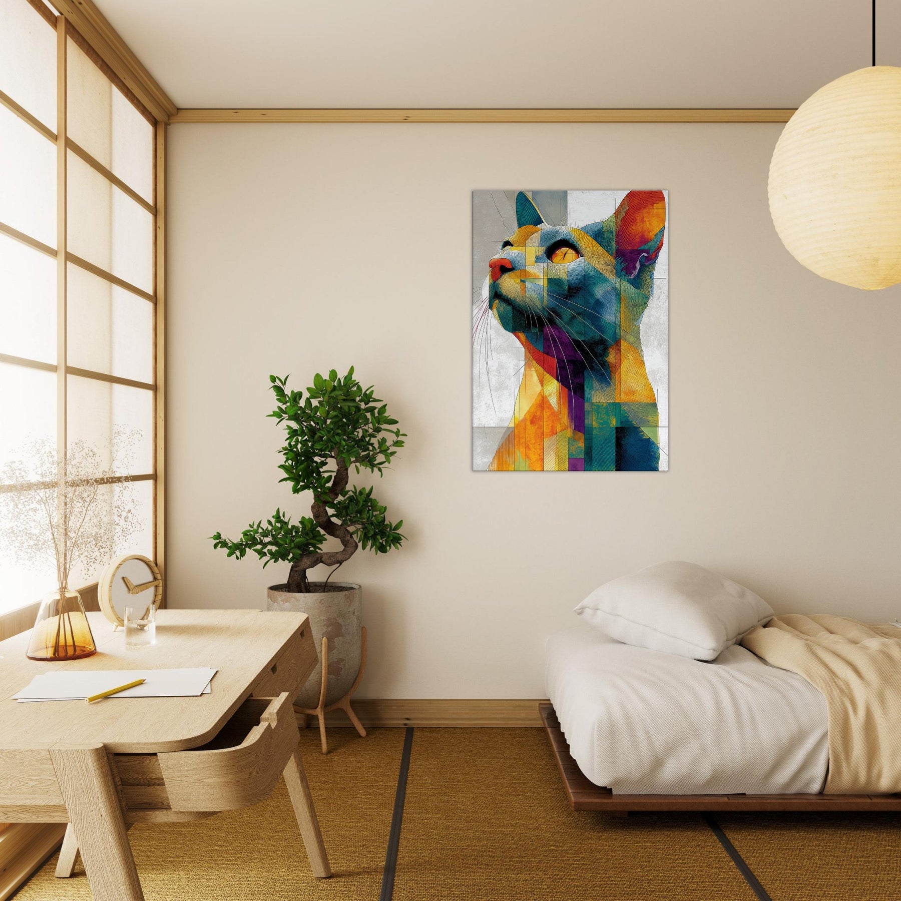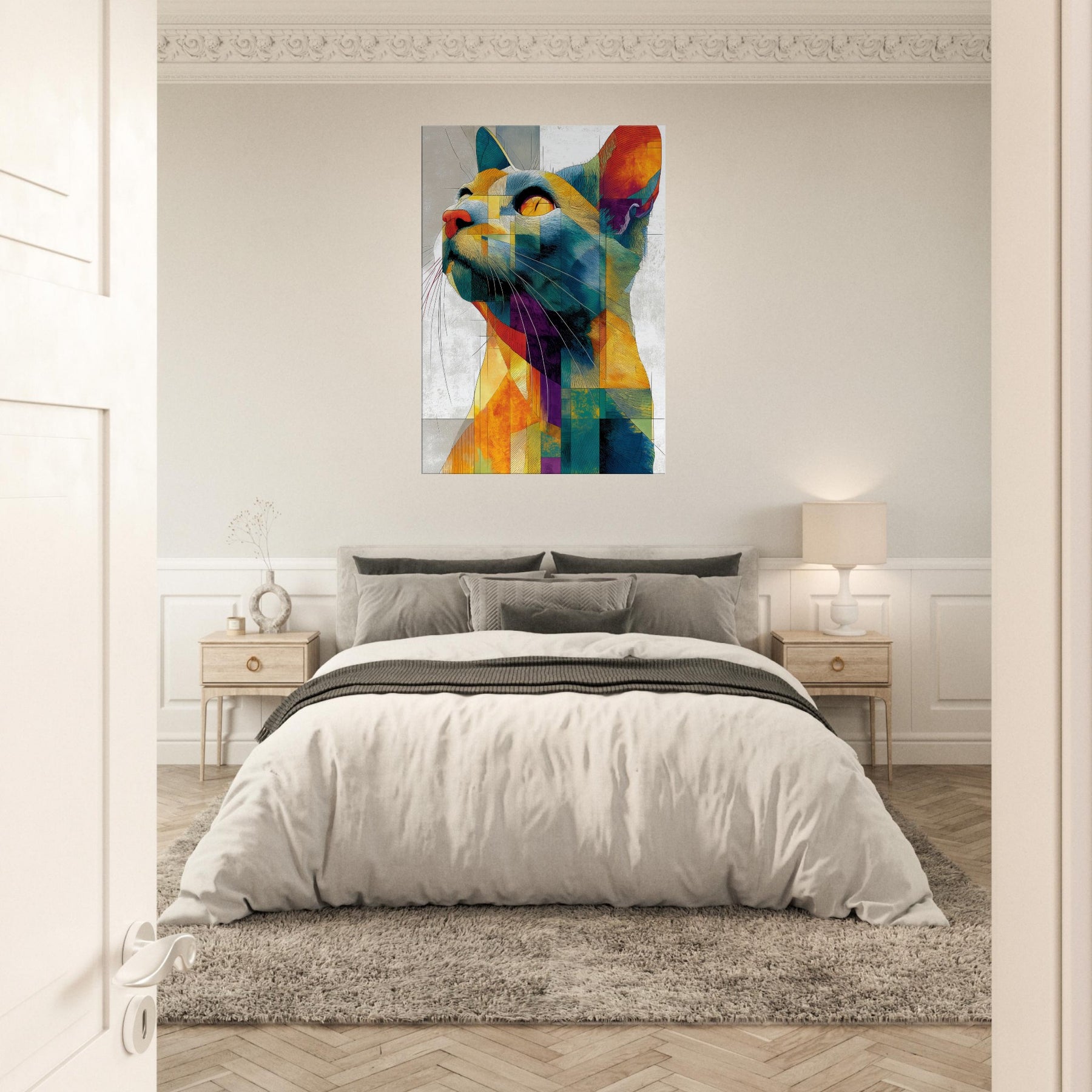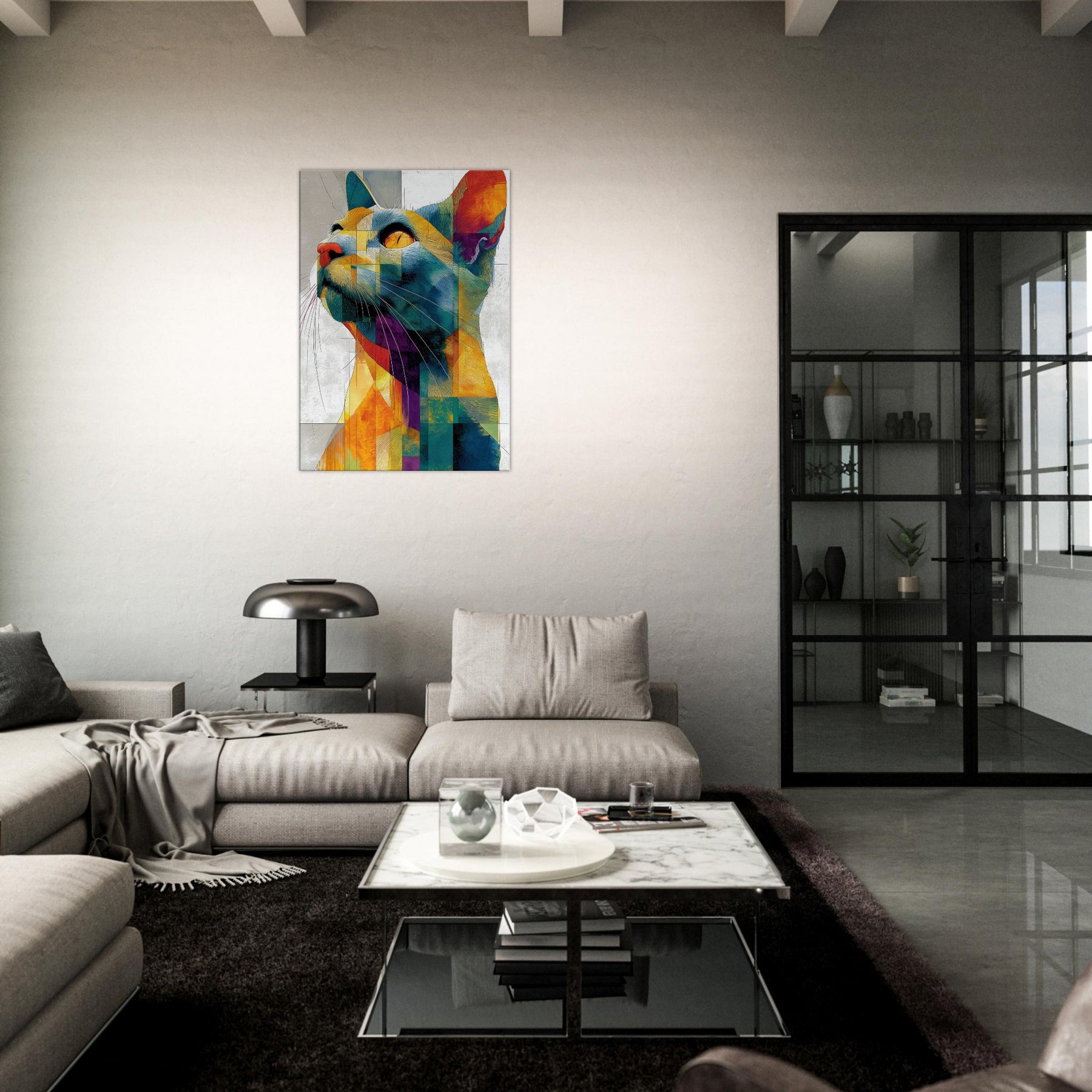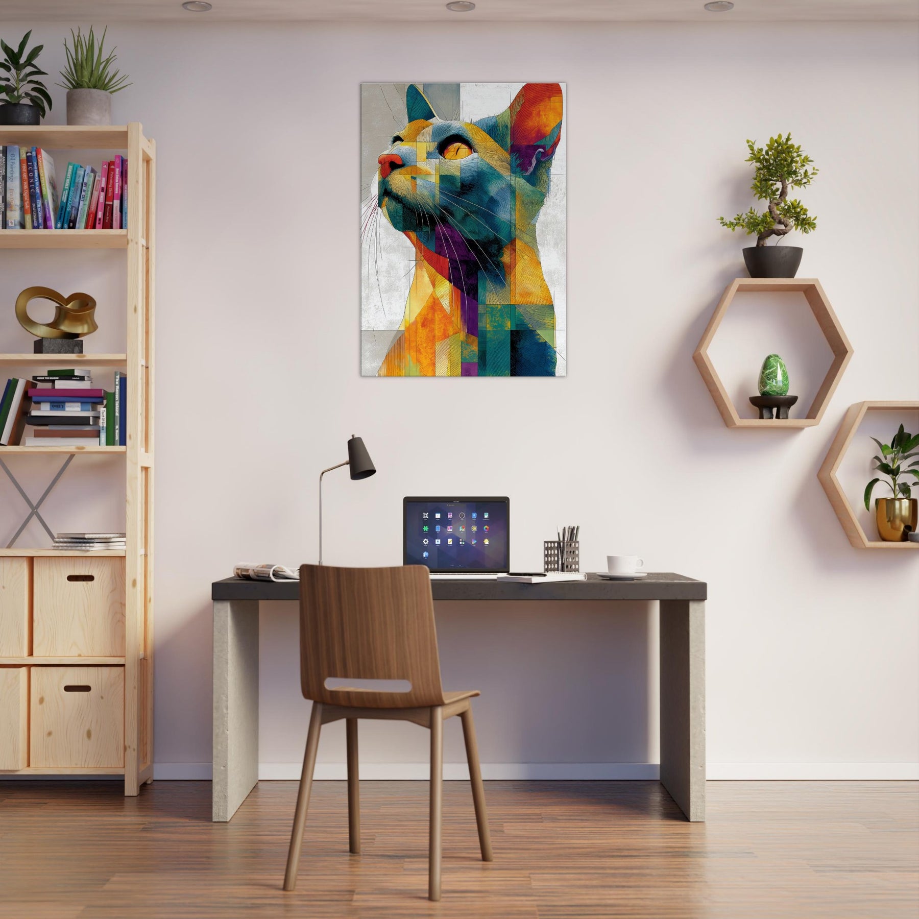 An intoxicating study in color and form, this cat dissolves into a mosaic of light and shadow. Abstract panels swirl and align to reveal a feline presence, guiding the eye to linger and drift. The cat, our Primary Subject, glows with warm ambers, electric blues, and coral accents that shimmer across the wall like a quiet cheer. In a living space, it tempers minimalist furniture with painterly energy, lending a gallery worthy mood that feels intimate, timeless, and unexpectedly transformative.