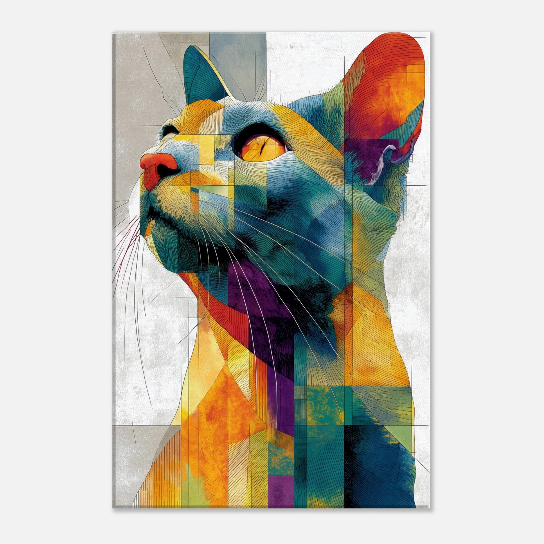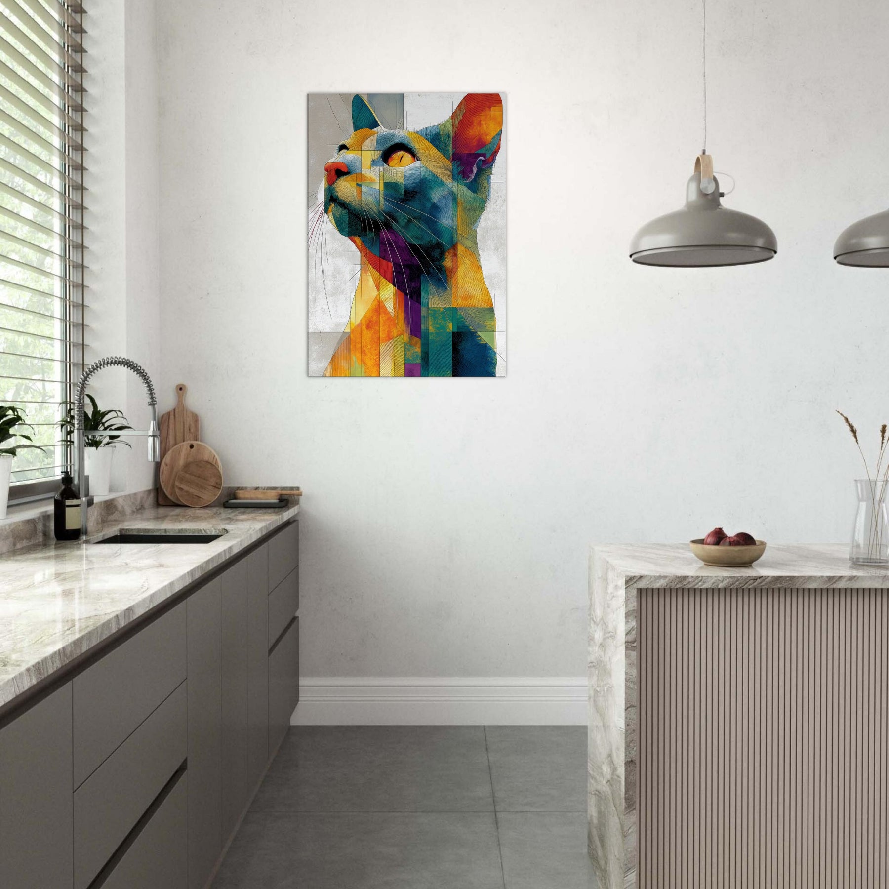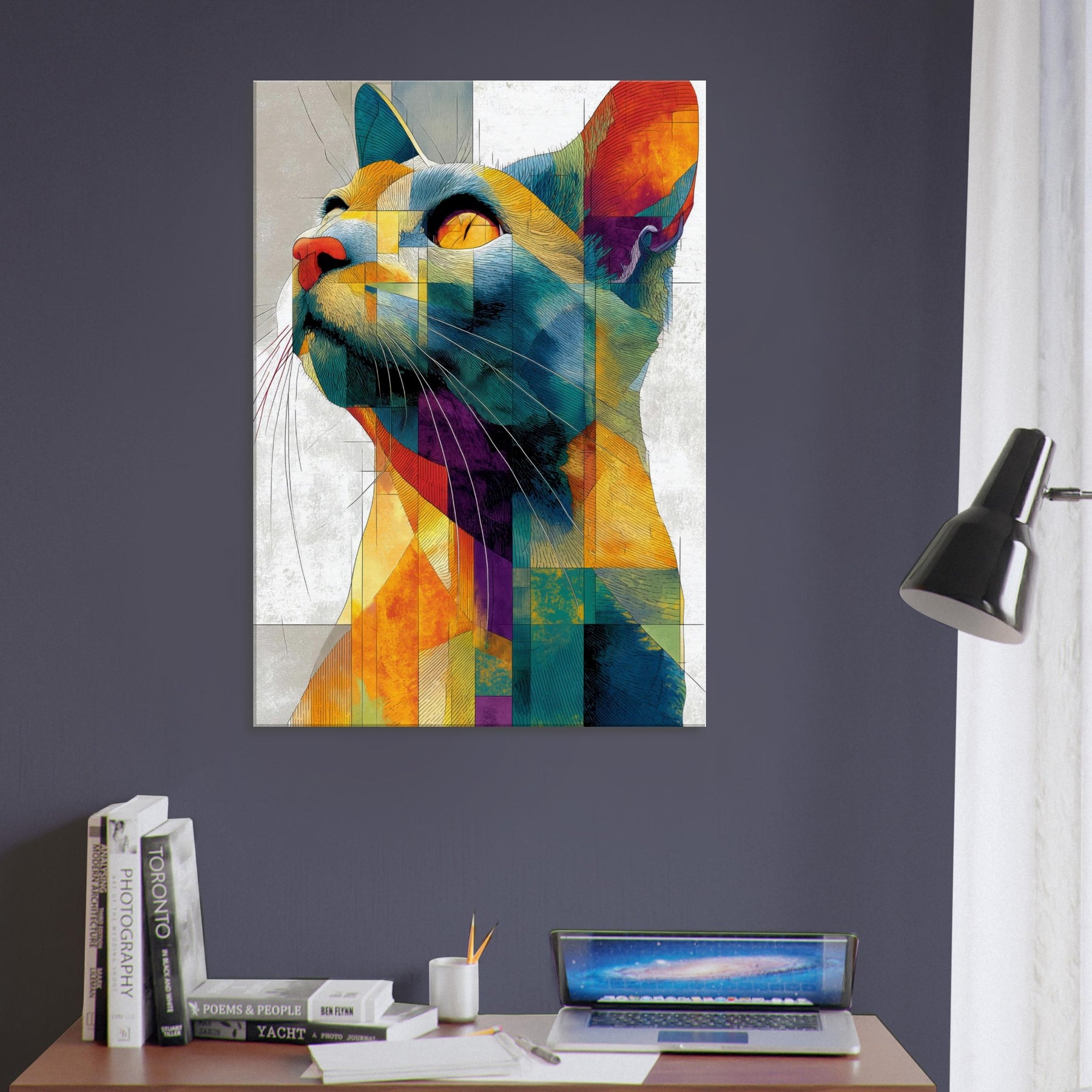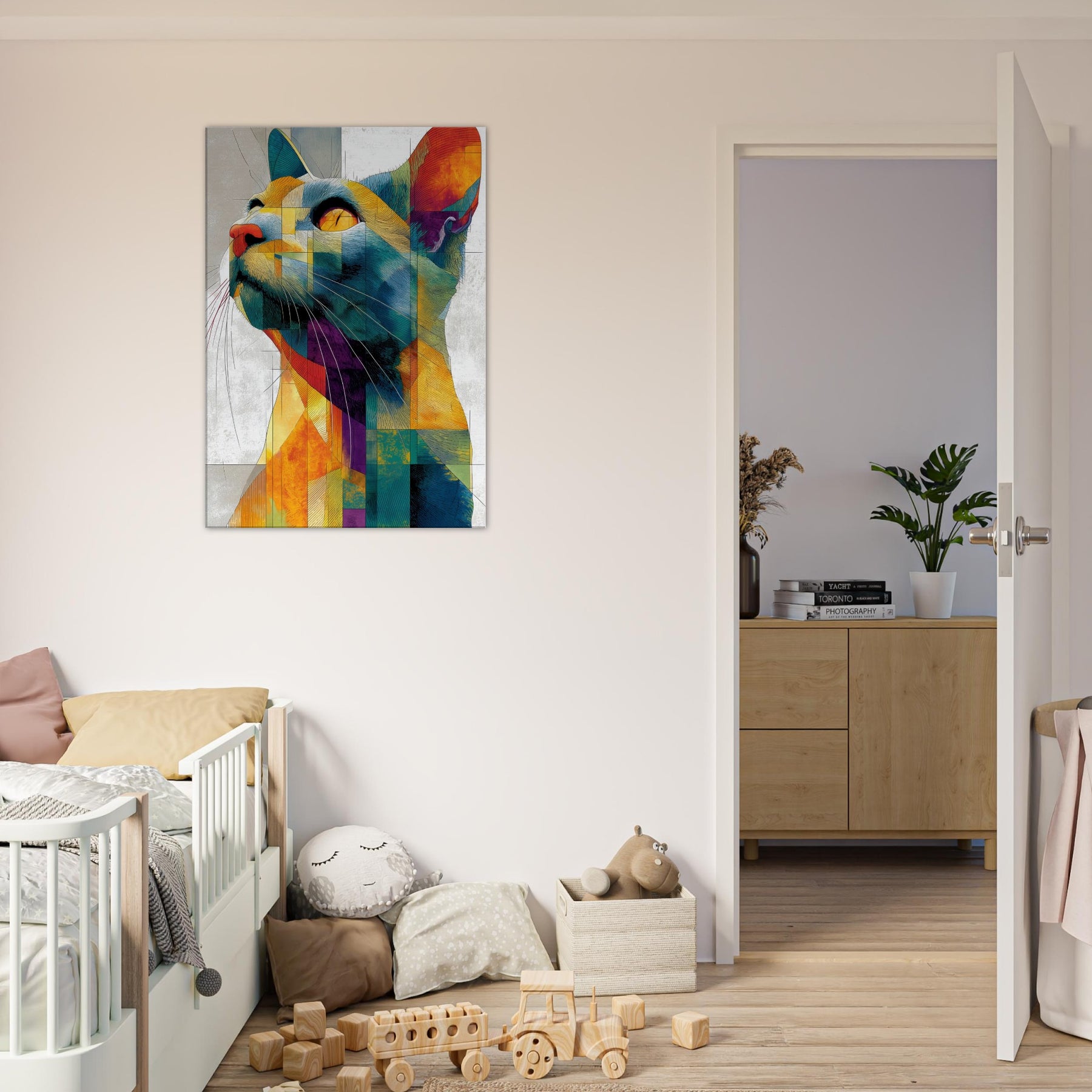An intoxicating study in color and form, this cat dissolves into a mosaic of light and shadow. Abstract panels swirl and align to reveal a feline presence, guiding the eye to linger and drift. The cat, our Primary Subject, glows with warm ambers, electric blues, and coral accents that shimmer across the wall like a quiet cheer. In a living space, it tempers minimalist furniture with painterly energy, lending a gallery worthy mood that feels intimate, timeless, and unexpectedly transformative.