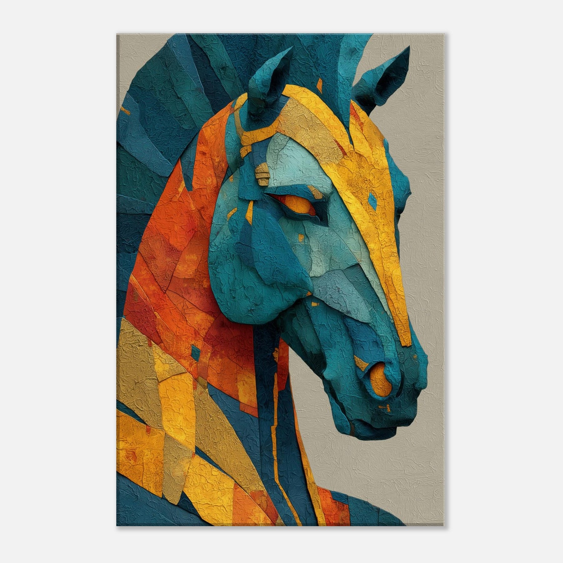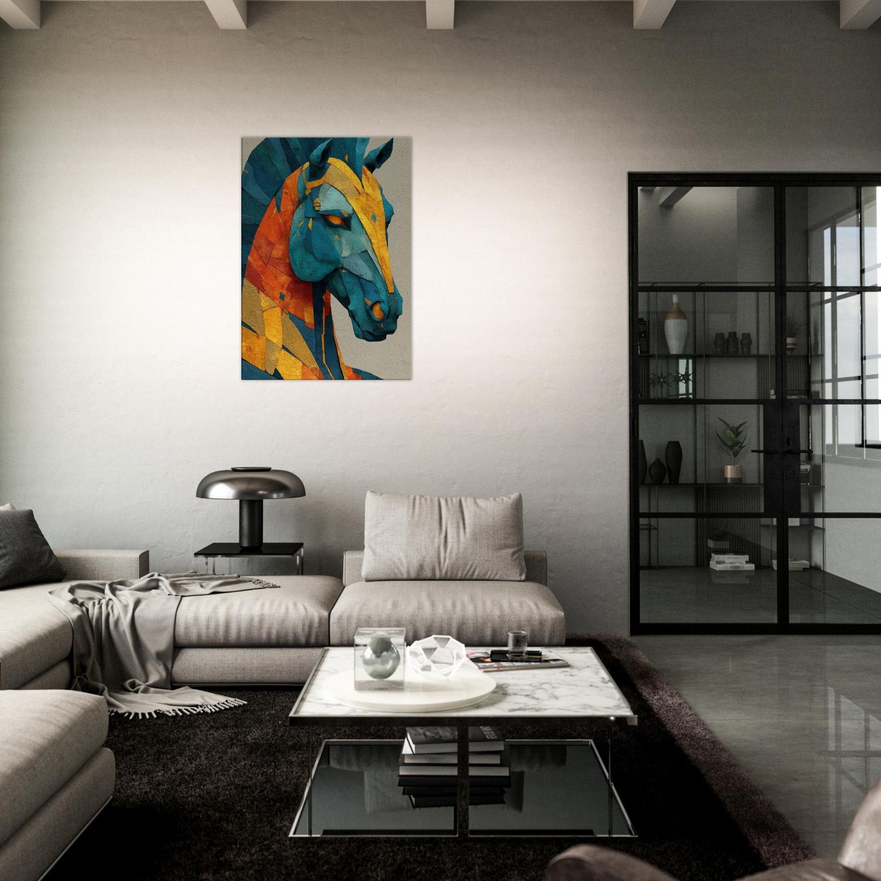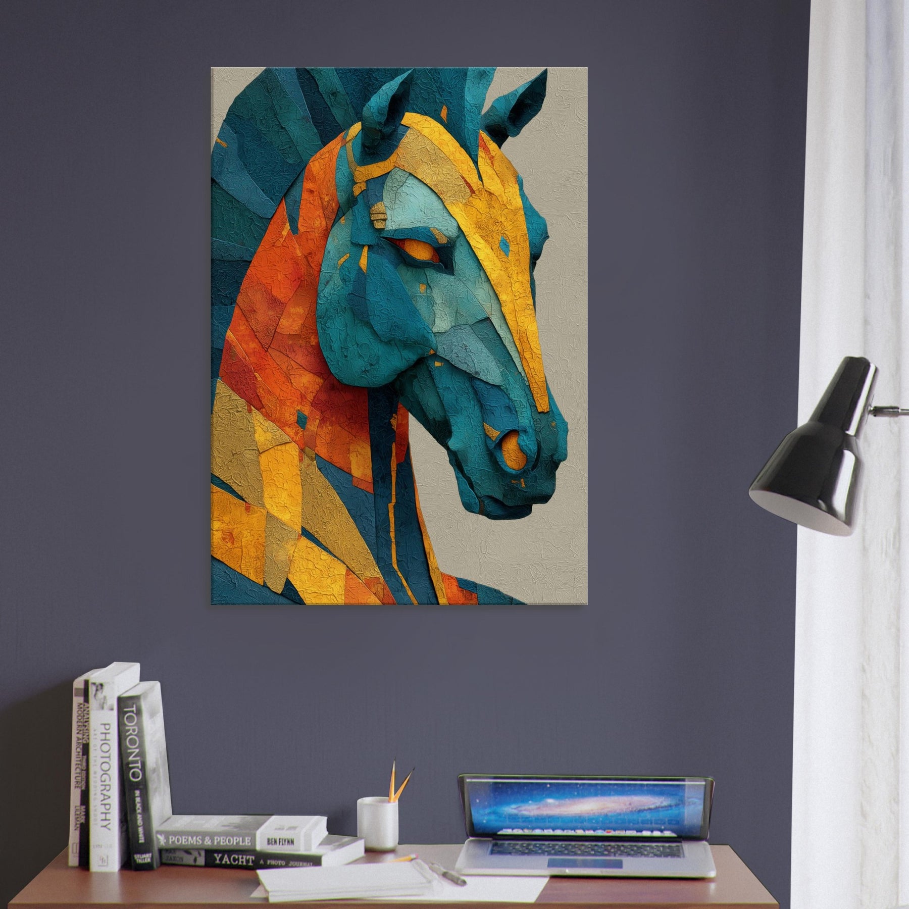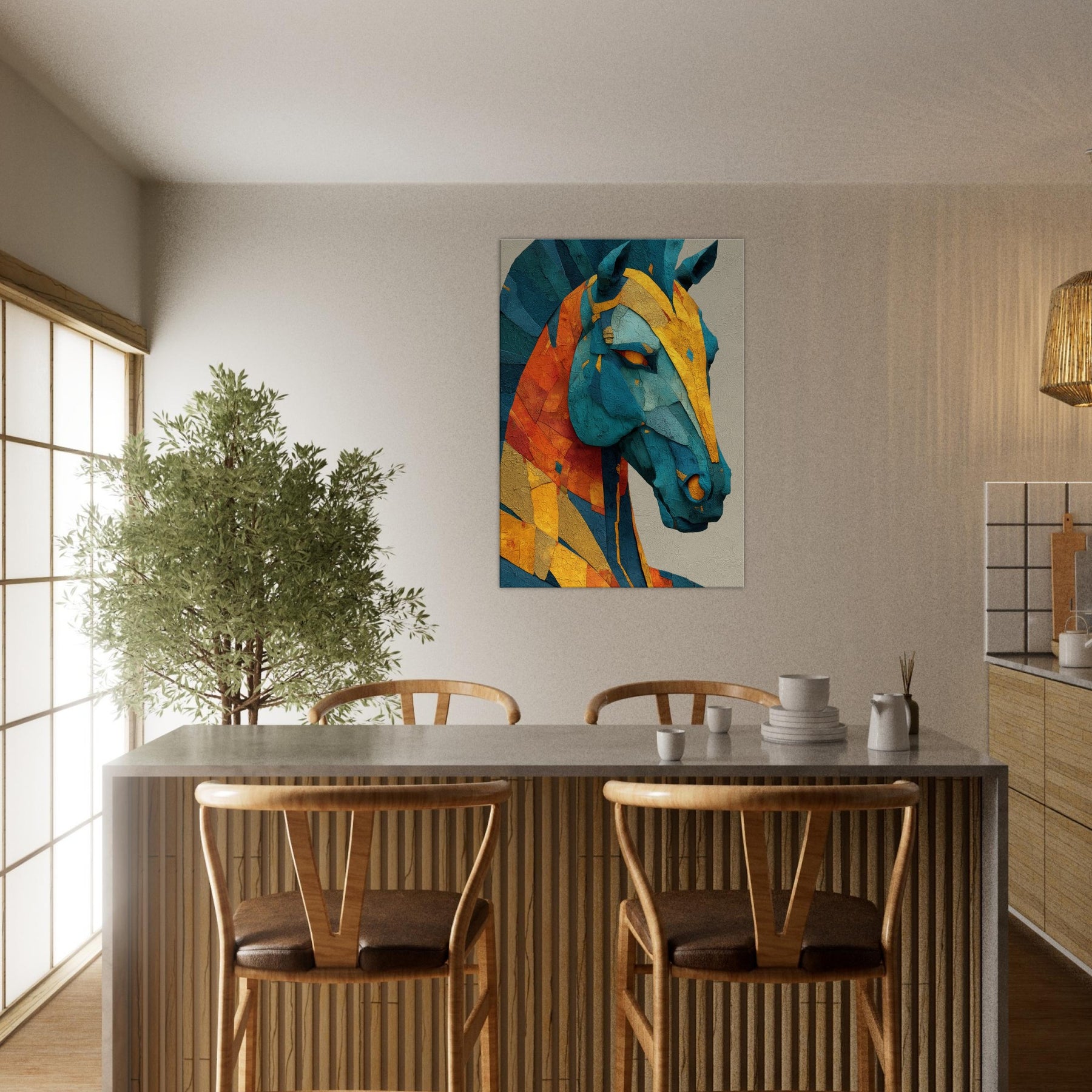 A bold, abstract Centaur strides through a mosaic of bright teal, gold, and coral. This painting conjures thunderous myth into a quiet living space, inviting the eye to wander along angular facets and soft shadows. Its layered texture and sculpted color create the sense of motion, as the Centaur's gaze fuses ancient legend with modern design. Hang it where light can glide across the surface to reveal shifting tones perfect for a dramatic living room or study, enriching atmosphere and conversation.