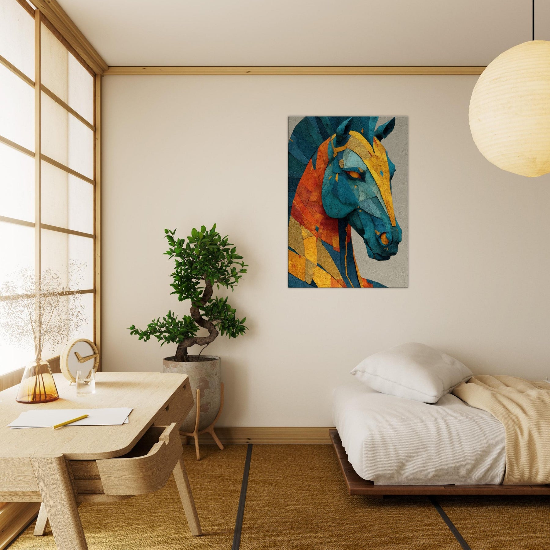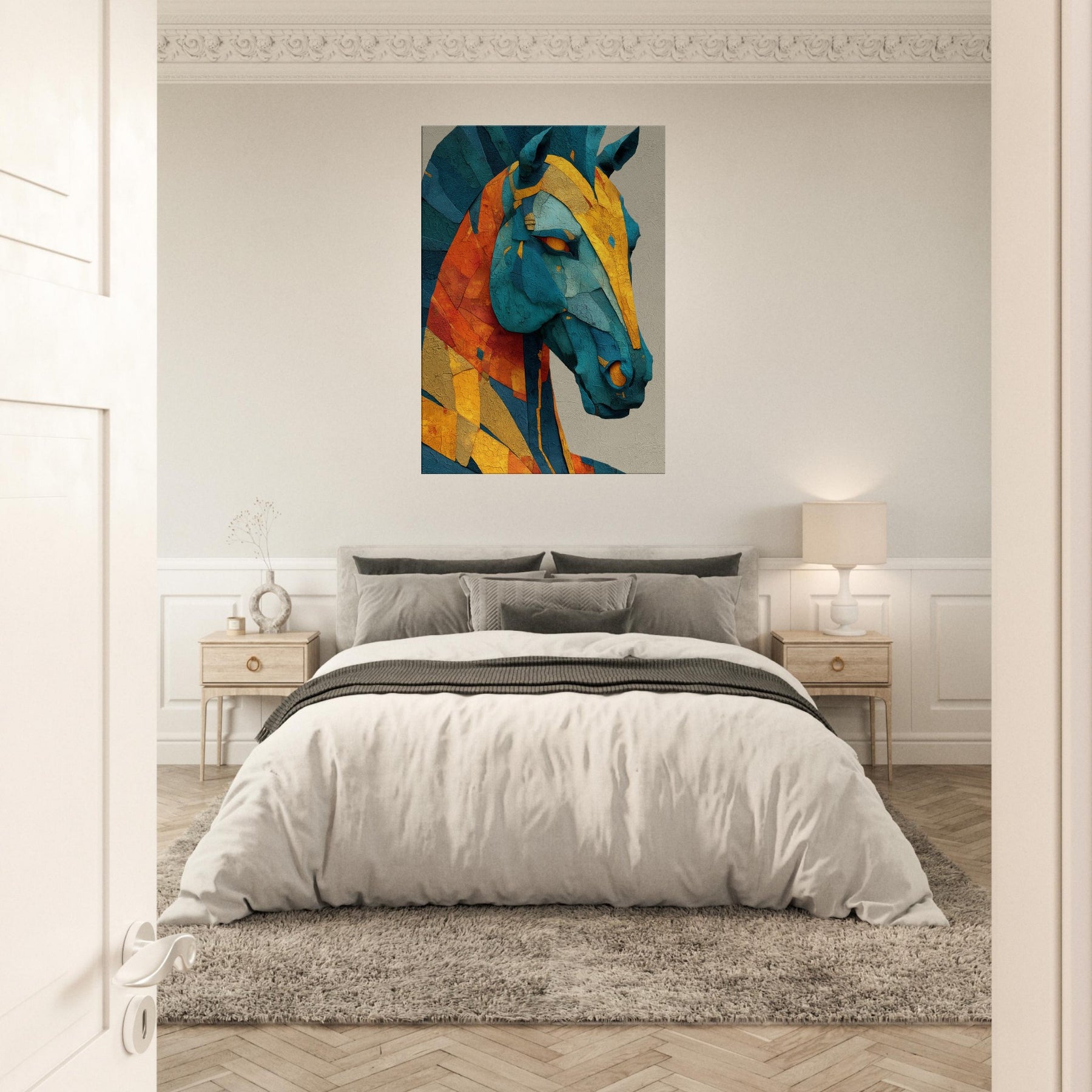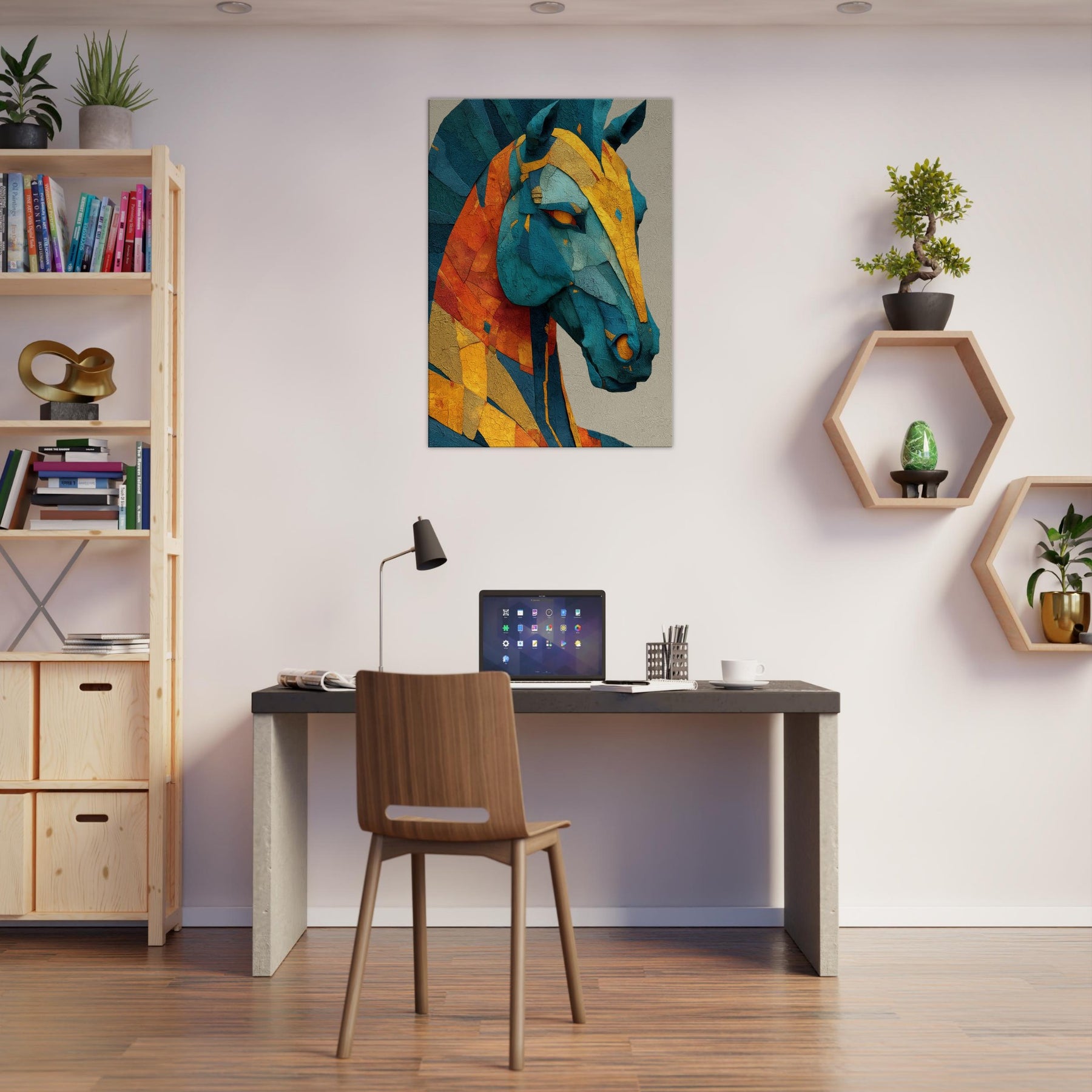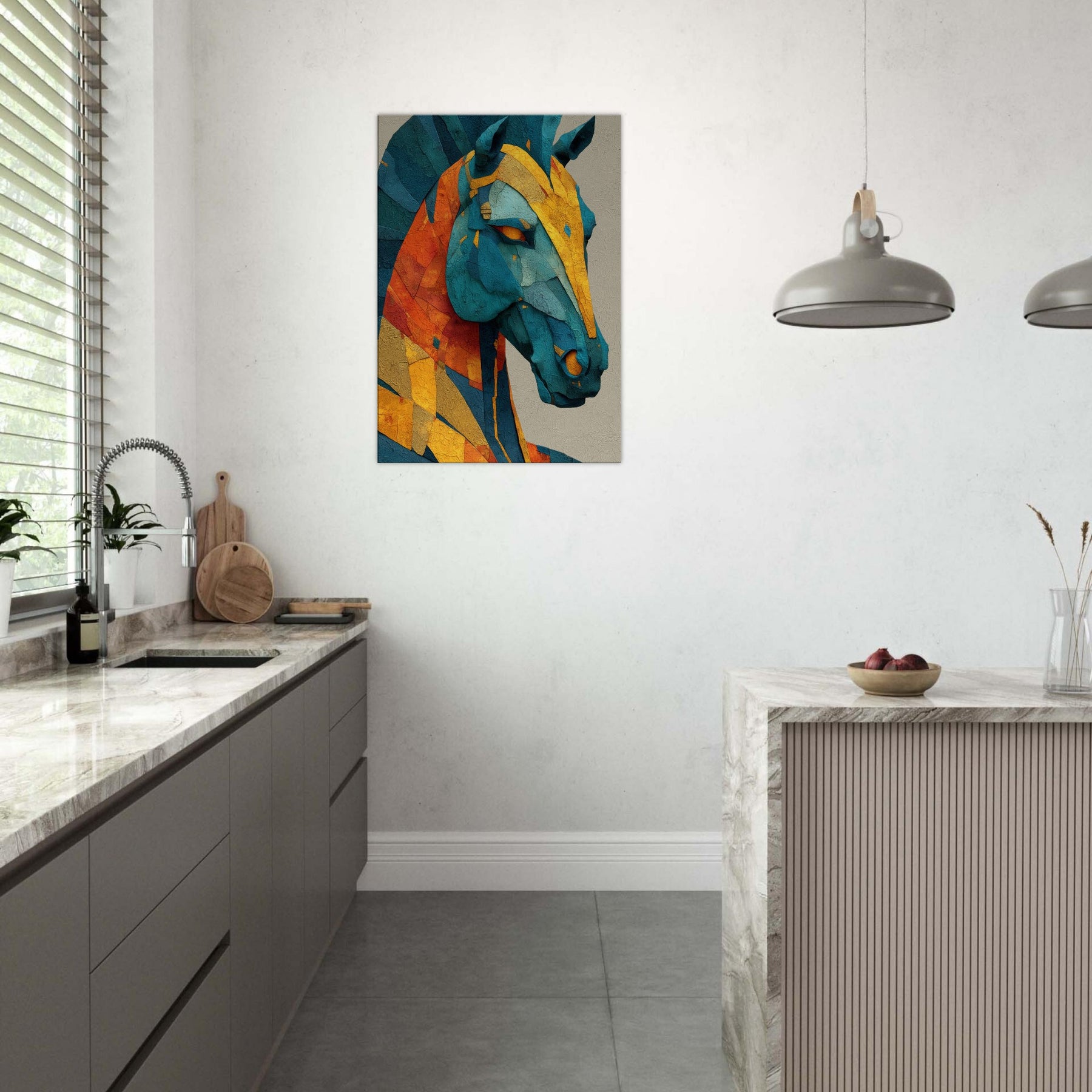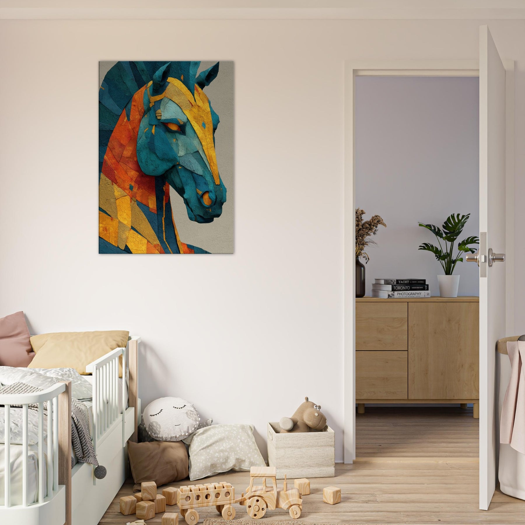 A bold, abstract Centaur strides through a mosaic of bright teal, gold, and coral. This painting conjures thunderous myth into a quiet living space, inviting the eye to wander along angular facets and soft shadows. Its layered texture and sculpted color create the sense of motion, as the Centaur's gaze fuses ancient legend with modern design. Hang it where light can glide across the surface to reveal shifting tones perfect for a dramatic living room or study, enriching atmosphere and conversation.