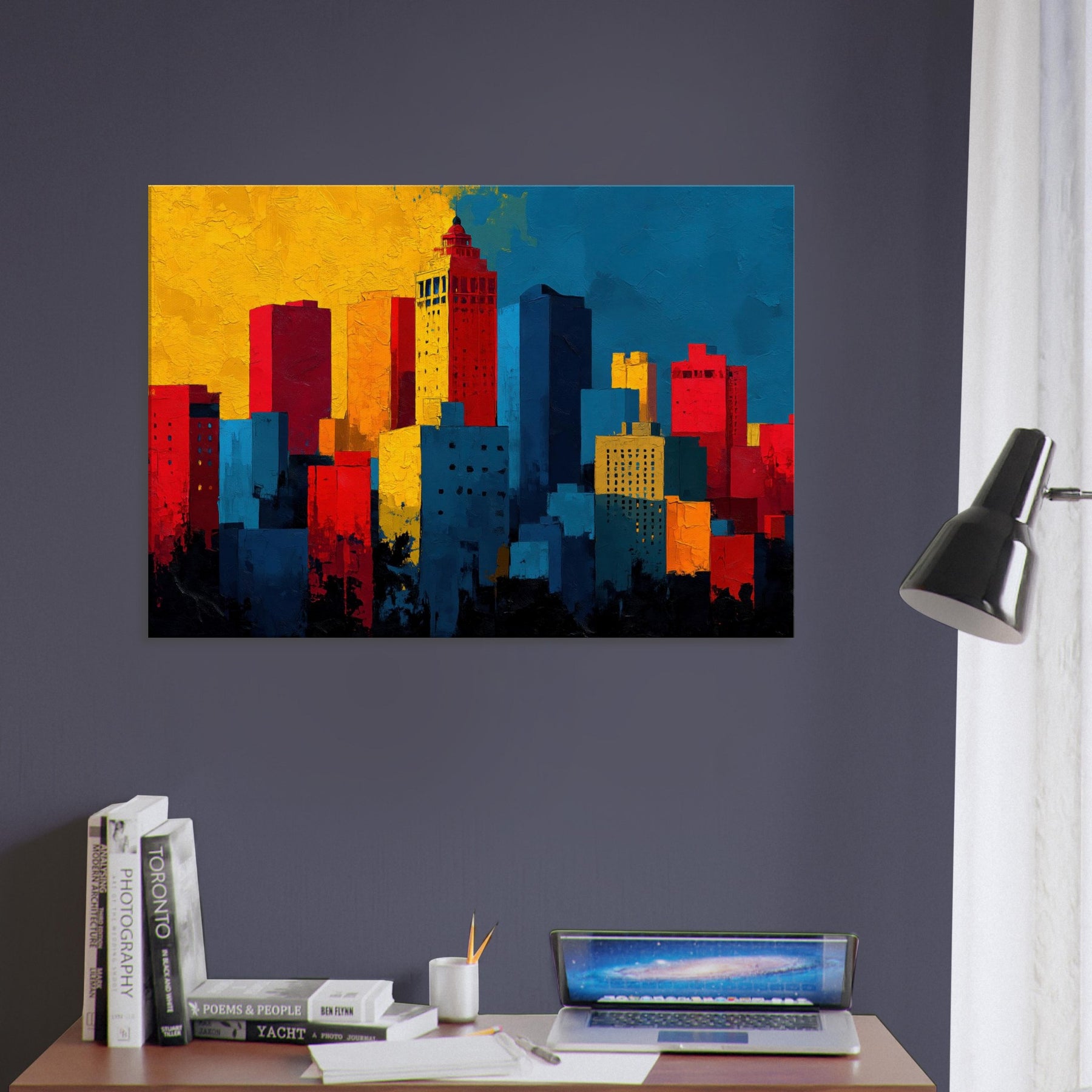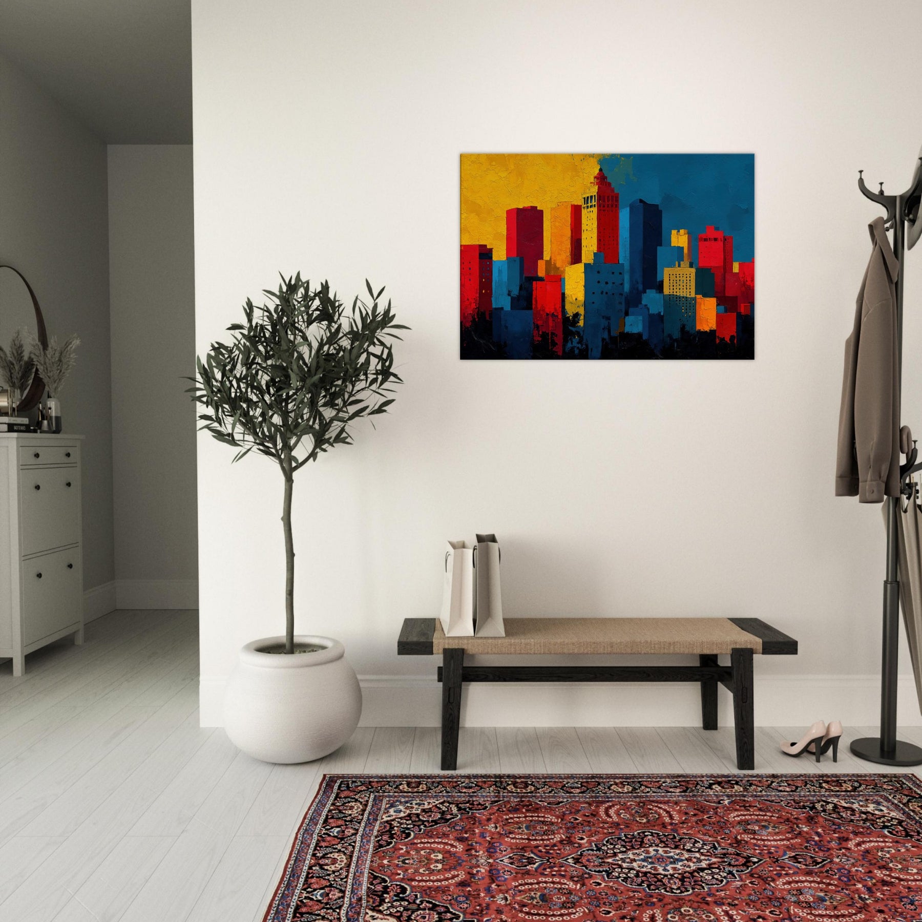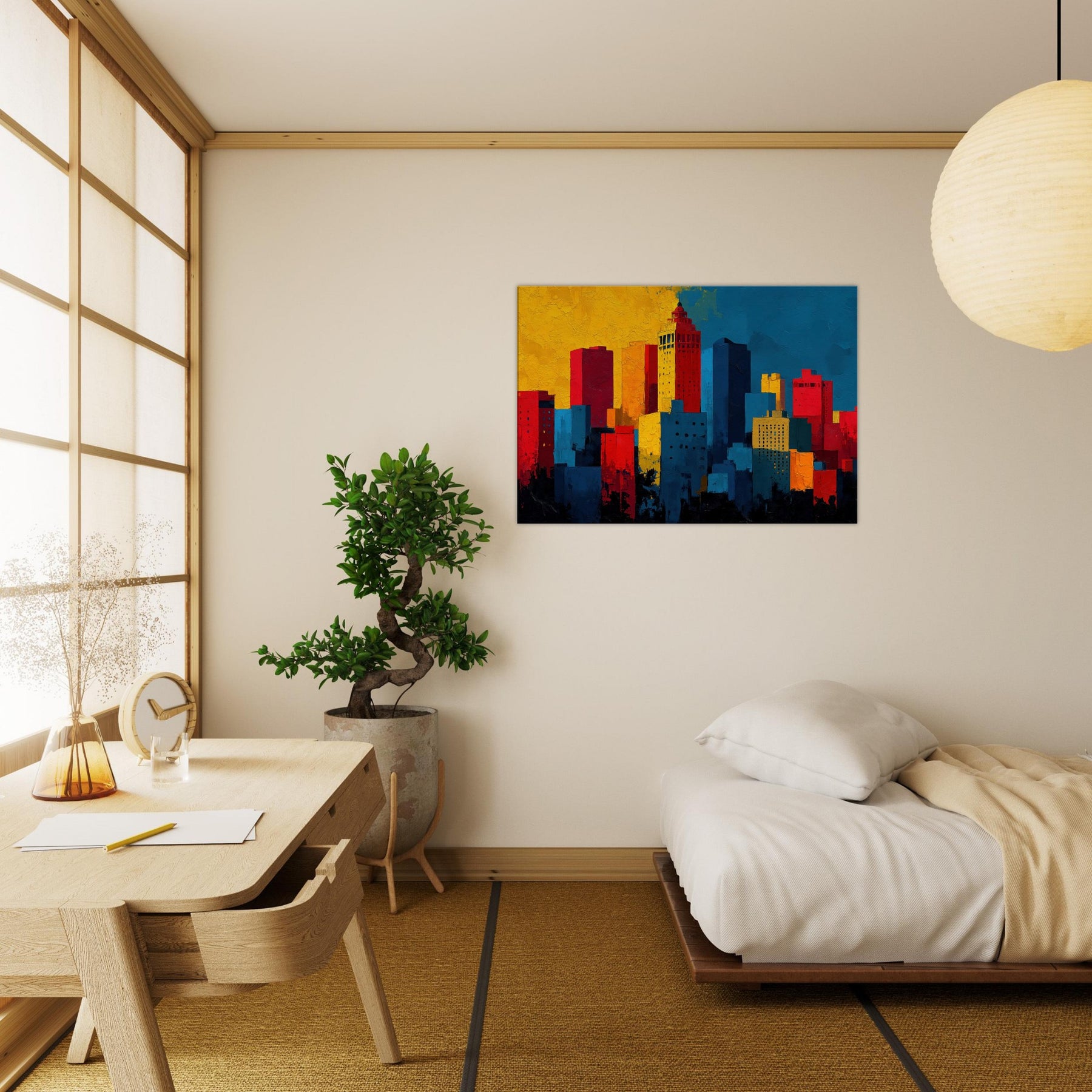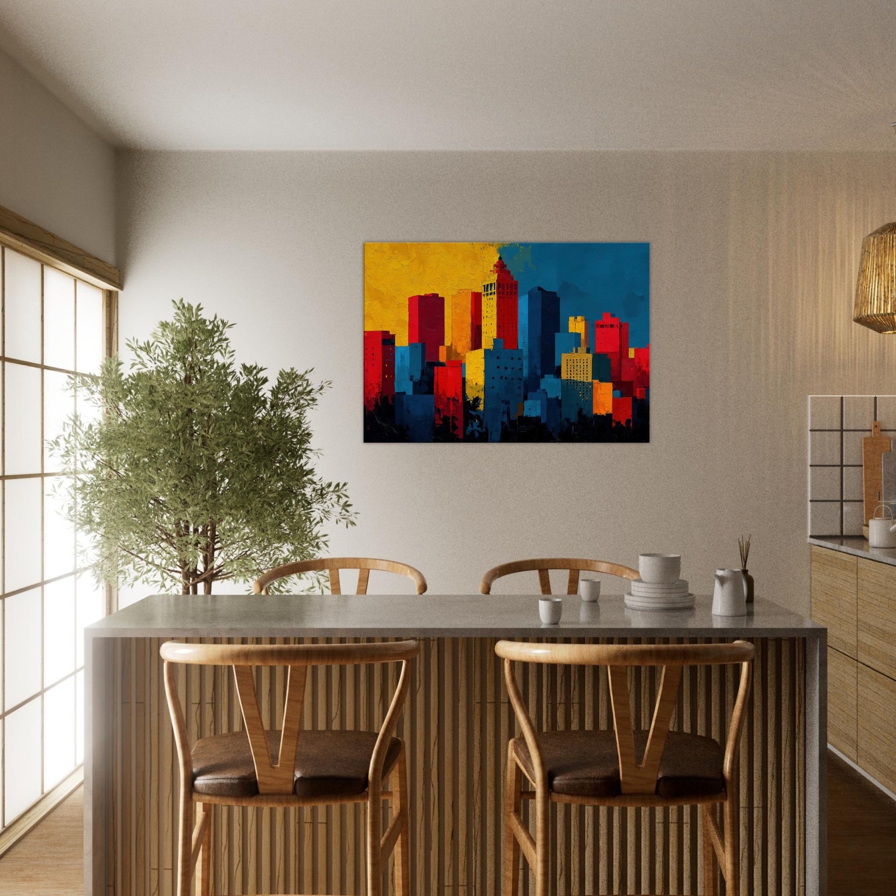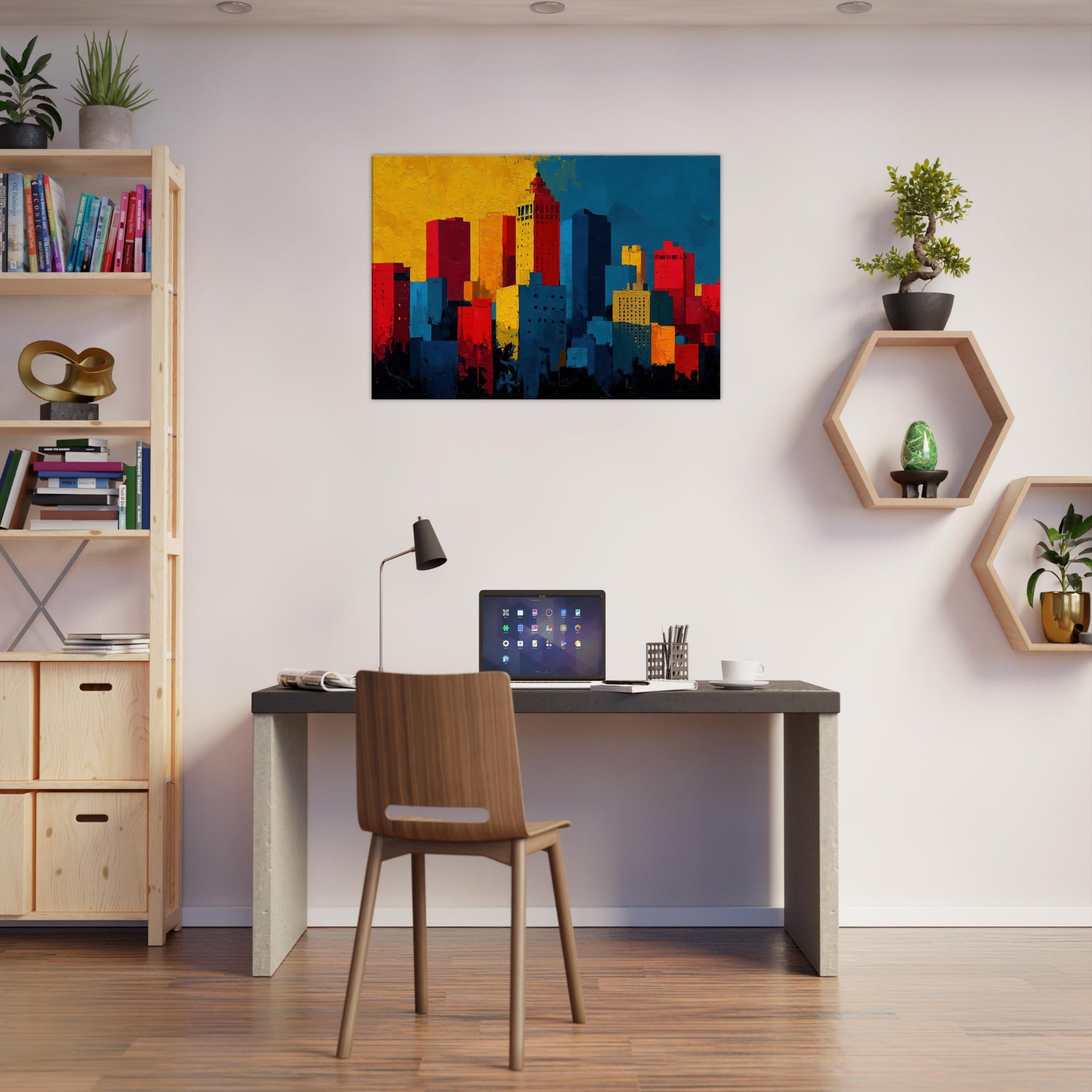 Mexico City blooms in a fearless chorus of color and form. This abstract cityscape captures the pulse of a sprawling metropolis where sunlit yellows kiss midnight blues and angular towers rise like stairways to possibility. The piece hums with warmth and energy, turning any wall into a window of motion and memory. Hang it in a living room or study to invite daylight, urban mystery, and a sense of history in equal measure.