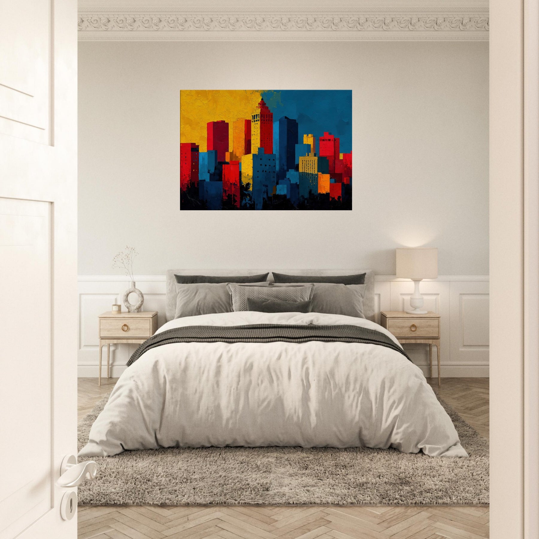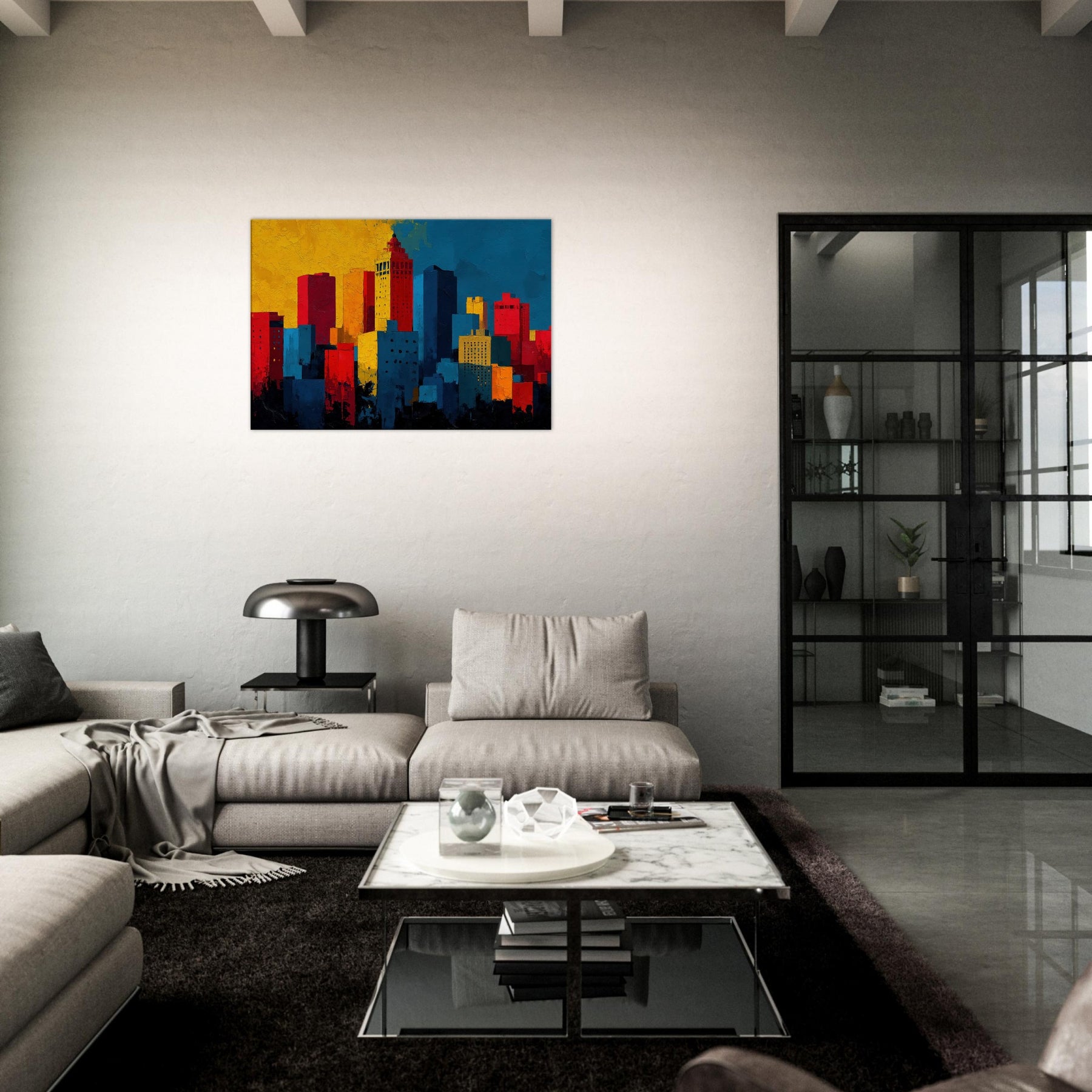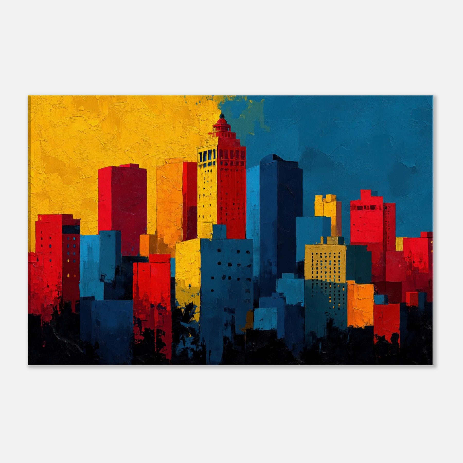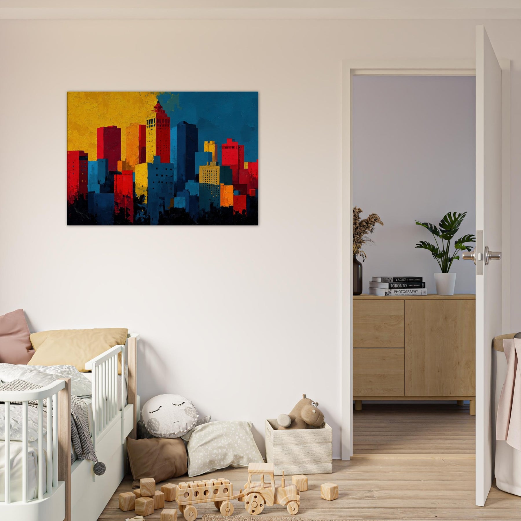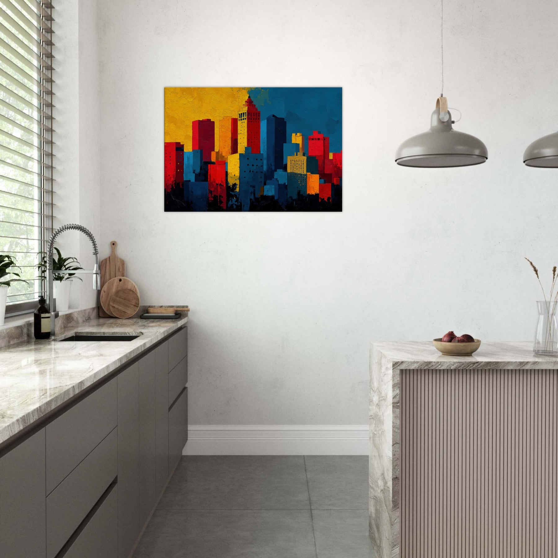 Mexico City blooms in a fearless chorus of color and form. This abstract cityscape captures the pulse of a sprawling metropolis where sunlit yellows kiss midnight blues and angular towers rise like stairways to possibility. The piece hums with warmth and energy, turning any wall into a window of motion and memory. Hang it in a living room or study to invite daylight, urban mystery, and a sense of history in equal measure.