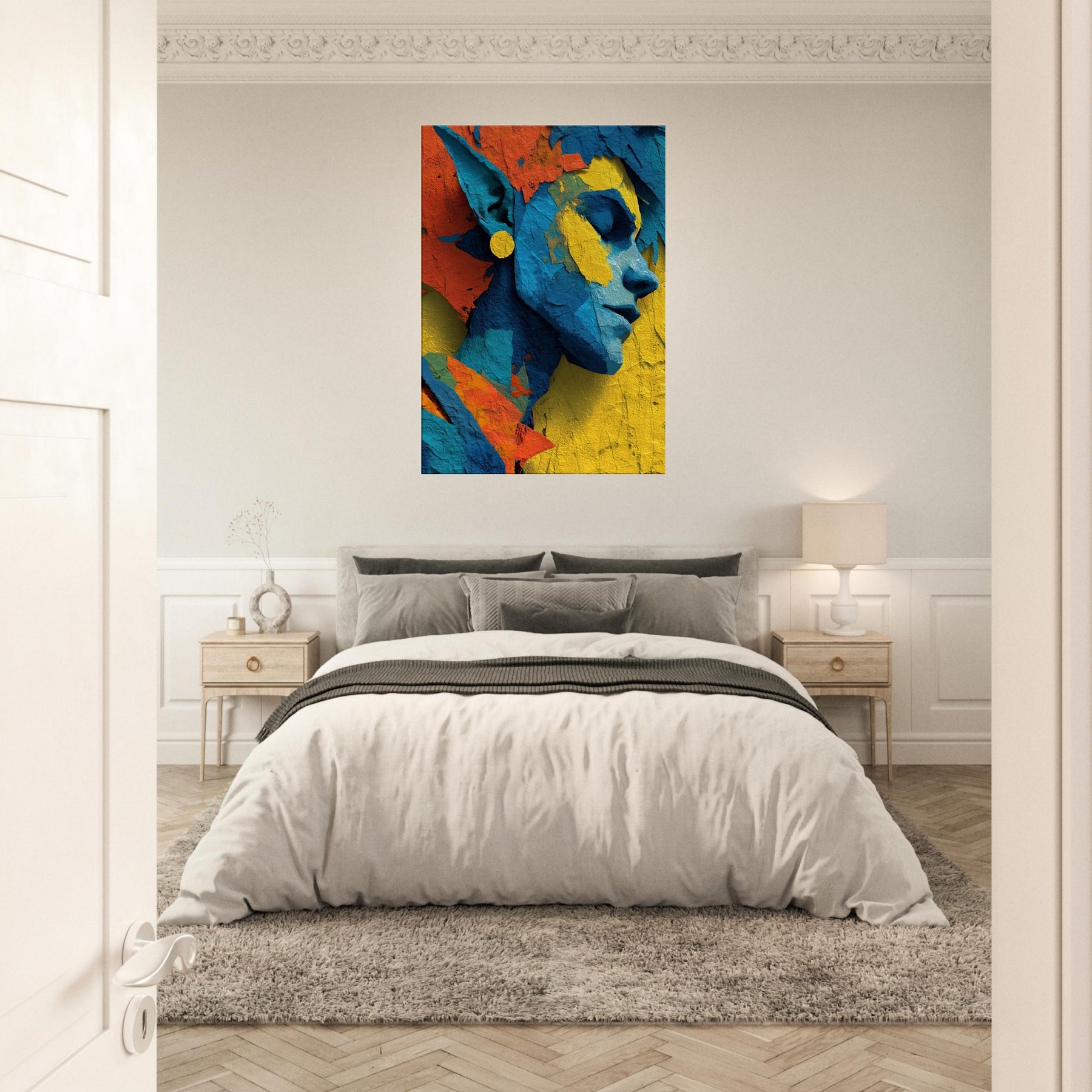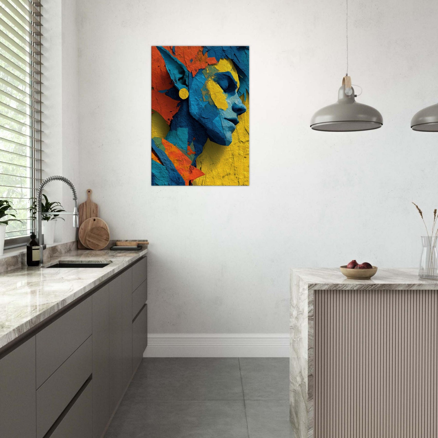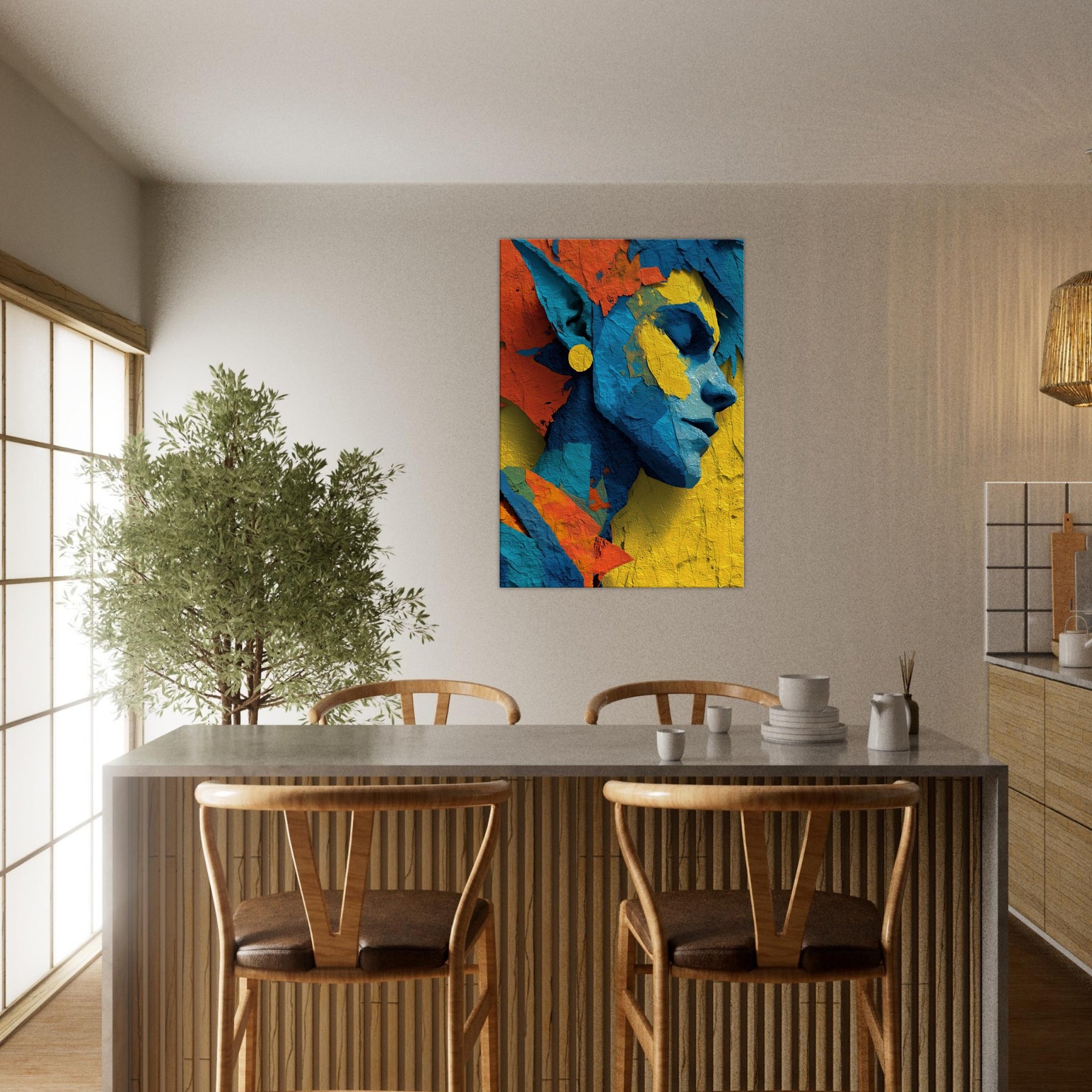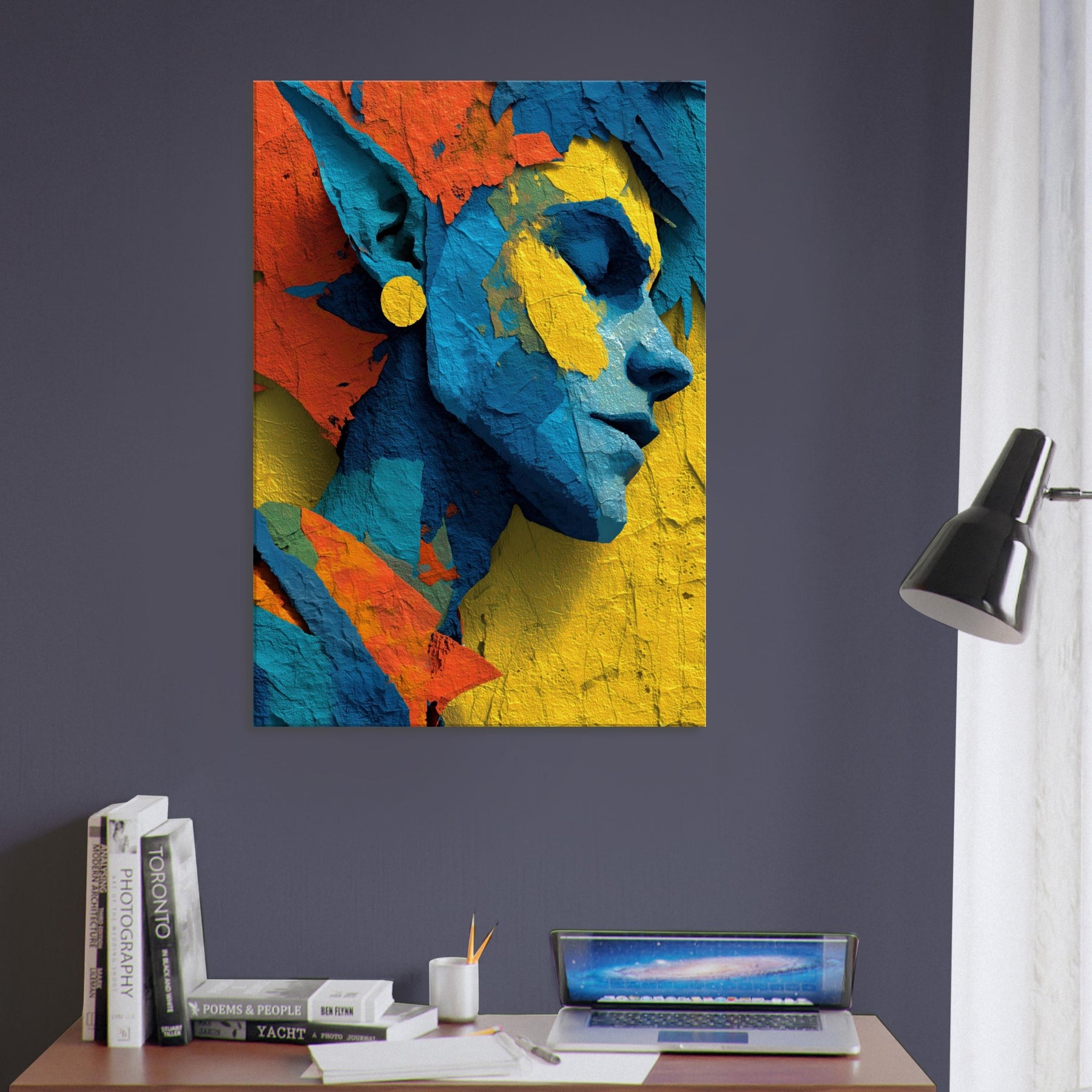 Step into a magical lobby of light where an Elf emerges from a tapestry of color. This abstract conjures motion and myth: jagged planes of azure, gold, and coral coalesce into a serene face, a whisper of ancient woods and airy realms. The texture suggests distance and depth, inviting you to move closer, to breathe with the space. In living rooms or a study, it becomes a luminescent focal point that heightens mood, conversation, and dreamlike imagination.