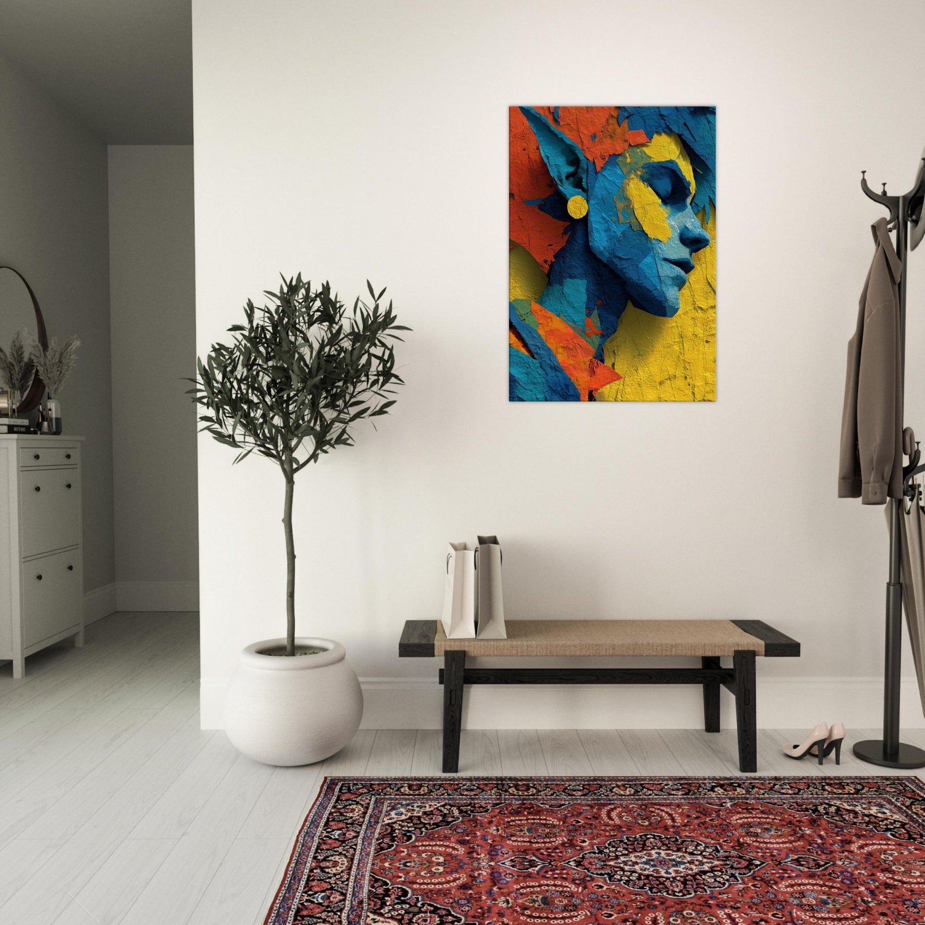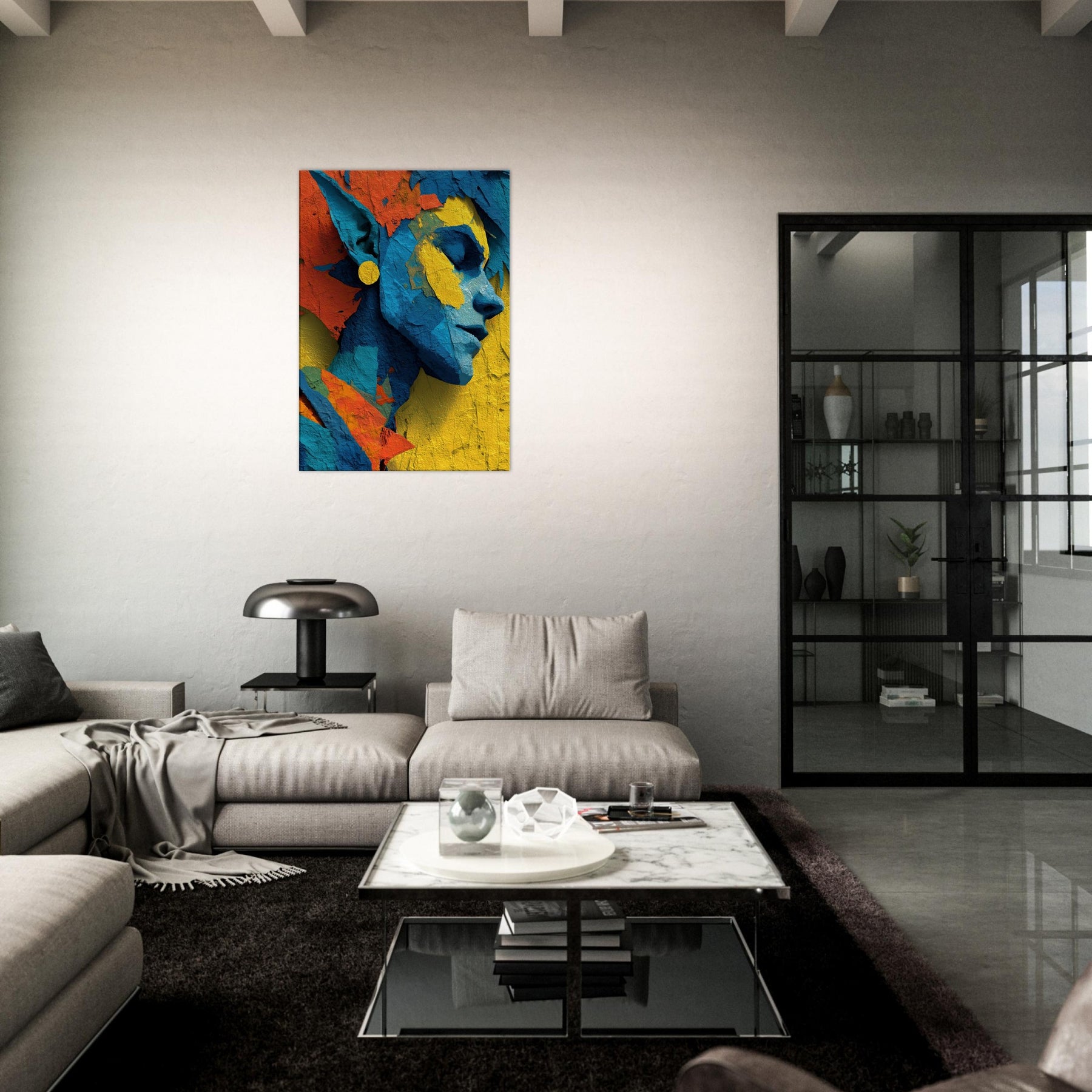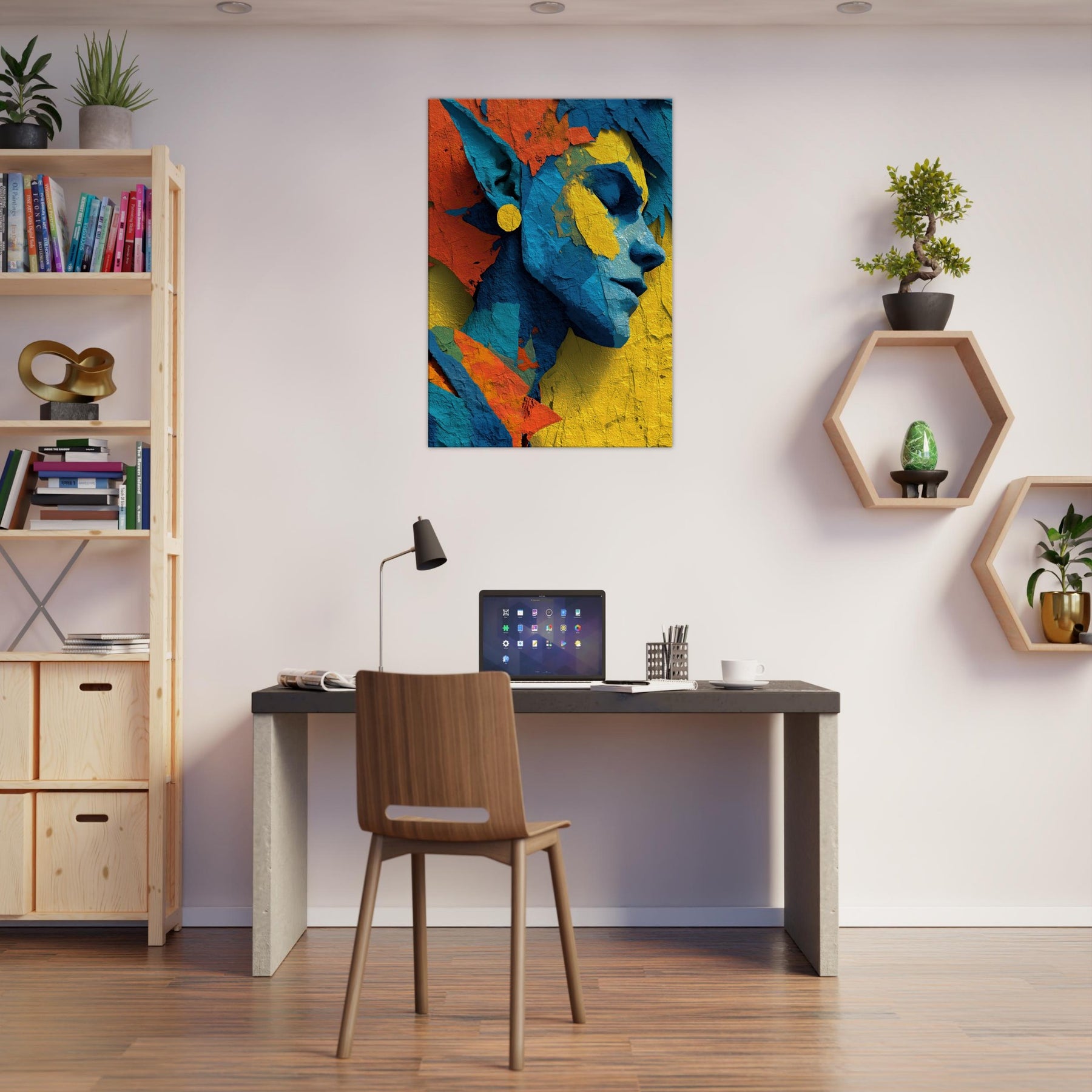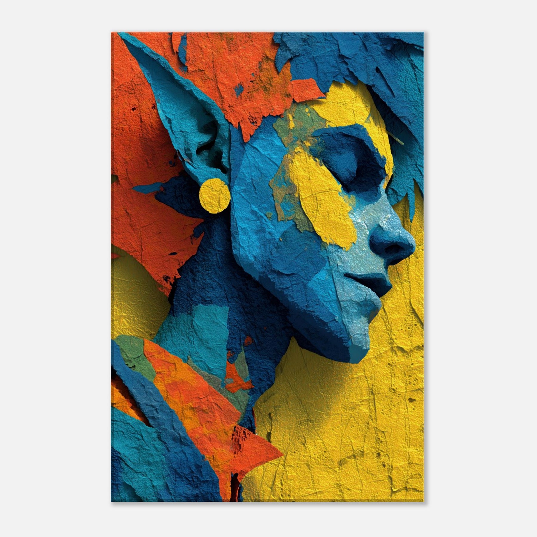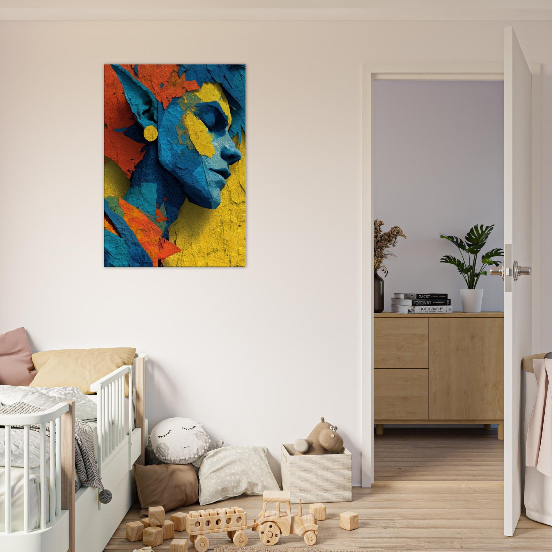 Step into a magical lobby of light where an Elf emerges from a tapestry of color. This abstract conjures motion and myth: jagged planes of azure, gold, and coral coalesce into a serene face, a whisper of ancient woods and airy realms. The texture suggests distance and depth, inviting you to move closer, to breathe with the space. In living rooms or a study, it becomes a luminescent focal point that heightens mood, conversation, and dreamlike imagination.