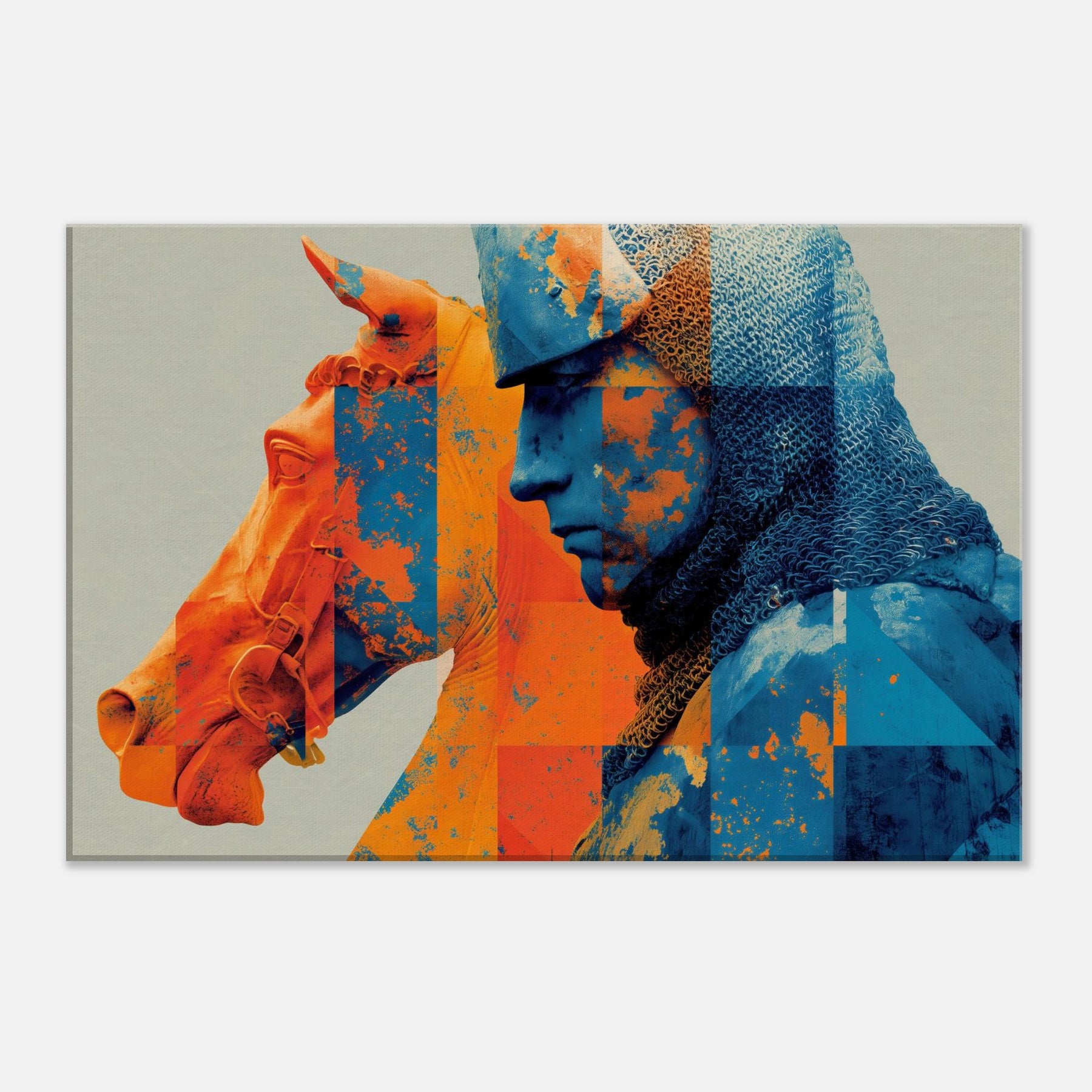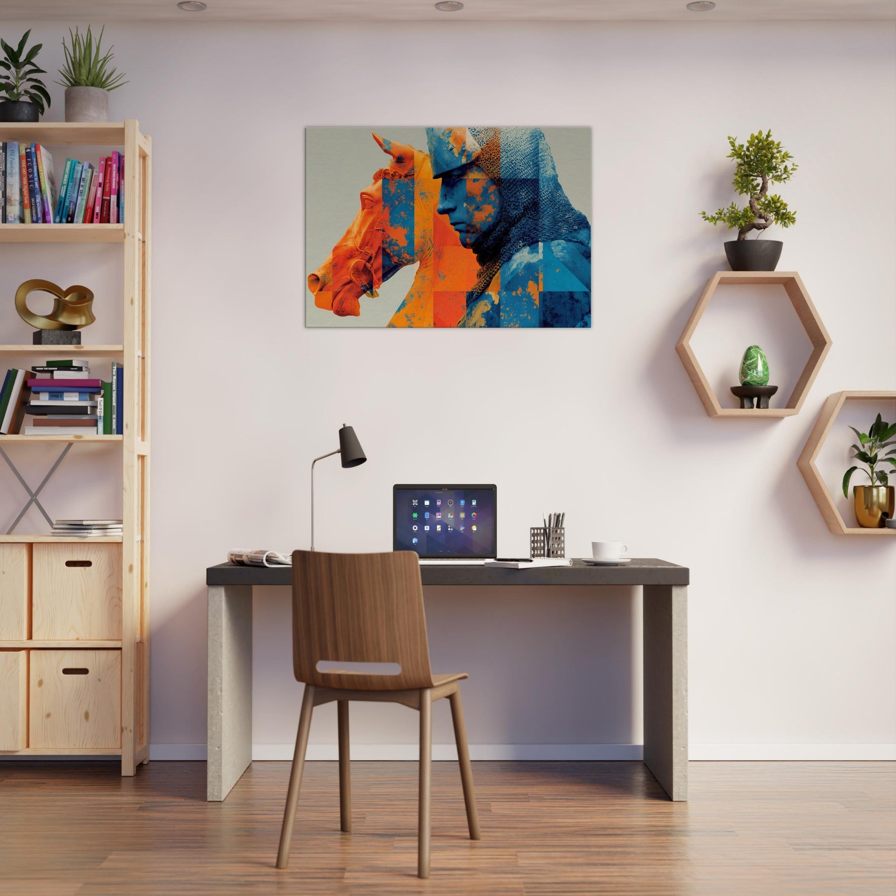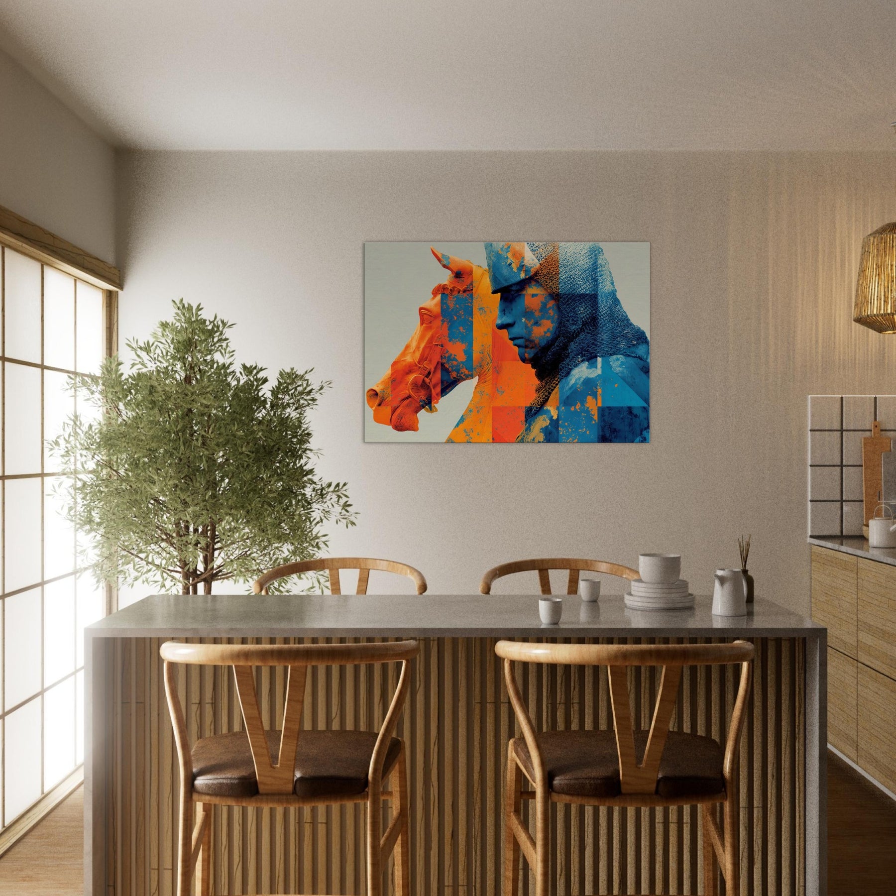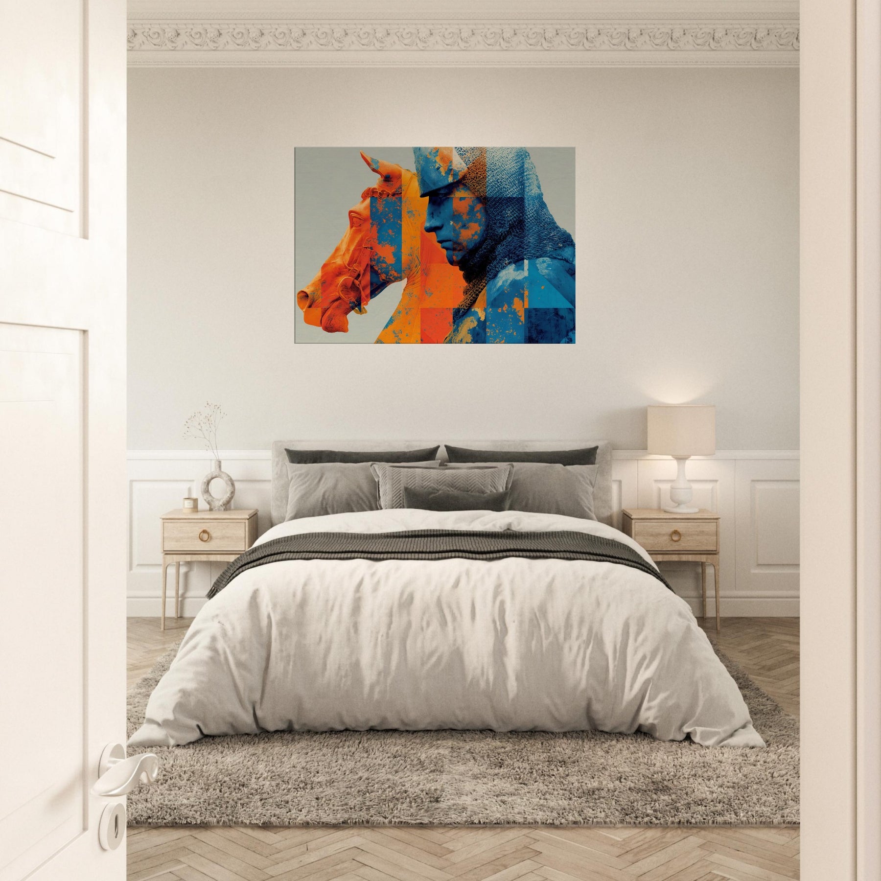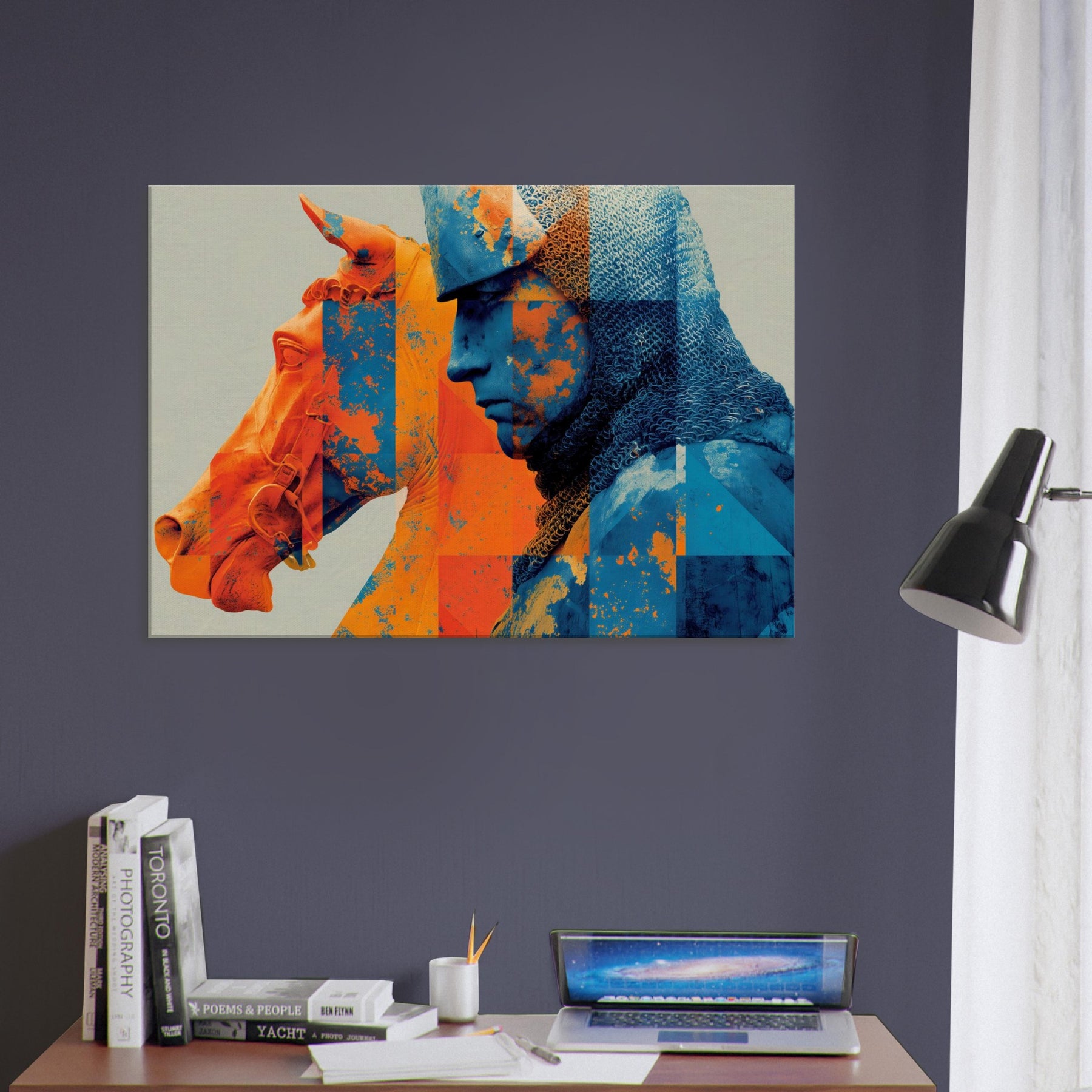 A precise silhouette of a Chess Knight dissolves into a chorus of color, where orange and cobalt collide in a dreamlike grid. This abstract meditation feels both ancient and electric, inviting focus, contemplation, and bold conversation in any living room. The tactile impression of carved stone is echoed in layered textures, while the shifting geometry suggests motion and strategy. Hang it where light travels across walls to reveal new facets, turning halls into galleries and everyday spaces into quiet, cinematic moments.
