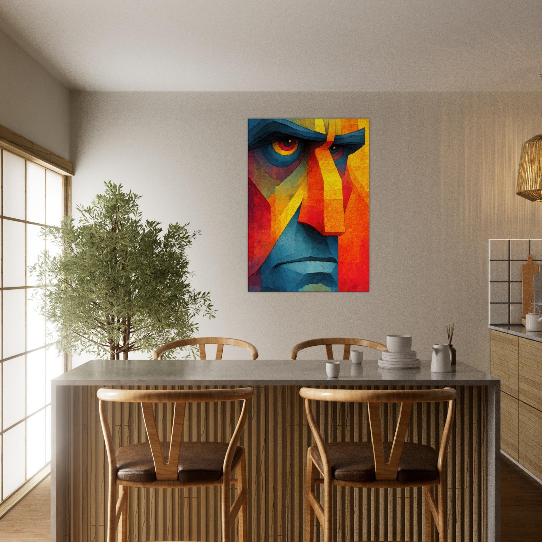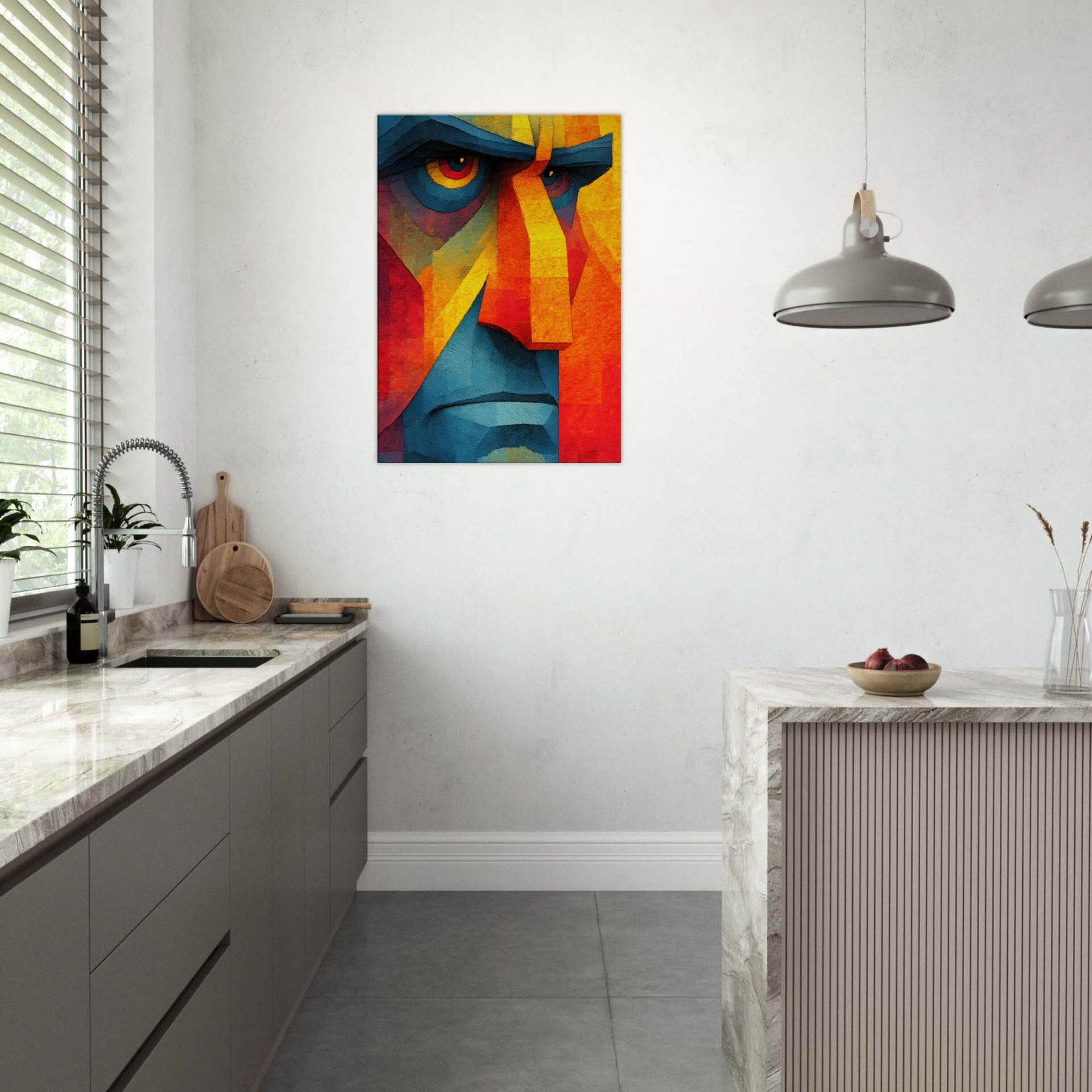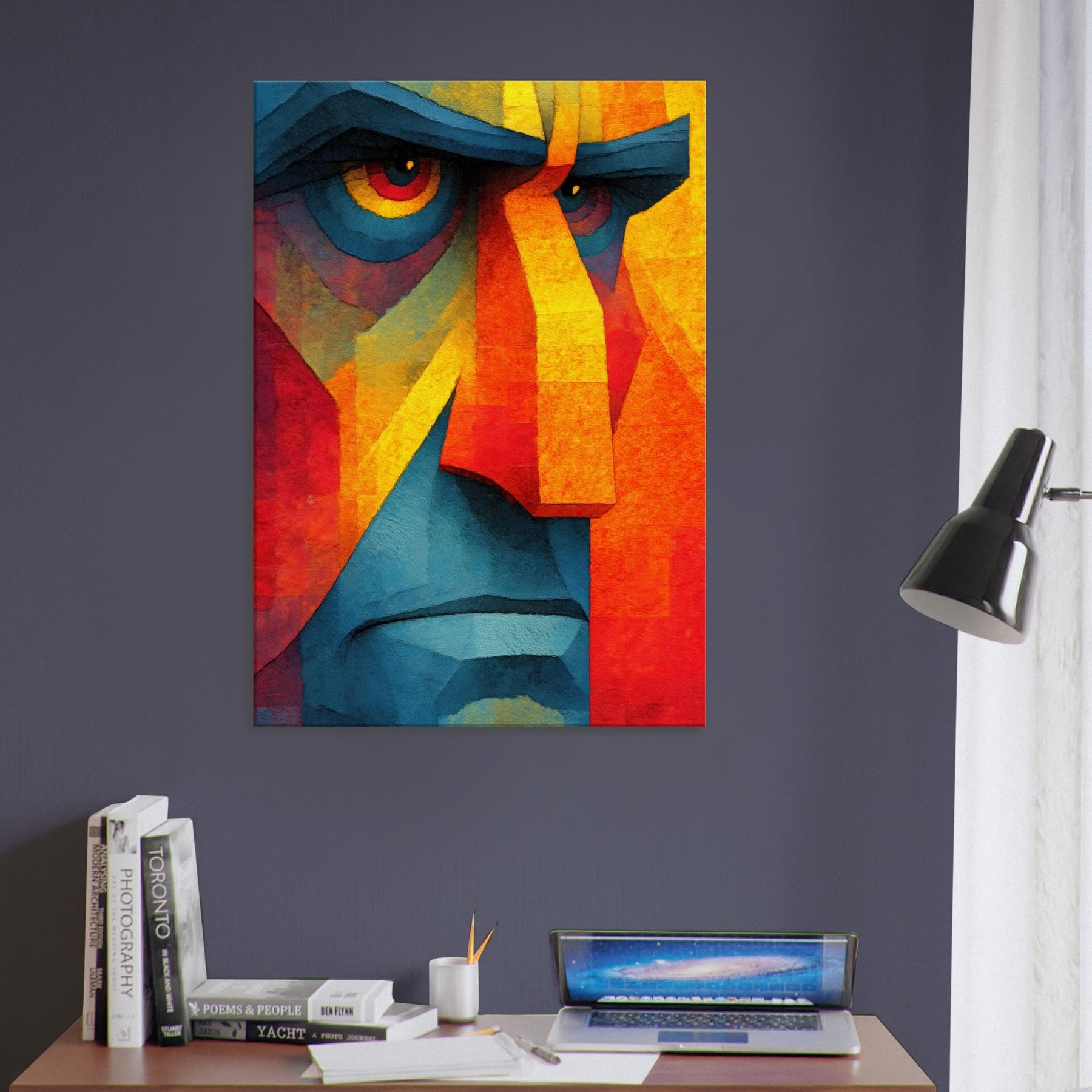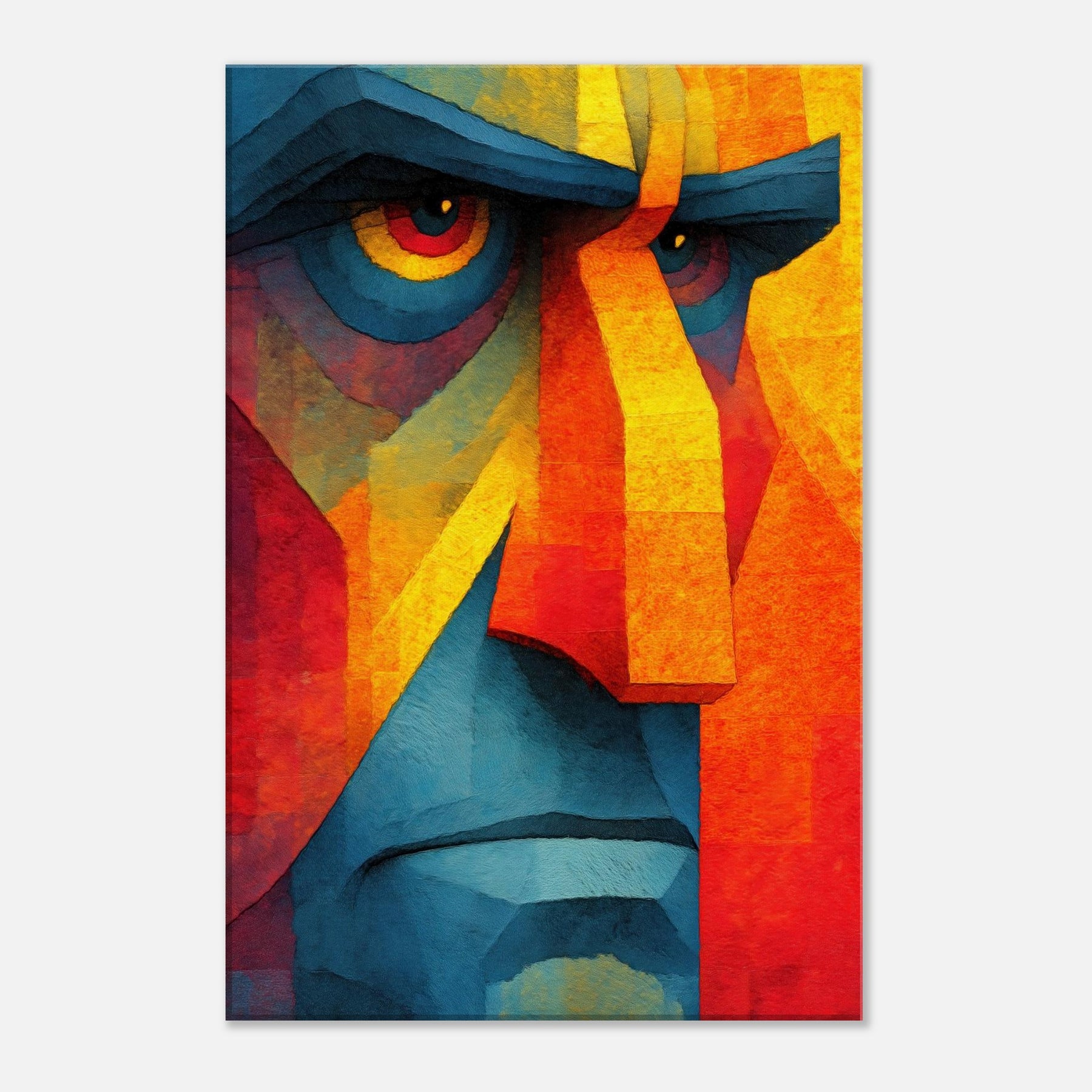 Awash in vibrant shards, this Cubist Face becomes a magnetic focal point a dynamic interplay of color blocks, light, and shadow. The abstract rendering invites the eye to travel across jagged planes, revealing new expressions as you move. It breathes warmth and energy into a living room, calming a modern space with its cool blues and feverish yellows, while the bold geometry adds structure to soft furnishings. A timeless statement piece, it complements minimalist palettes or eclectic textures, turning every glance into a subtle act of discovery.