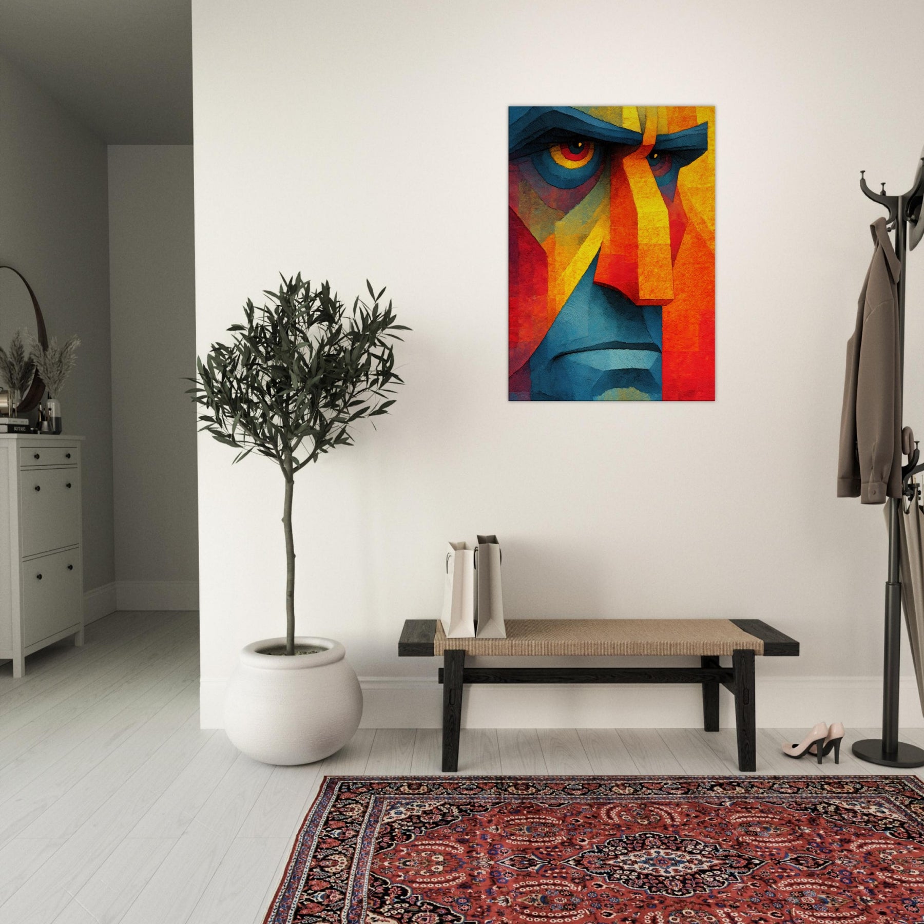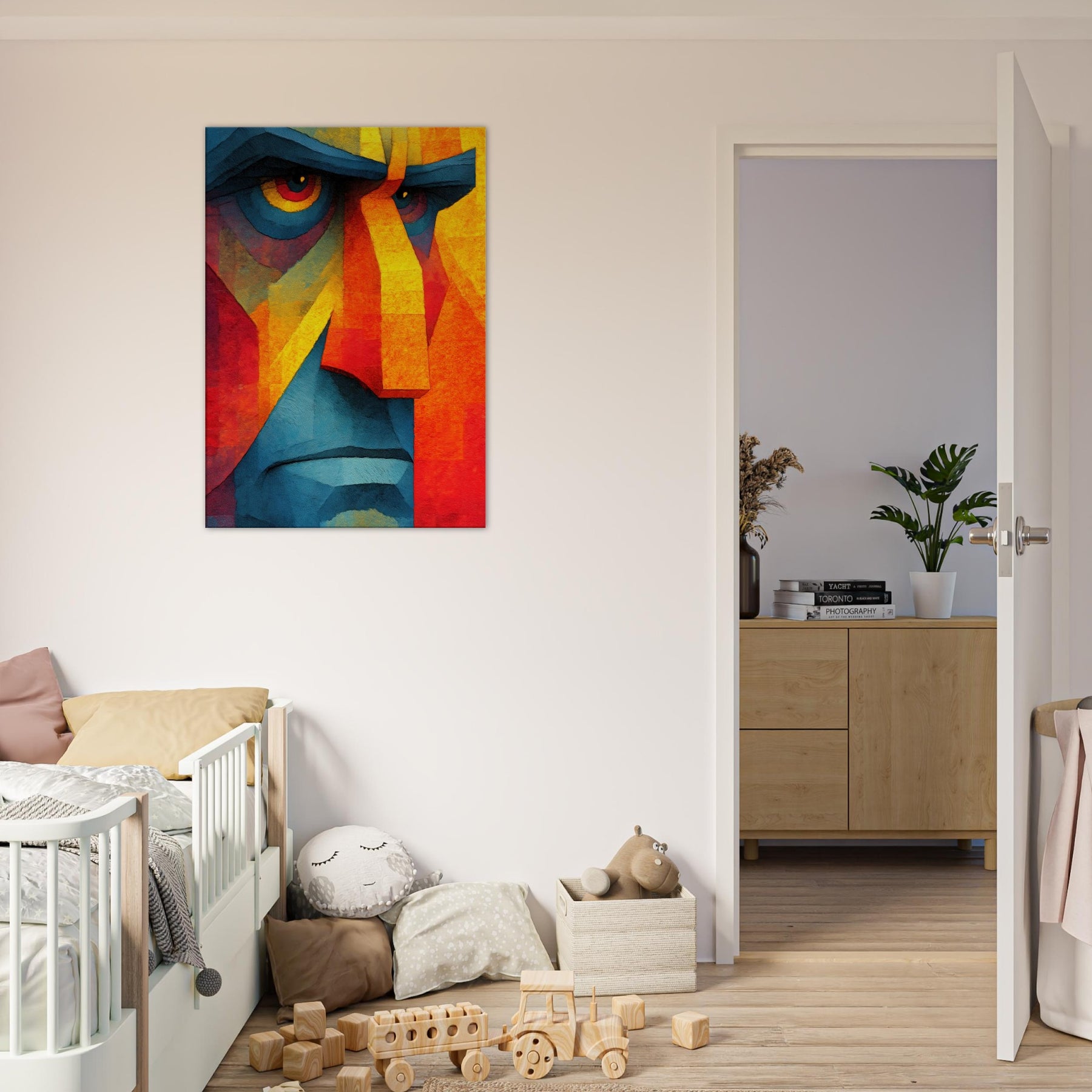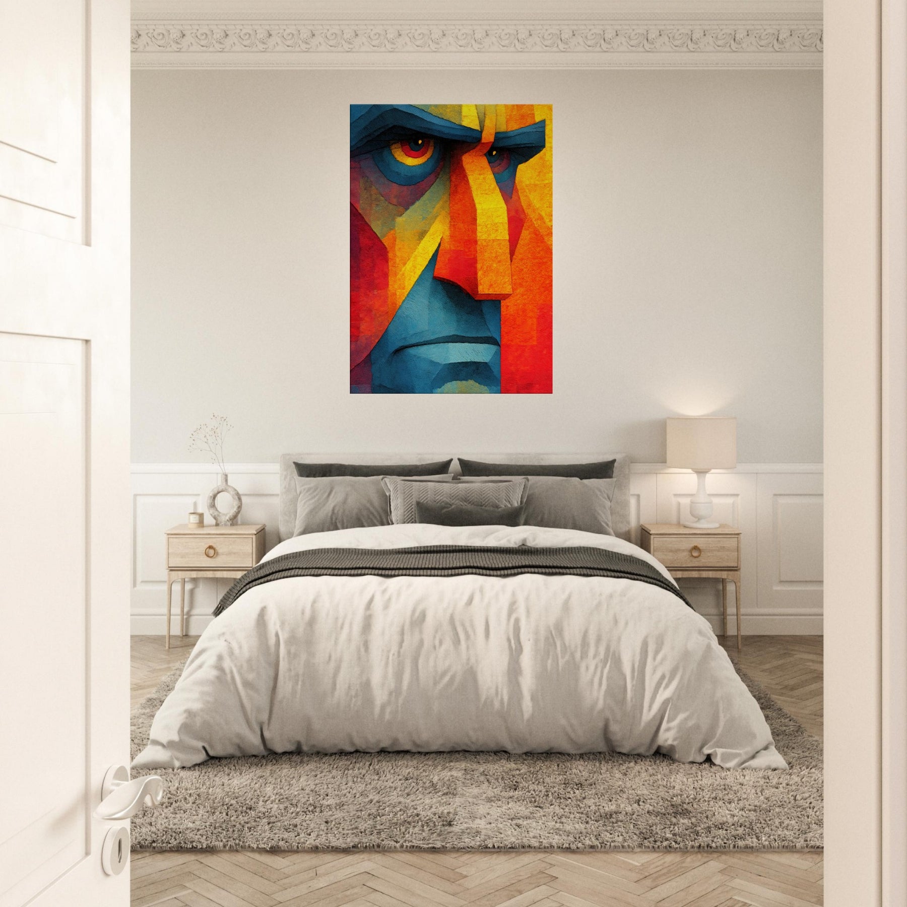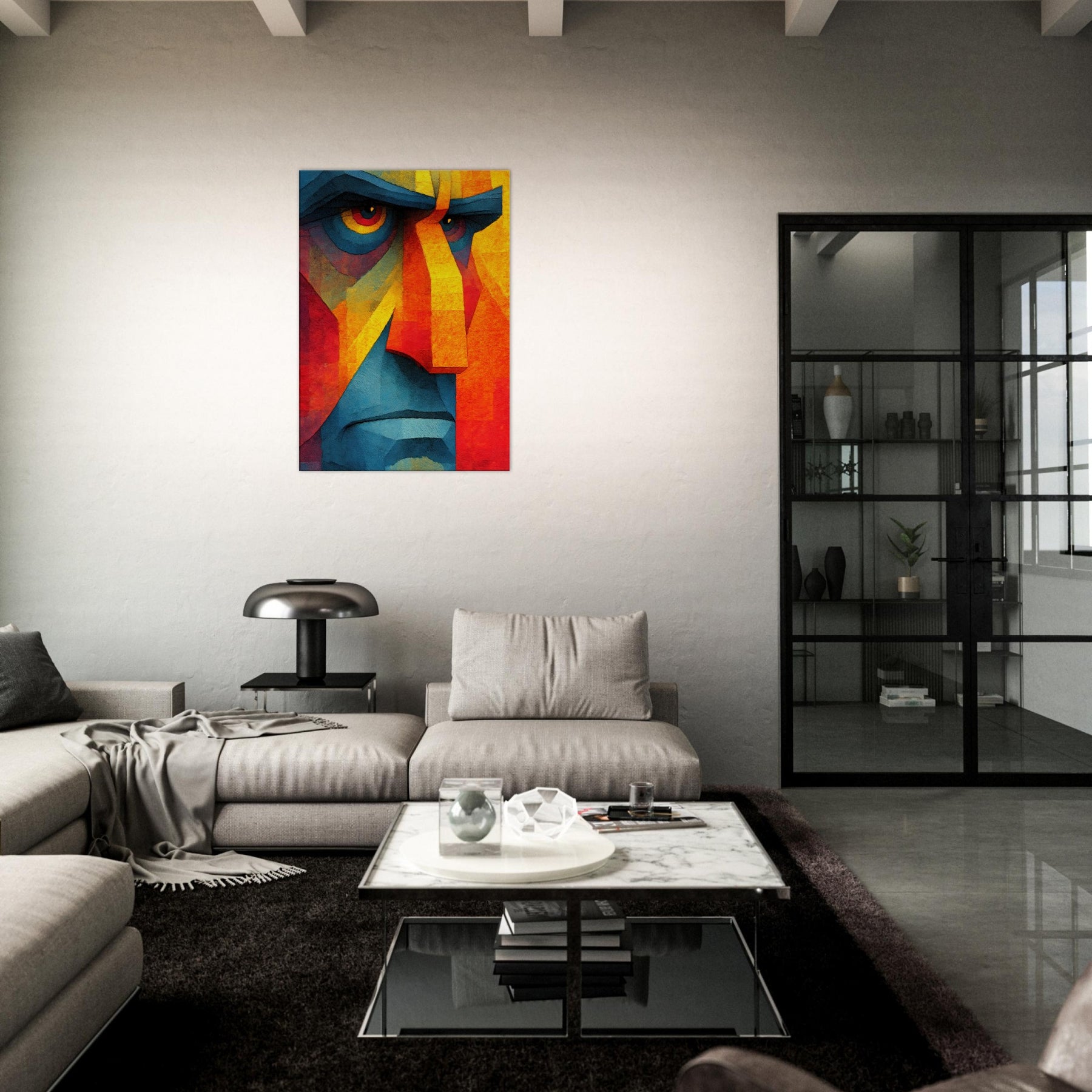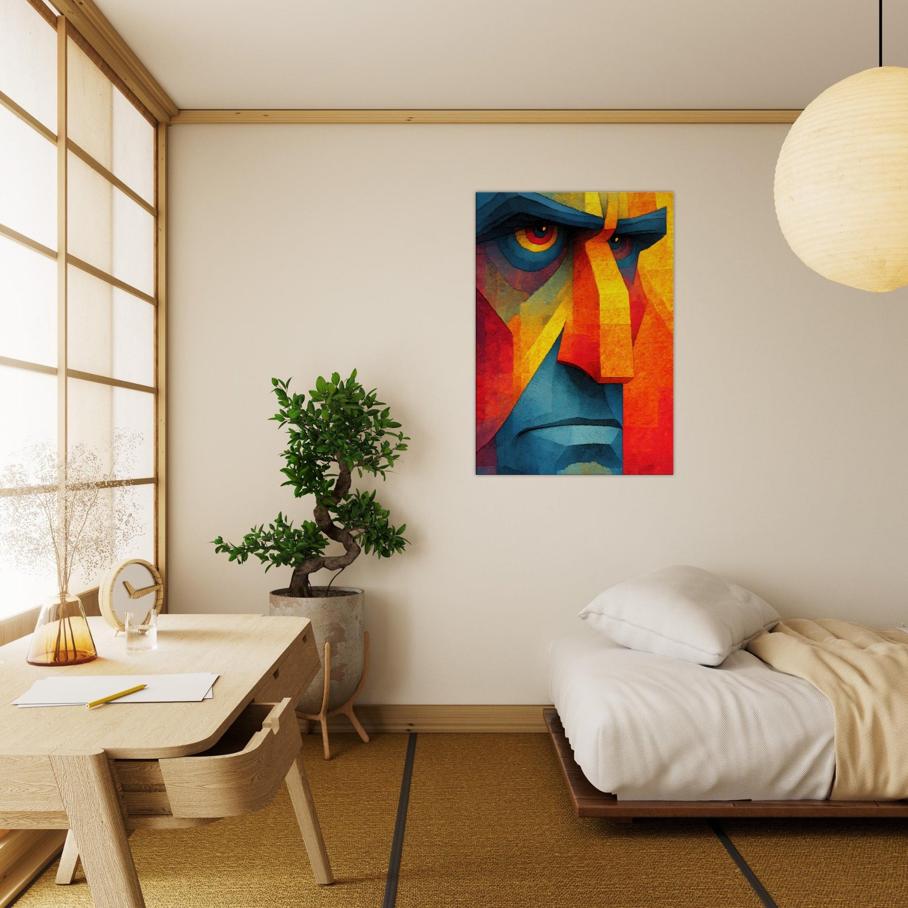 Awash in vibrant shards, this Cubist Face becomes a magnetic focal point a dynamic interplay of color blocks, light, and shadow. The abstract rendering invites the eye to travel across jagged planes, revealing new expressions as you move. It breathes warmth and energy into a living room, calming a modern space with its cool blues and feverish yellows, while the bold geometry adds structure to soft furnishings. A timeless statement piece, it complements minimalist palettes or eclectic textures, turning every glance into a subtle act of discovery.