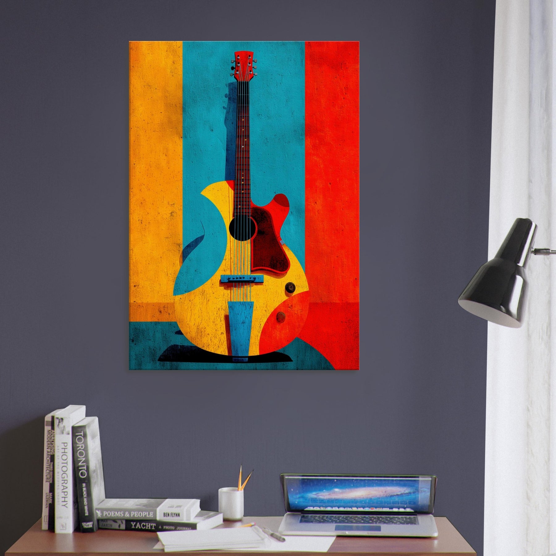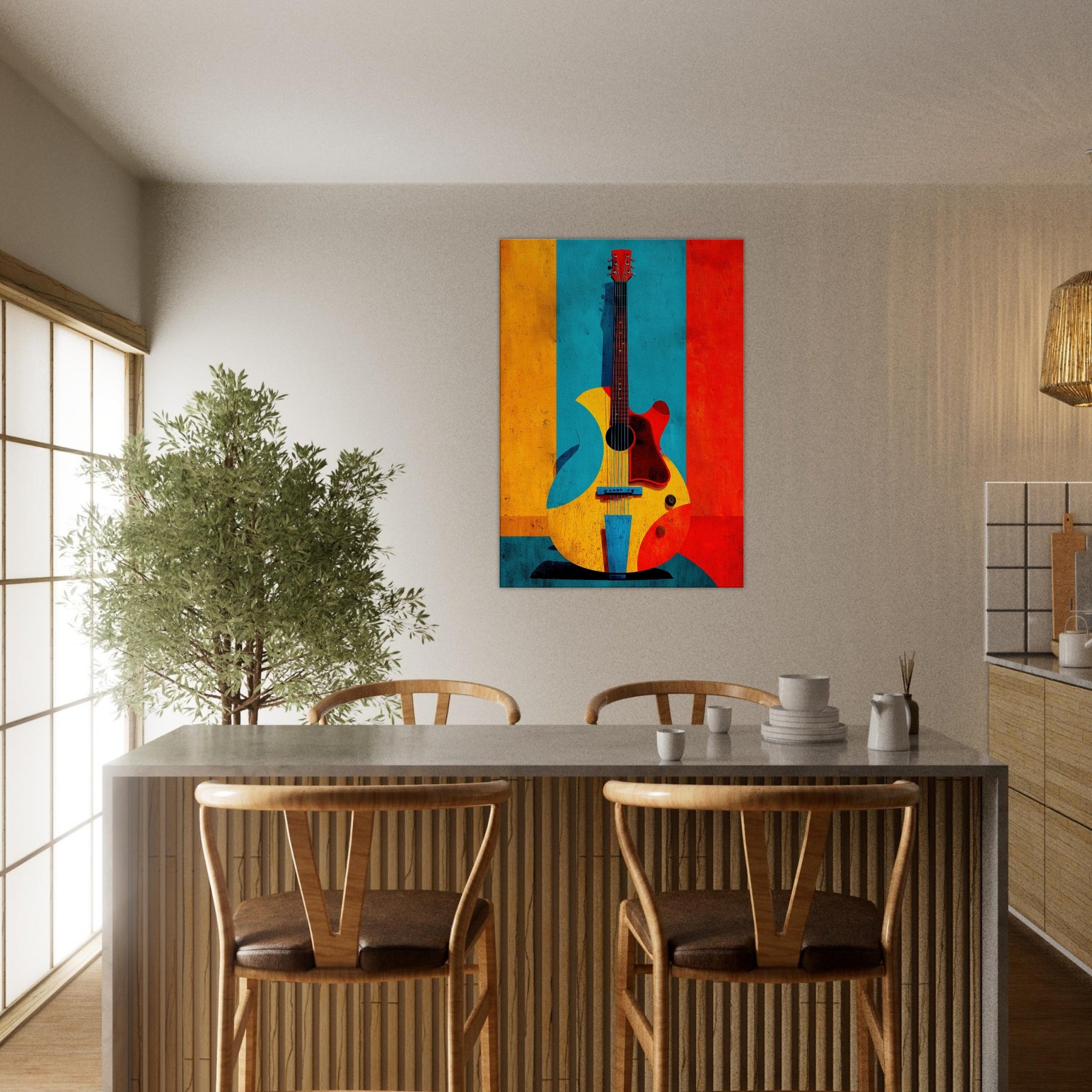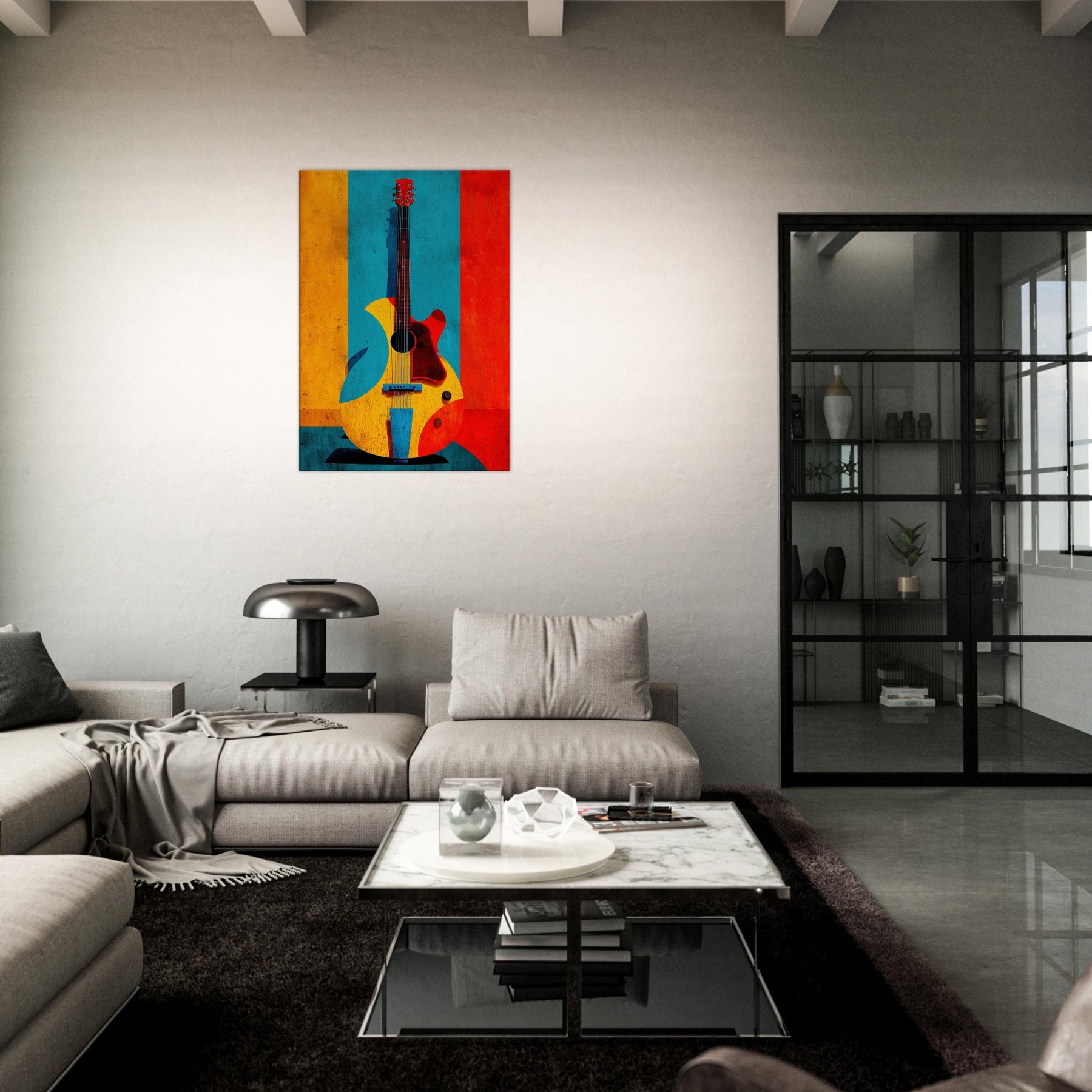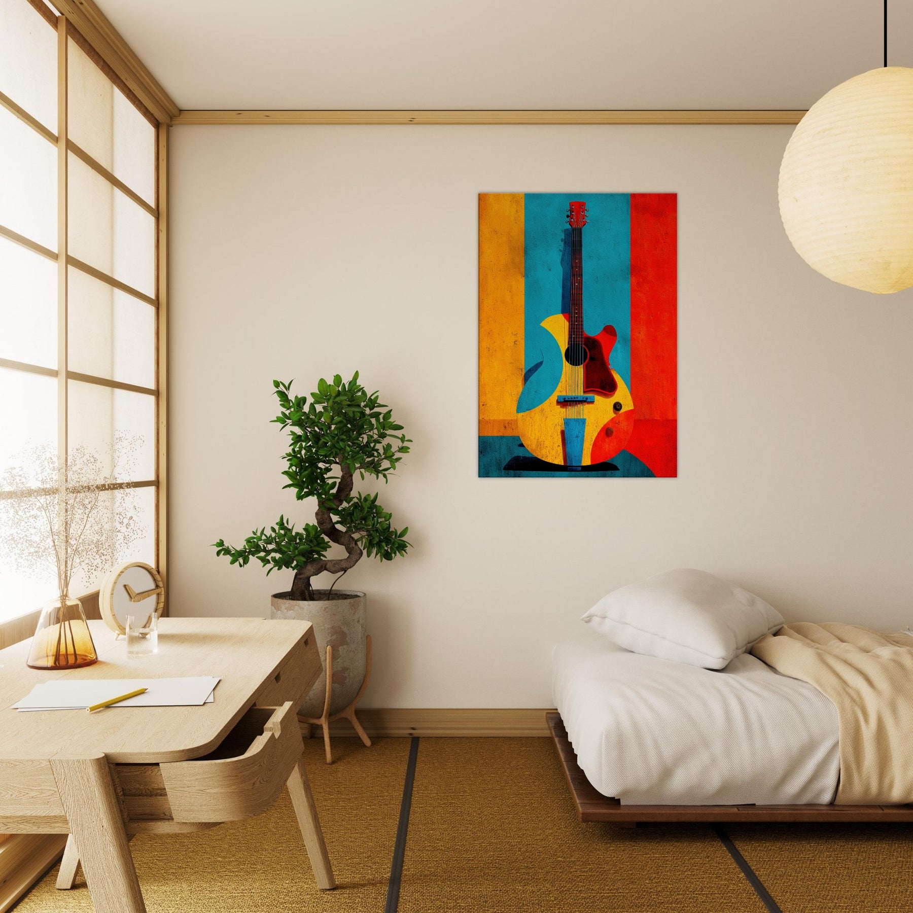 An electric silhouette leans into a field of color, letting the guitar breathe as a pulse of possibility. This abstract study folds amber, teal, and scarlet into a musical cityscape, inviting atmosphere and movement into your living room. Each brush of hue and negative space suggests rhythm, warmth, and an intimate soundtrack for daily mornings and midnight reflections. Hang it where you want conversation to hum and style to serenade the space, transforming walls into a gallery of mood and memory.