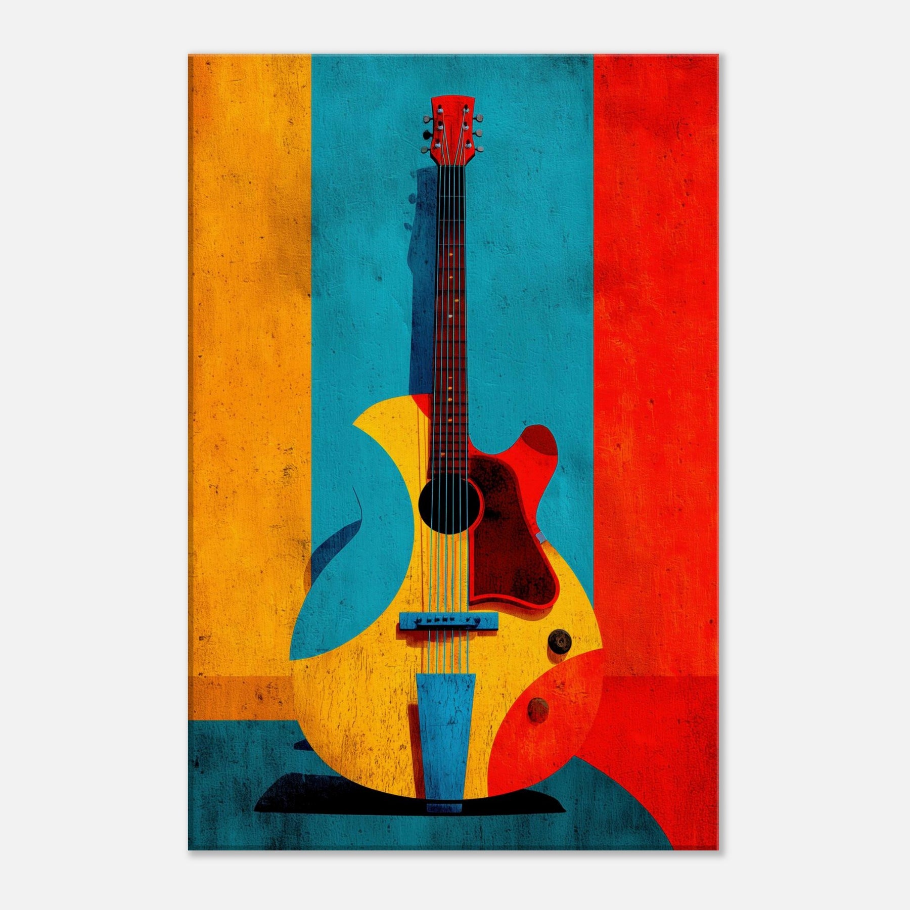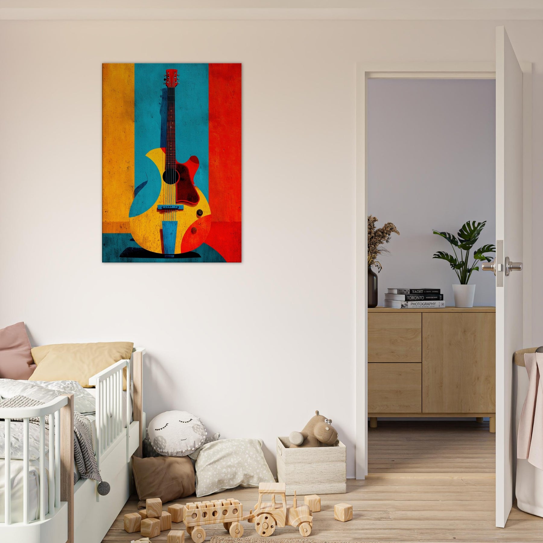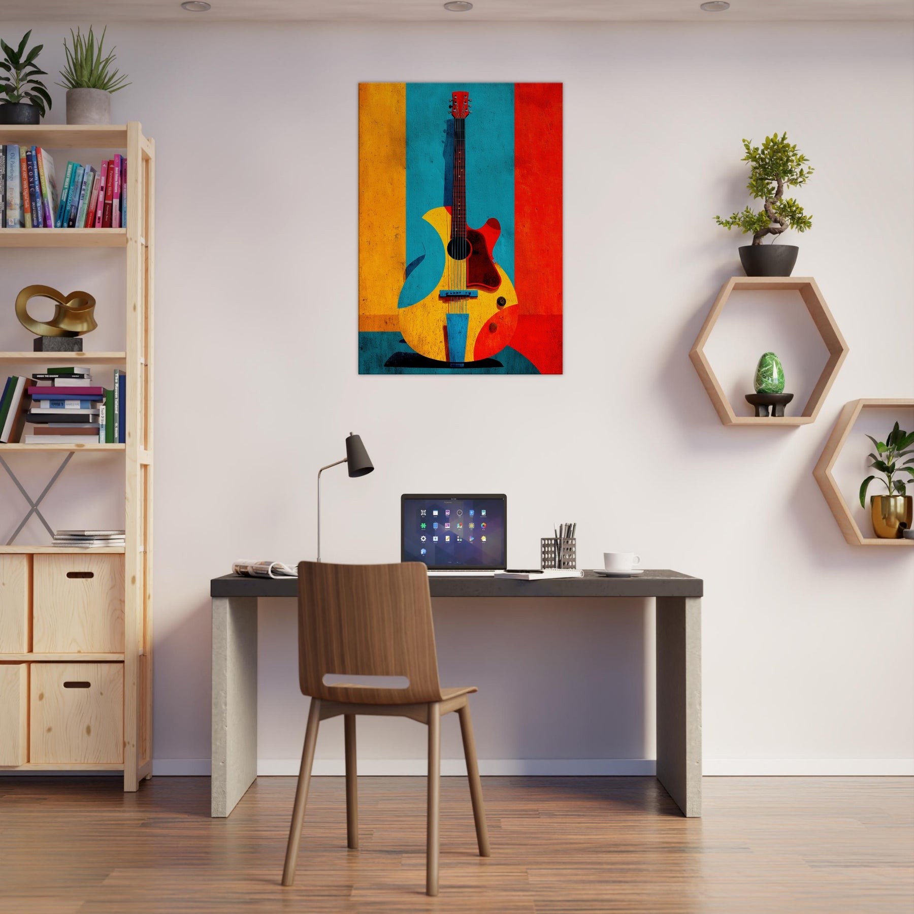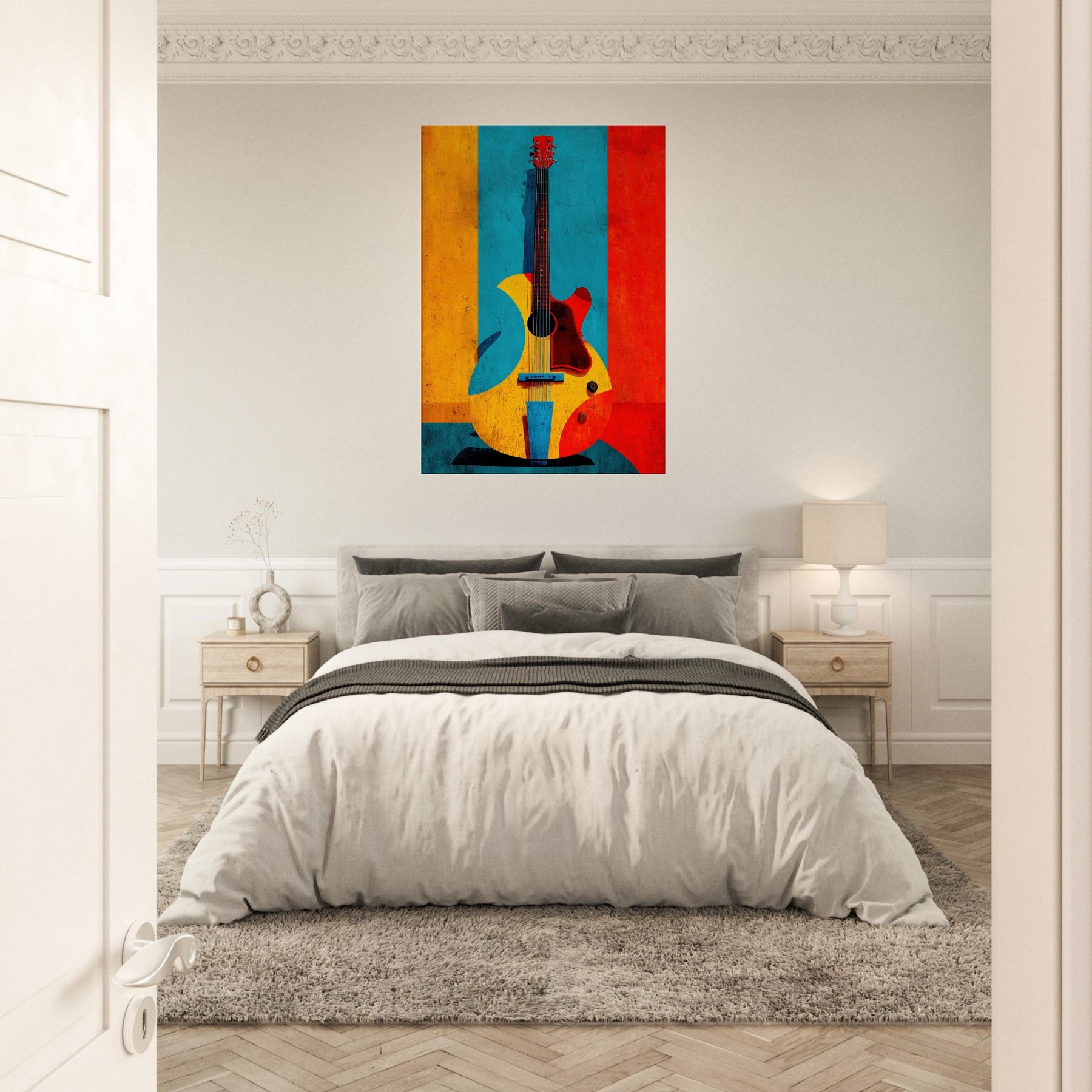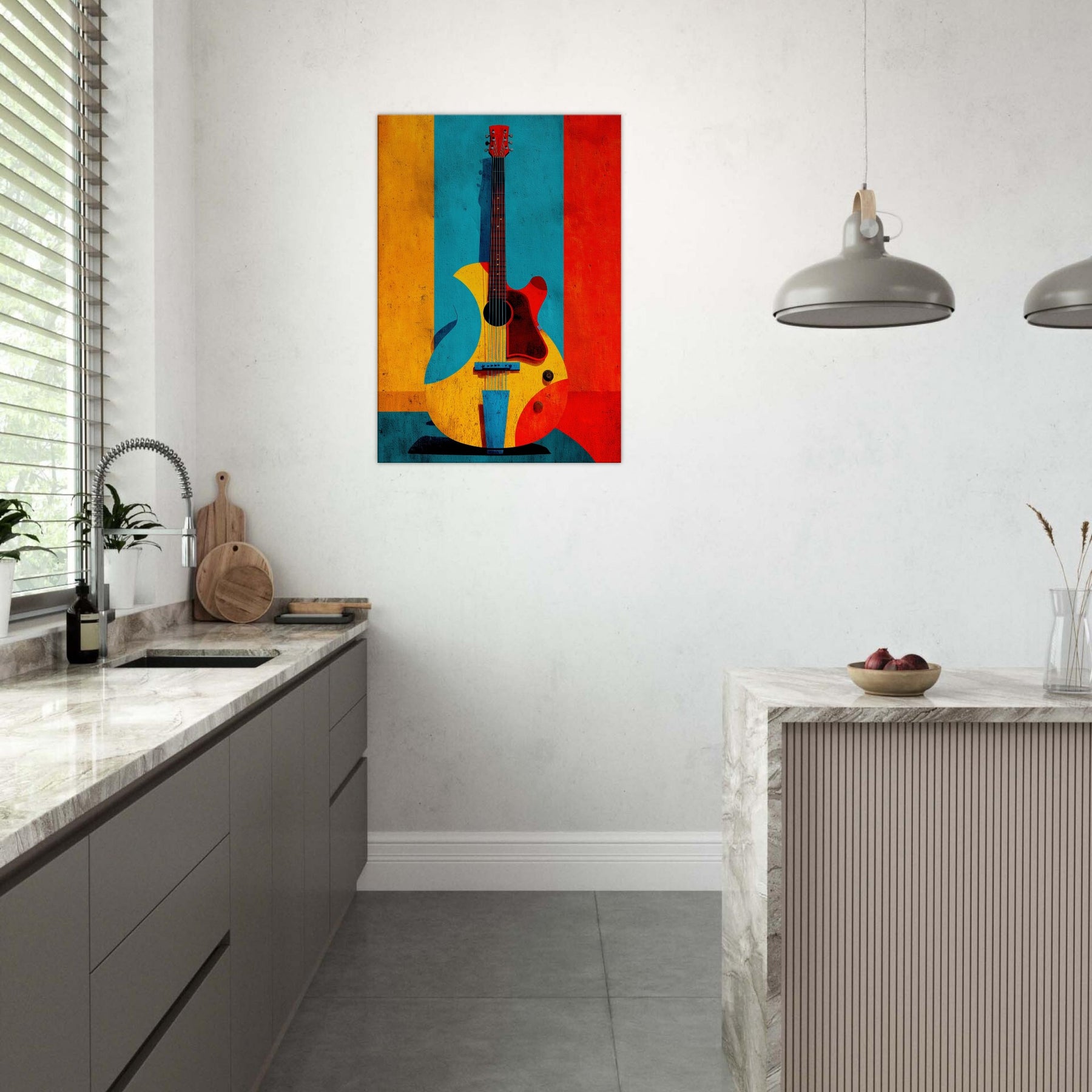An electric silhouette leans into a field of color, letting the guitar breathe as a pulse of possibility. This abstract study folds amber, teal, and scarlet into a musical cityscape, inviting atmosphere and movement into your living room. Each brush of hue and negative space suggests rhythm, warmth, and an intimate soundtrack for daily mornings and midnight reflections. Hang it where you want conversation to hum and style to serenade the space, transforming walls into a gallery of mood and memory.