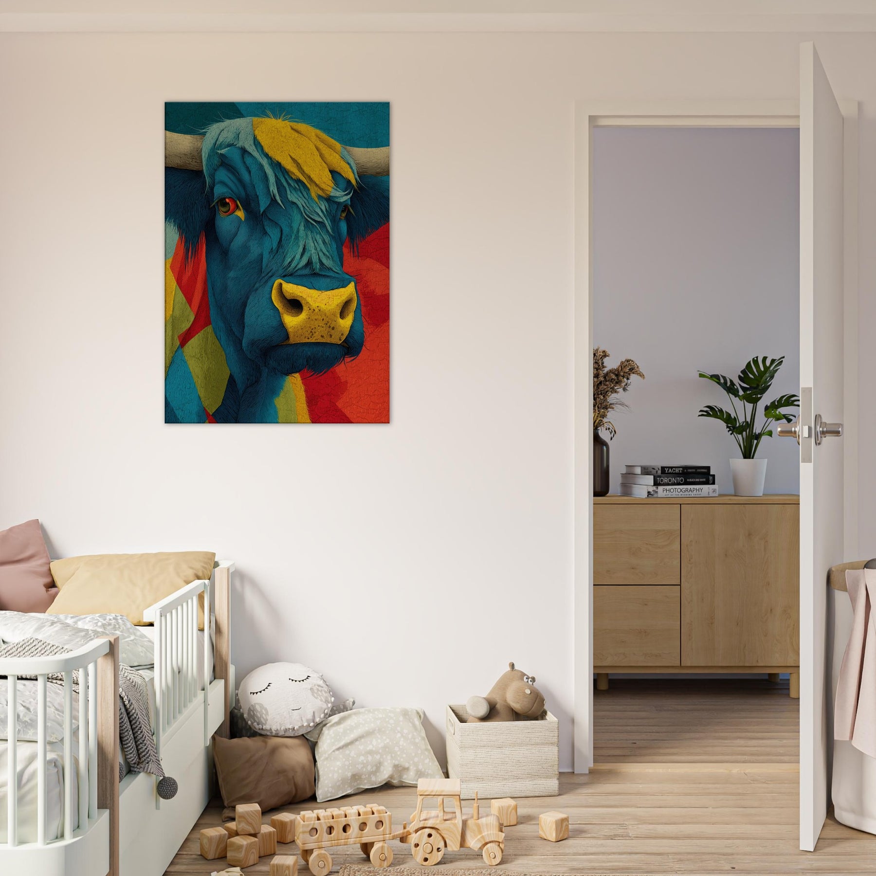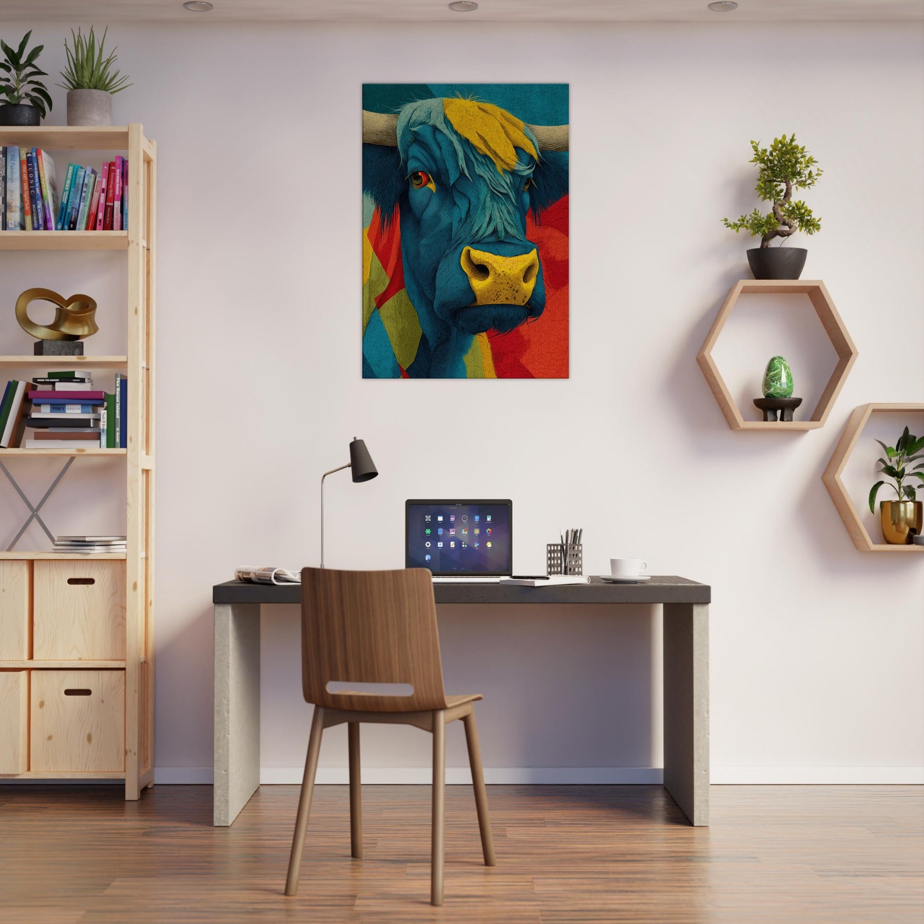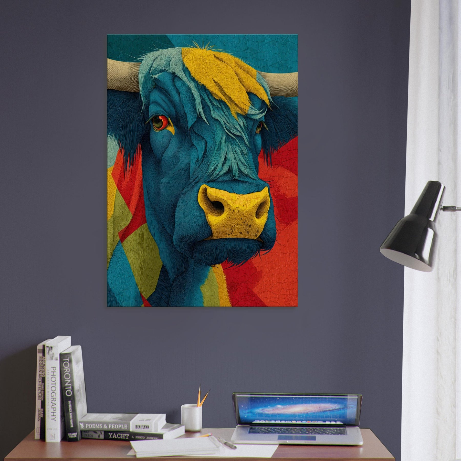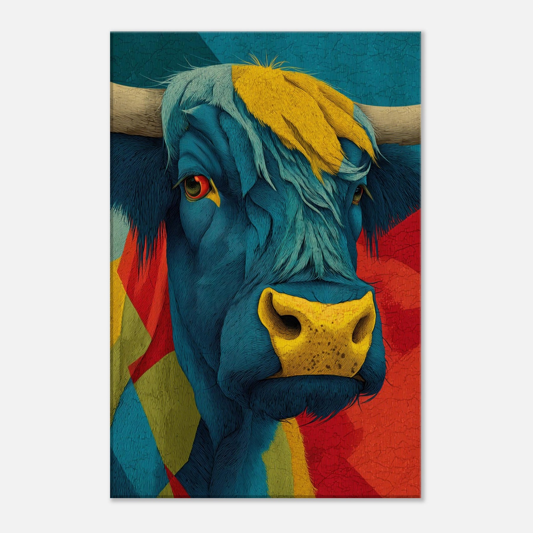 Let this vibrant become the heartbeat of your living space a Highland Cow rendered in electric blues, sunlit yellows, and bold reds. Layered textures and flowing lines capture the animal's presence with a playful, painterly energy, while a warm, sun kissed muzzle draws the eye. The piece radiates contemporary charm and rustic warmth, softening urban interiors and elevating calm corners with character and whimsy. Hang it above a sofa or console to spark conversation and invite a mood of adventurous coziness.