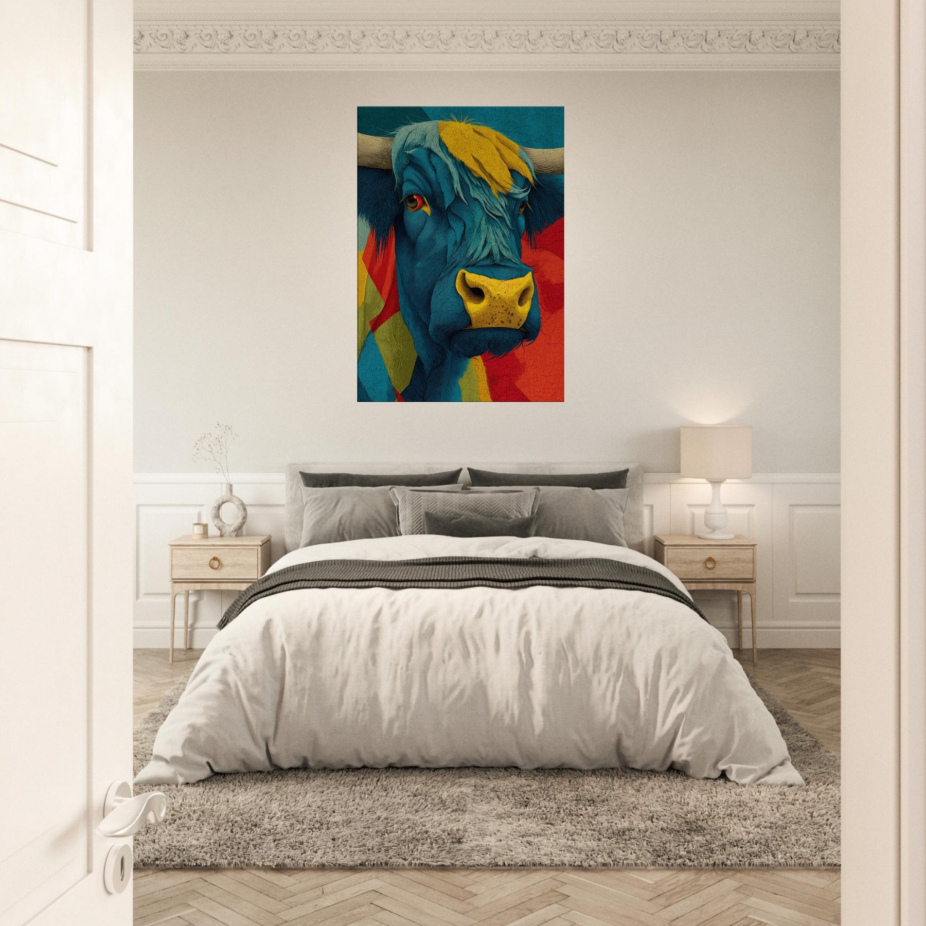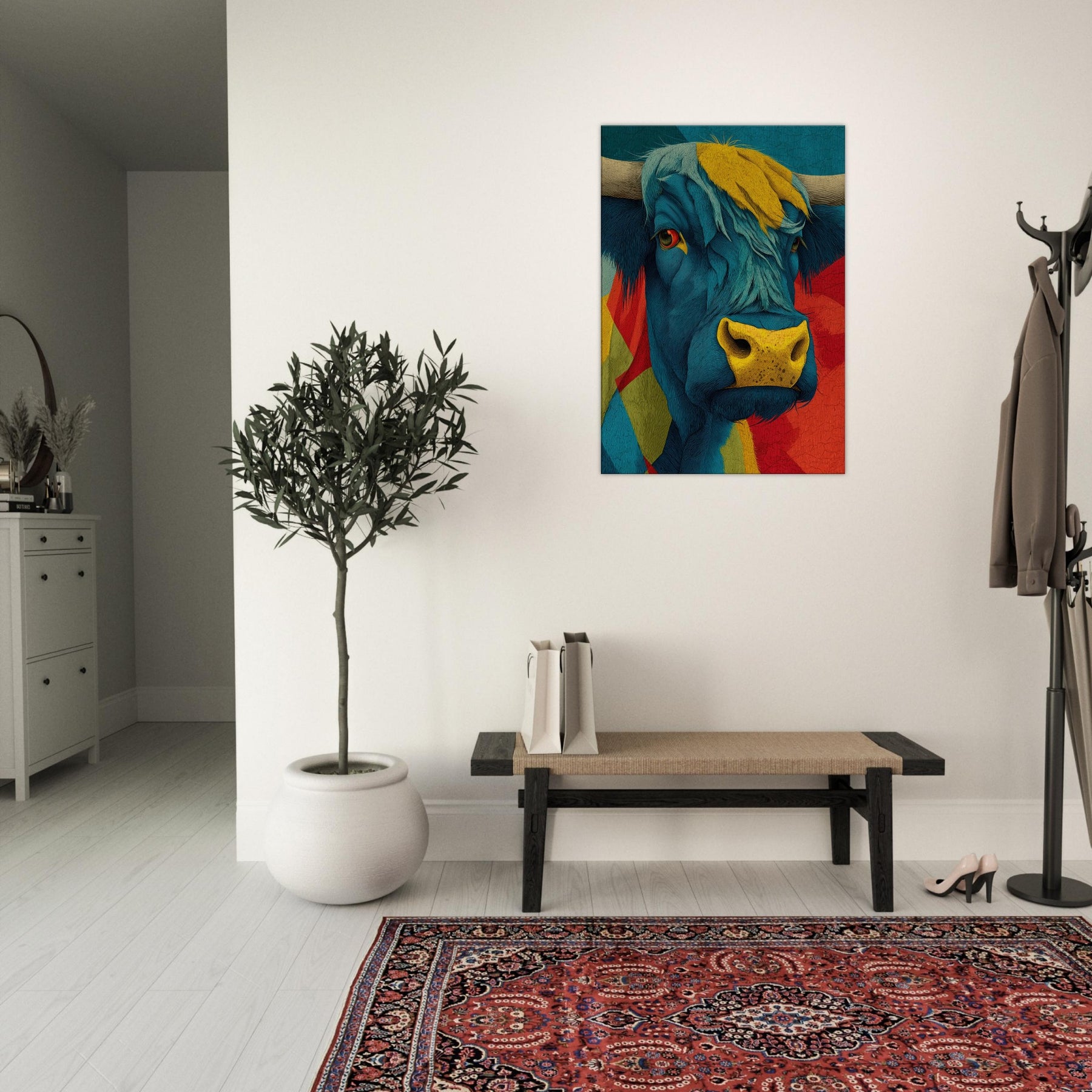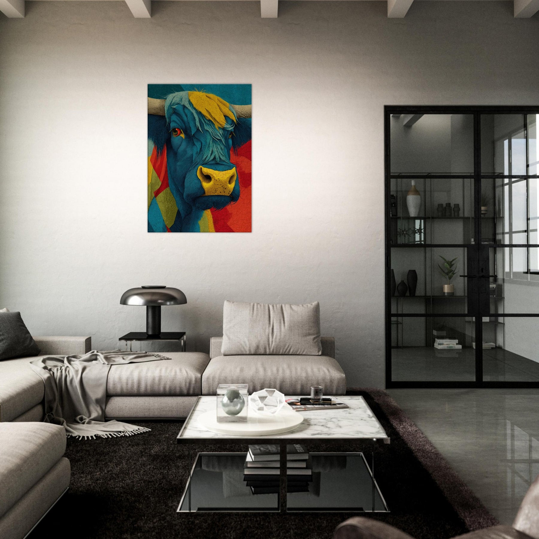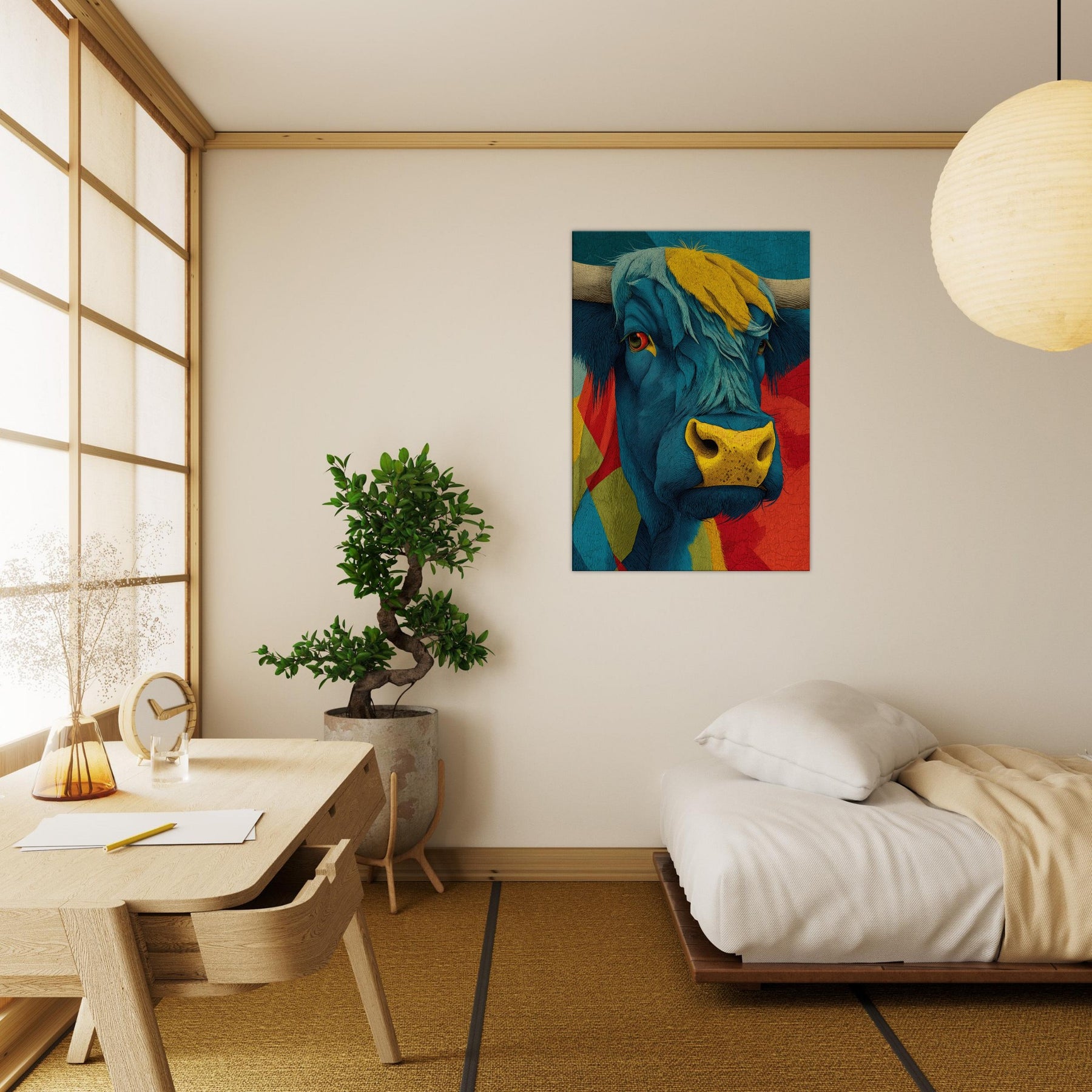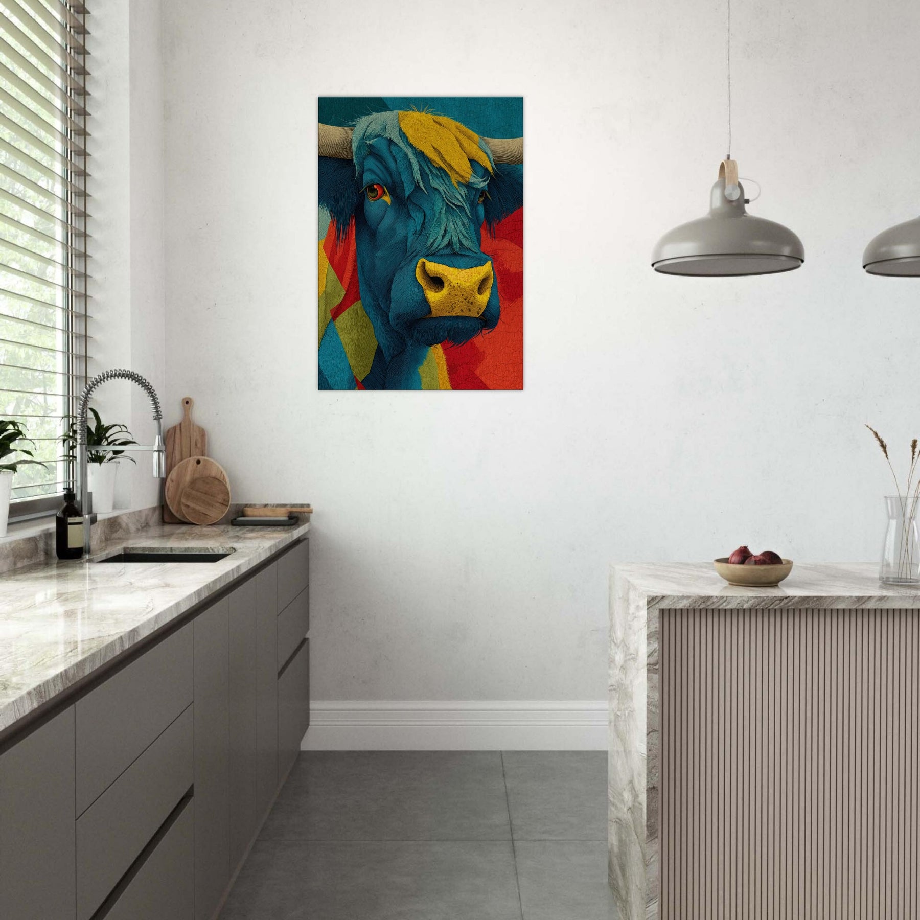 Let this vibrant become the heartbeat of your living space a Highland Cow rendered in electric blues, sunlit yellows, and bold reds. Layered textures and flowing lines capture the animal's presence with a playful, painterly energy, while a warm, sun kissed muzzle draws the eye. The piece radiates contemporary charm and rustic warmth, softening urban interiors and elevating calm corners with character and whimsy. Hang it above a sofa or console to spark conversation and invite a mood of adventurous coziness.