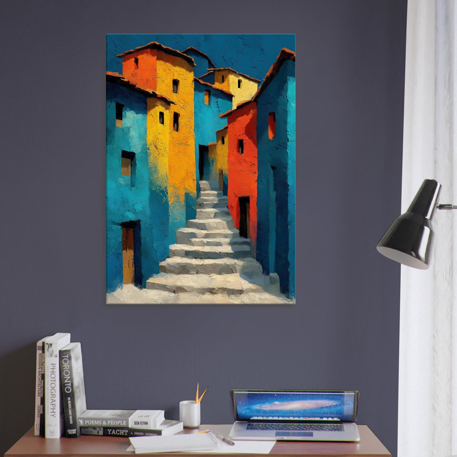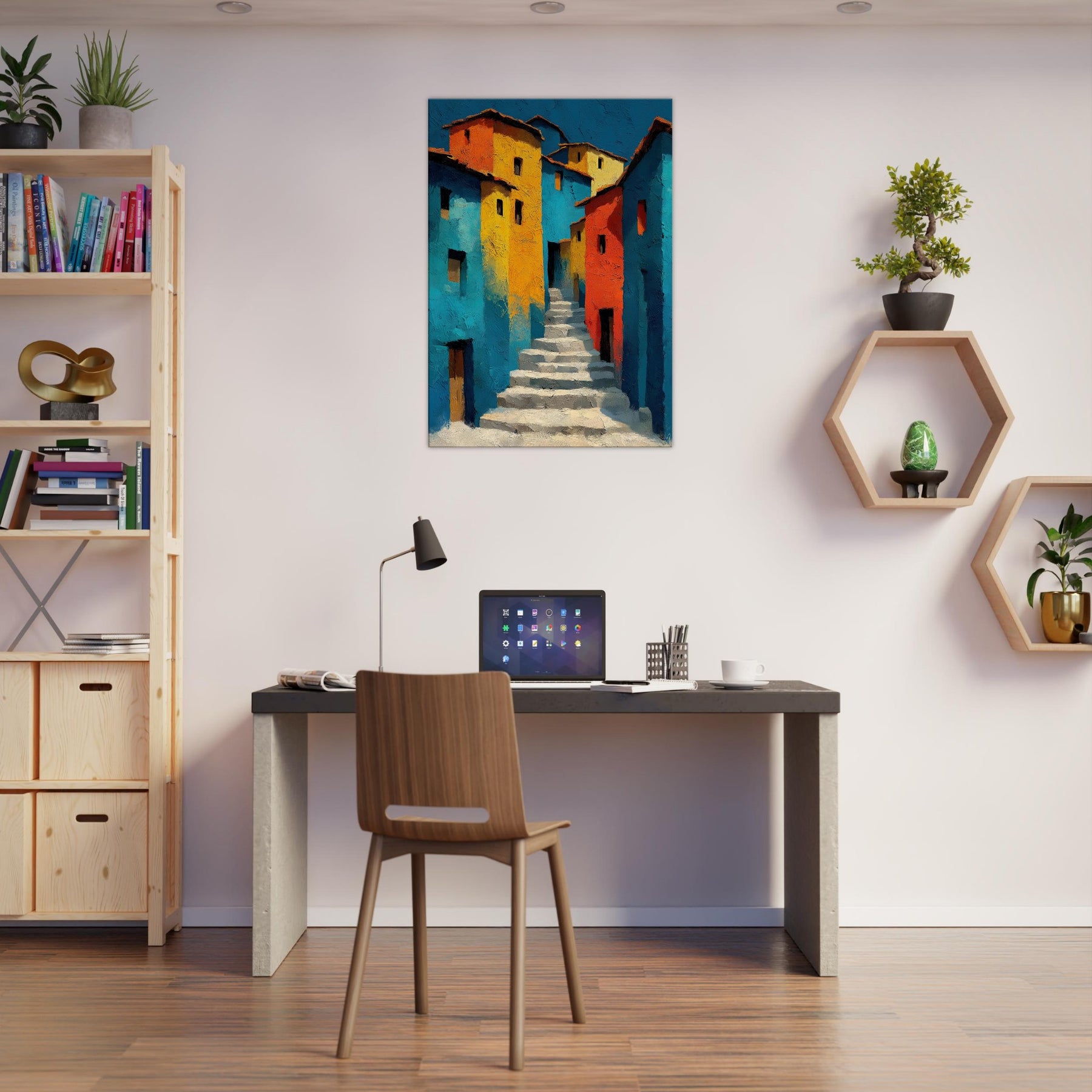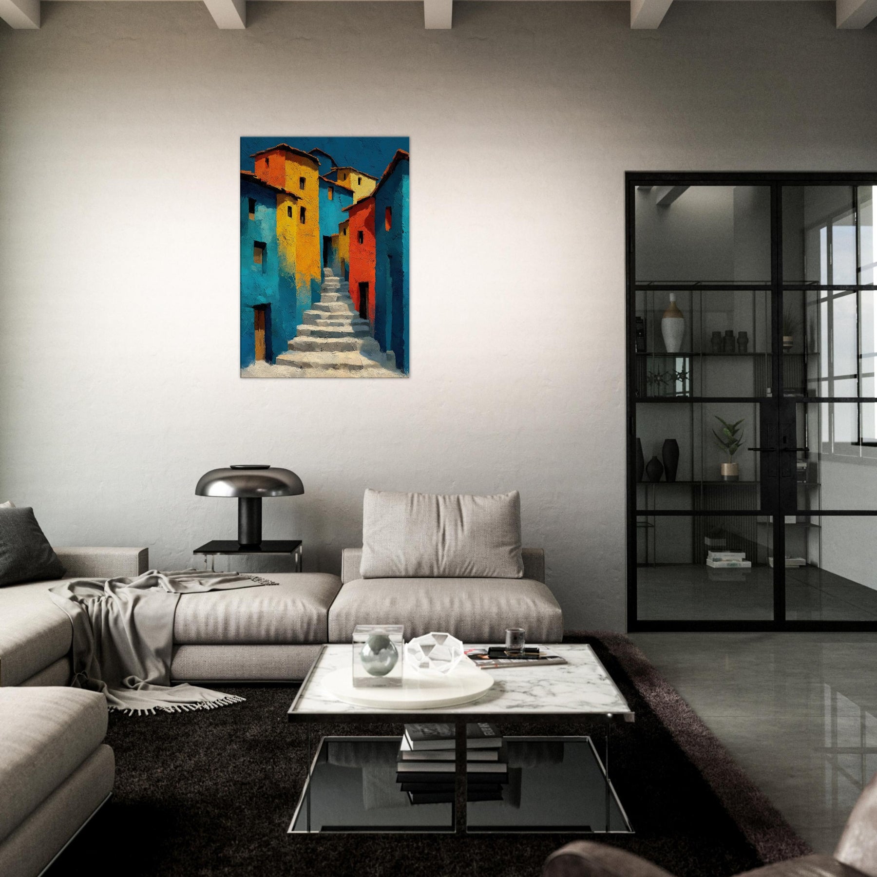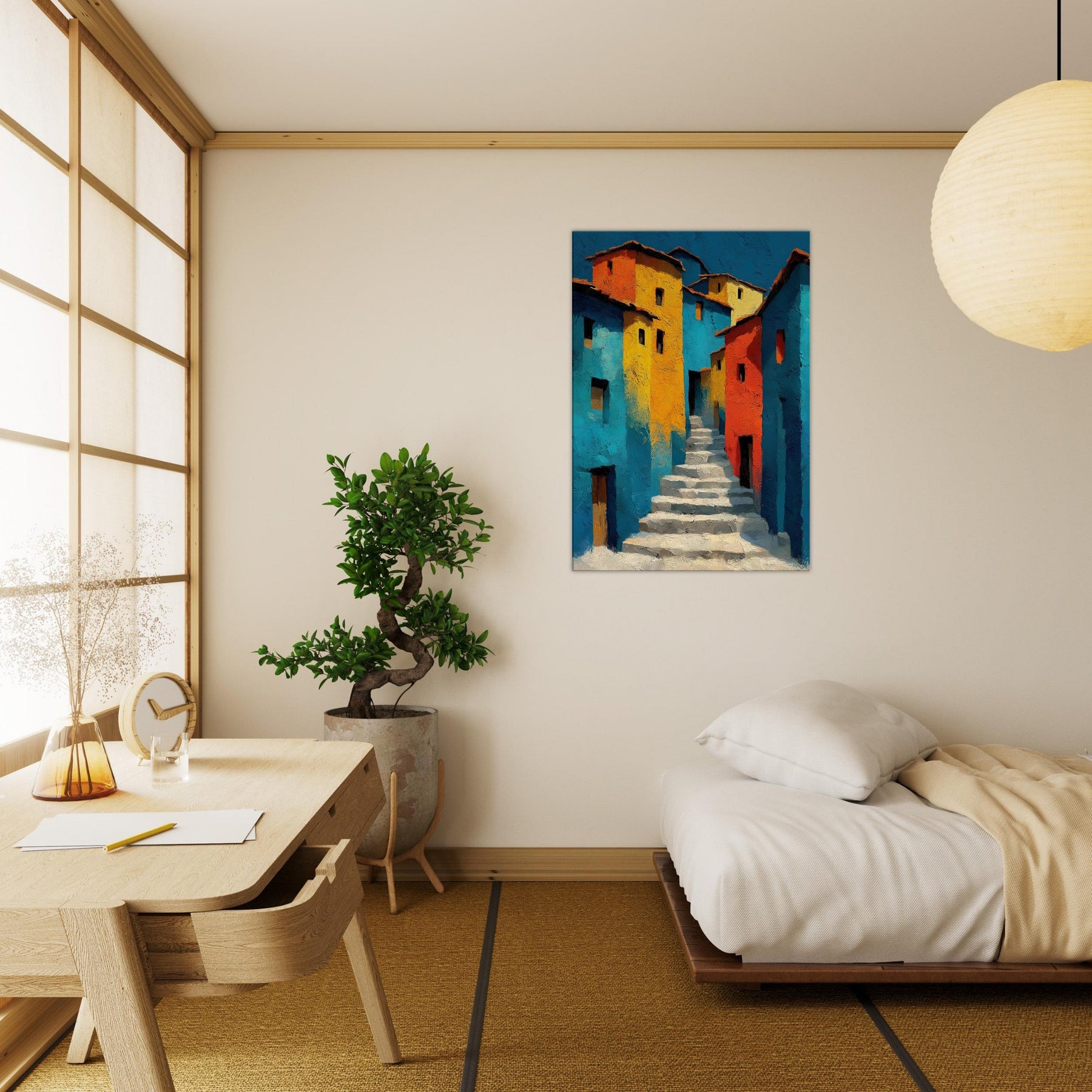 Mountain Village unfolds in a tapestry of bold tones and sweeping geometry, where sunlit windows glow and stairways invite the eye upward. This abstract portrayal captures the intimate drama of a hillside town, turning architectural rhythm into a dance of color and light. The piece adds a pulse of energy to any room perfect above a sofa or in a creative nook encouraging leisurely contemplation and playful seating arrangements. Its warmth and movement immerse the viewer in a tranquil, city meets mountain atmosphere.