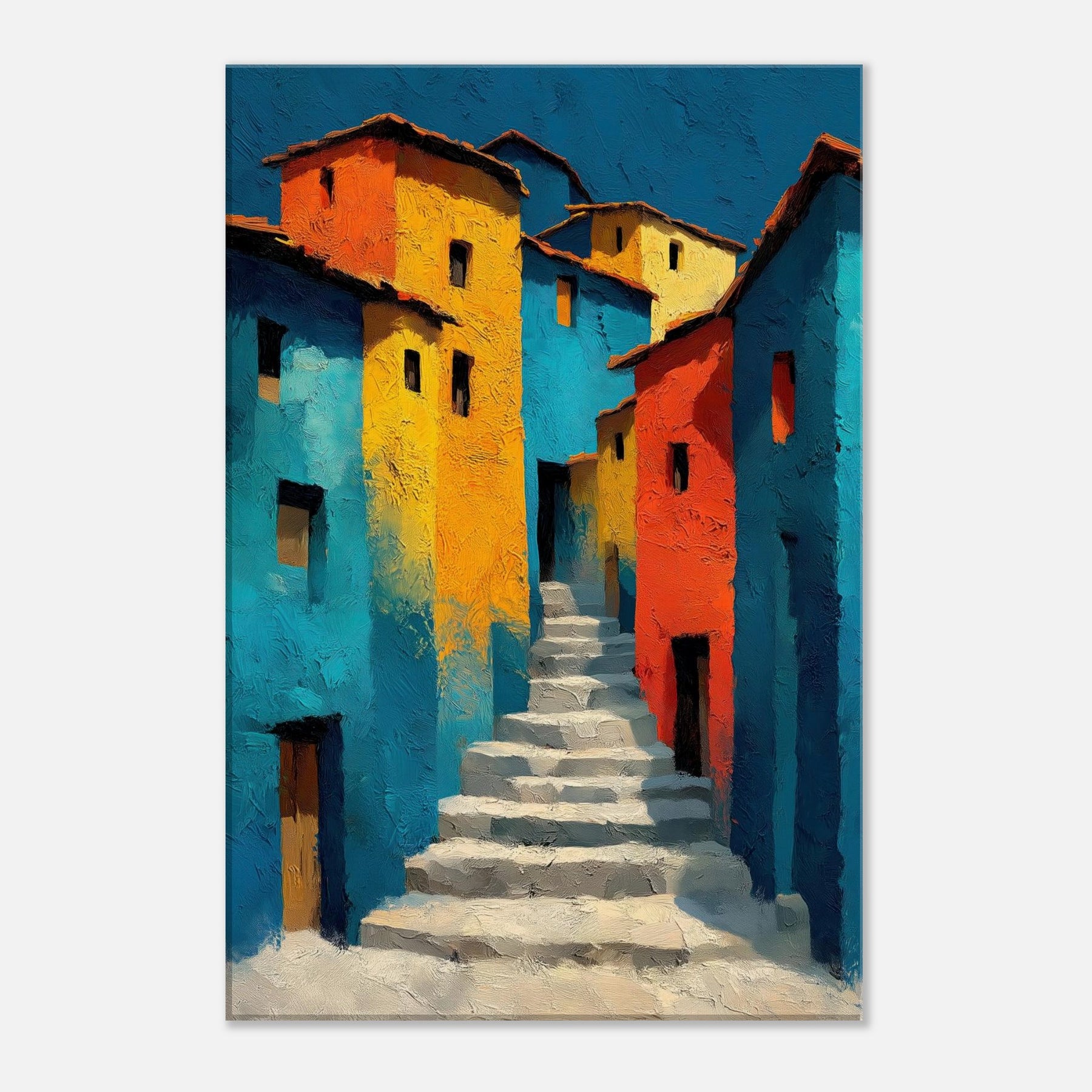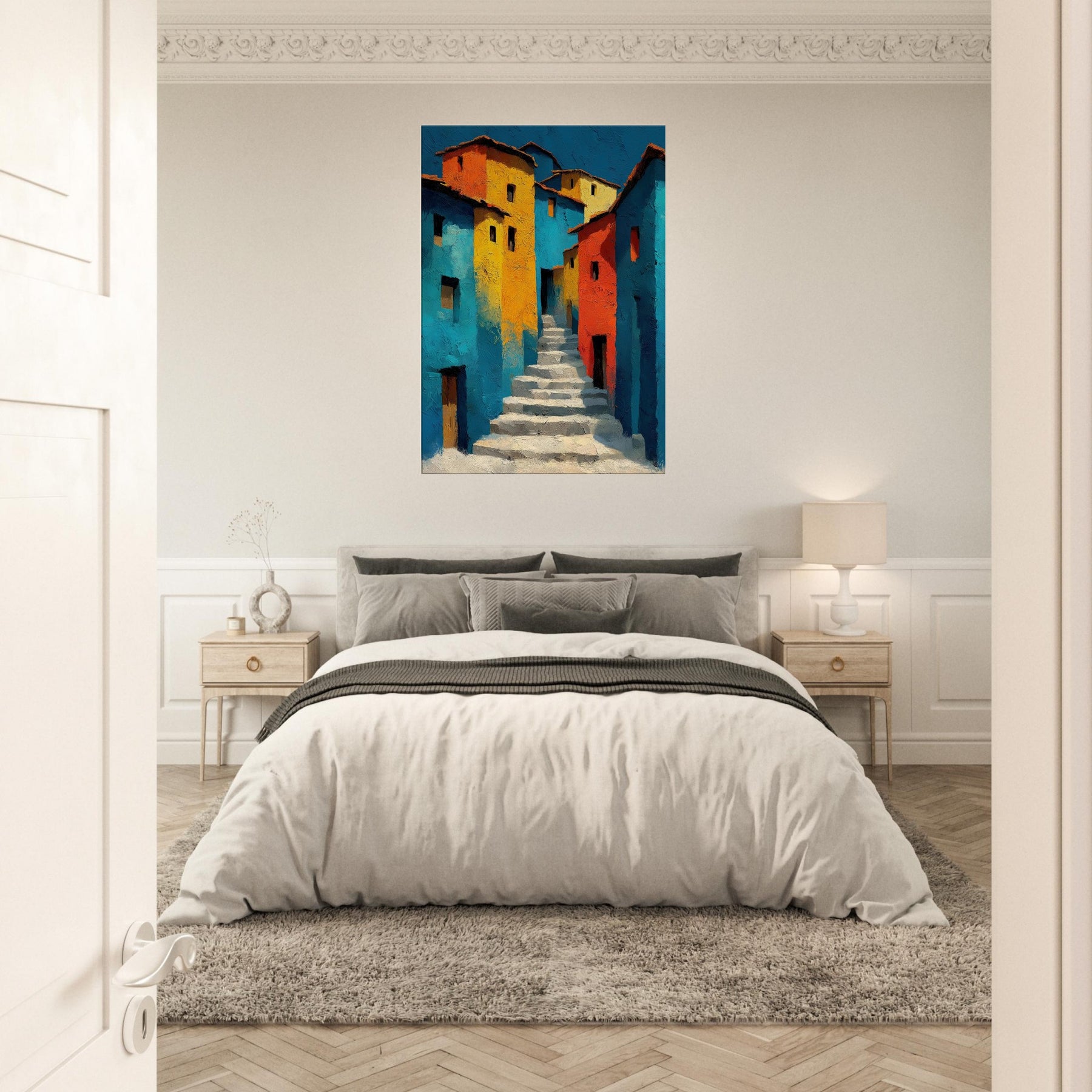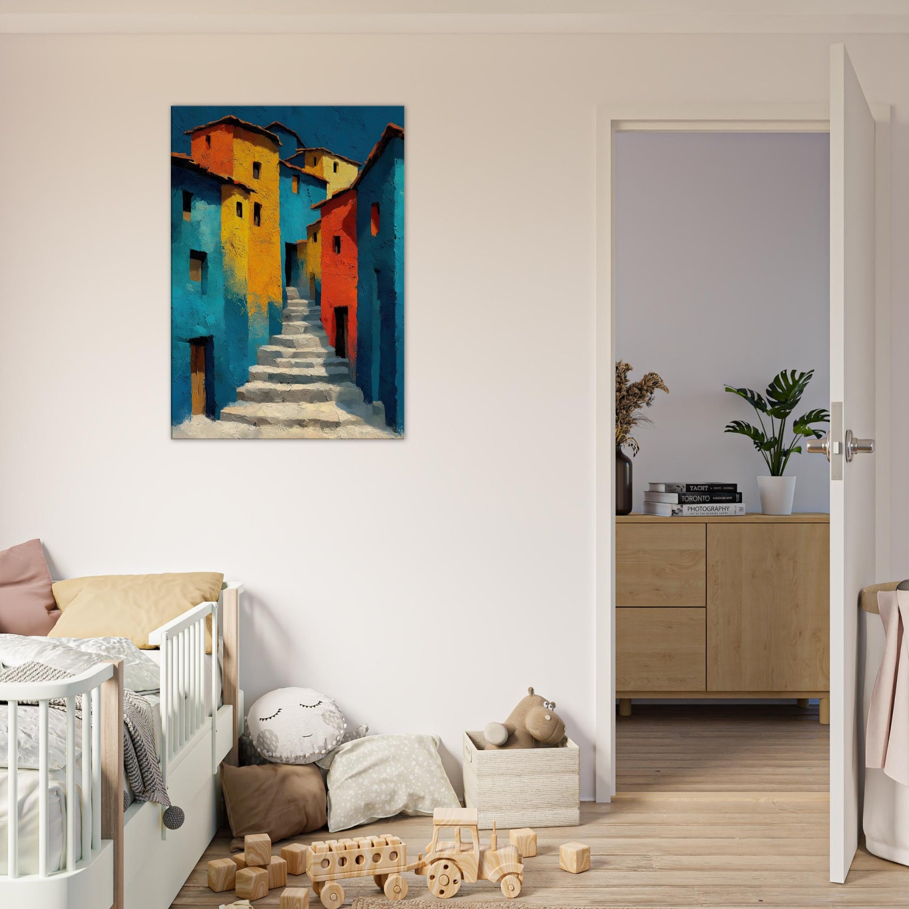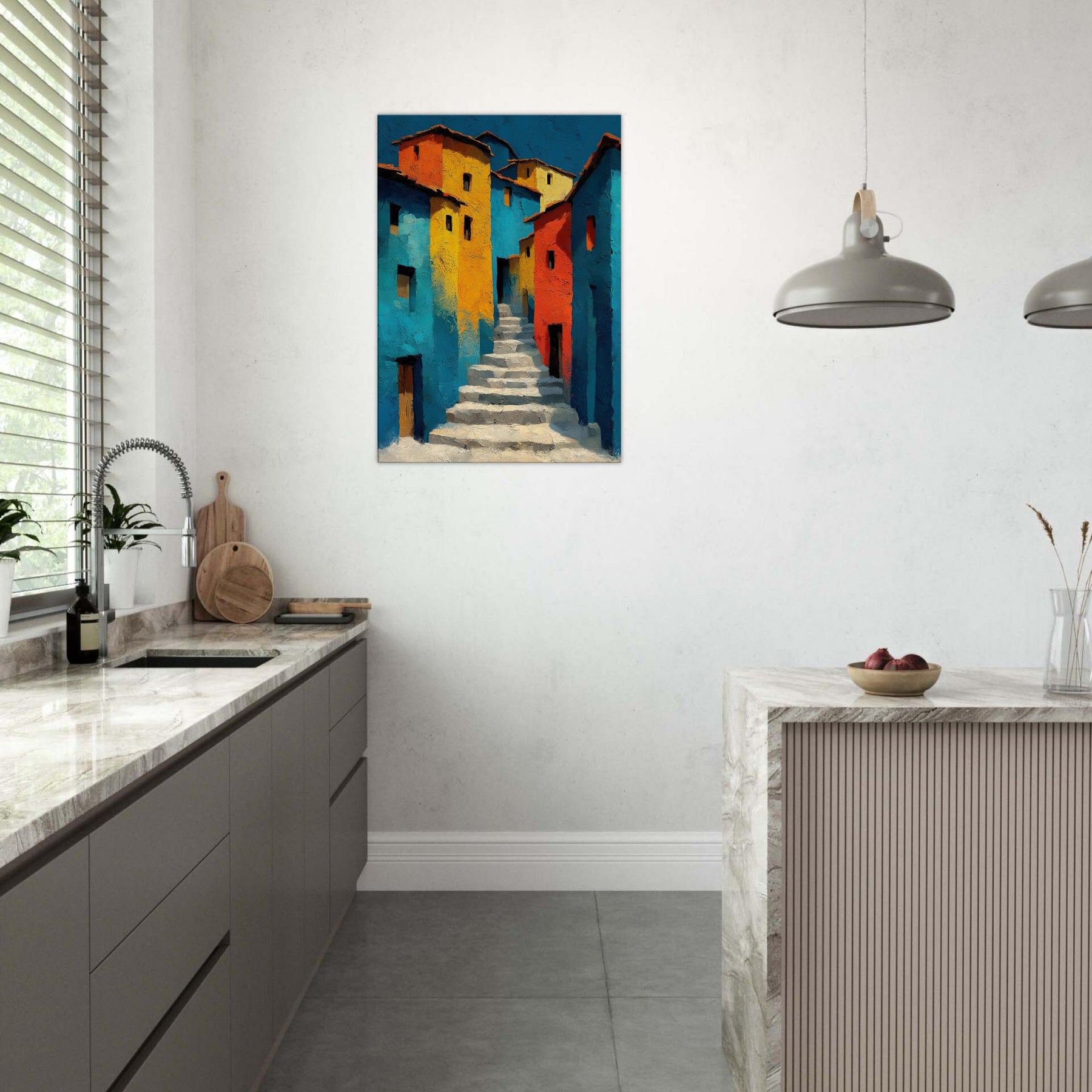 Mountain Village unfolds in a tapestry of bold tones and sweeping geometry, where sunlit windows glow and stairways invite the eye upward. This abstract portrayal captures the intimate drama of a hillside town, turning architectural rhythm into a dance of color and light. The piece adds a pulse of energy to any room perfect above a sofa or in a creative nook encouraging leisurely contemplation and playful seating arrangements. Its warmth and movement immerse the viewer in a tranquil, city meets mountain atmosphere.