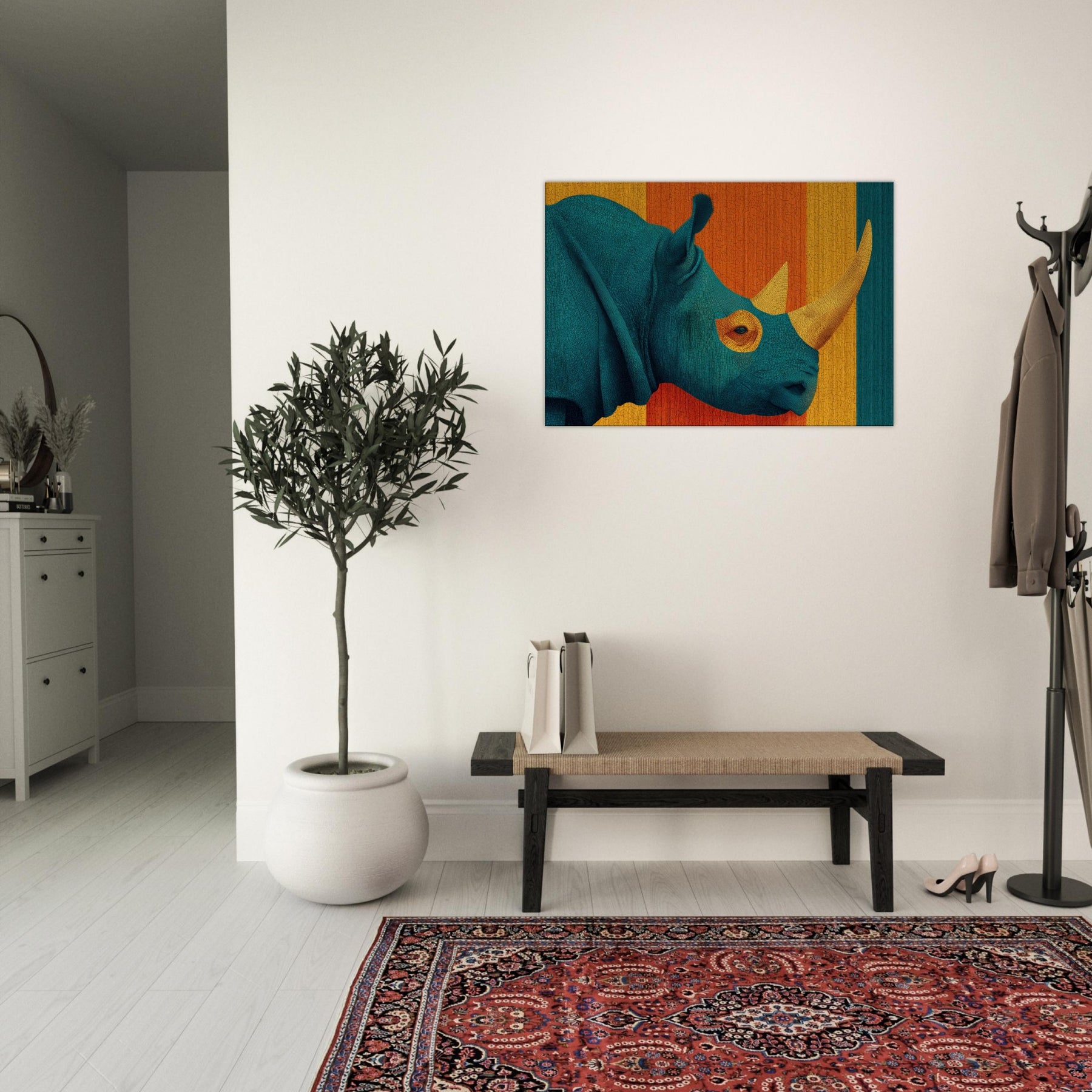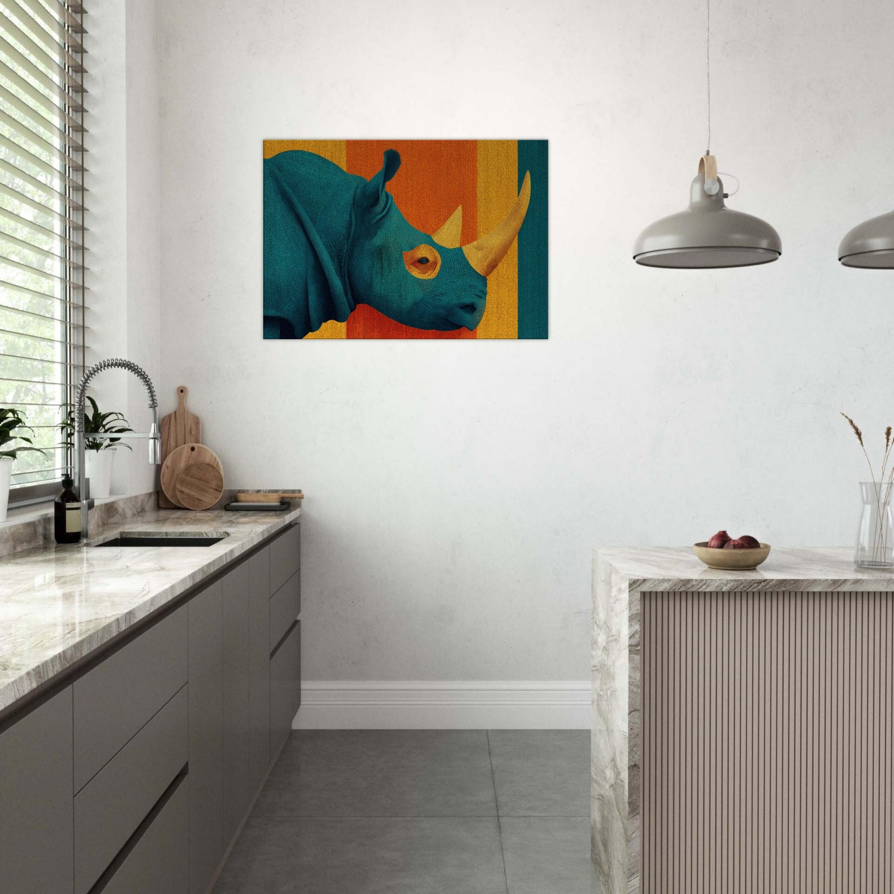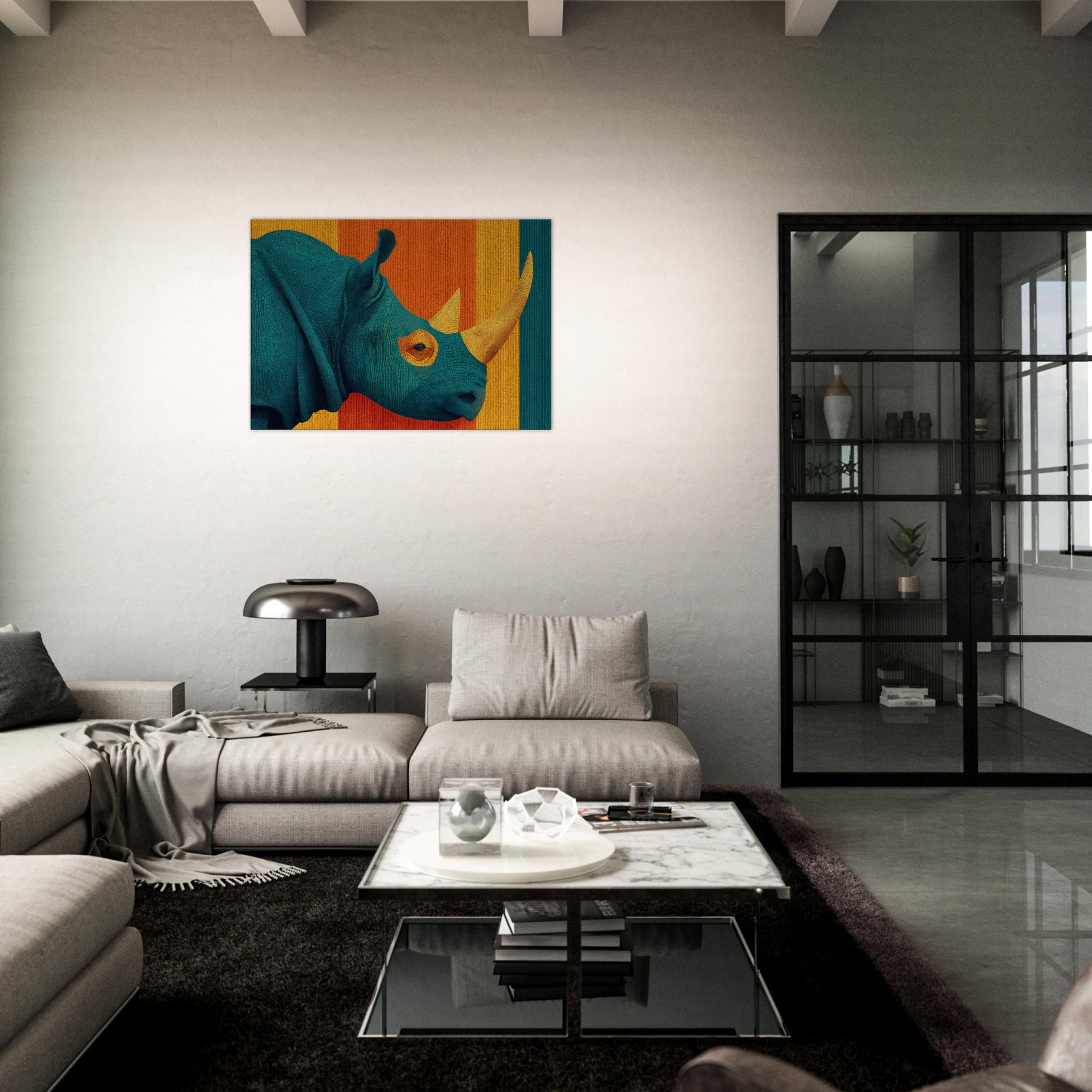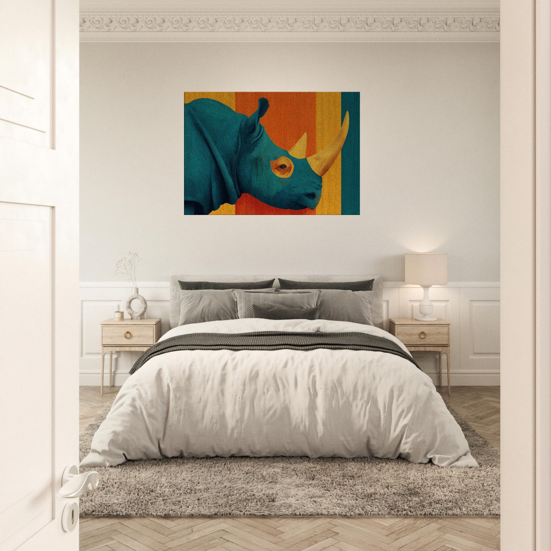 Rhinoceros stands alight in a mosaic of color, where teal shadows angle against warm fields of orange and gold. This abstract composition invites the eye to wander the creature's textured skin and sweeping horn, creating a living room moment that feels both primal and refined. A centerpiece that hums with atmosphere, it transforms walls into a gallery of mood, calm yet charged, sculptural yet soft, the perfect companion for lounges, bedrooms, and studios seeking bold restraint and lush, tactile depth.