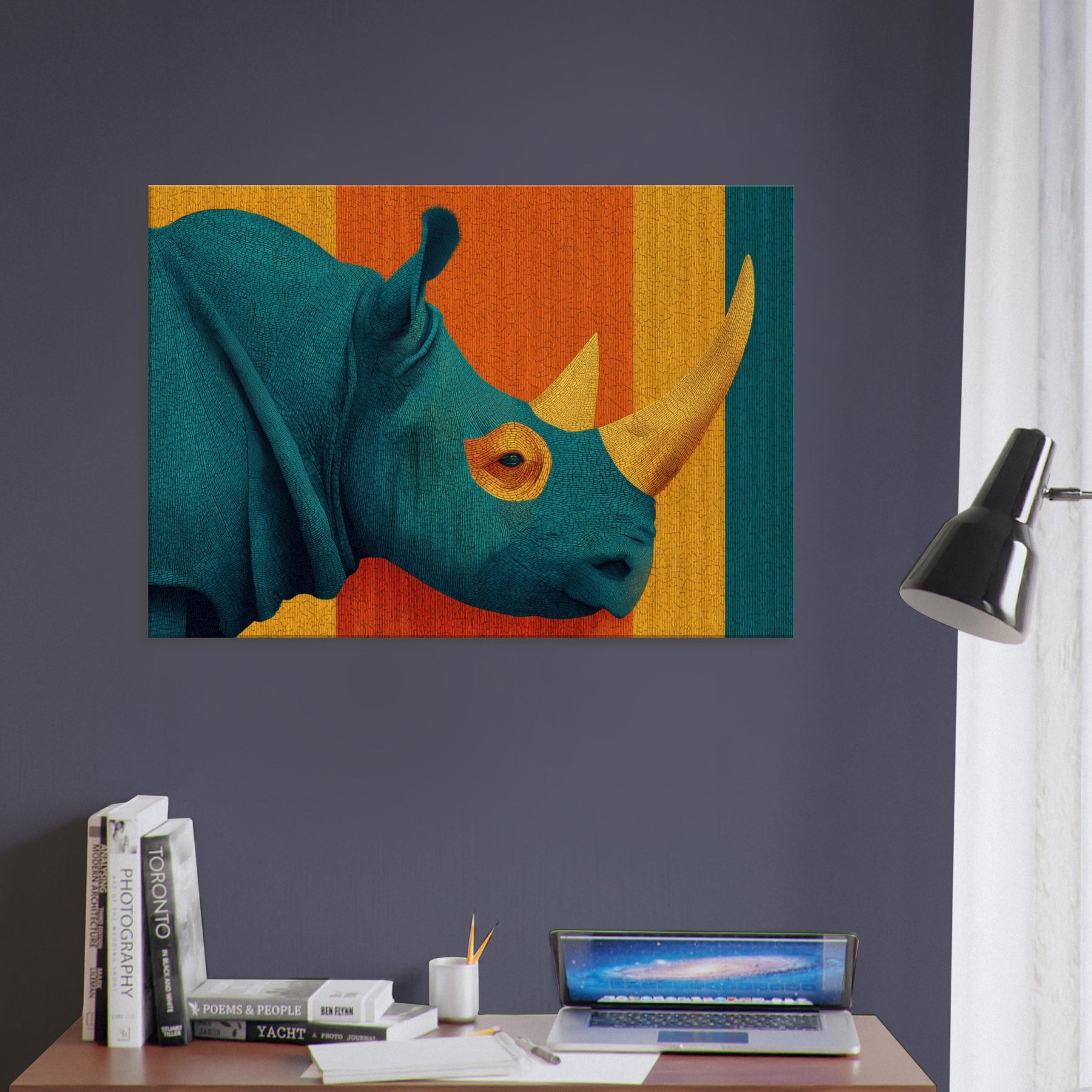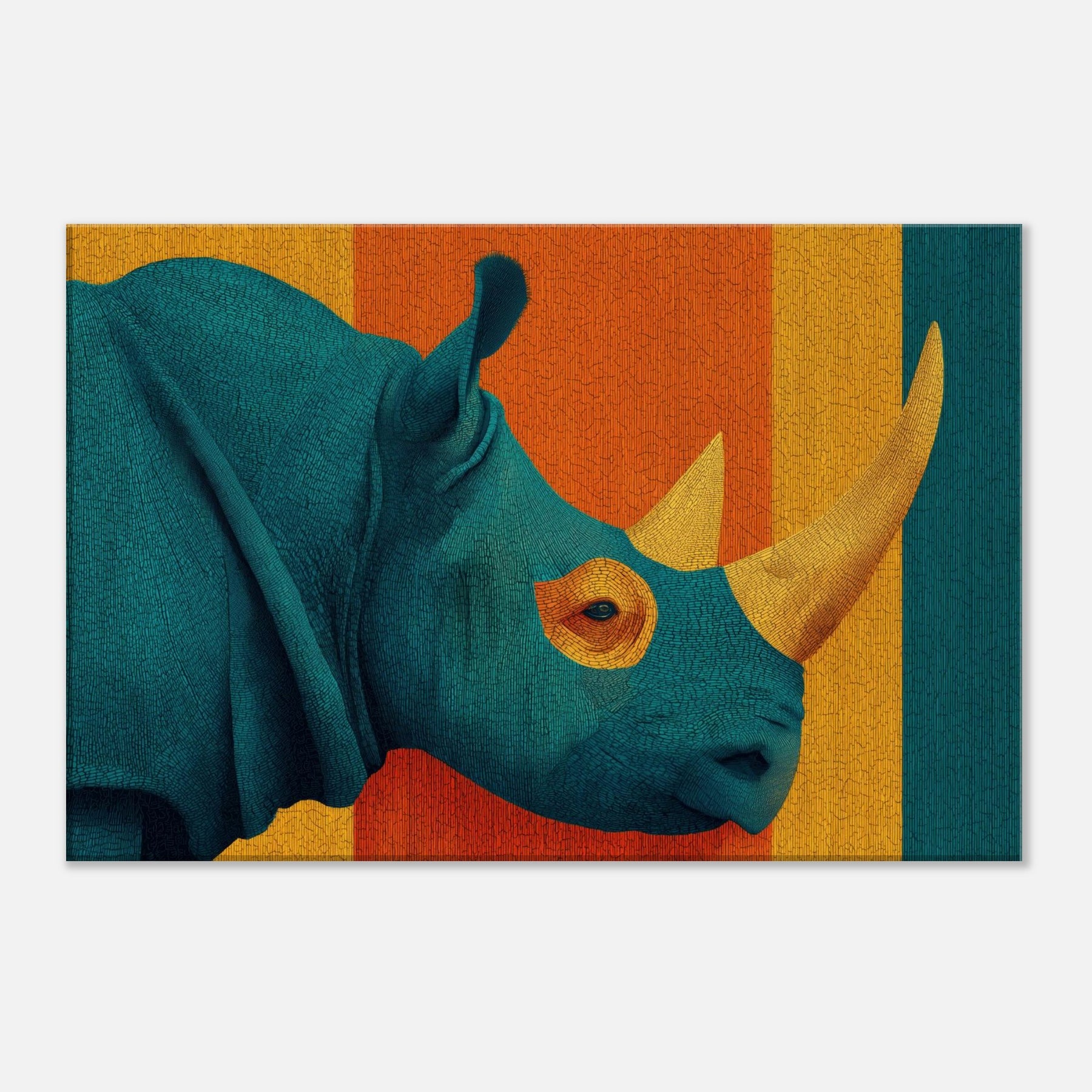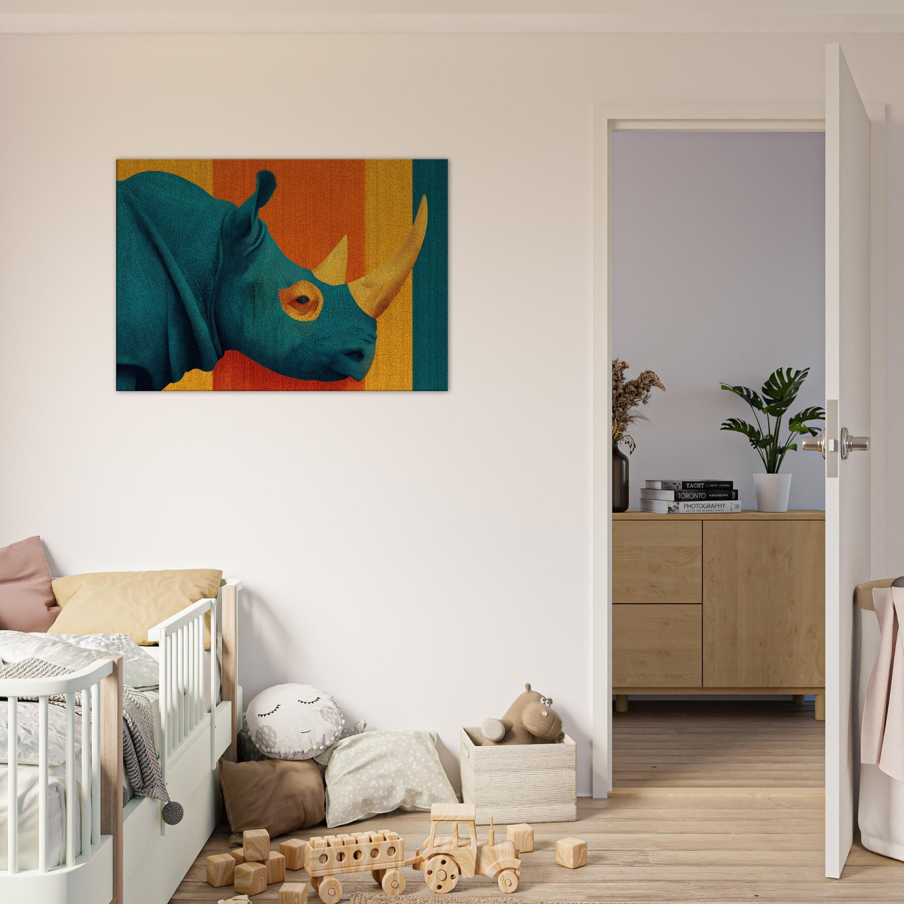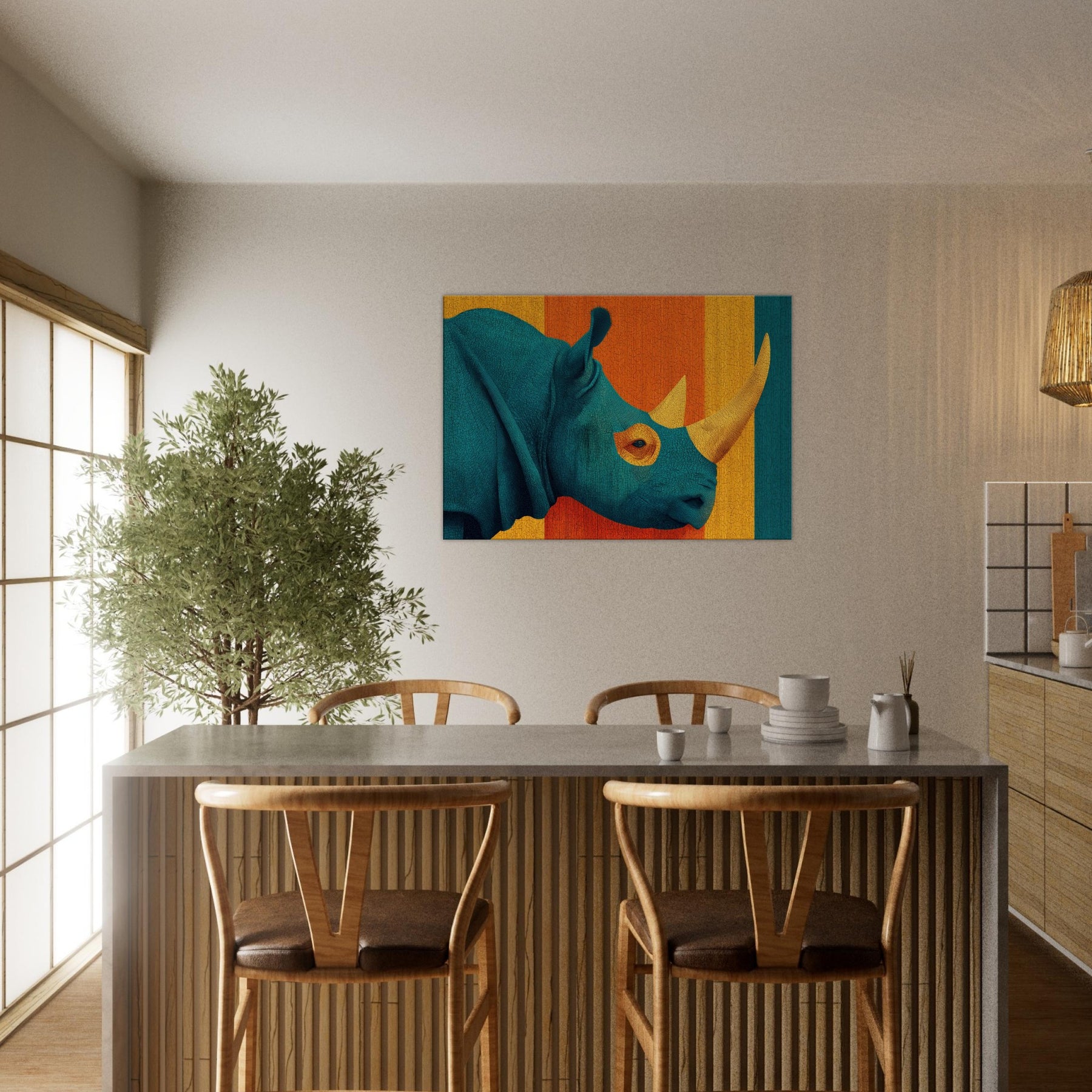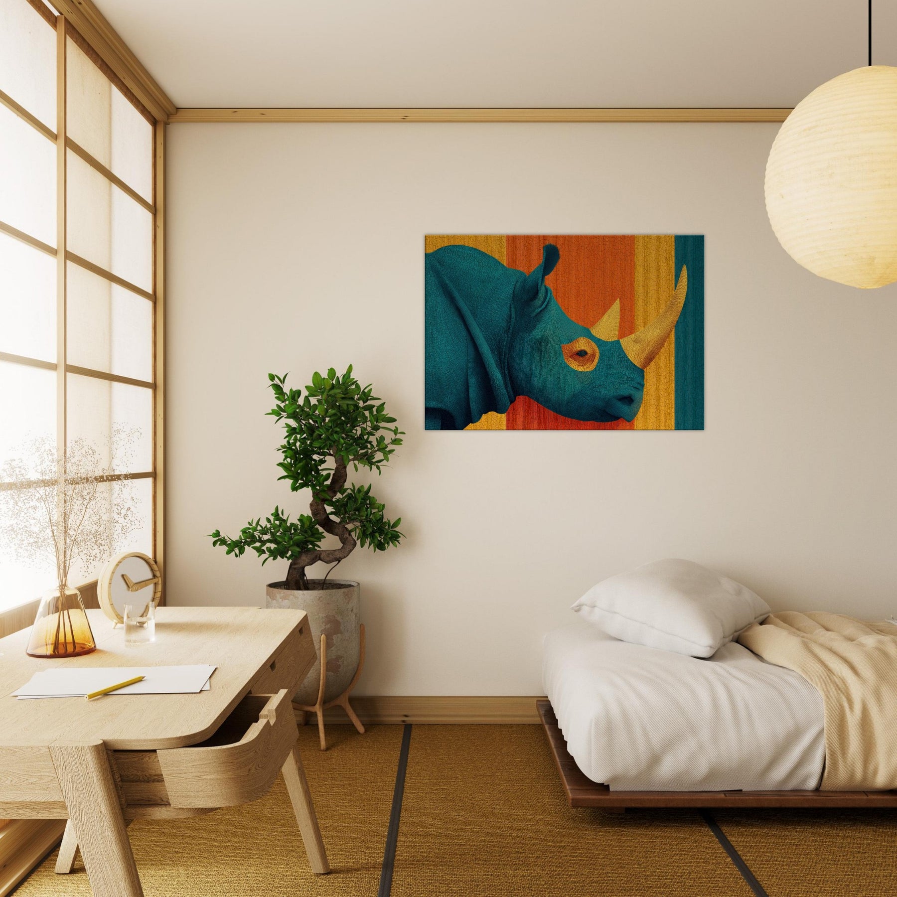Rhinoceros stands alight in a mosaic of color, where teal shadows angle against warm fields of orange and gold. This abstract composition invites the eye to wander the creature's textured skin and sweeping horn, creating a living room moment that feels both primal and refined. A centerpiece that hums with atmosphere, it transforms walls into a gallery of mood, calm yet charged, sculptural yet soft, the perfect companion for lounges, bedrooms, and studios seeking bold restraint and lush, tactile depth.