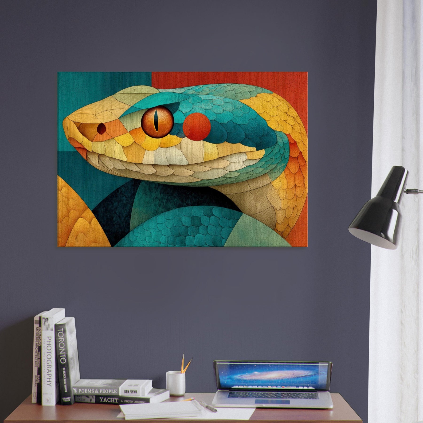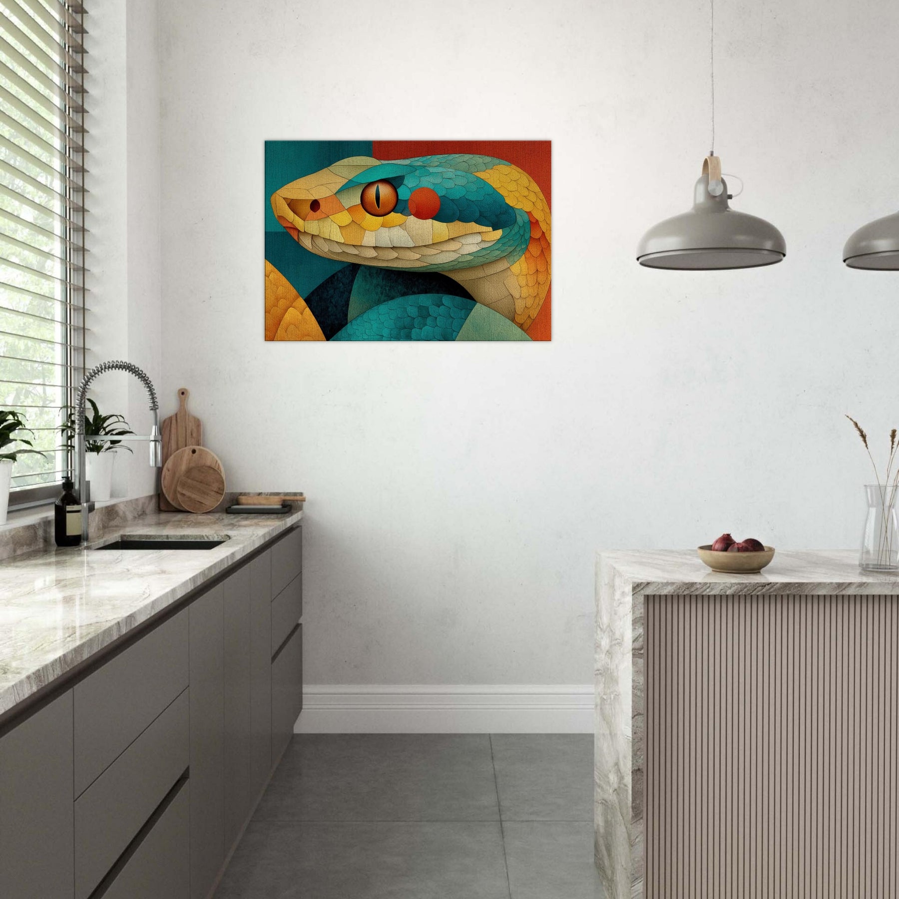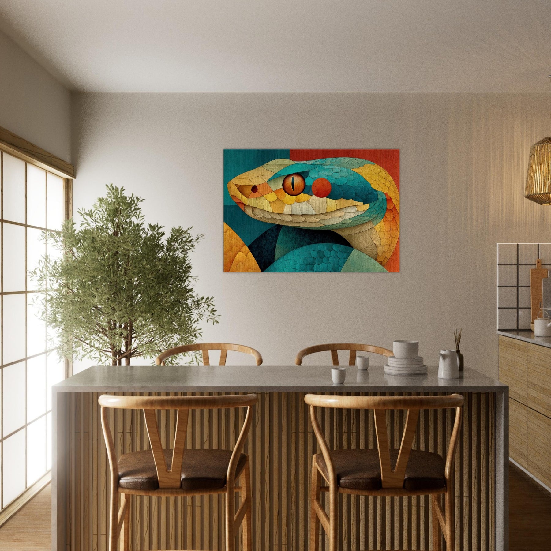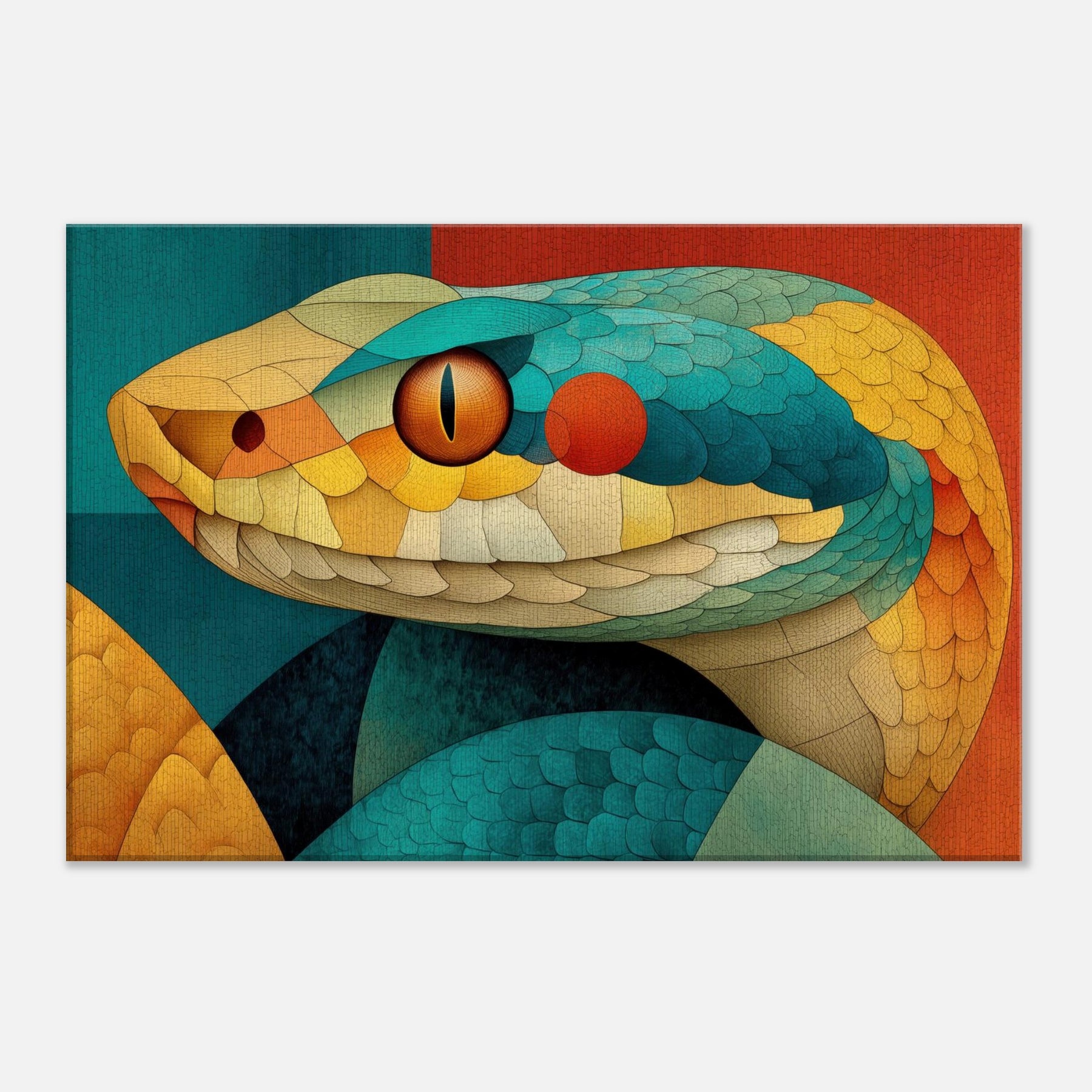 Shot through with sunlit scales of teal, amber, and coral, this Snake coils in a mosaic of texture and motion. The composition radiates a warm, tactile energy like a living sculpture you can almost hear breathing. Hang it to soften a dining nook or anchor a lounge, turning walls into a sensorial horizon where color and curvature seduce the eye and invite lingering, conversation, and a sense of quiet, luxurious wonder.
