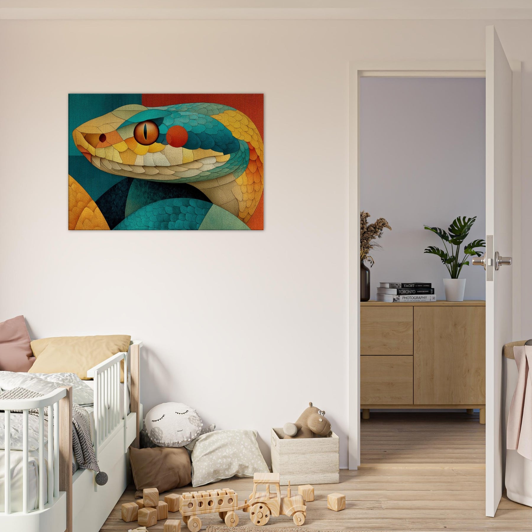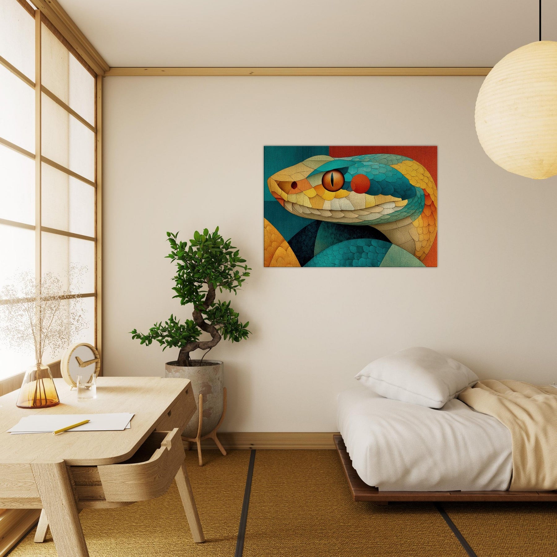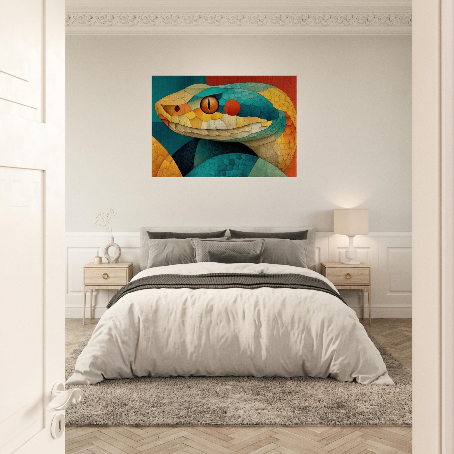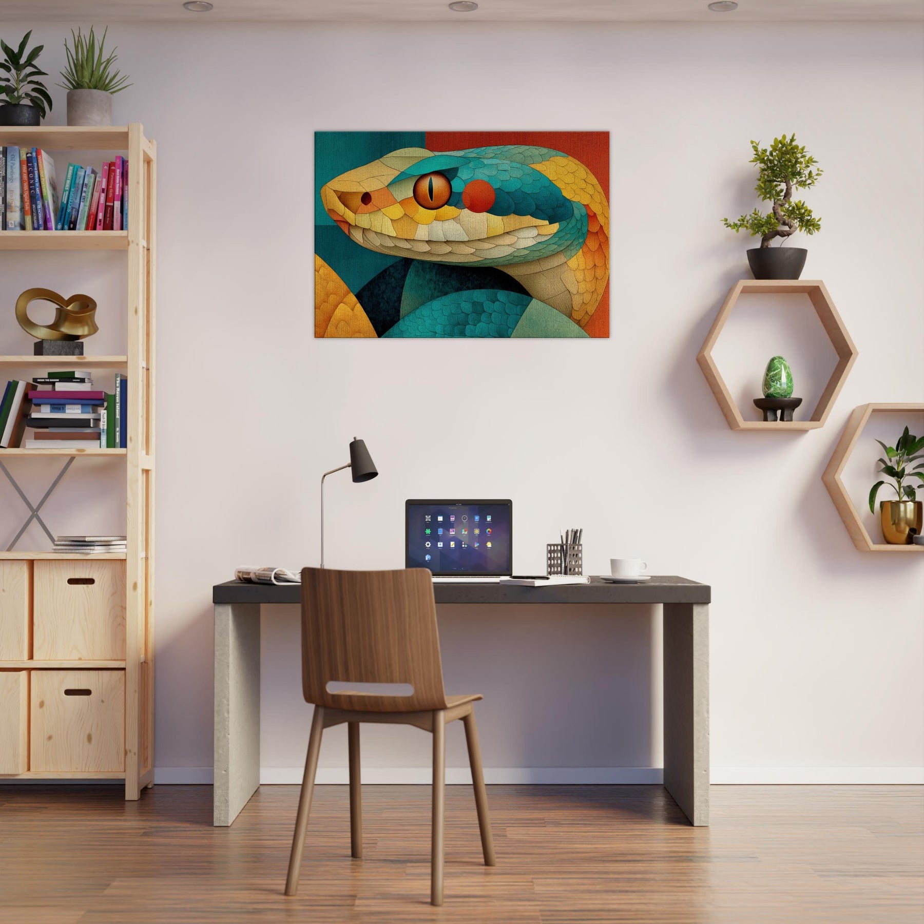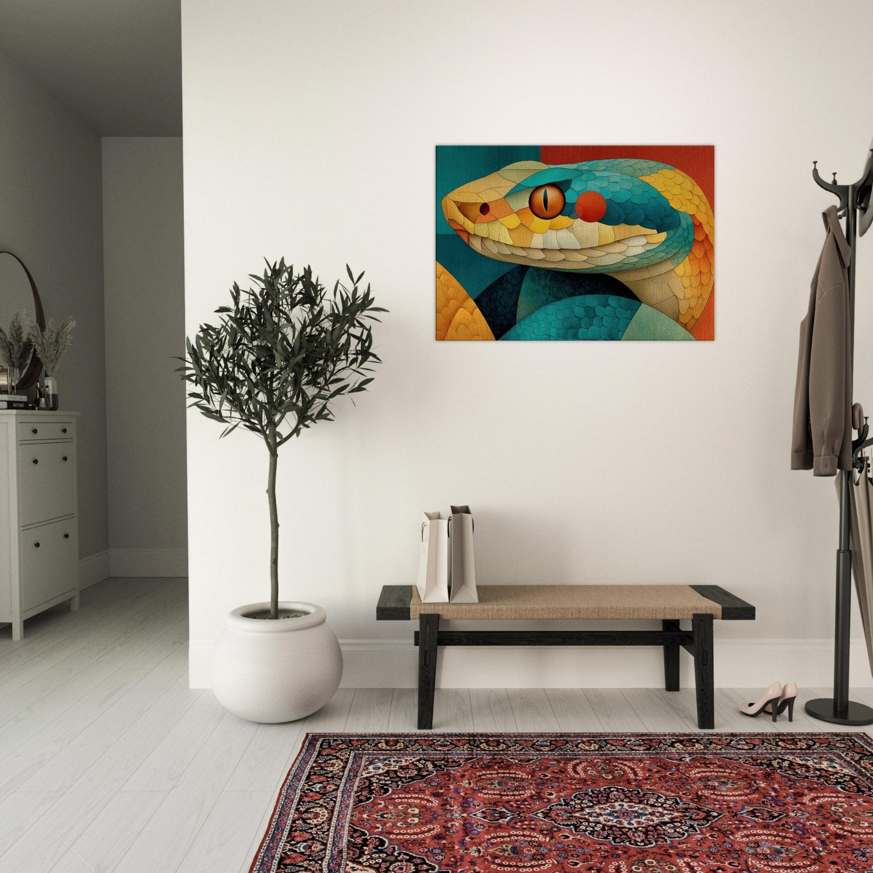Shot through with sunlit scales of teal, amber, and coral, this Snake coils in a mosaic of texture and motion. The composition radiates a warm, tactile energy like a living sculpture you can almost hear breathing. Hang it to soften a dining nook or anchor a lounge, turning walls into a sensorial horizon where color and curvature seduce the eye and invite lingering, conversation, and a sense of quiet, luxurious wonder.