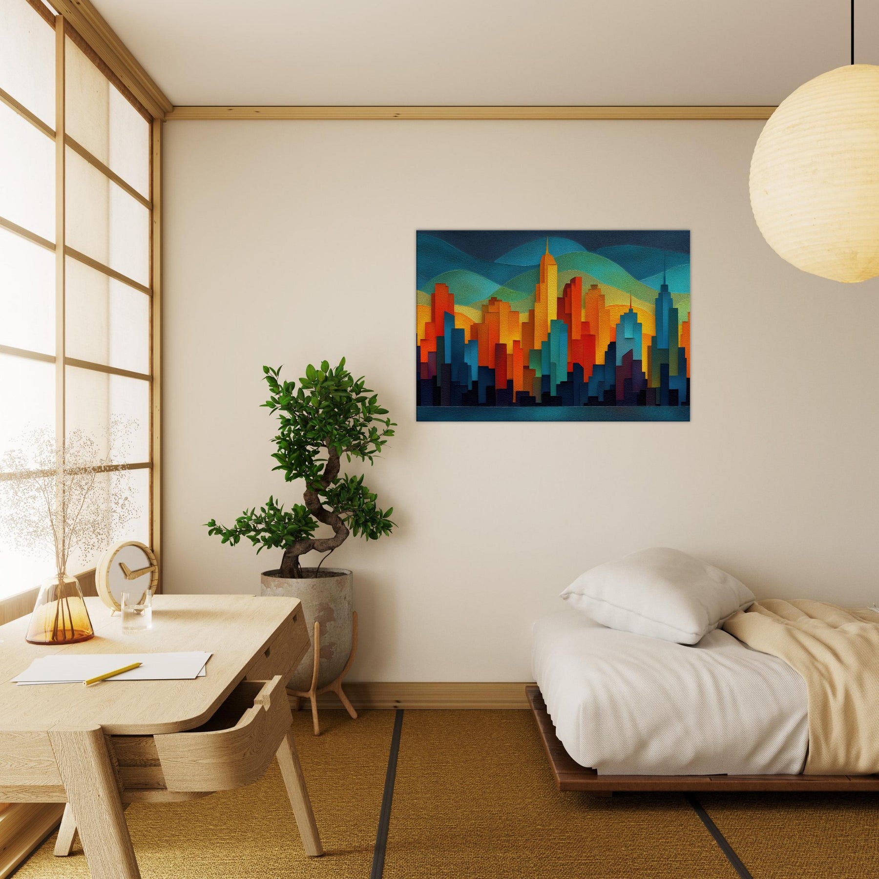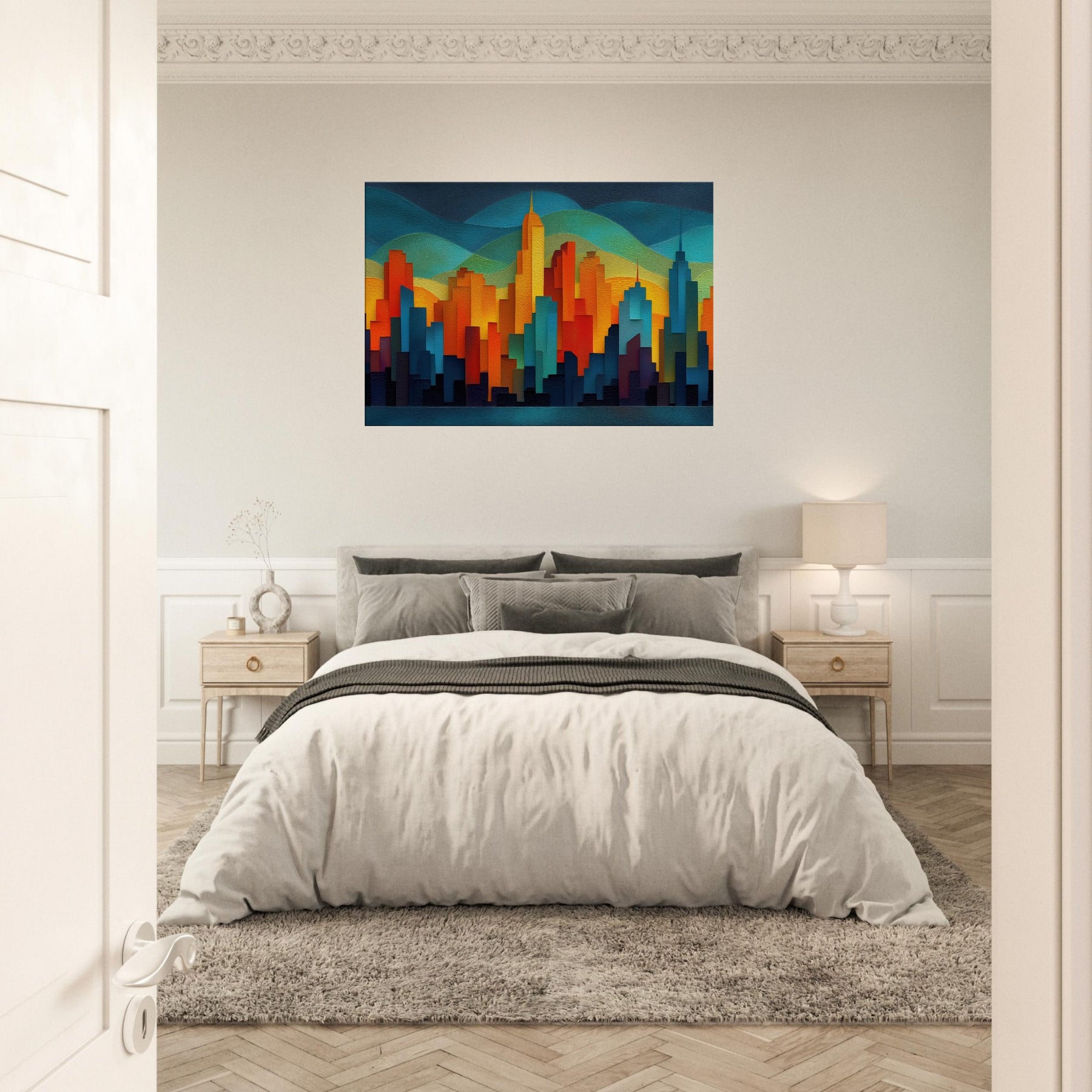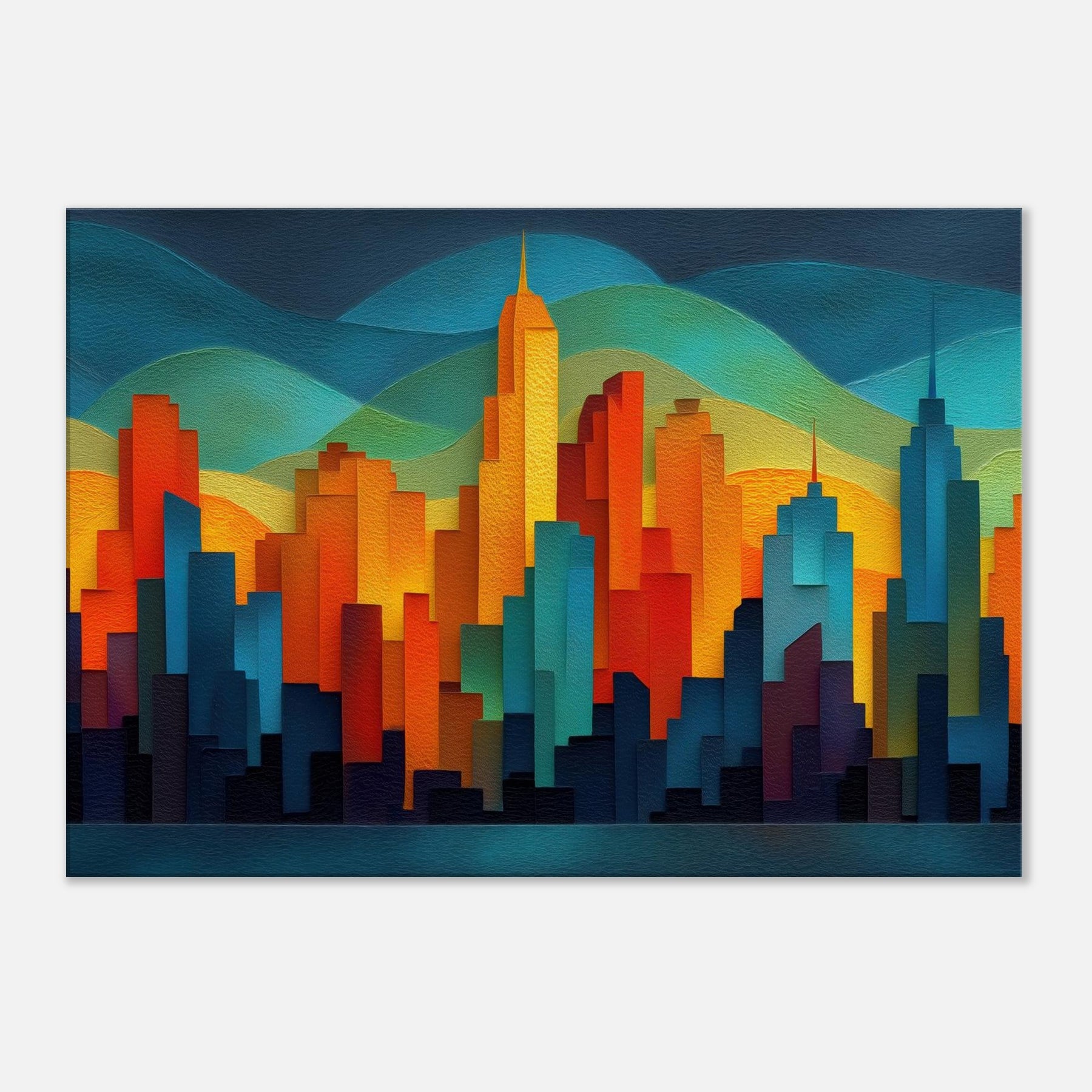 City Skyline Silhouette dissolves the day's edge into a glow of color, where towers rise like warm tectonic forms against layered hills of teal and gold. This abstract panorama invites quiet awe, turning a blank wall into a memory of city pulses neon reflections, distant traffic, the hush after sunset. The piece breathes sophistication into any living space, pairing architectural geometry with tactile depth, and creating a focal point that sparks conversation while remaining softly calming to the eye.