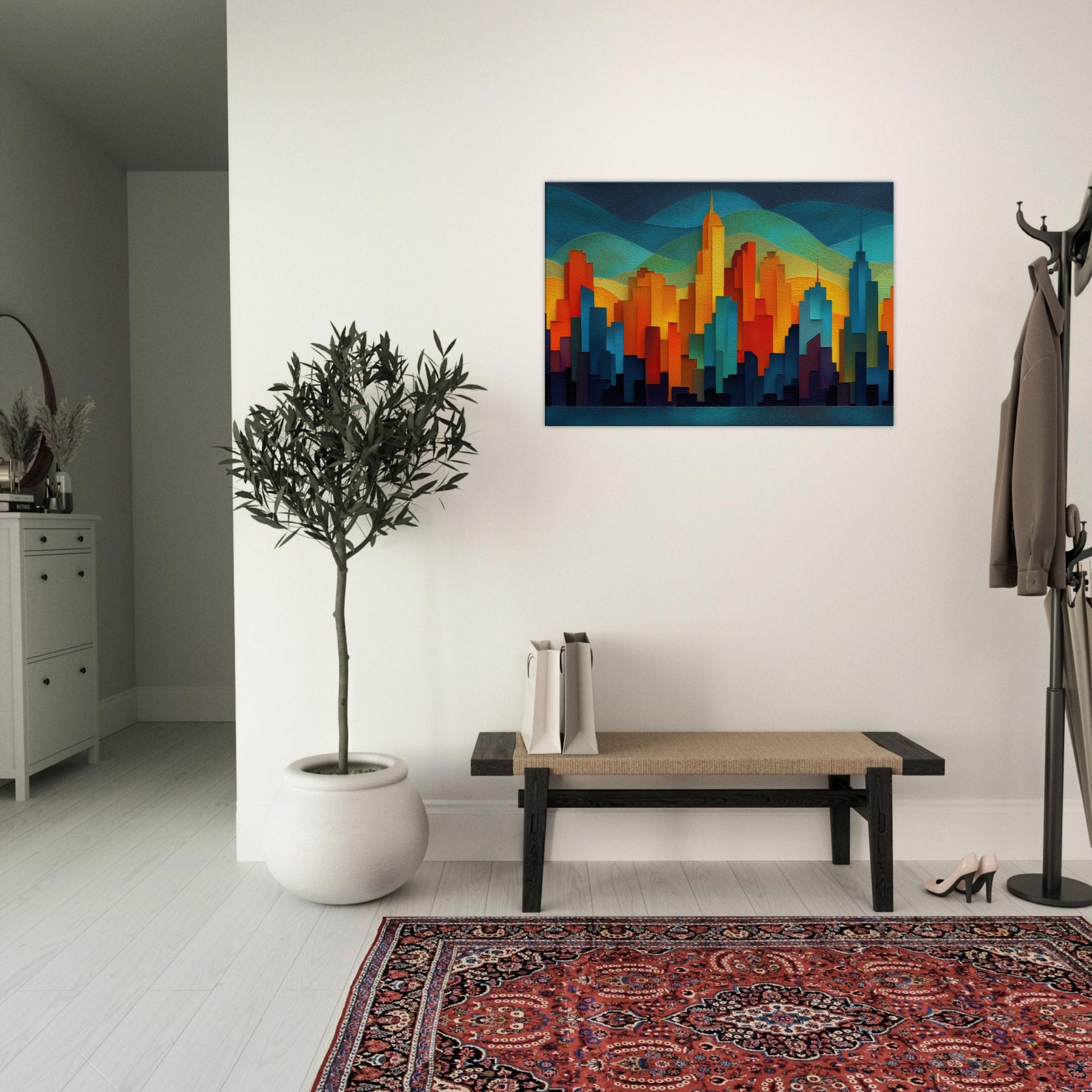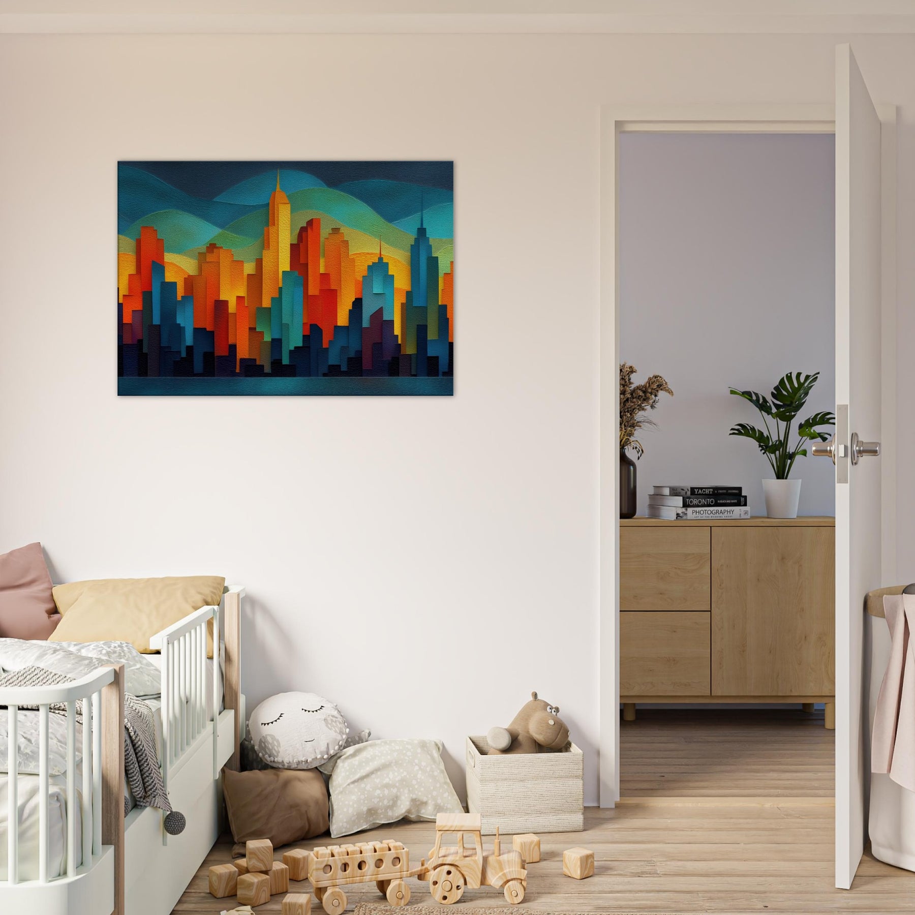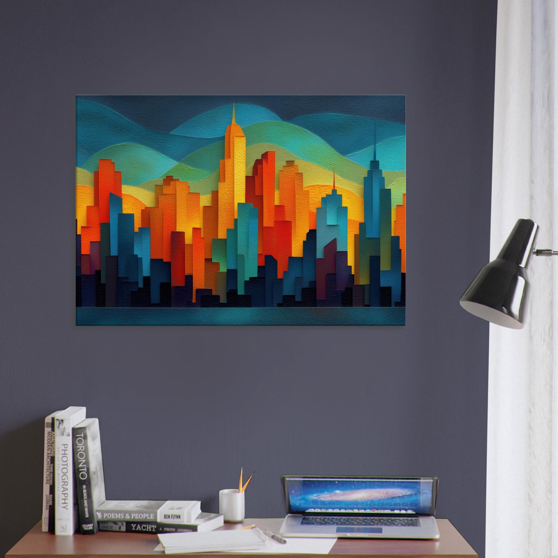 City Skyline Silhouette dissolves the day's edge into a glow of color, where towers rise like warm tectonic forms against layered hills of teal and gold. This abstract panorama invites quiet awe, turning a blank wall into a memory of city pulses neon reflections, distant traffic, the hush after sunset. The piece breathes sophistication into any living space, pairing architectural geometry with tactile depth, and creating a focal point that sparks conversation while remaining softly calming to the eye.