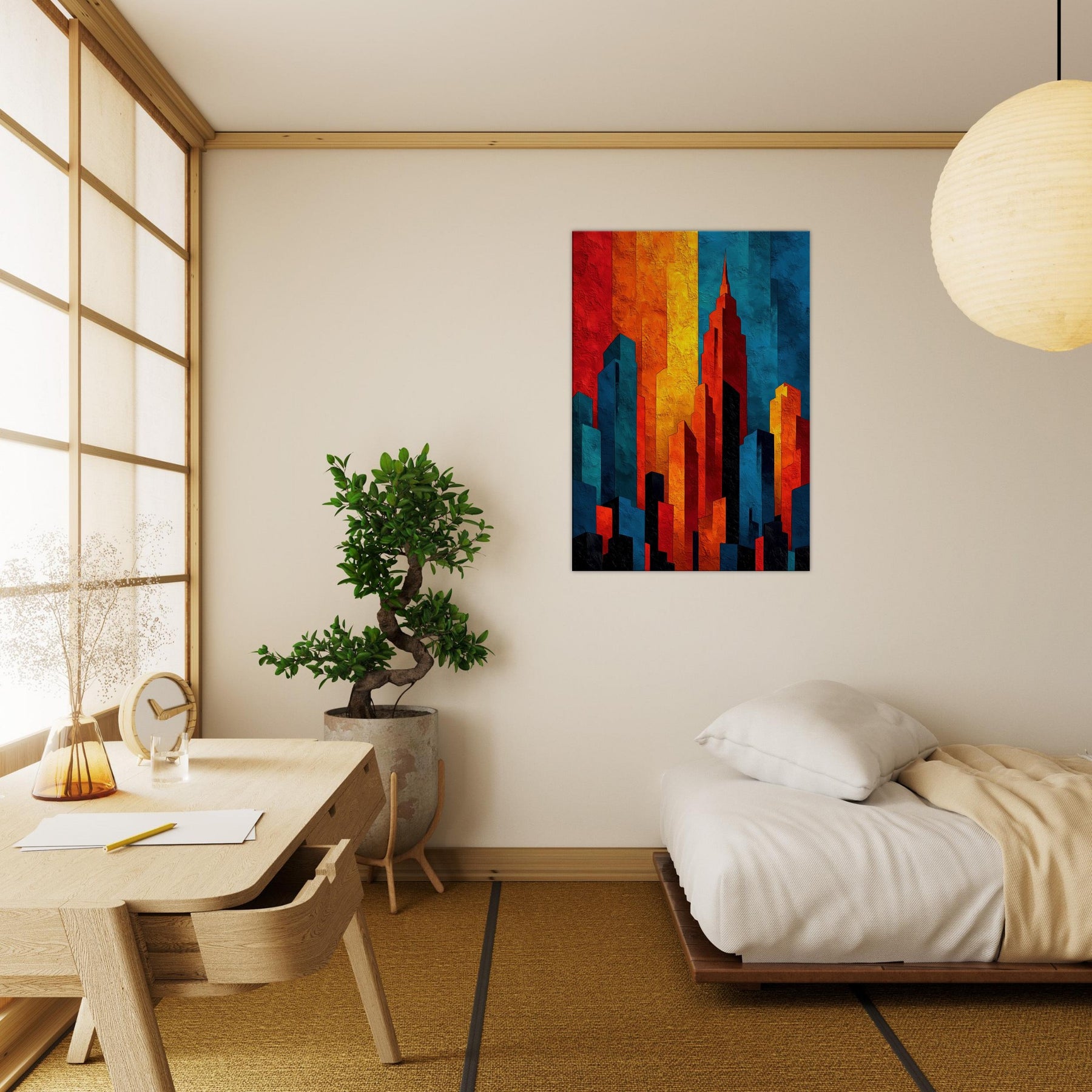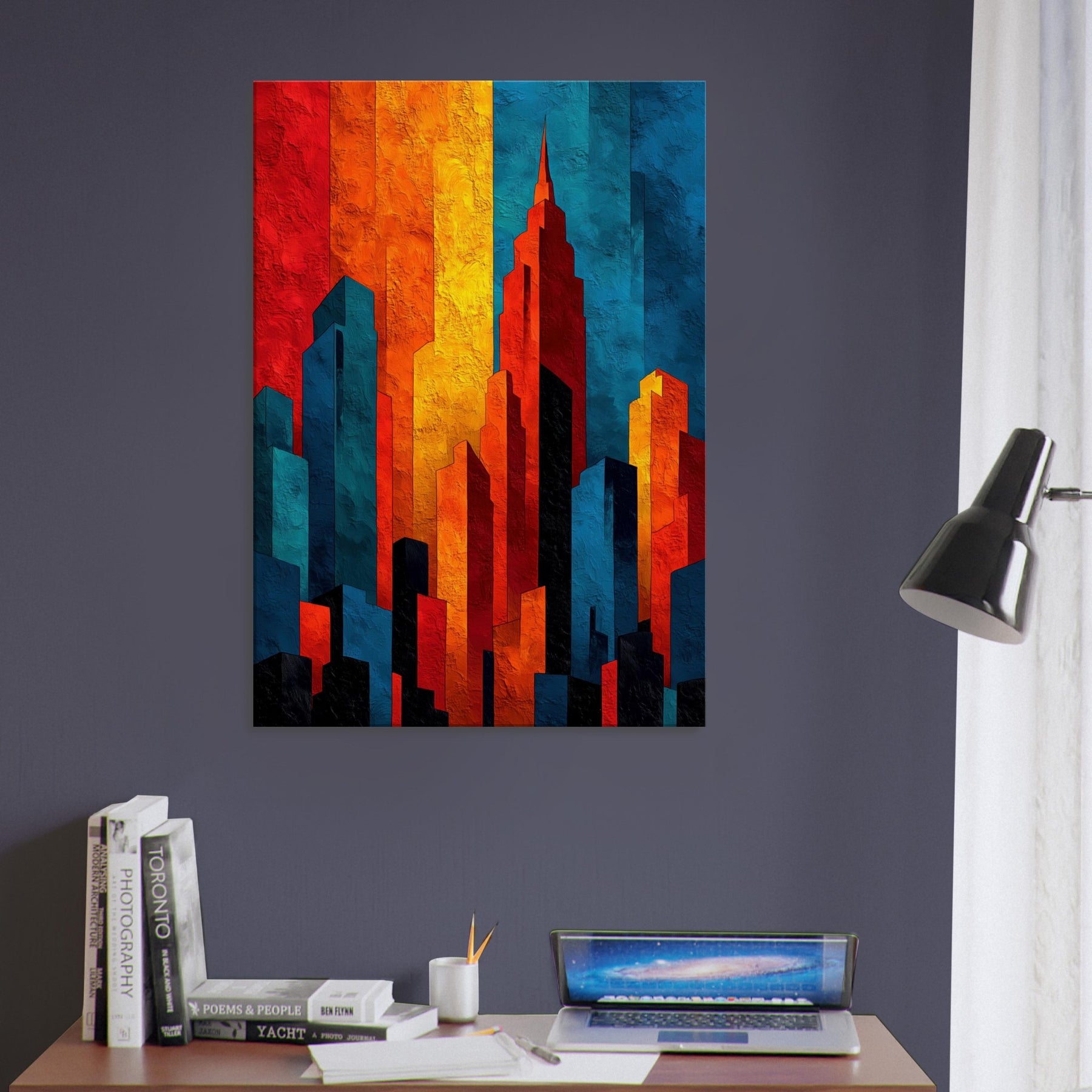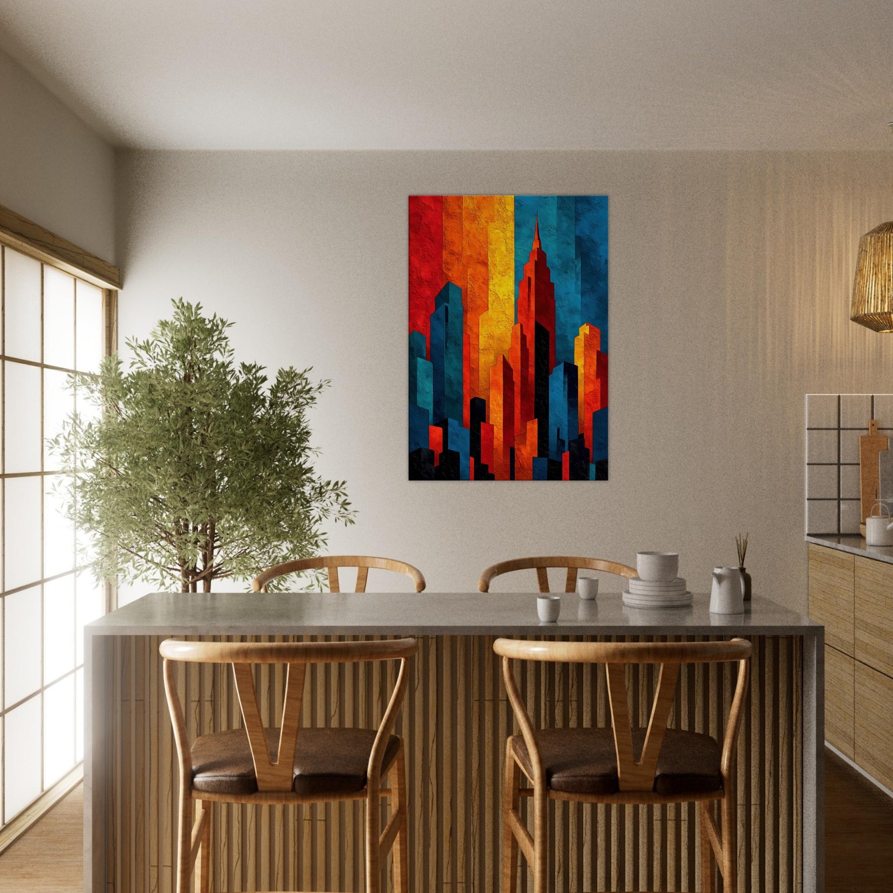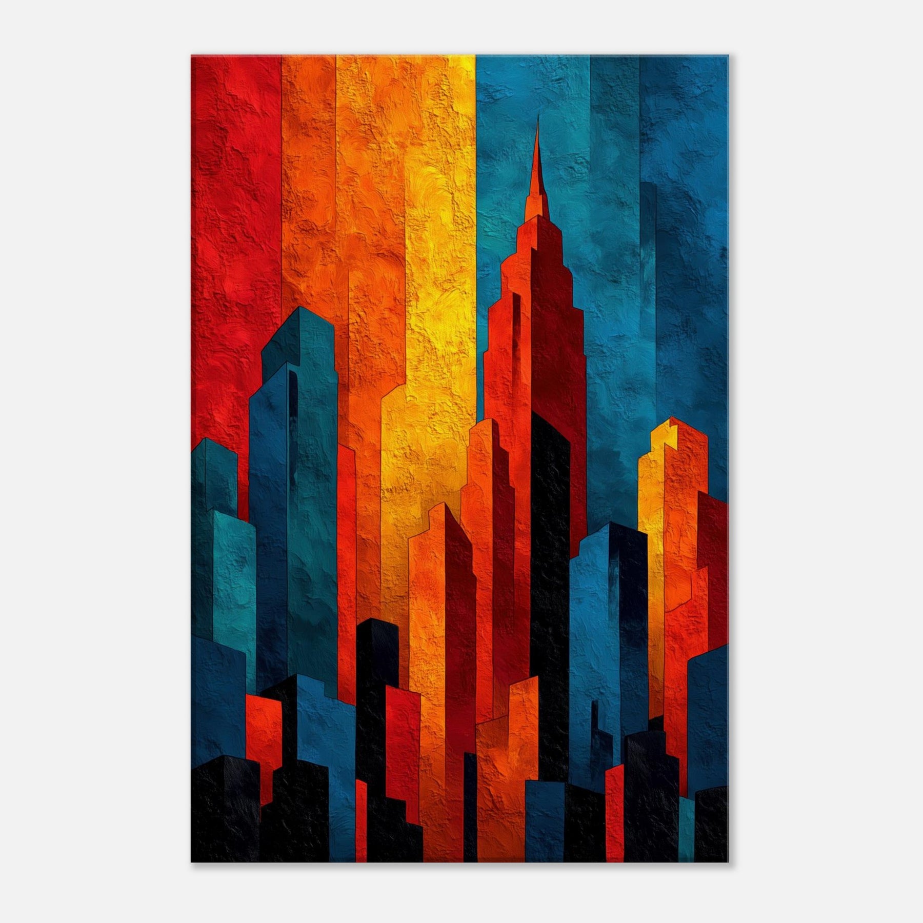 Let the City Skyline Silhouette wash your room in luminous, layered light. This abstract composition distills a horizon into bold blocks of fire and shadow, where red, amber, cobalt, and ink collide in a nocturnal chorus. The tactile texture invites a slow, sensual glance, while the color rhythm guides the eye and calm projection of space. Ideal above a sofa or in a quiet entry, it anchors rooms with urban atmosphere and modern elegance.