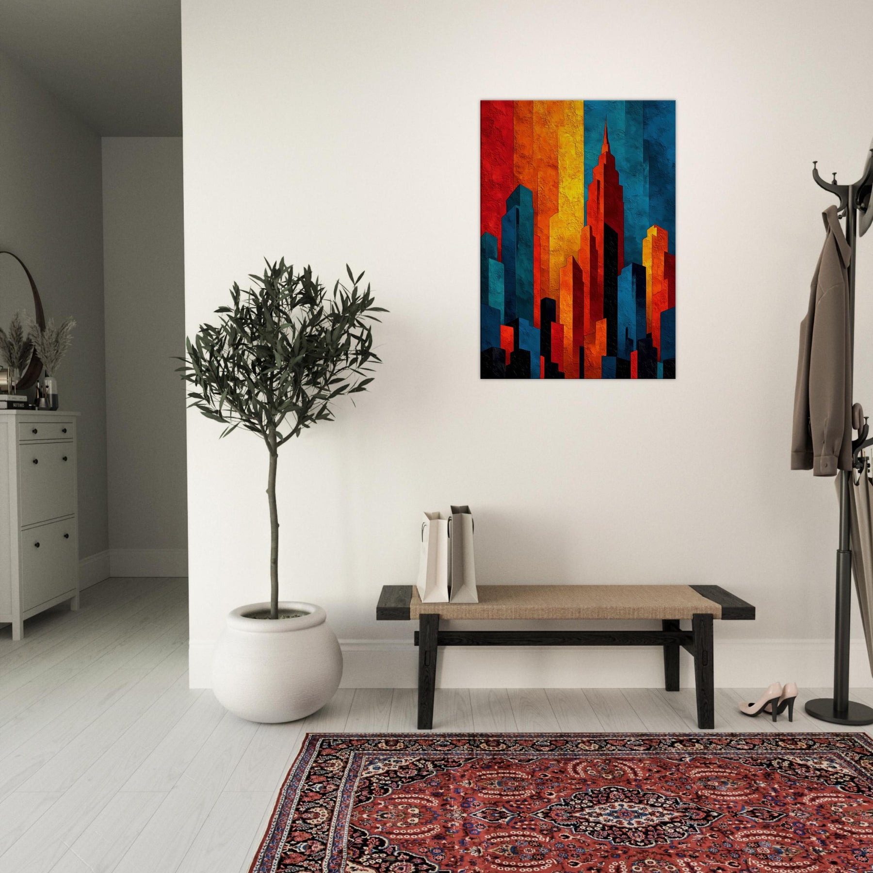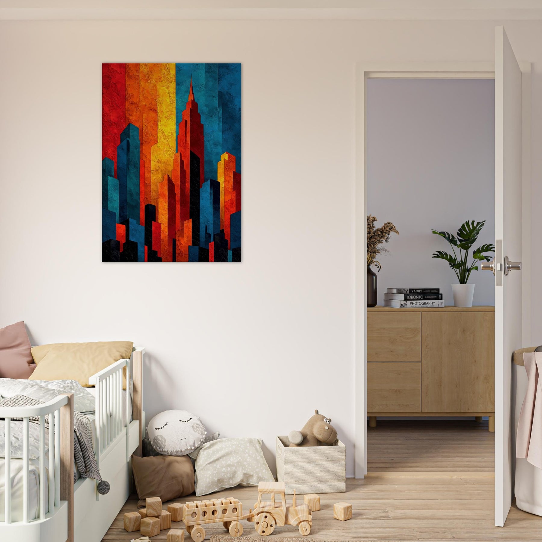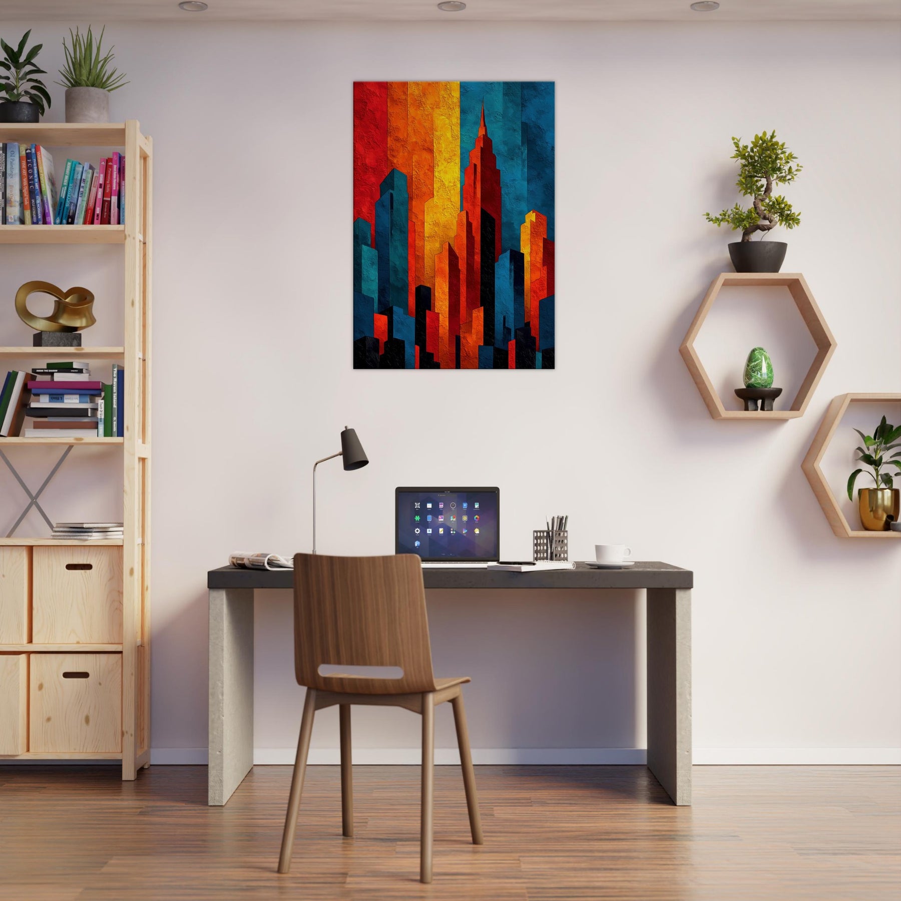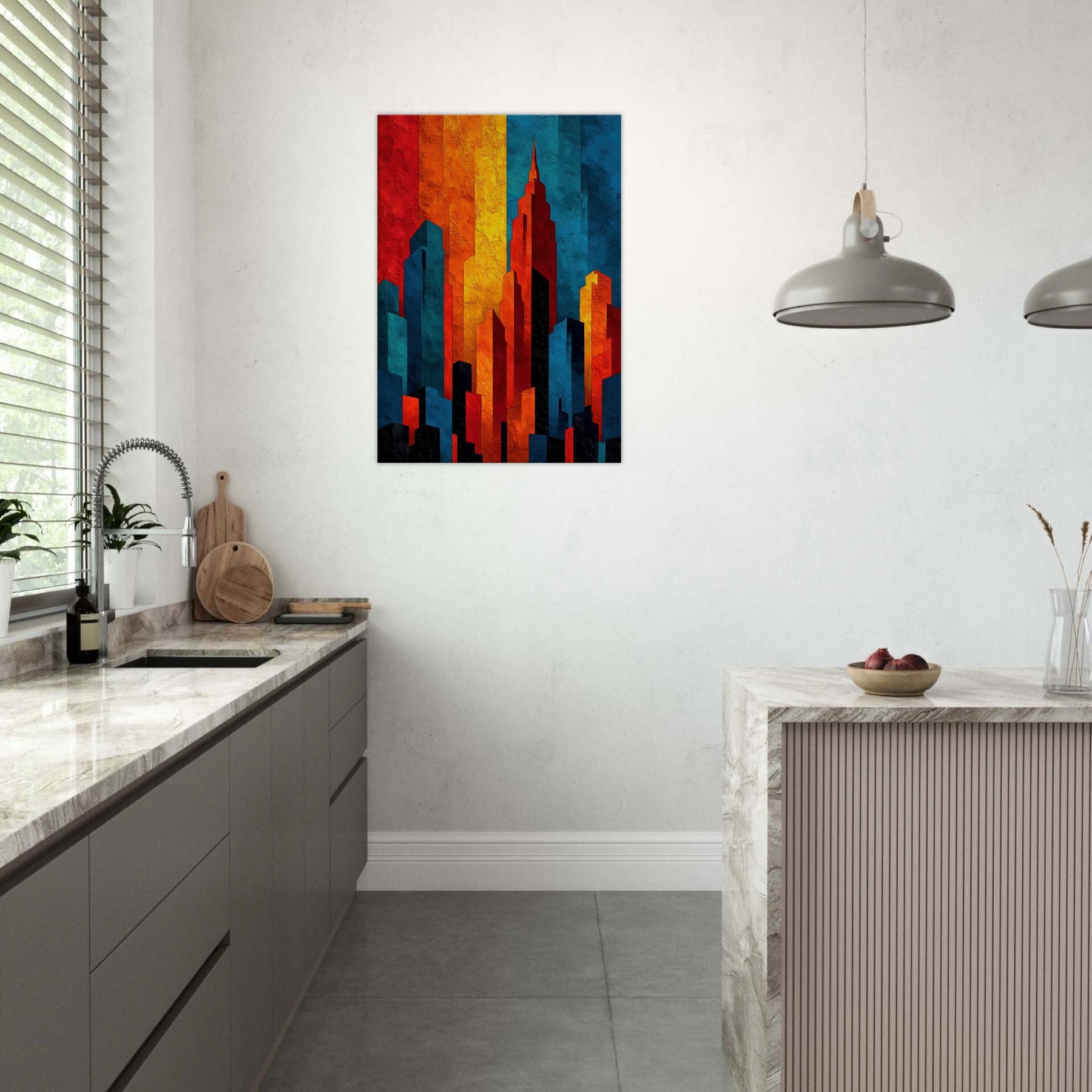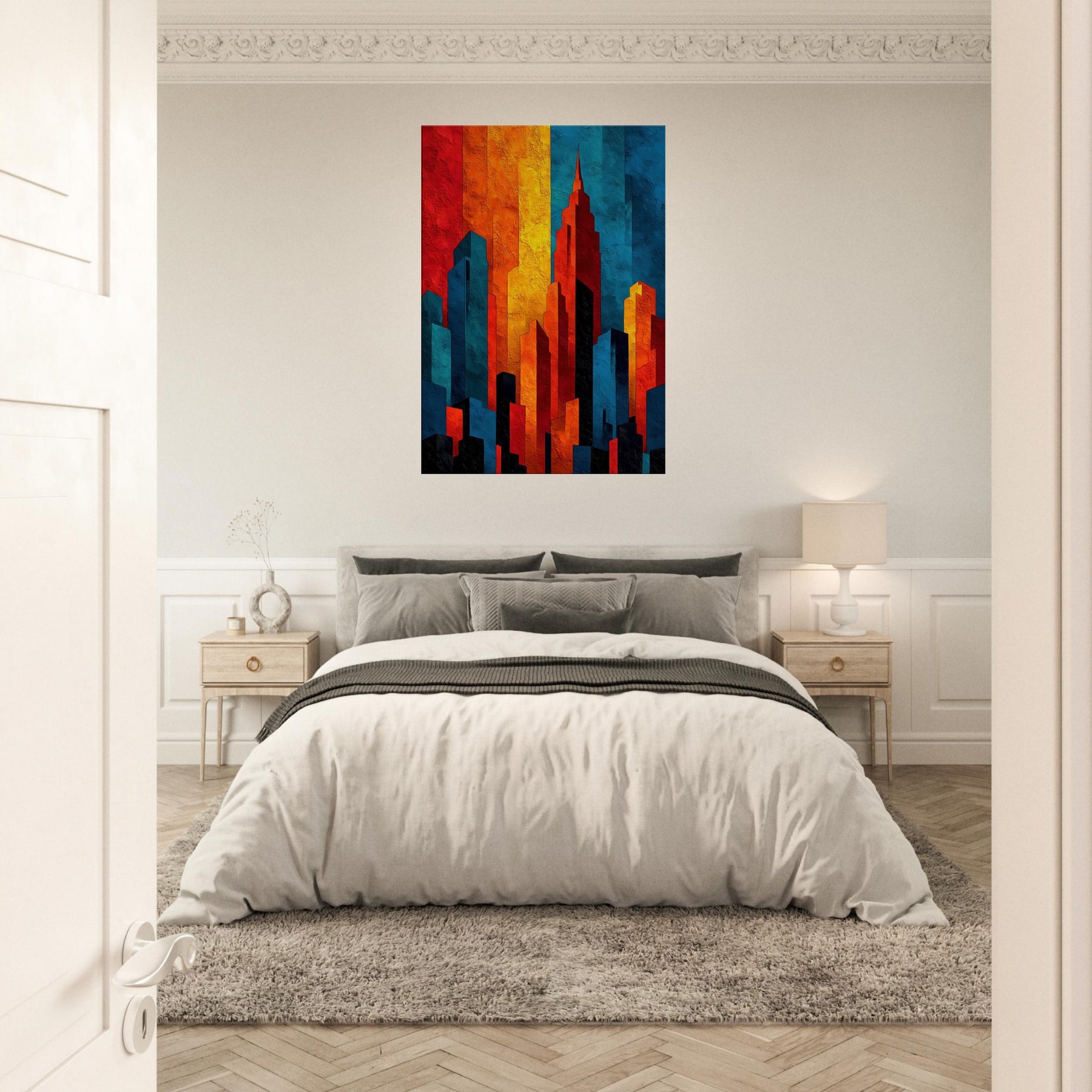 Let the City Skyline Silhouette wash your room in luminous, layered light. This abstract composition distills a horizon into bold blocks of fire and shadow, where red, amber, cobalt, and ink collide in a nocturnal chorus. The tactile texture invites a slow, sensual glance, while the color rhythm guides the eye and calm projection of space. Ideal above a sofa or in a quiet entry, it anchors rooms with urban atmosphere and modern elegance.