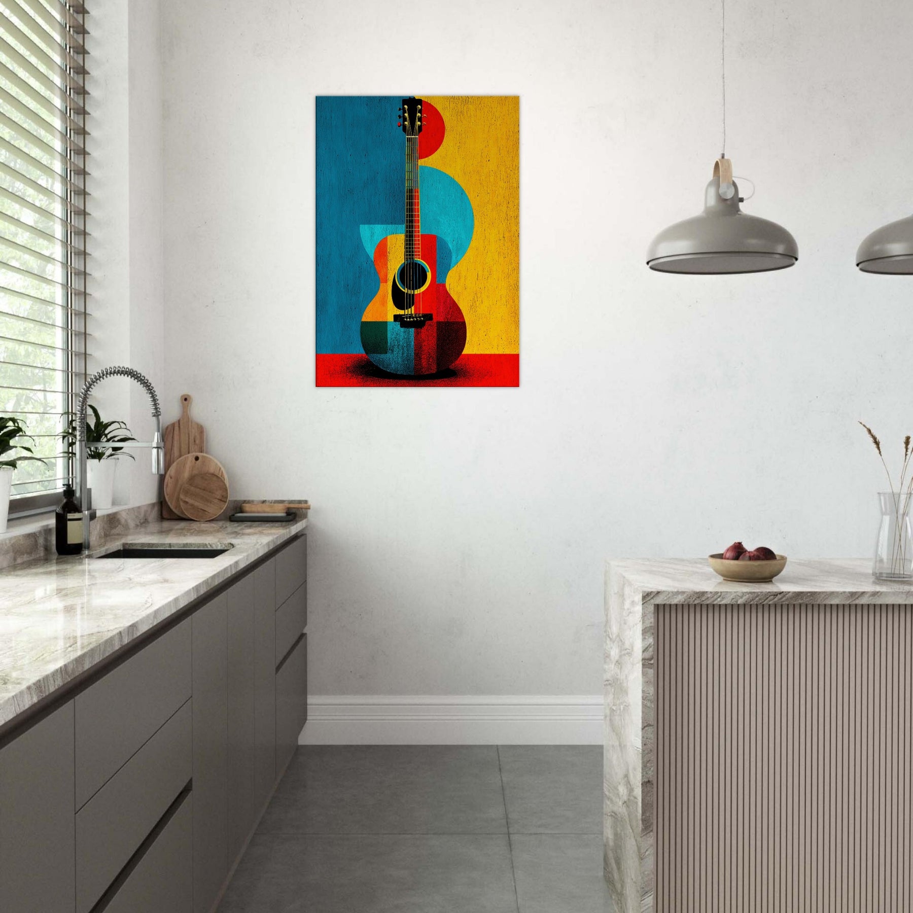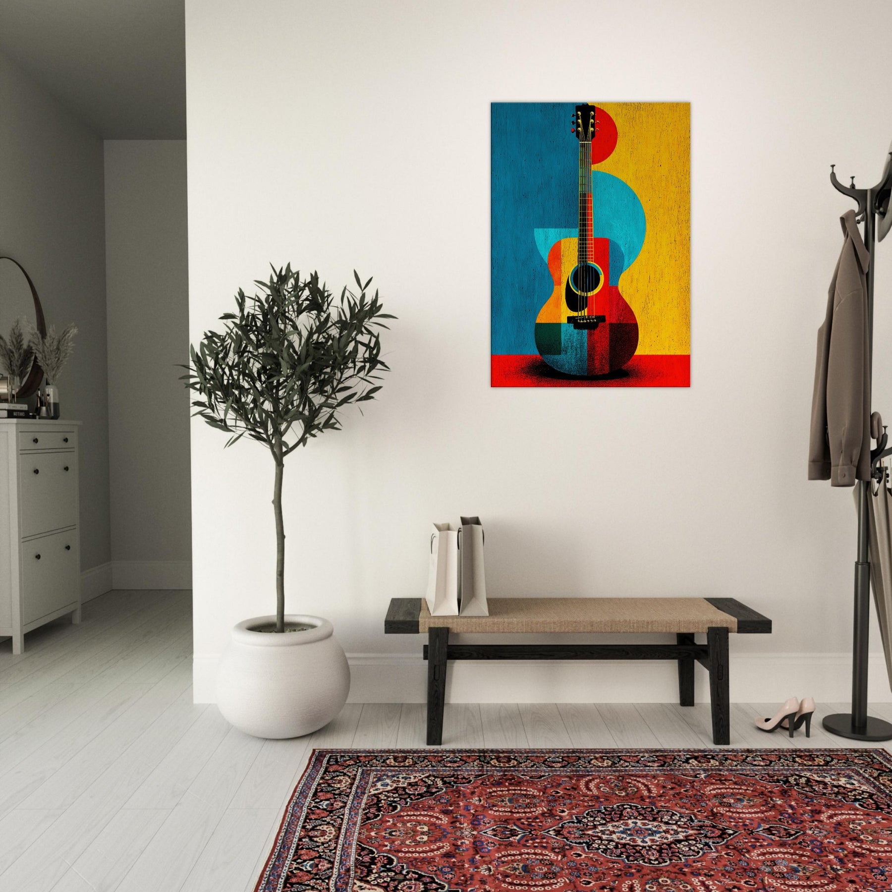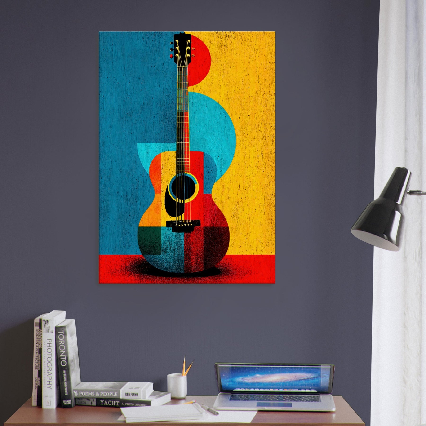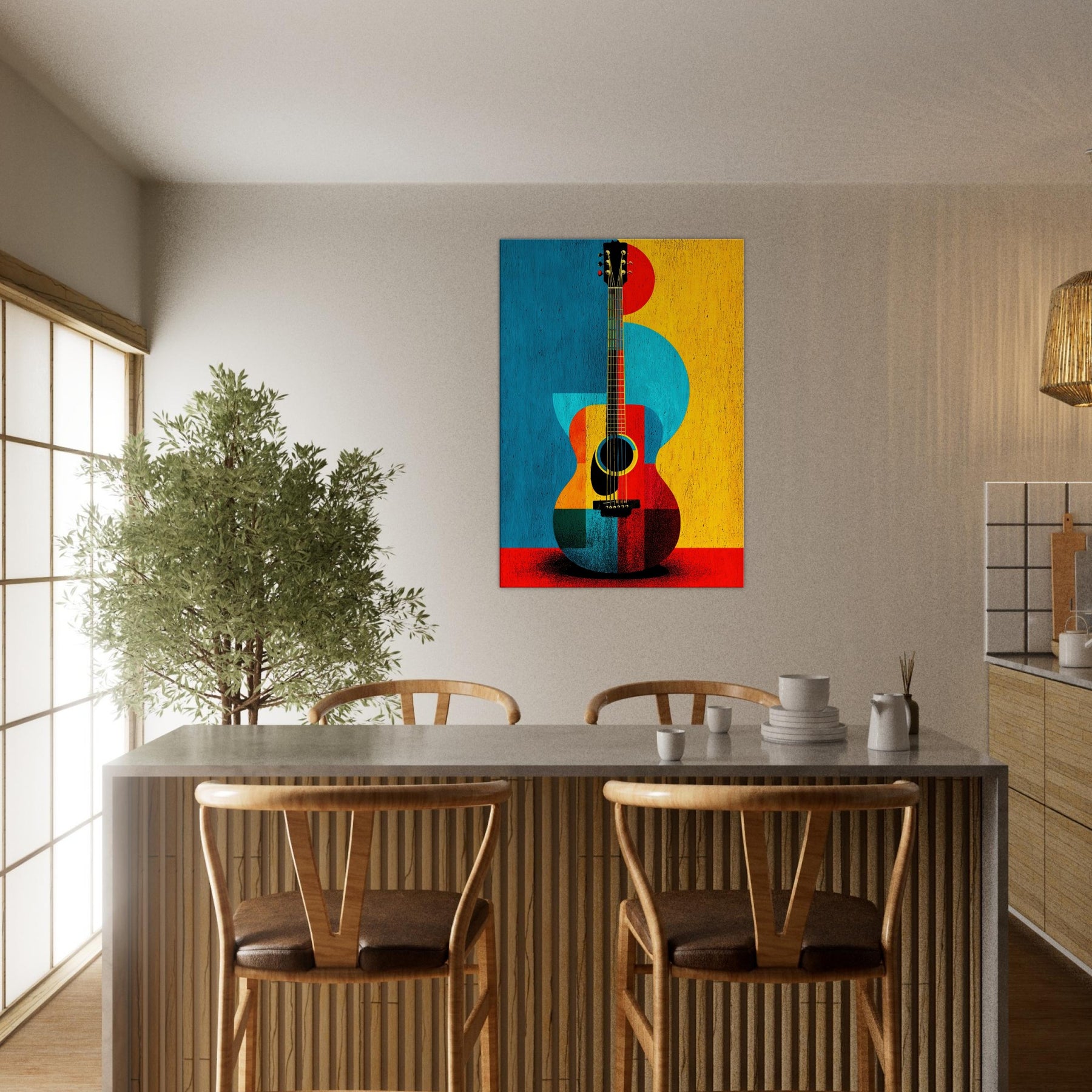 Guitar takes center stage in a whirl of color and form. This abstract composition makes the instrument feel alive its strings imagined as bold lines, its body a mosaic of warm reds, cobalt blues, and sunshine yellows. The result is a living room friendly hum of energy and calm, a piece that glows softly at dusk and sparks conversation by day. Hang it to evoke creativity, rhythm, and mood a sophisticated centerpiece that harmonizes with modern decor while inviting intimate, musical moments in any space.