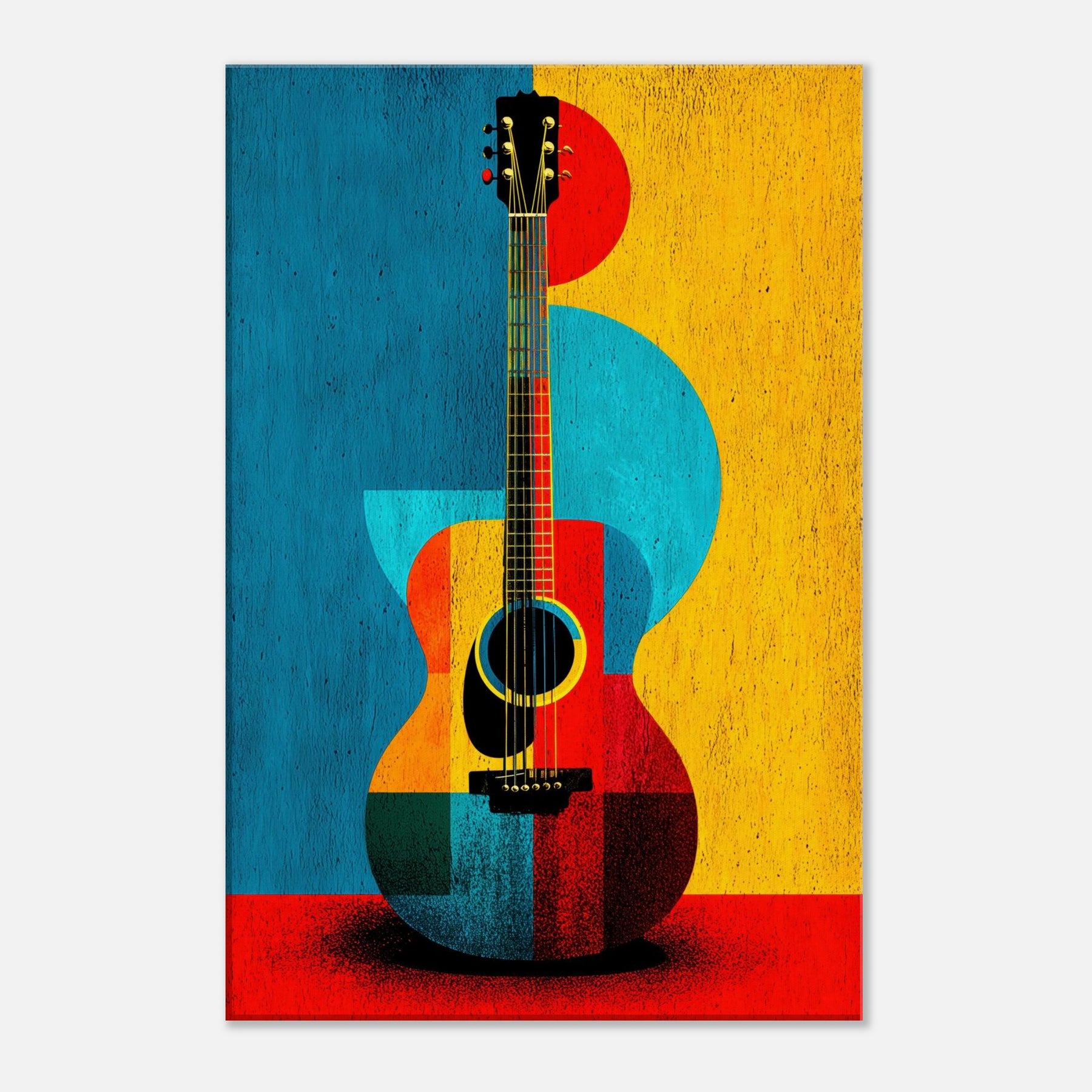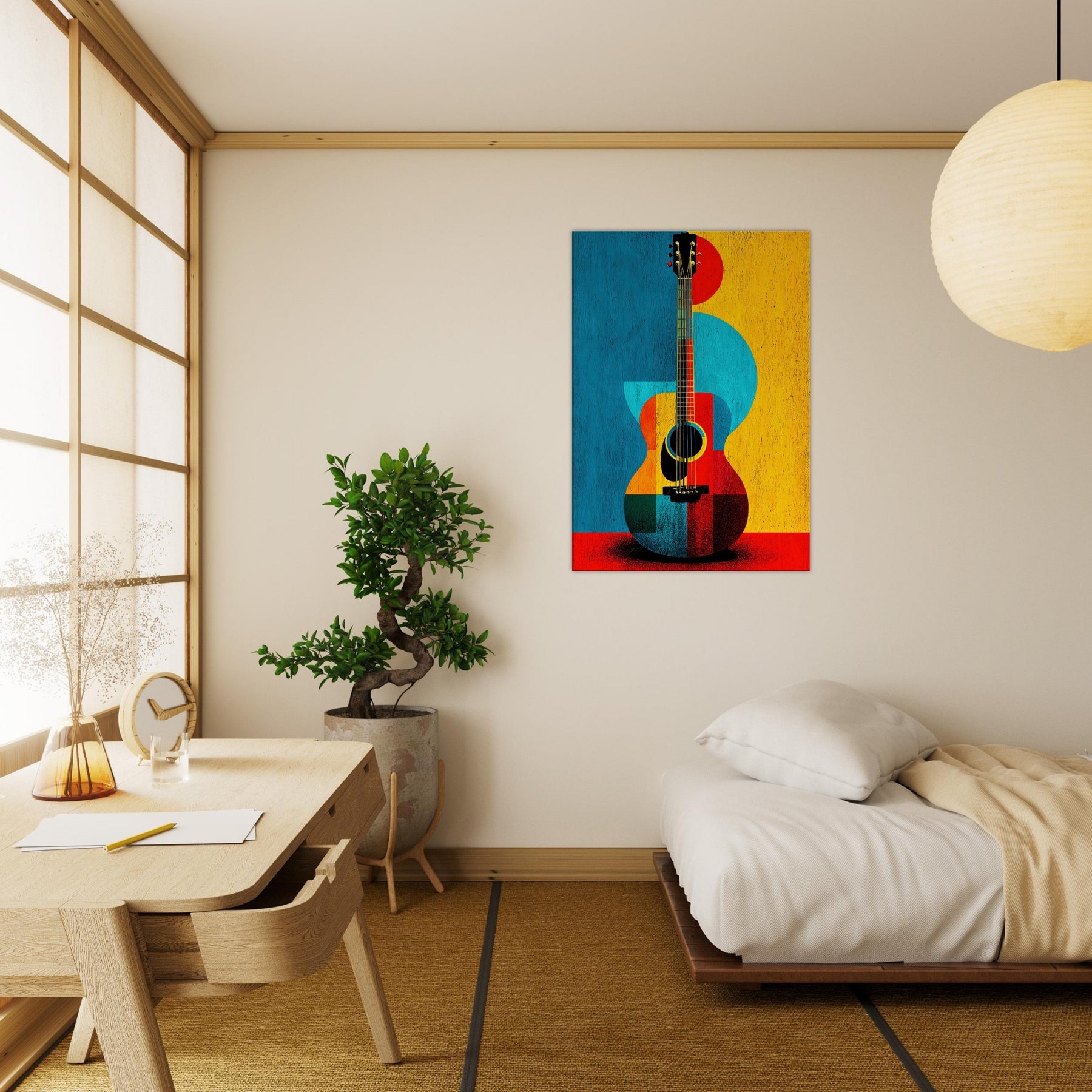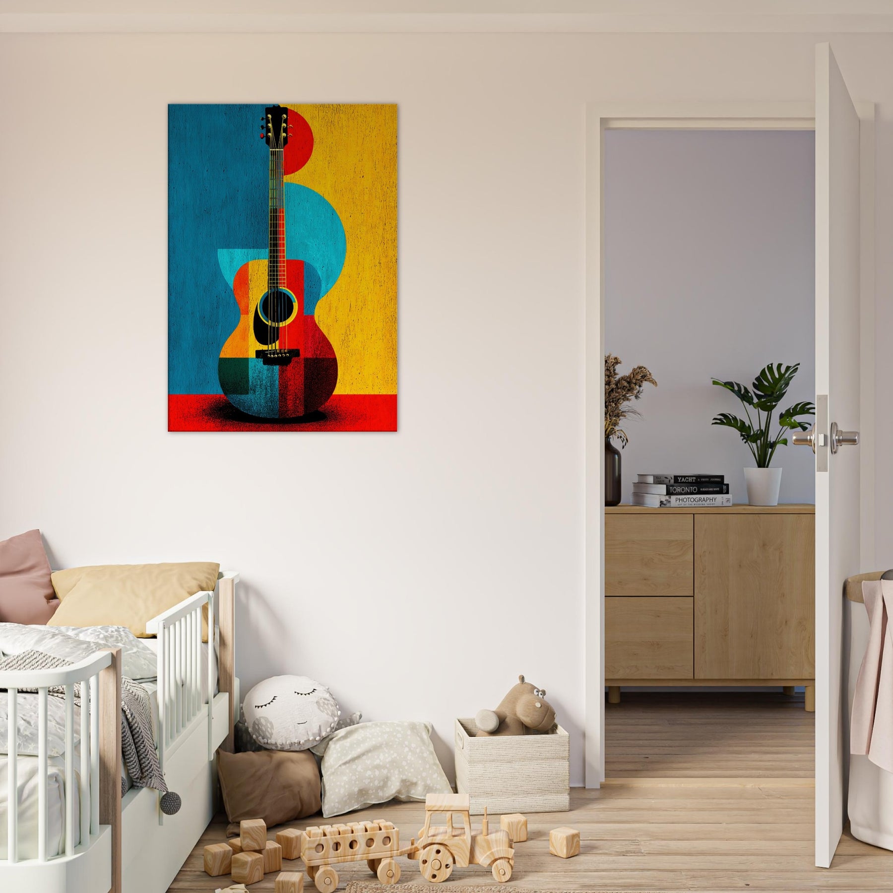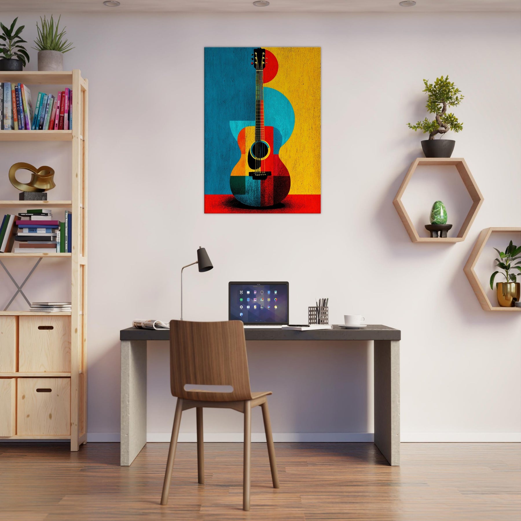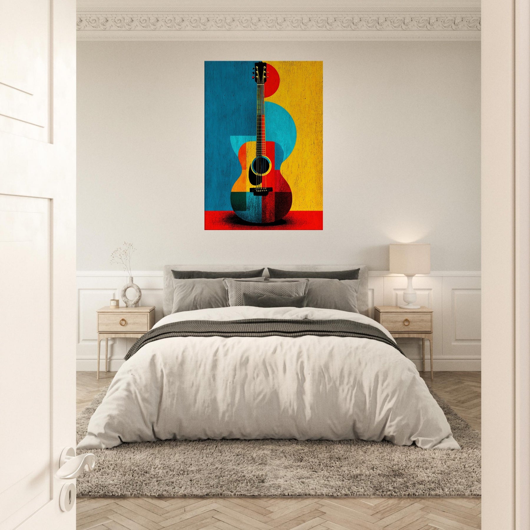 Guitar takes center stage in a whirl of color and form. This abstract composition makes the instrument feel alive its strings imagined as bold lines, its body a mosaic of warm reds, cobalt blues, and sunshine yellows. The result is a living room friendly hum of energy and calm, a piece that glows softly at dusk and sparks conversation by day. Hang it to evoke creativity, rhythm, and mood a sophisticated centerpiece that harmonizes with modern decor while inviting intimate, musical moments in any space.