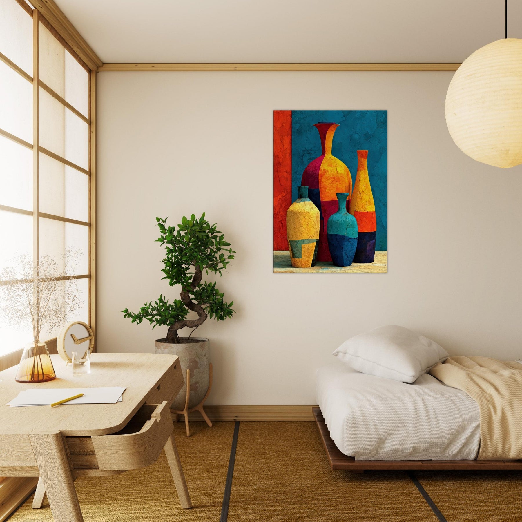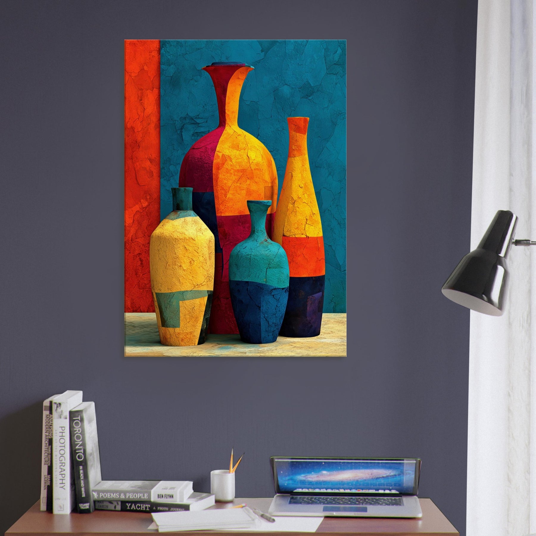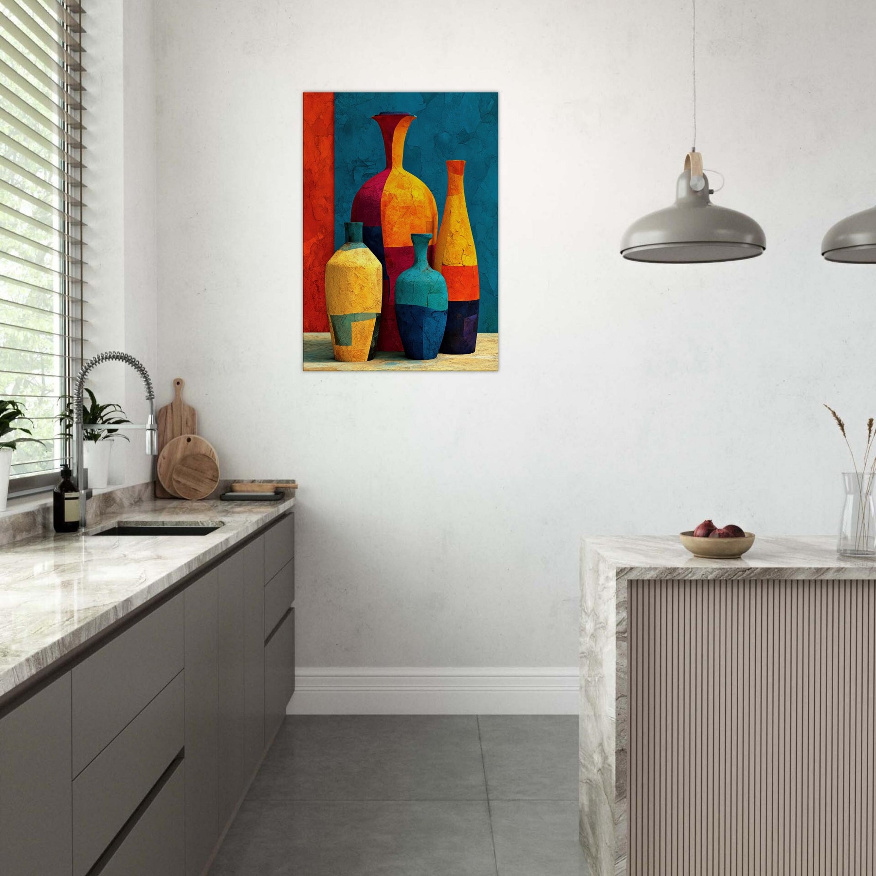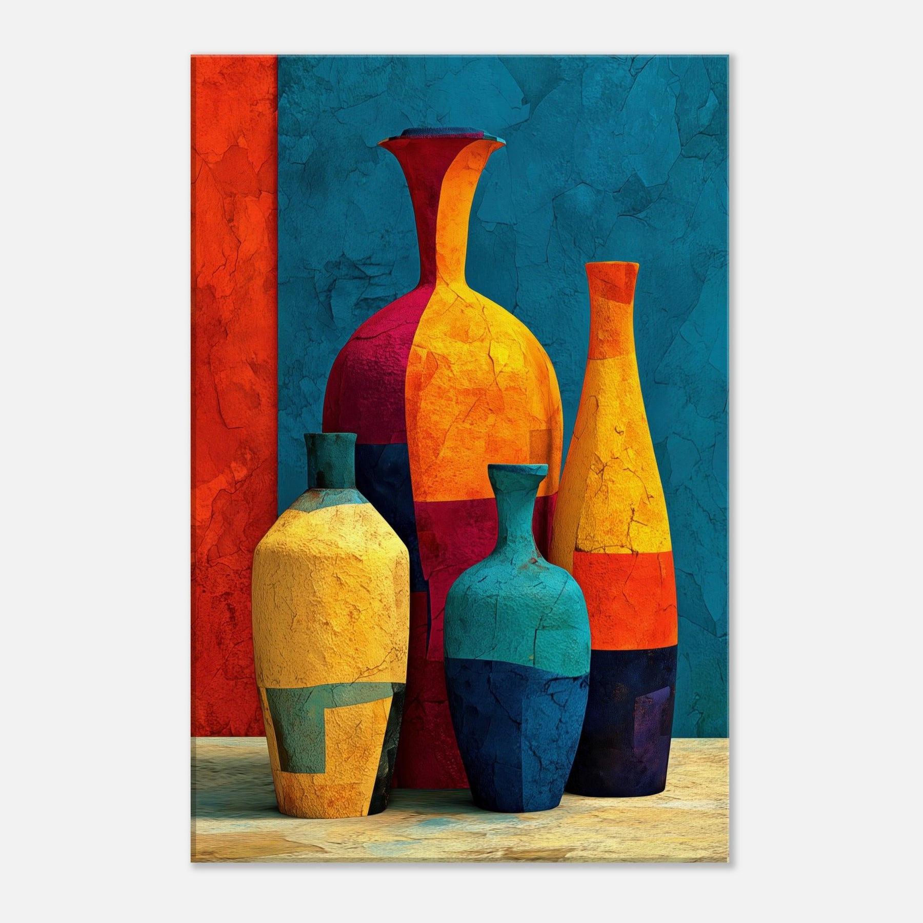 Vase Trio rises from a field of saturated color, a lively study in balance and movement. Abstract forms collide and converge into a cheerful still life that hums with warmth, light, and a touch of whimsy. This piece invites the eye to wander along curved silhouettes, catching reflections and textures as if you were stepping into a sunlit studio. Hang it in a living room or hall to soften edges, spark conversations, and let everyday arrangements become a small, bright celebration: the Vase Trio.