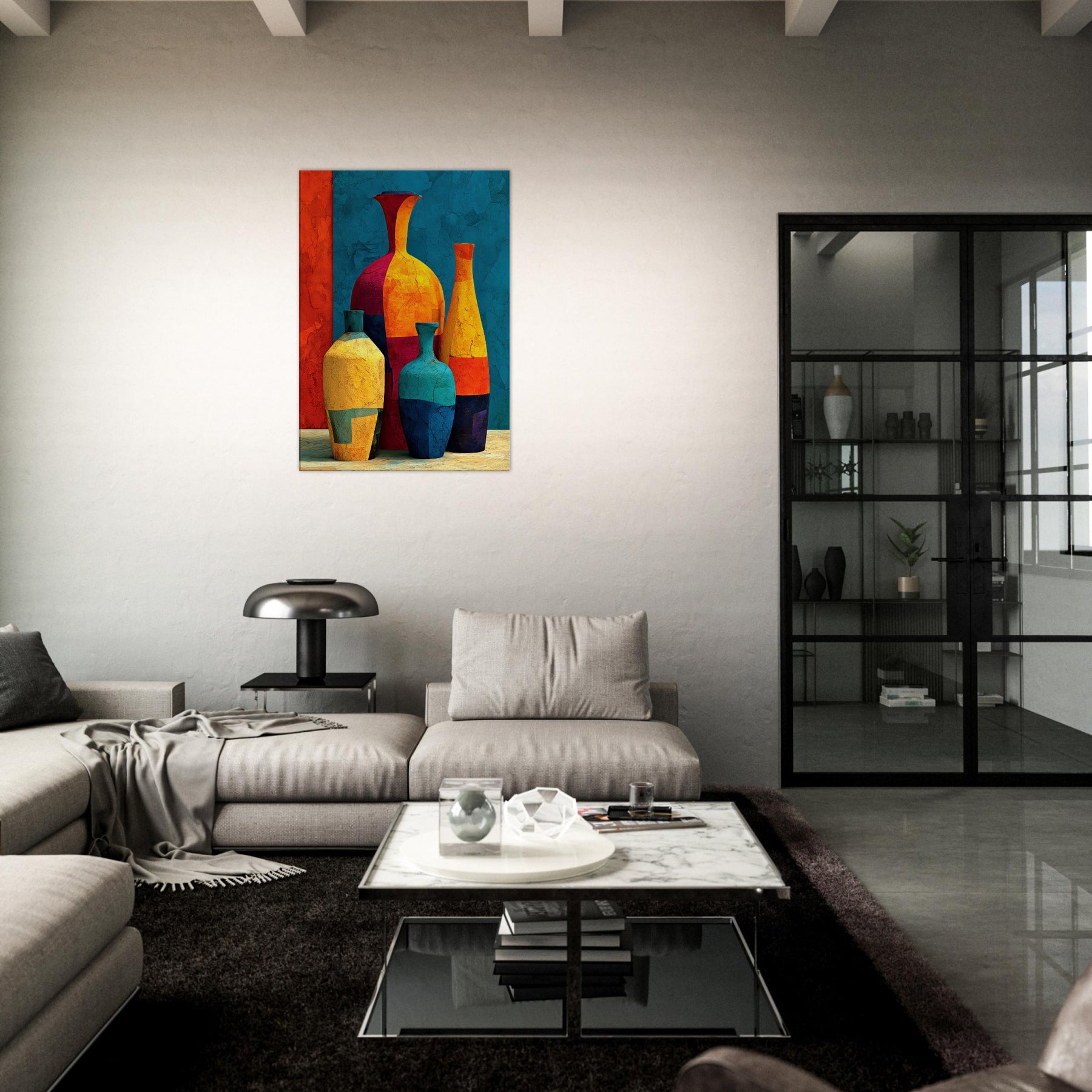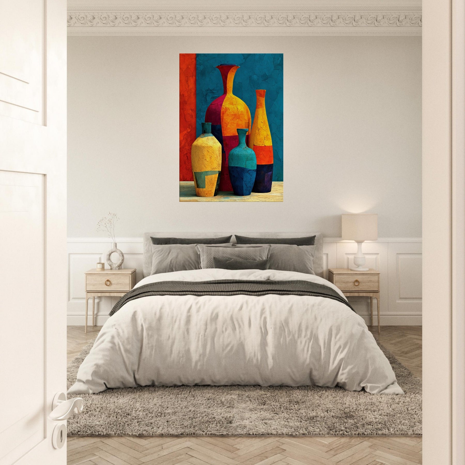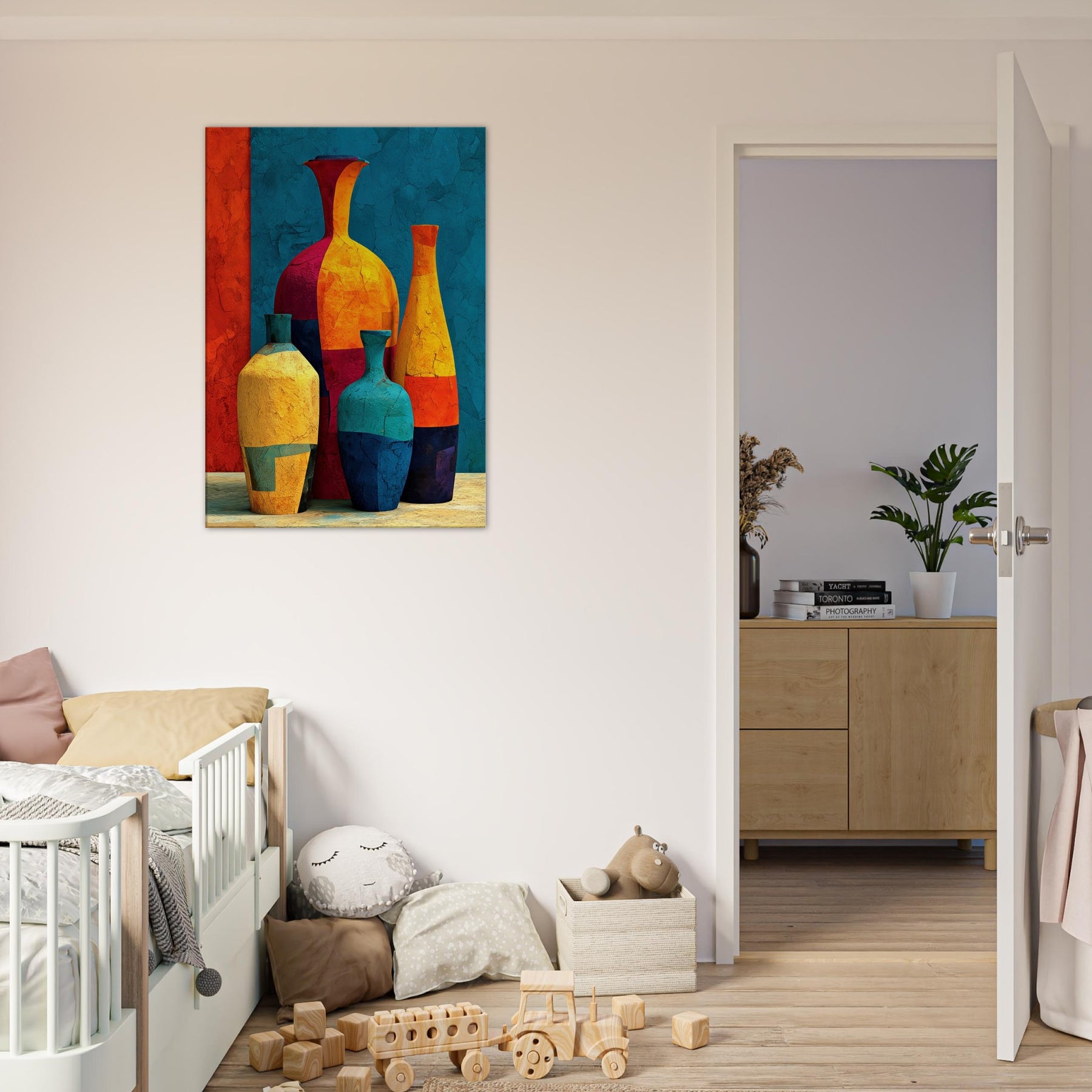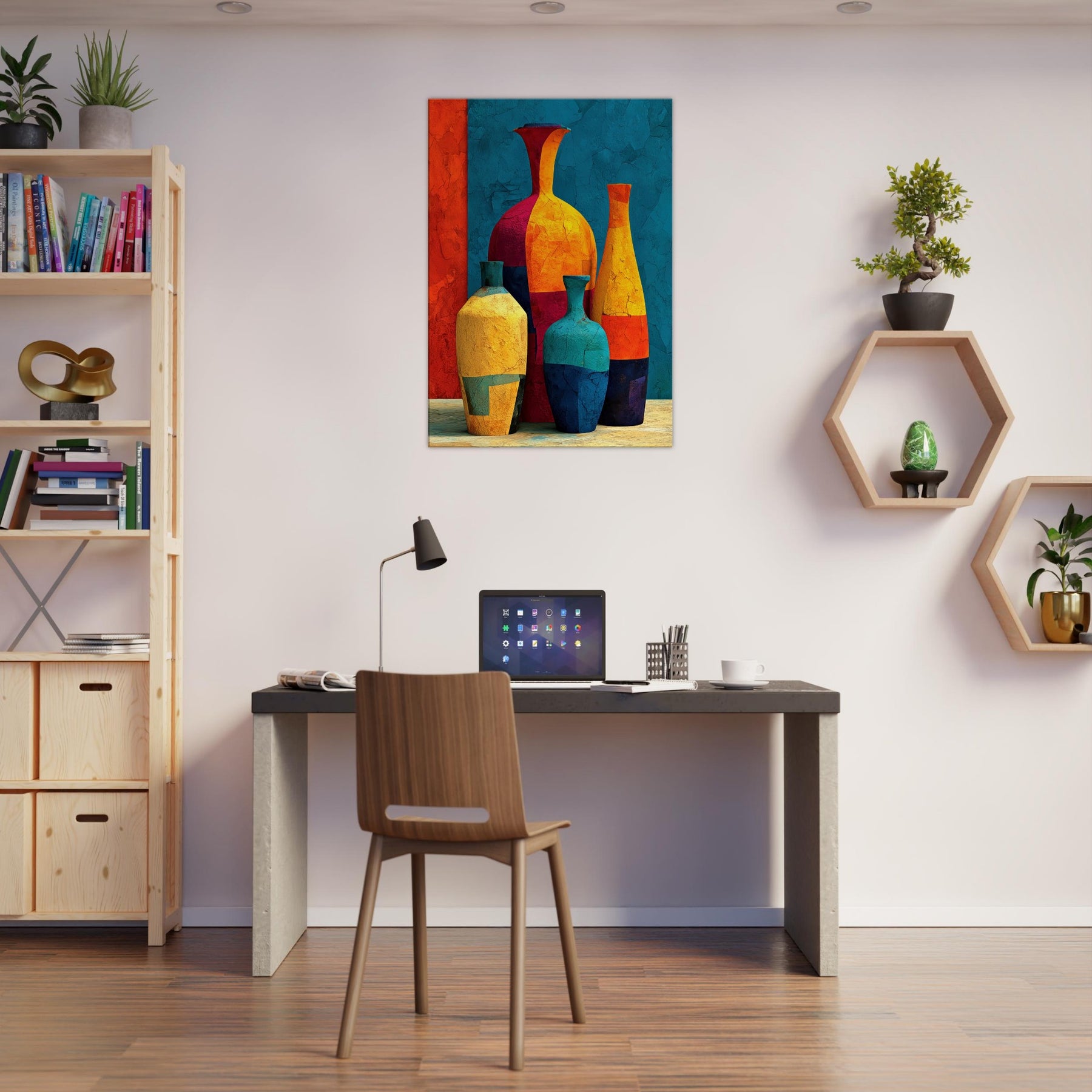 Vase Trio rises from a field of saturated color, a lively study in balance and movement. Abstract forms collide and converge into a cheerful still life that hums with warmth, light, and a touch of whimsy. This piece invites the eye to wander along curved silhouettes, catching reflections and textures as if you were stepping into a sunlit studio. Hang it in a living room or hall to soften edges, spark conversations, and let everyday arrangements become a small, bright celebration: the Vase Trio.